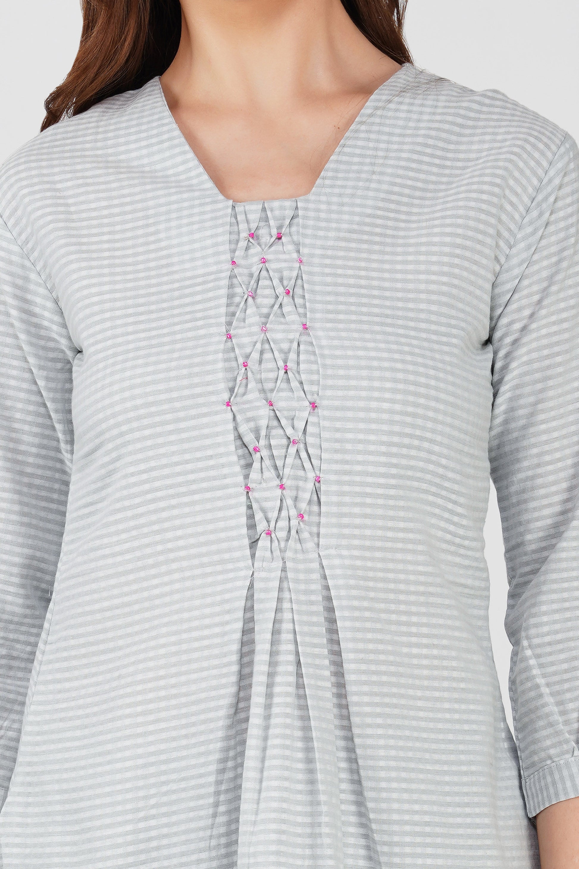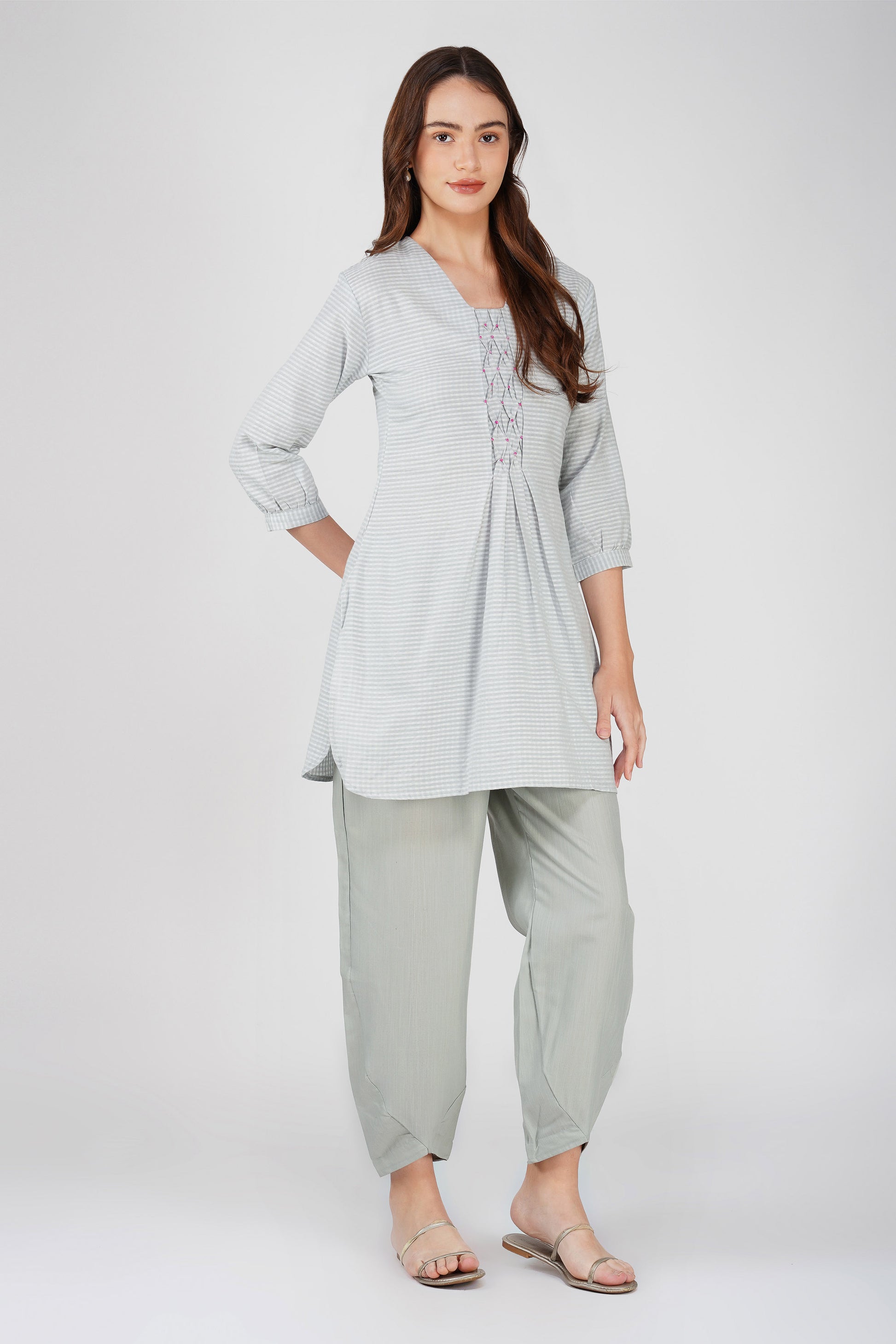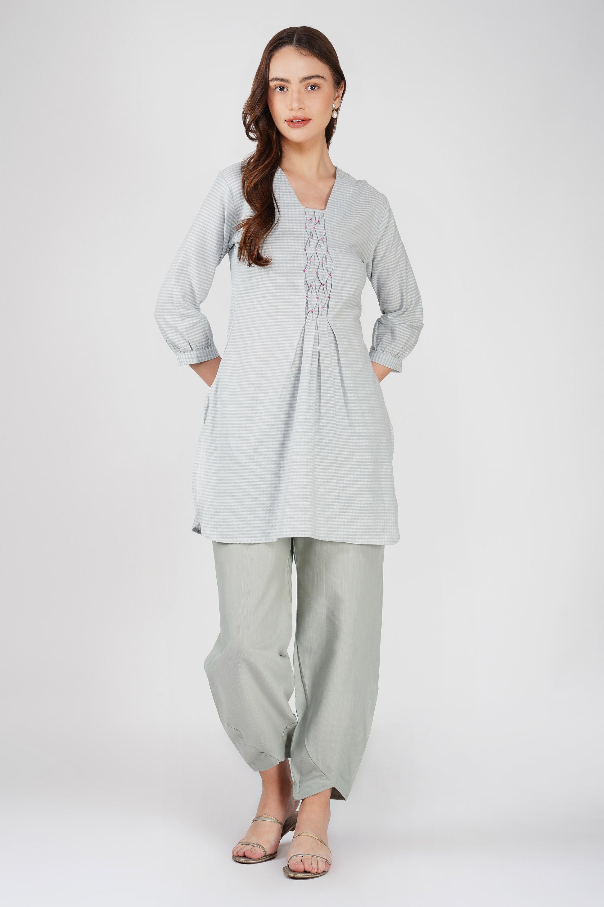 Grey Handloom Kurta Set – Beaded Neckline with Afghani Pants