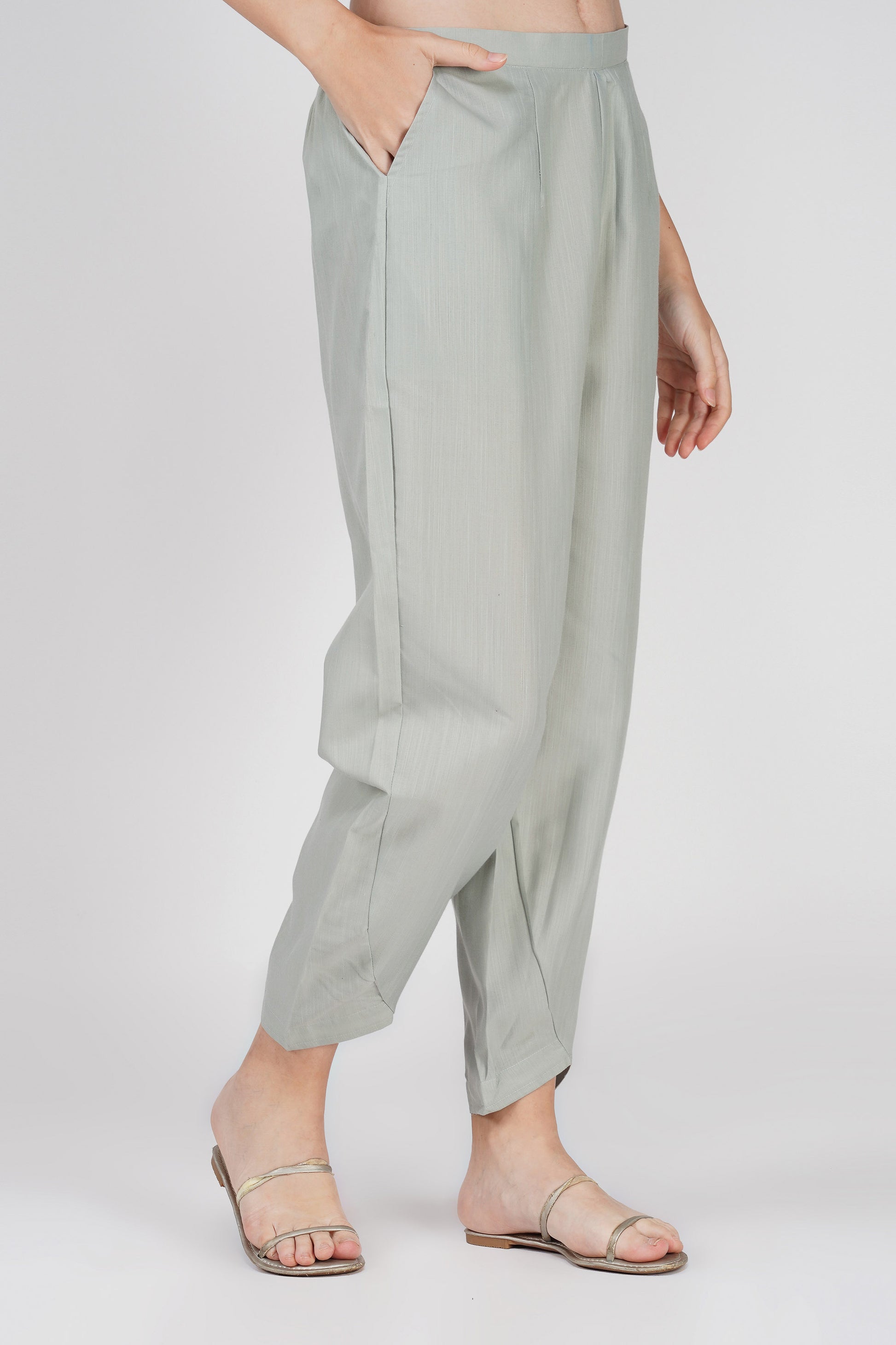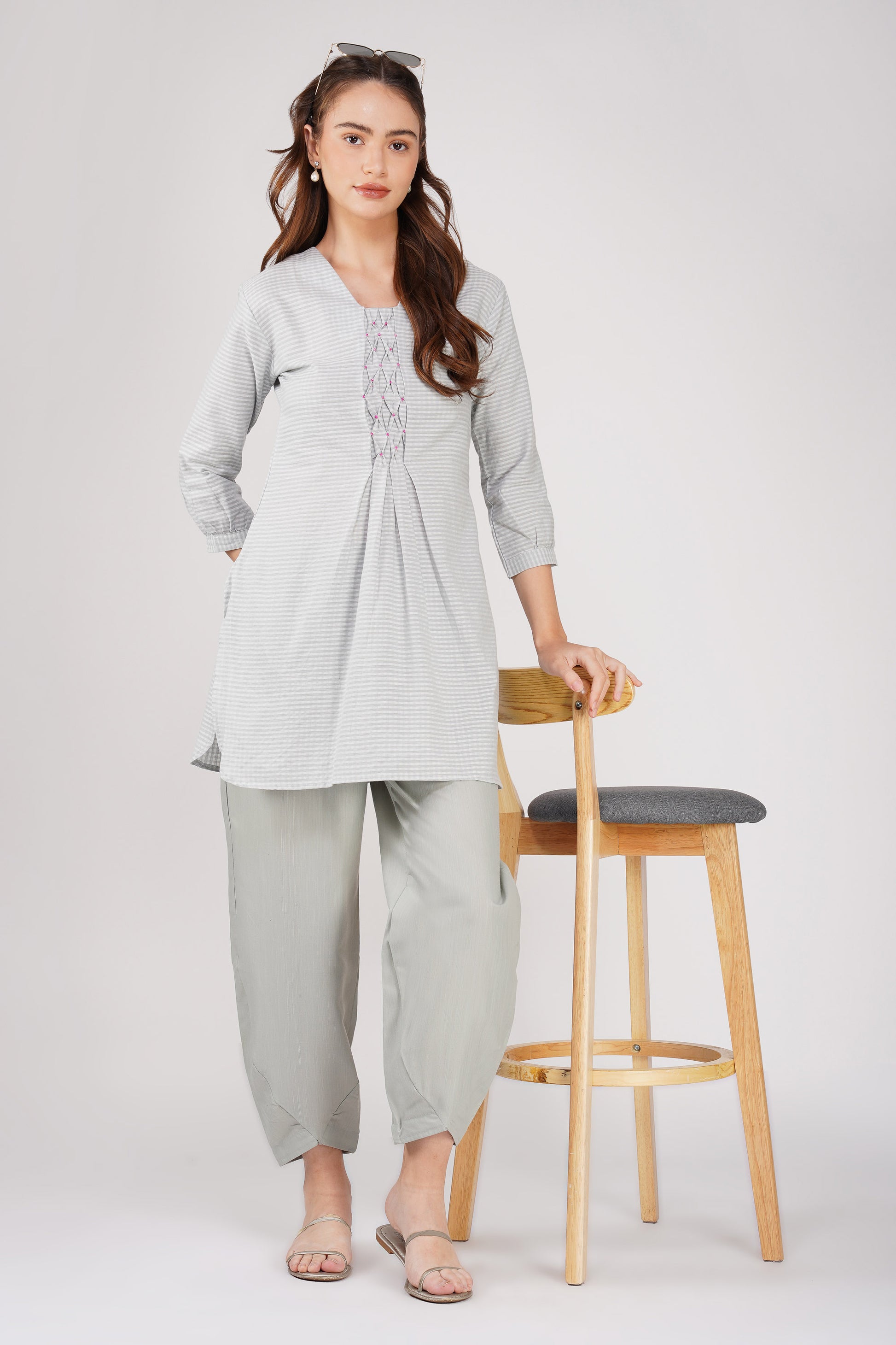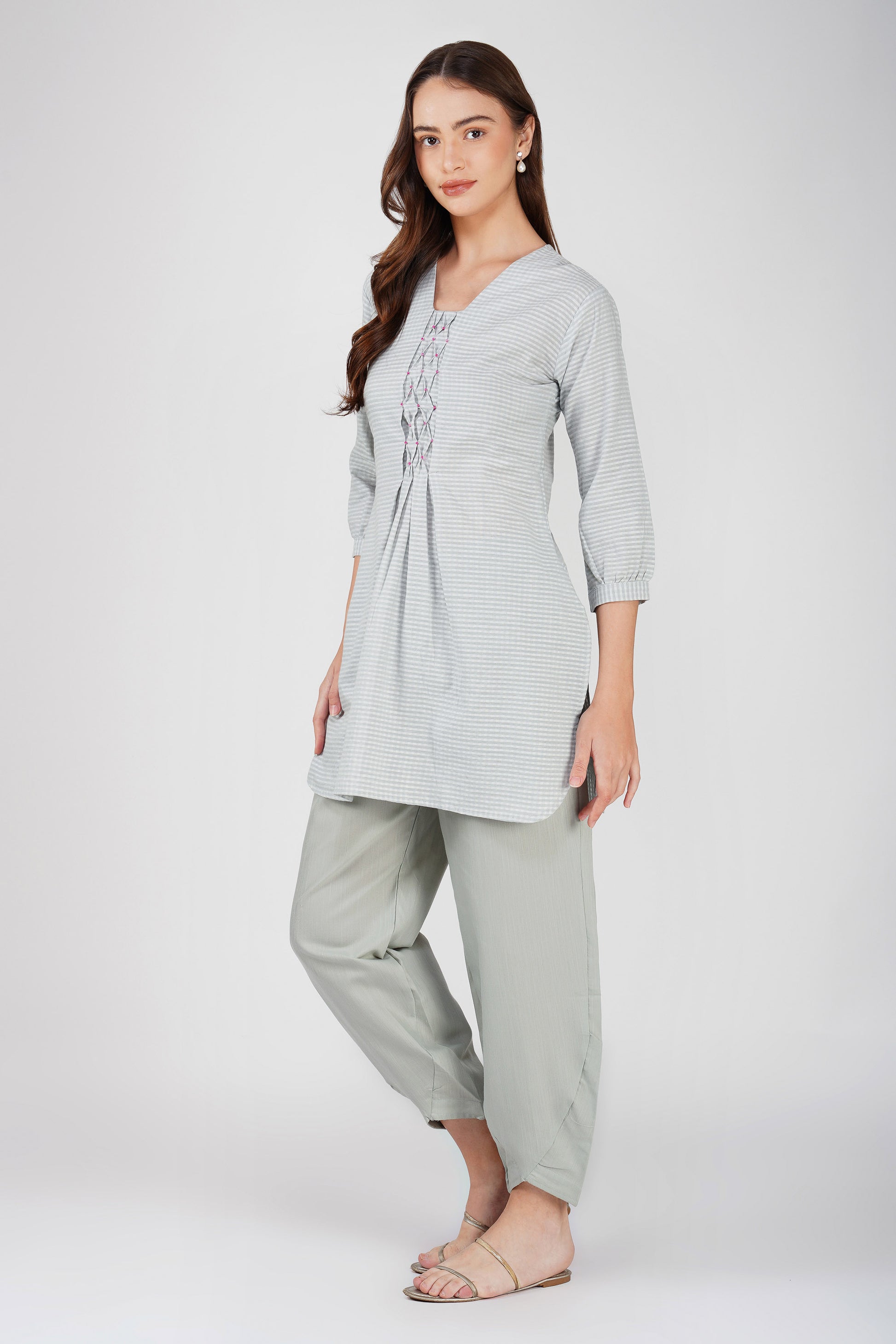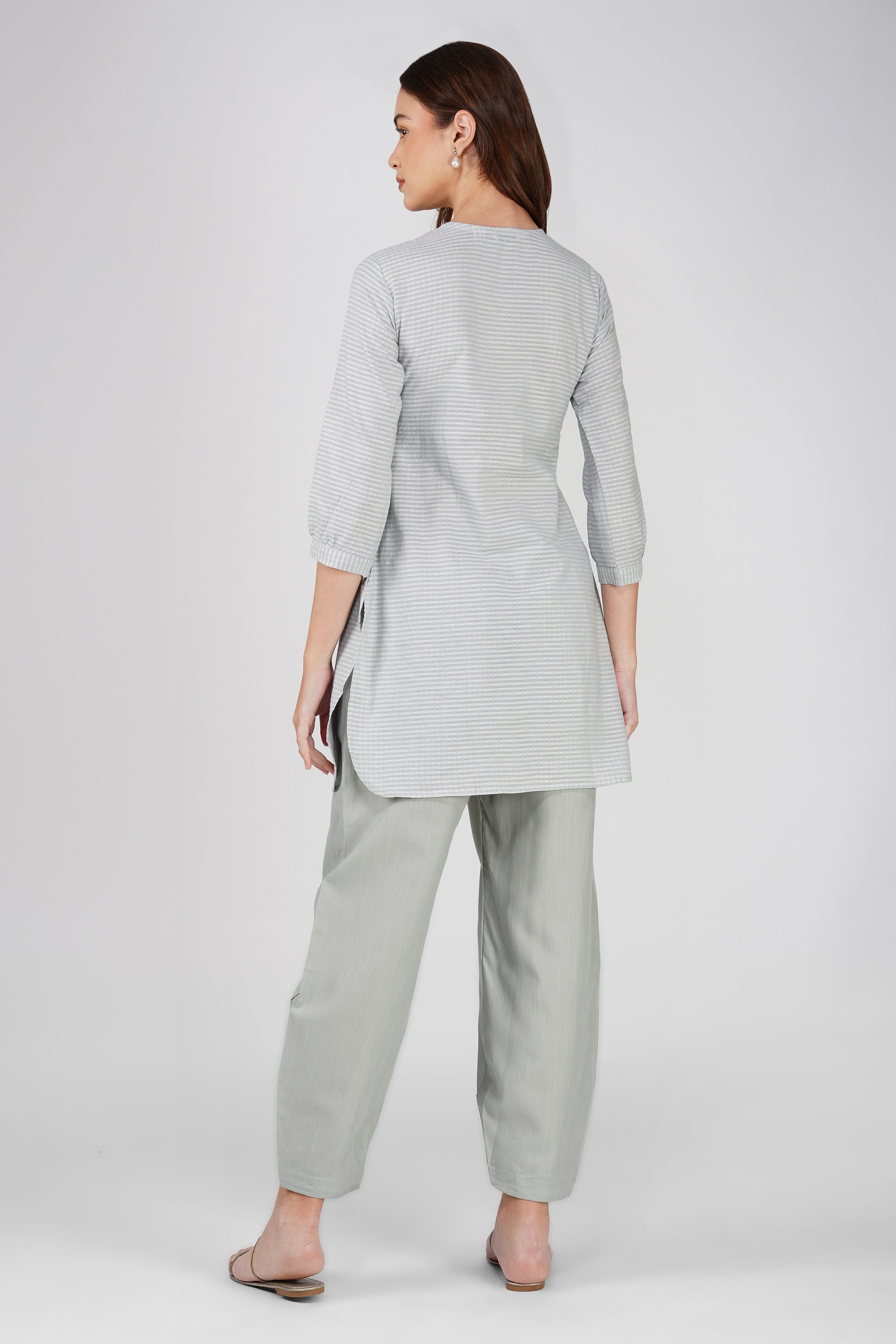 Grey Handloom Kurta Set – Beaded Neckline with Afghani Pants