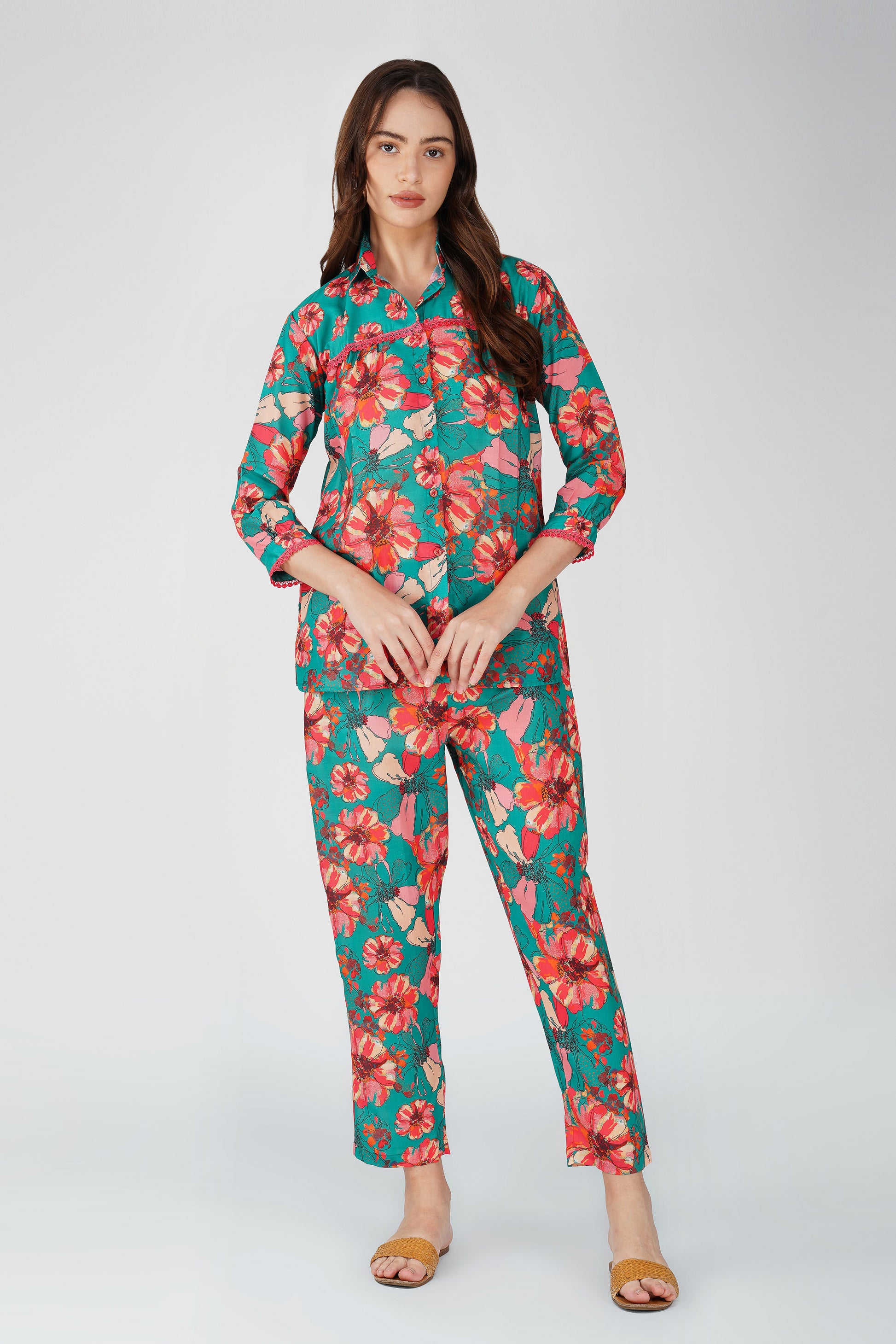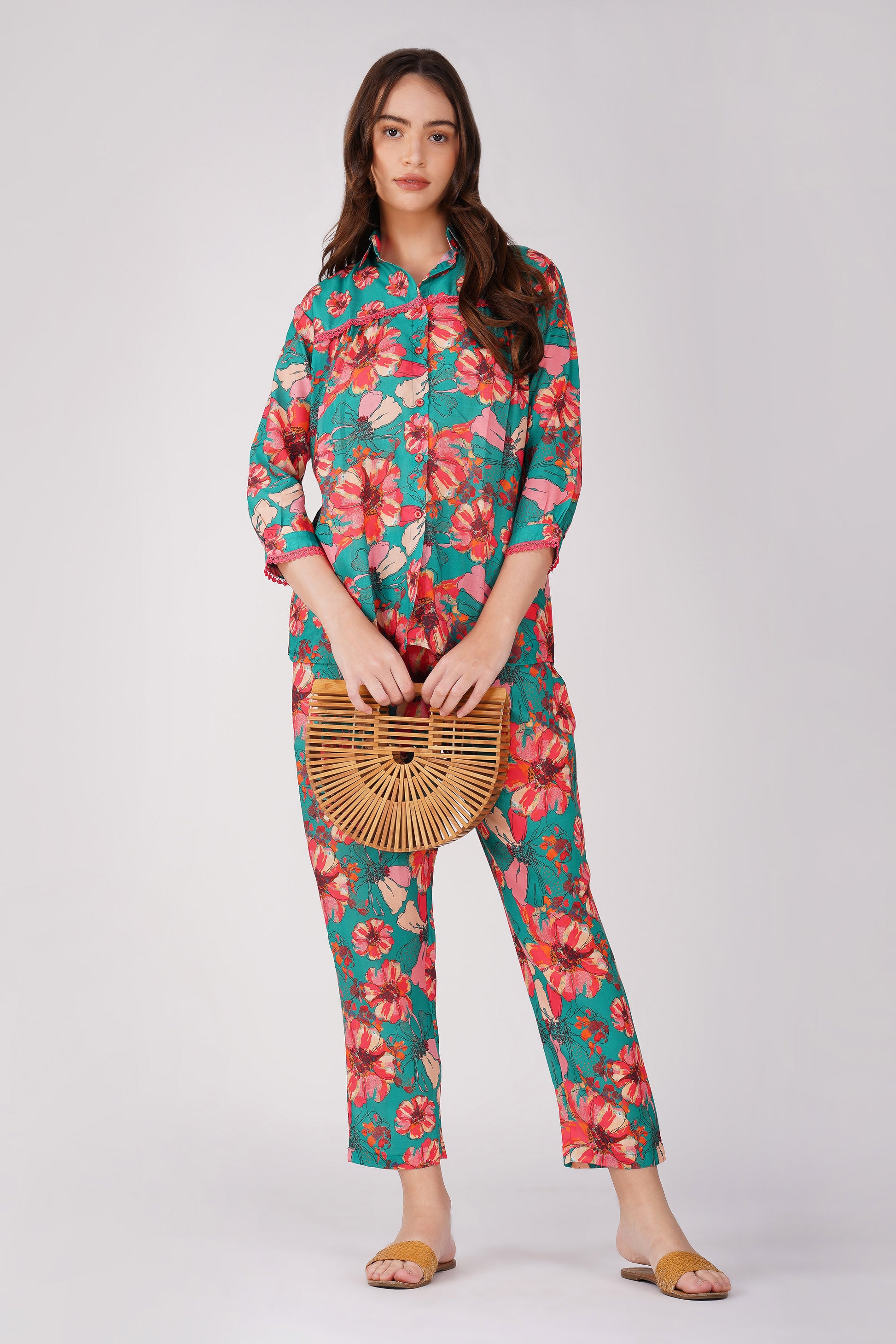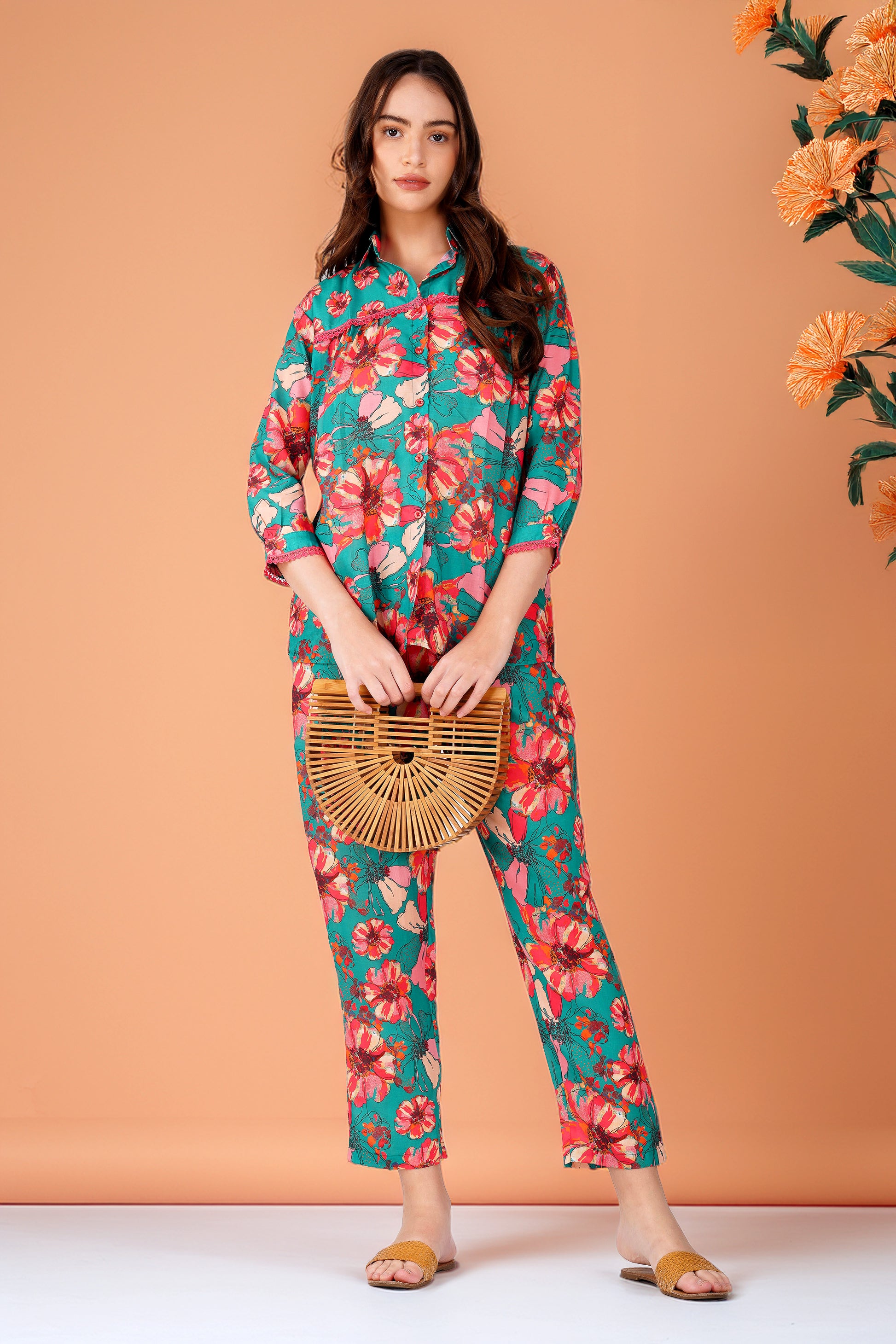 Green Floral Shirt Co-ord Set – Bold Print Top & Relaxed Pants