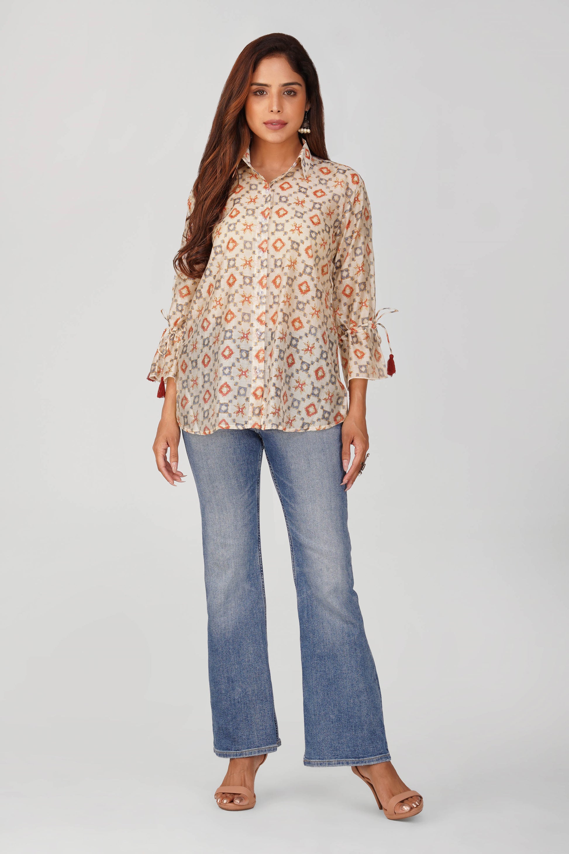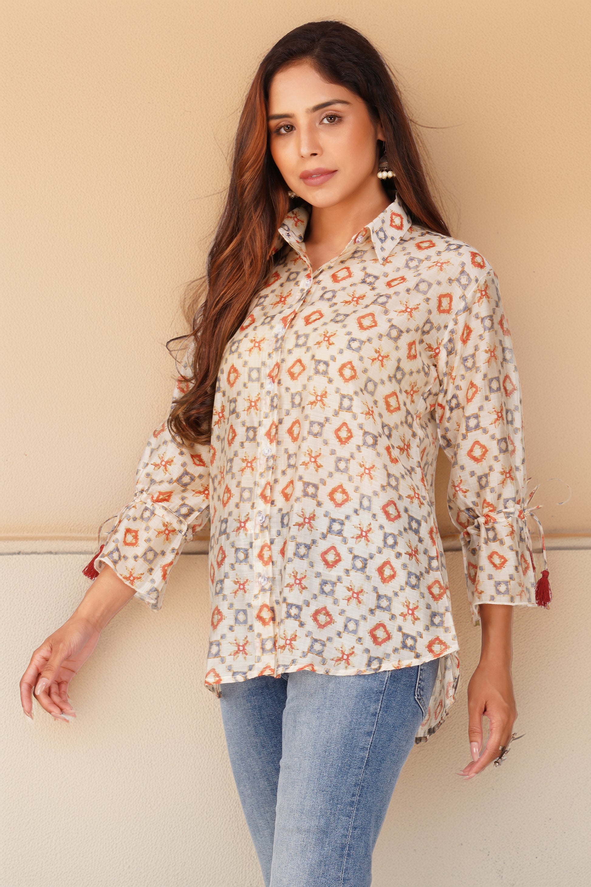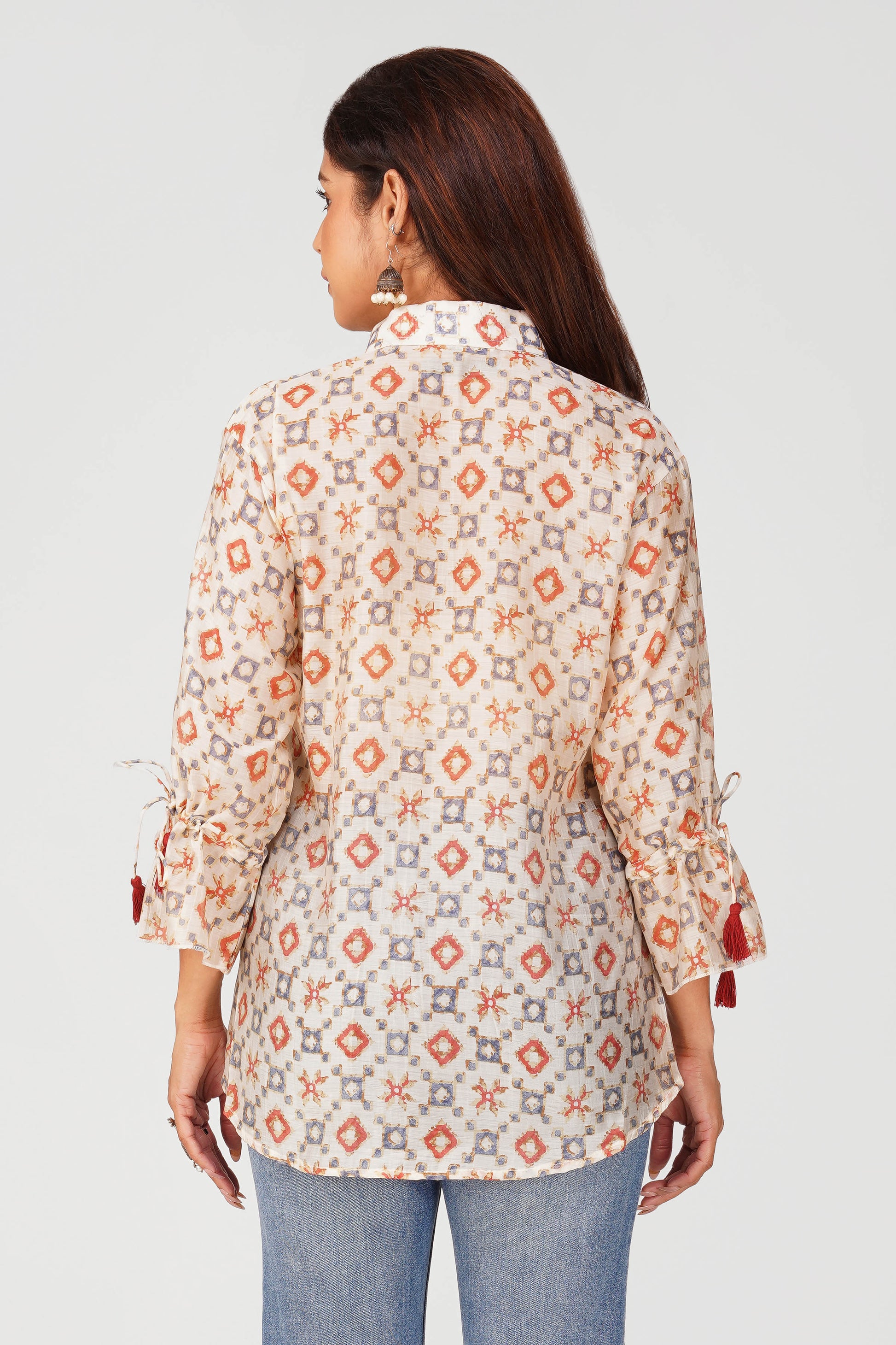 Baawri Ivory Chanderi Printed Shirt with Handmade Tassel Detail | Bindigasm