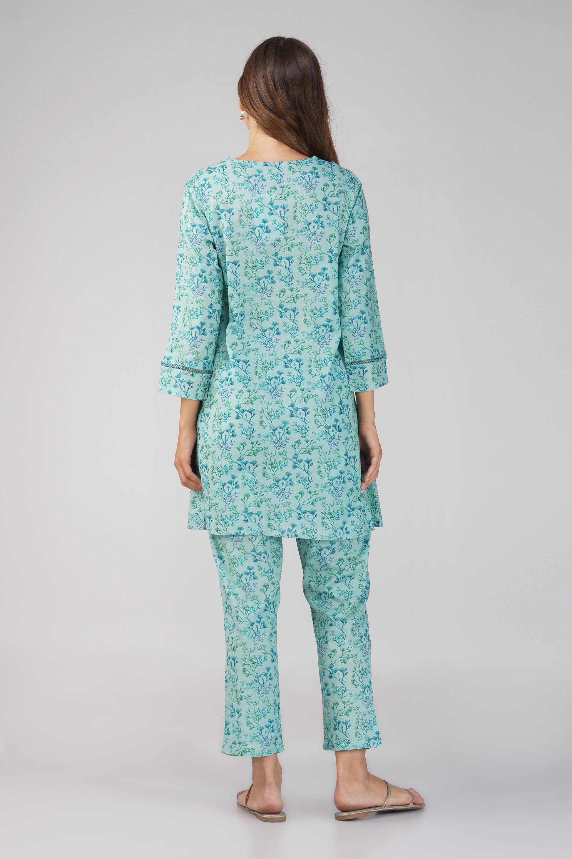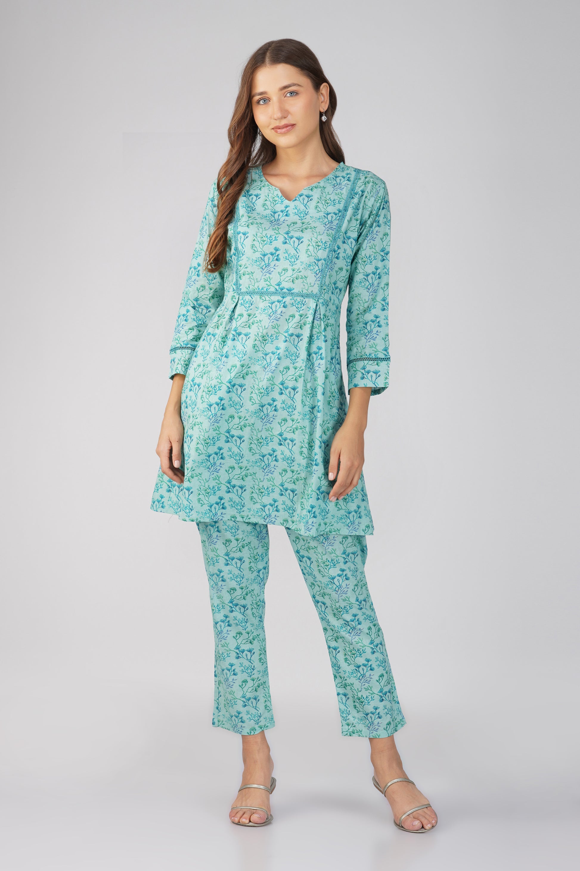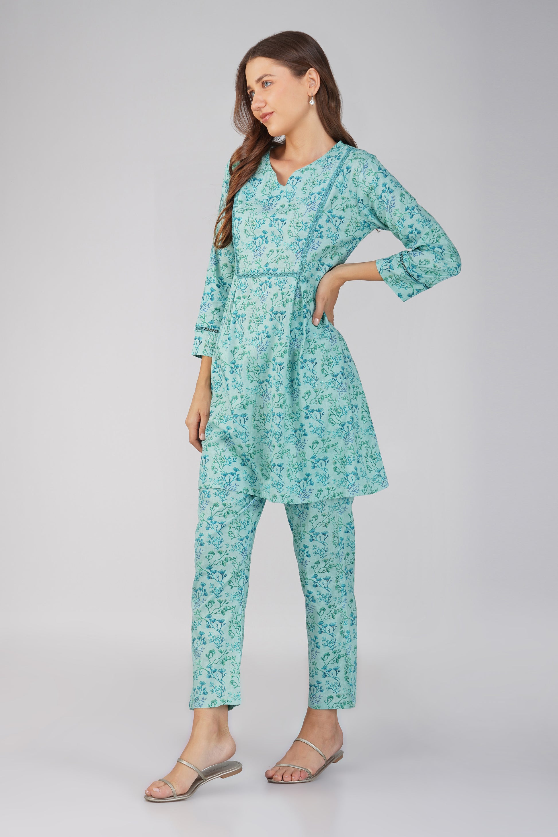 Breathe easy in Kajal ๐ โ now in a soft and serene Sea Blue. This 100% cotton co-ord set features an all-over ditsy foliage print on both the kurta and pants, with delicate lace details on the neckline and sleeves. The straight-fit printed bottoms come with a side pocket, making this your go-to for effortless charm and daily ease.