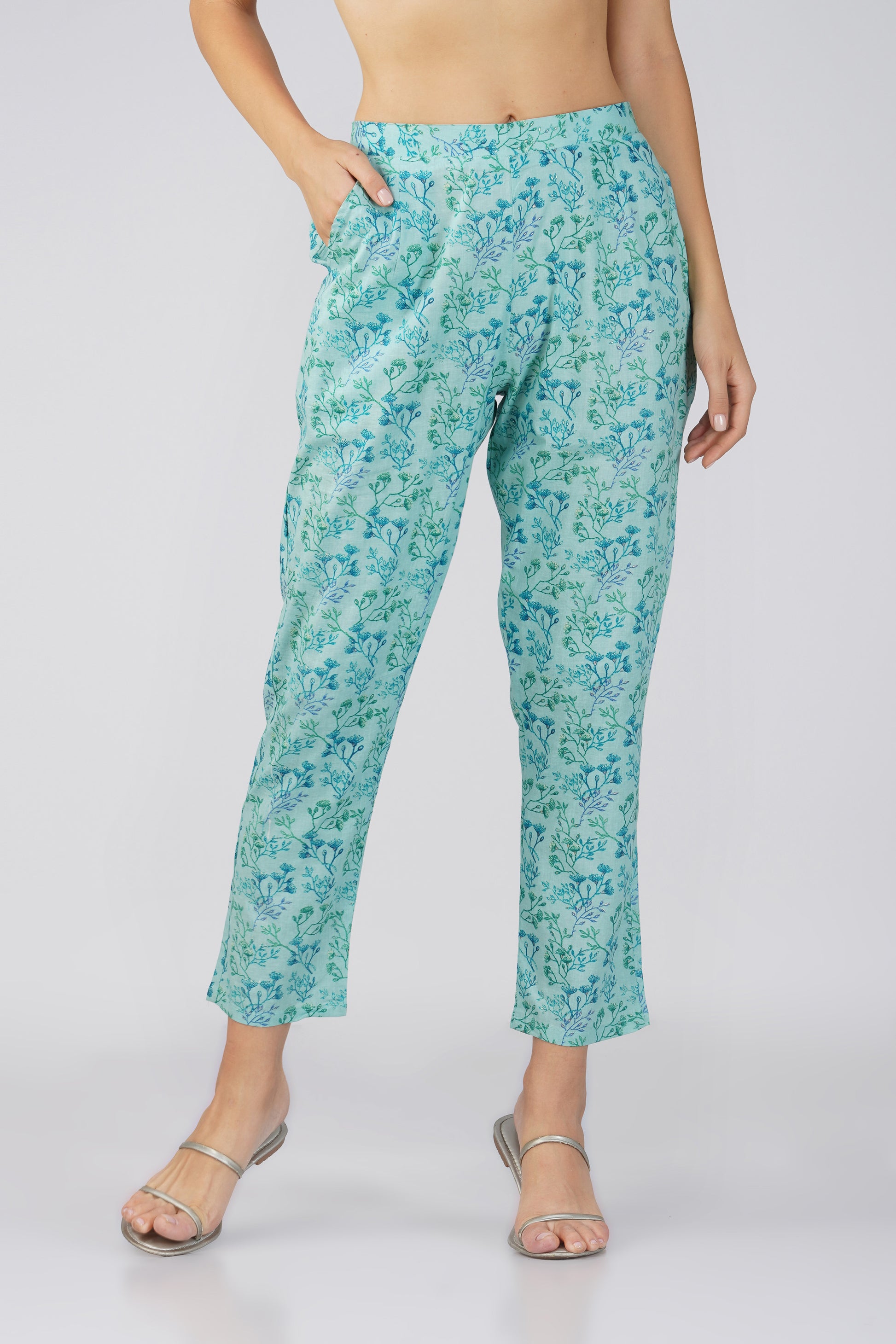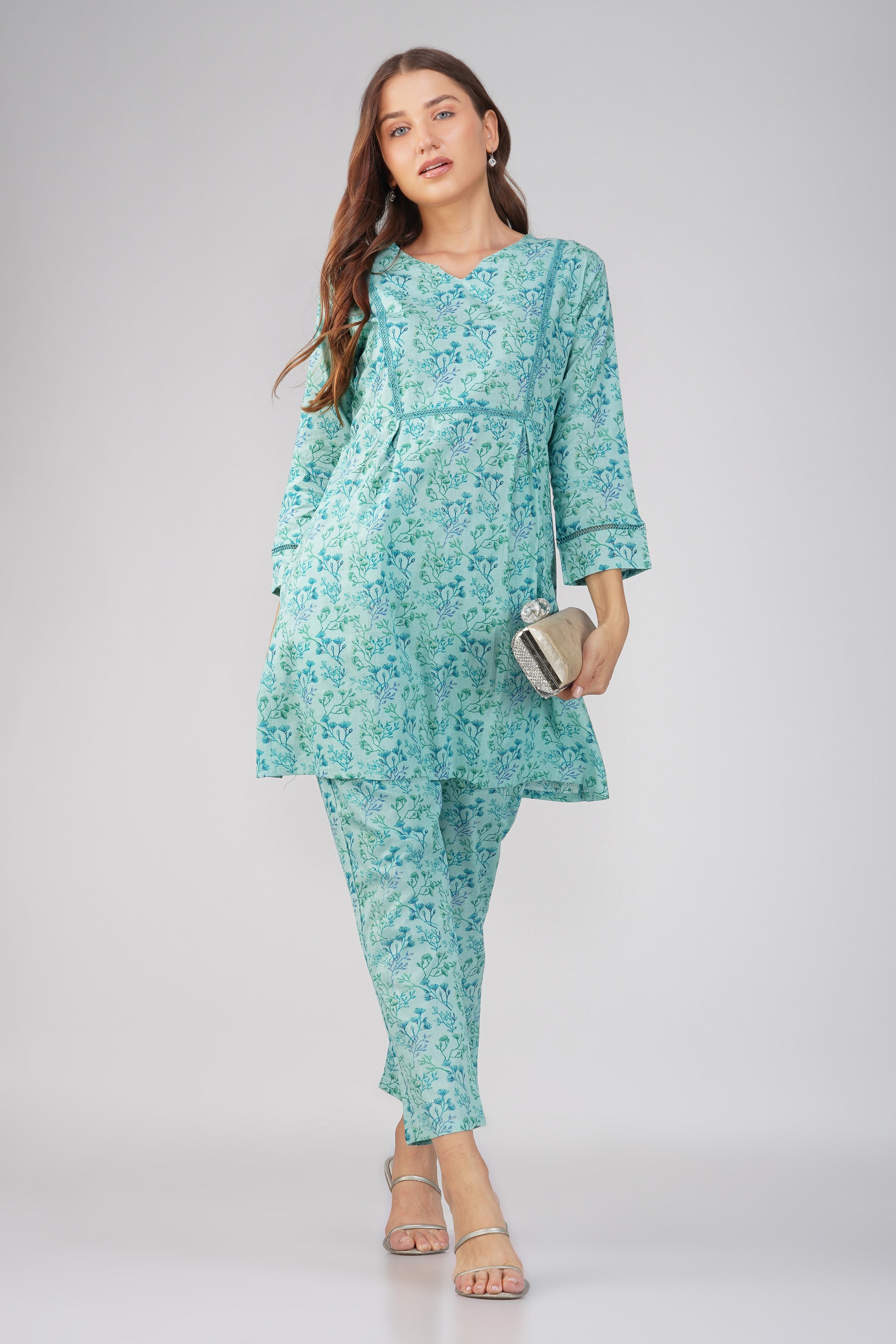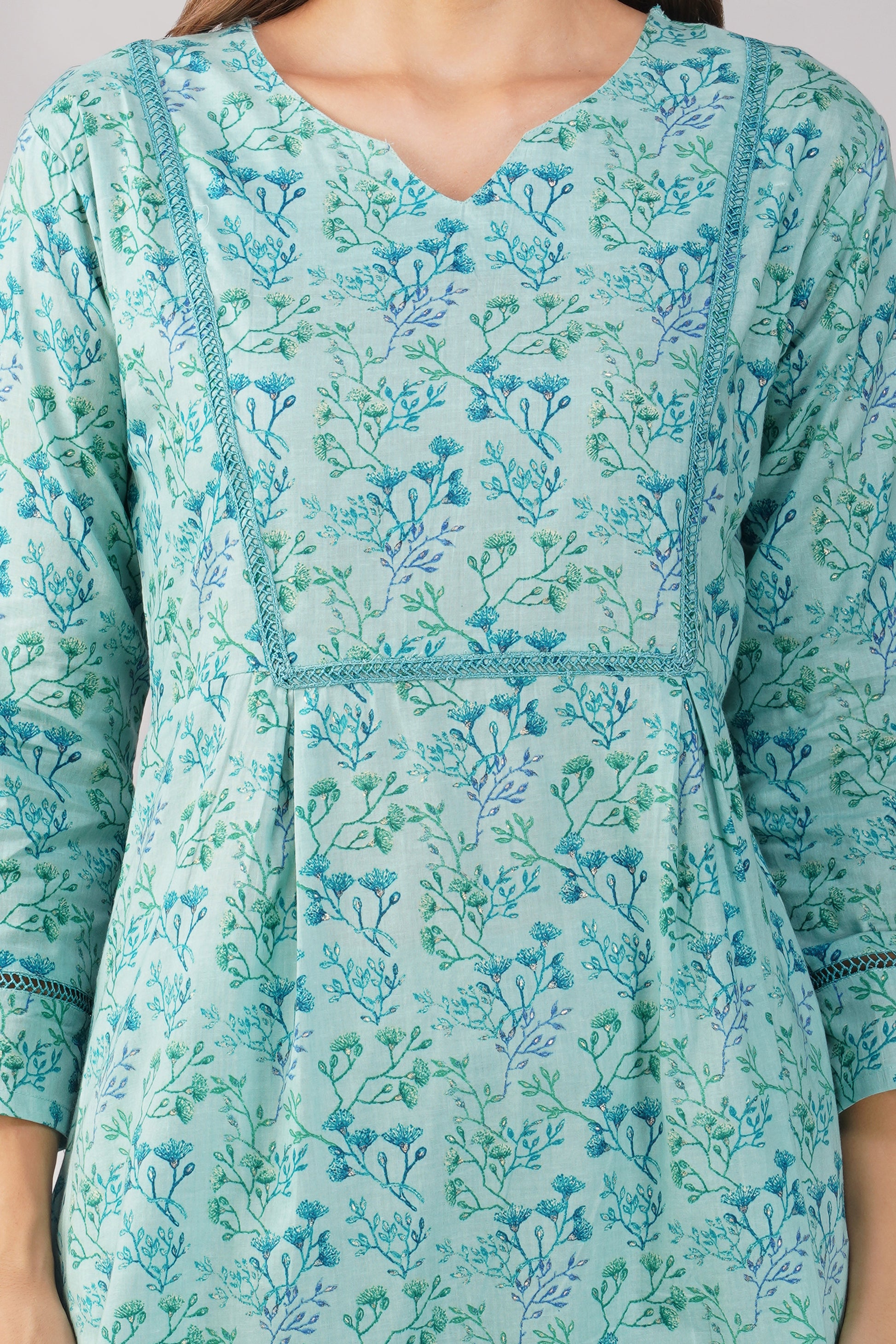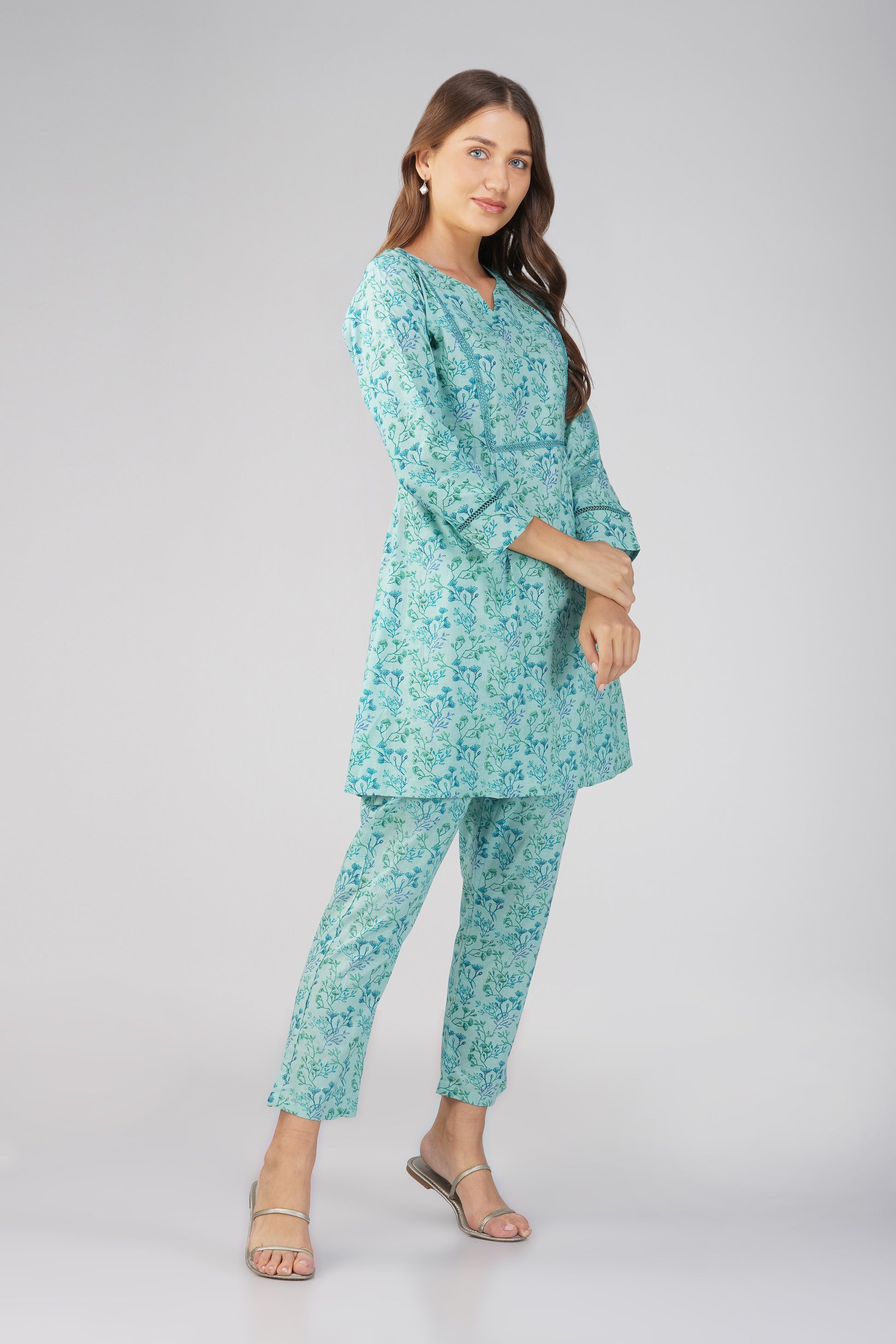 Breathe easy in Kajal ๐ โ now in a soft and serene Sea Blue. This 100% cotton co-ord set features an all-over ditsy foliage print on both the kurta and pants, with delicate lace details on the neckline and sleeves. The straight-fit printed bottoms come with a side pocket, making this your go-to for effortless charm and daily ease.