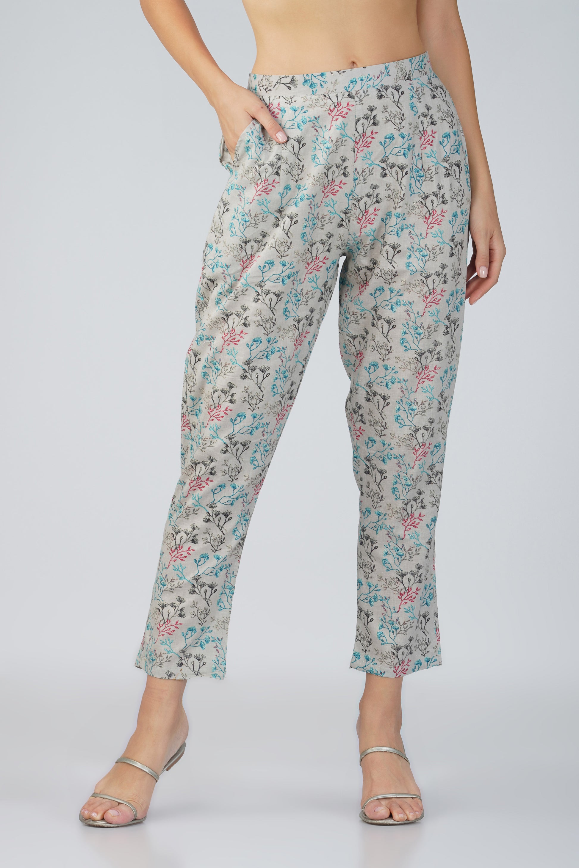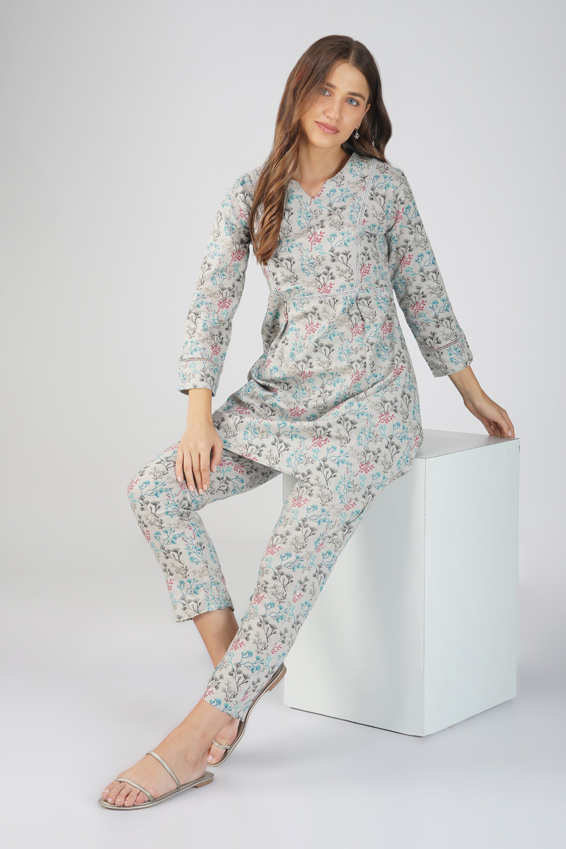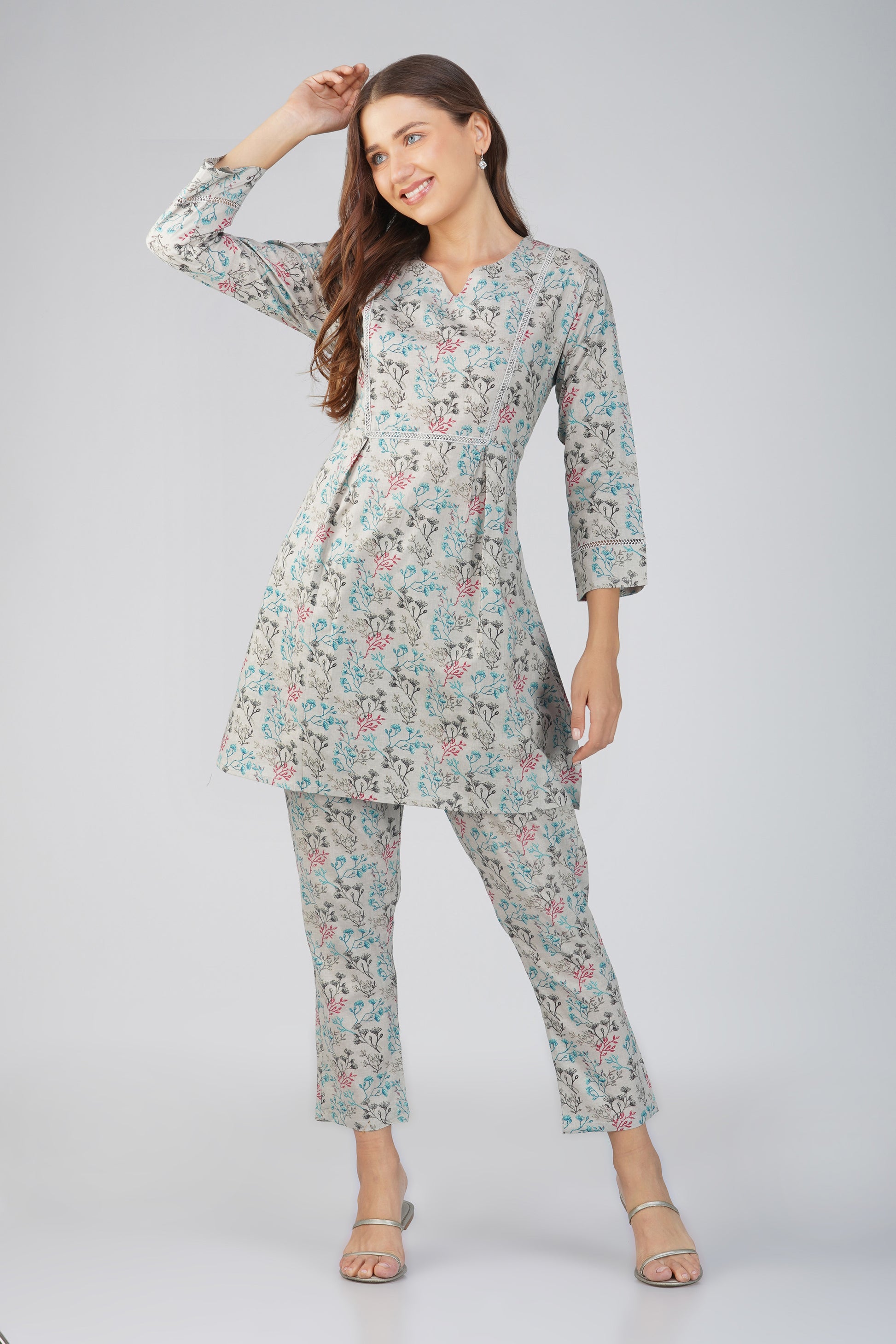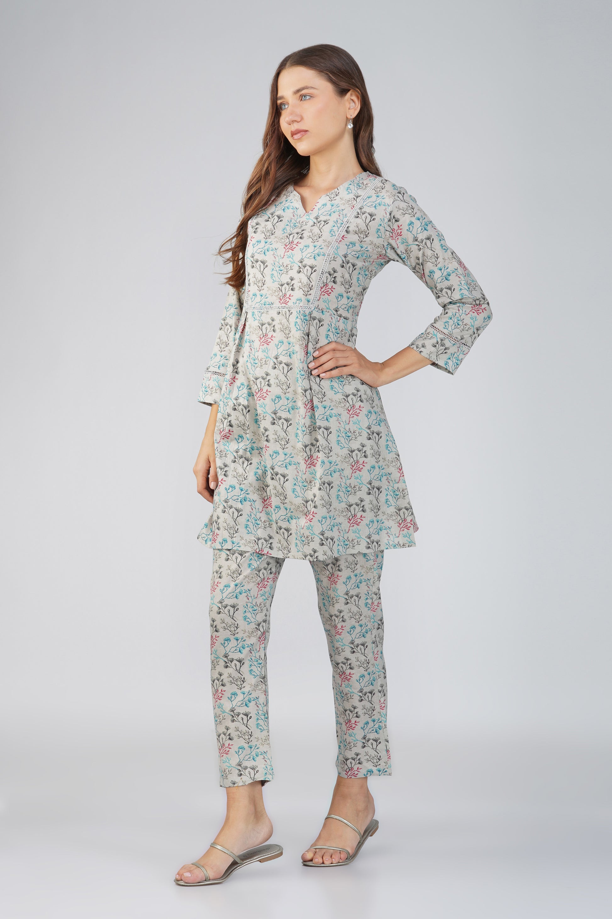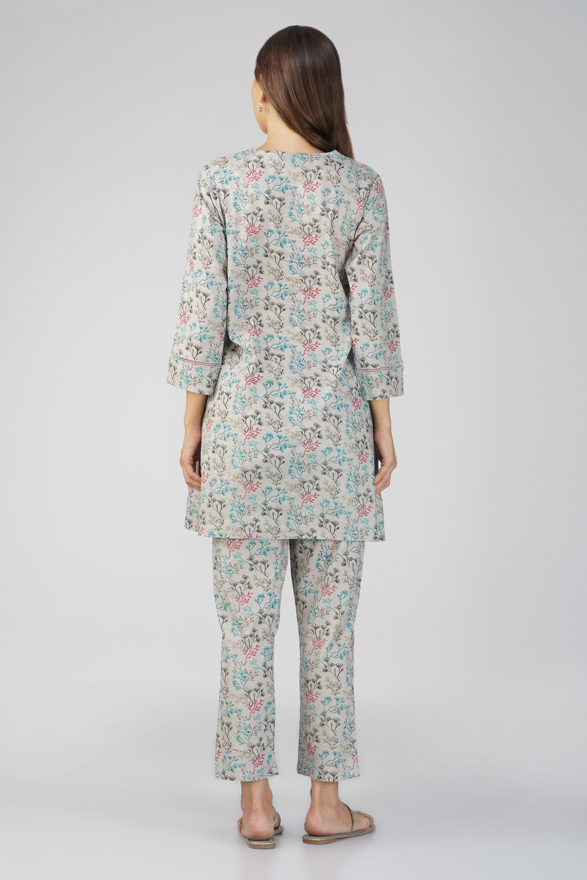 Kajal Grey Cotton Co-ord Set – Printed Kurta with Lace Detailing & Pocketed Pants