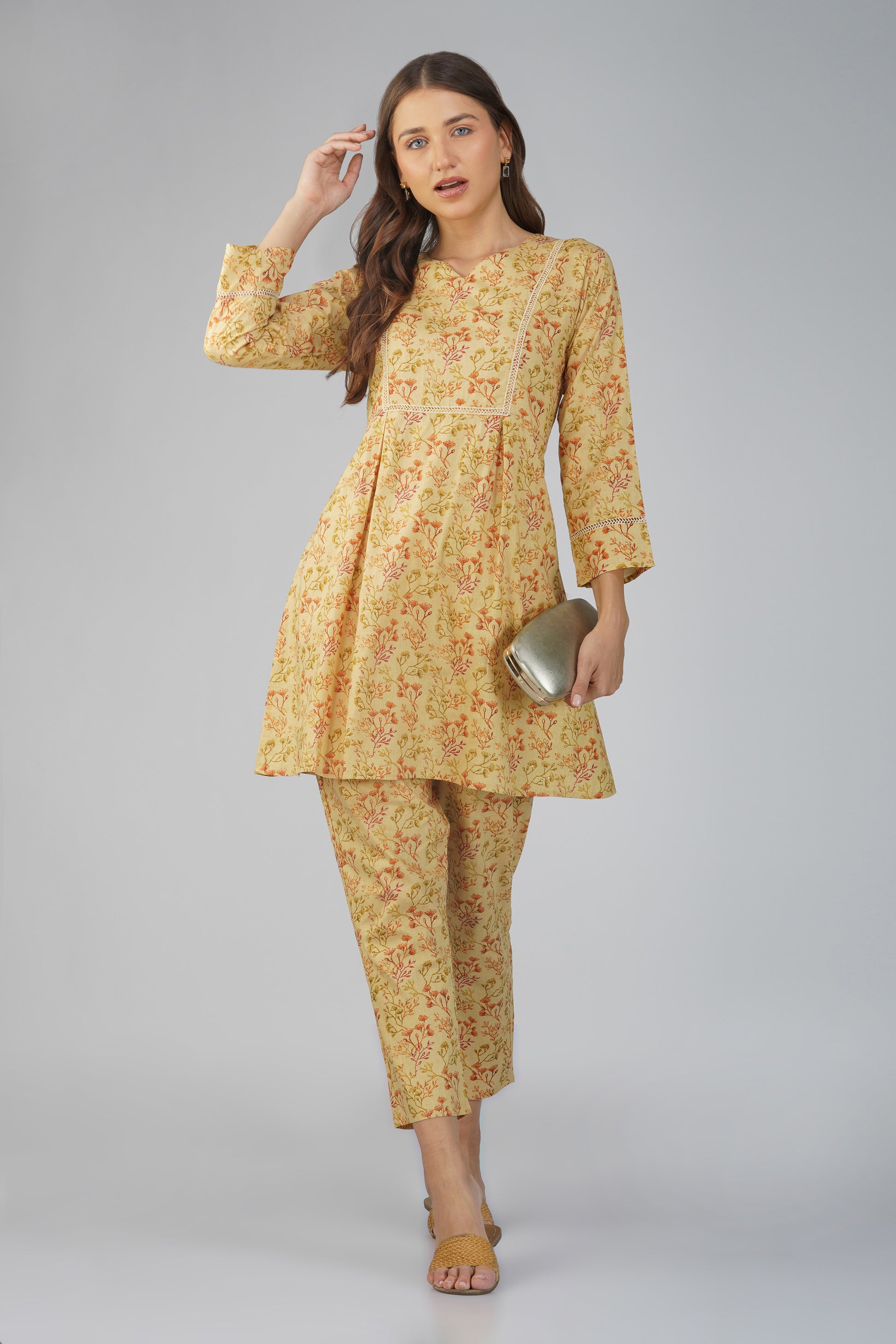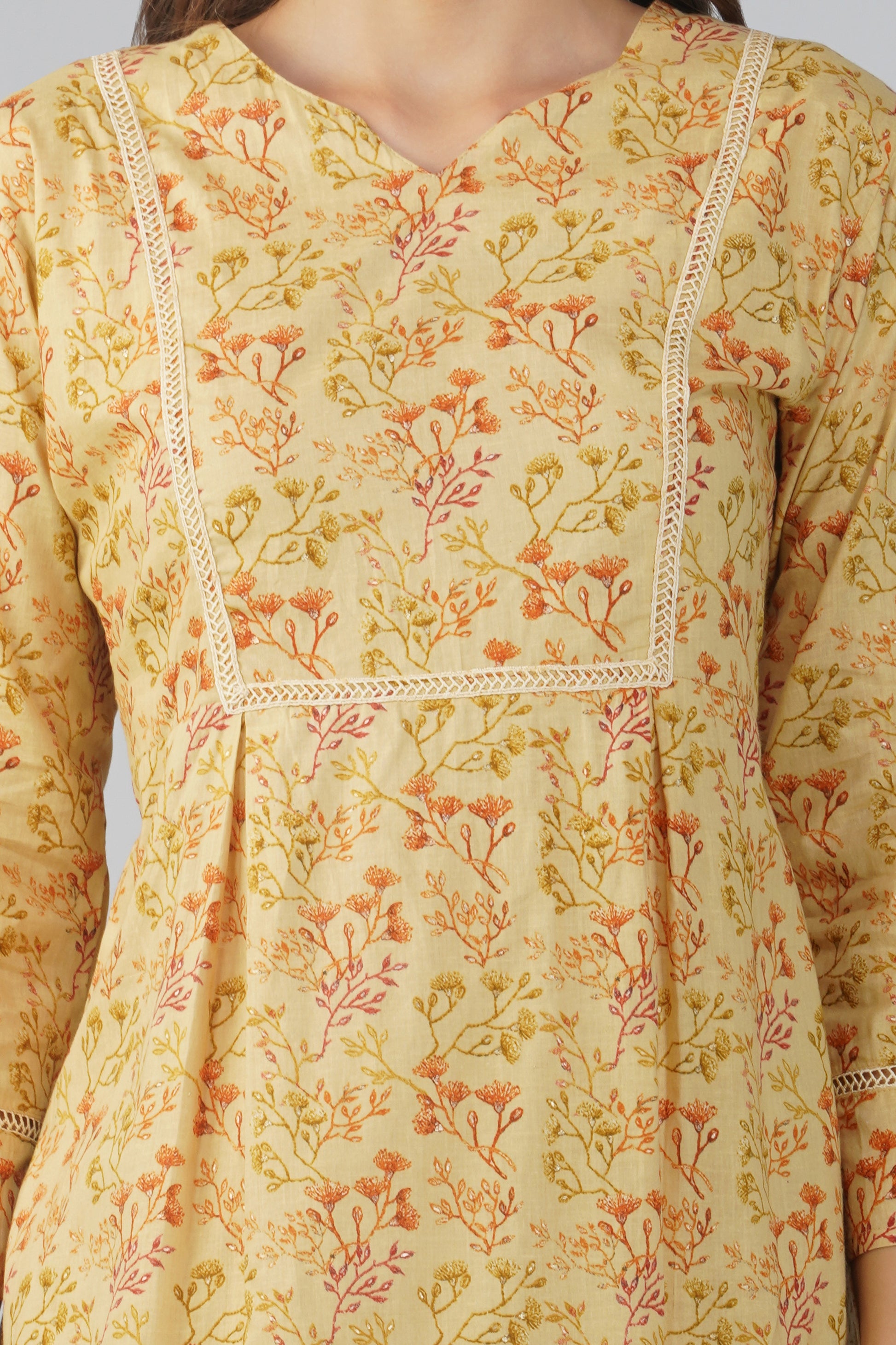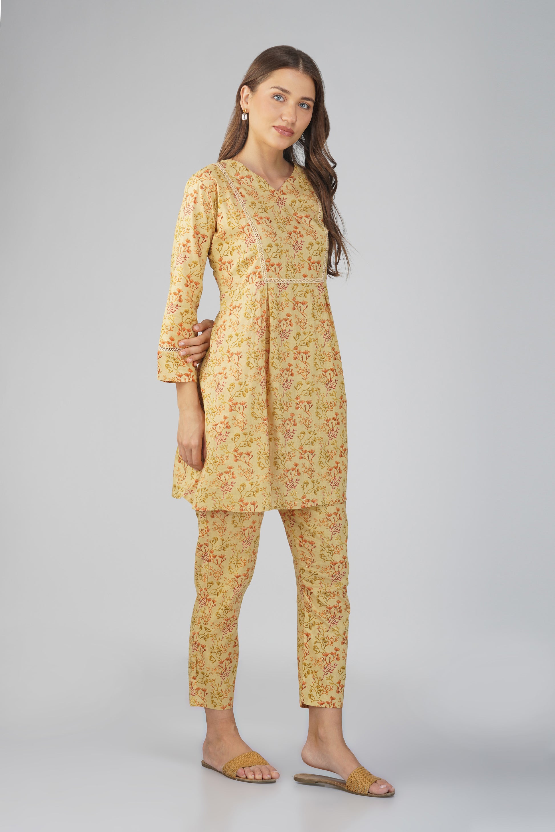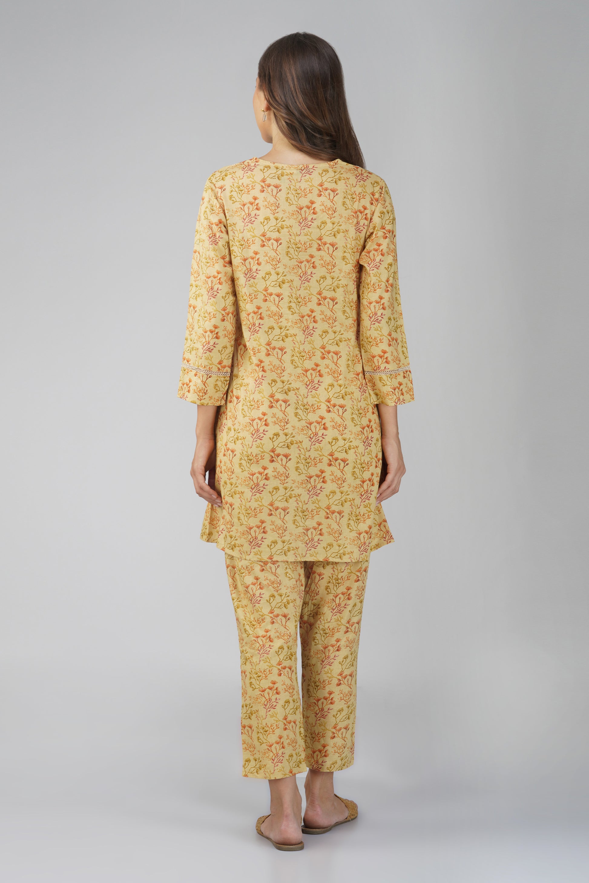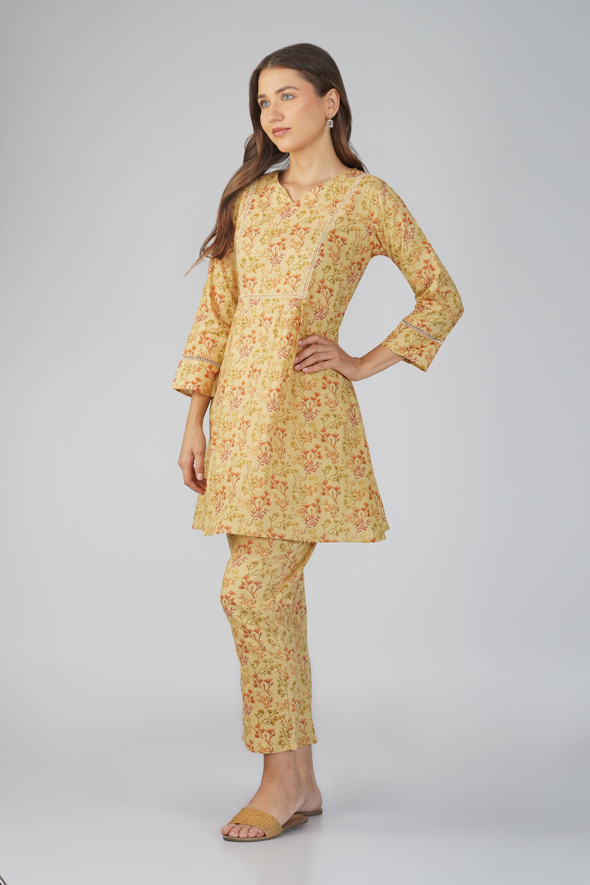 Kajal Yellow Cotton Co-ord Set – All Over Print Kurta with Lace Detail & Pocketed Pants