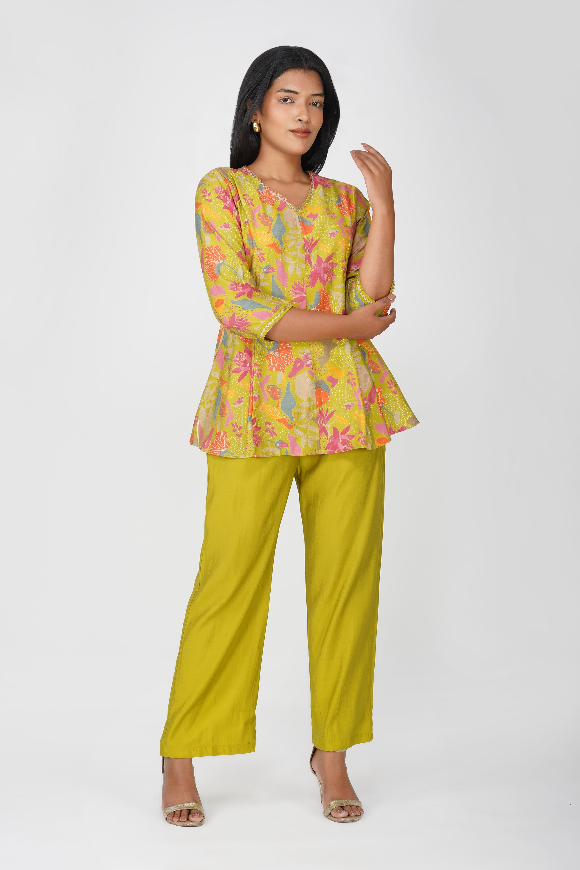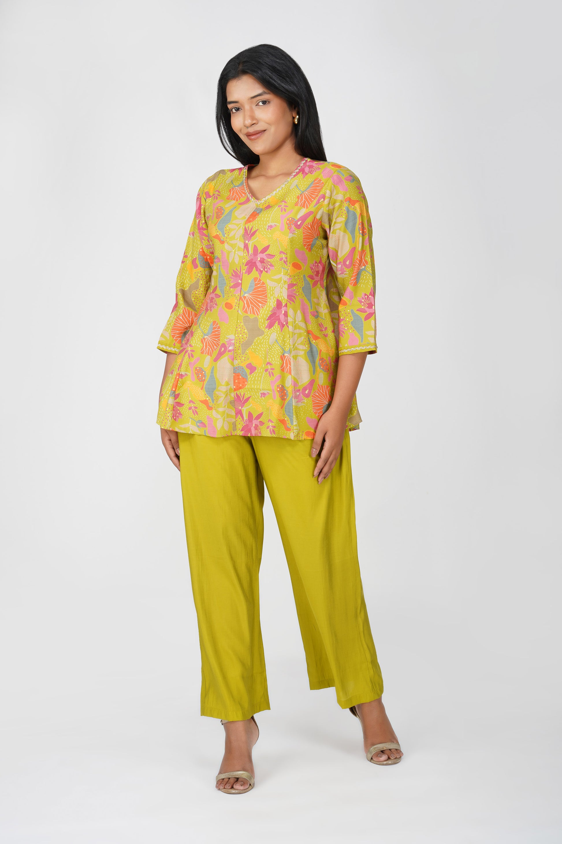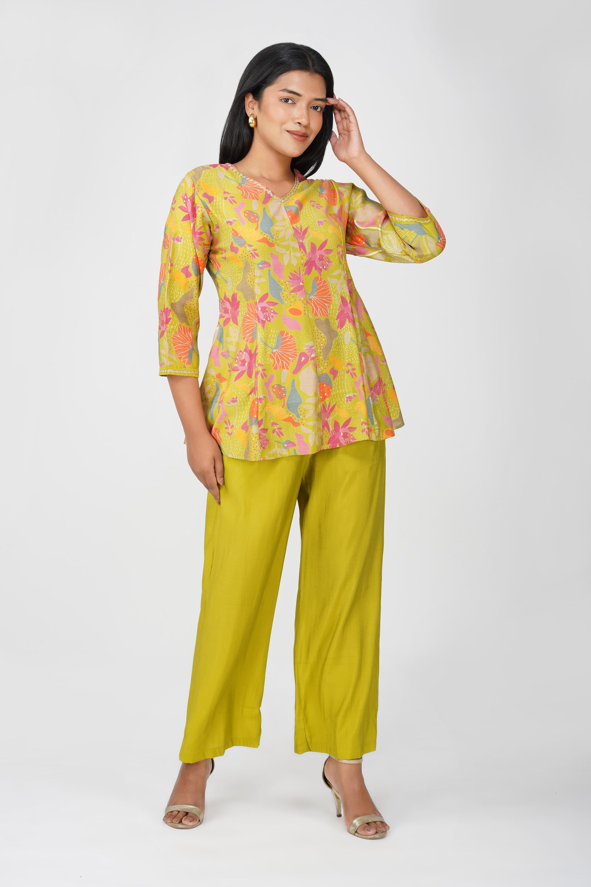 Kali Co-ord Set – Lime Green Print Tunic with Zari Lace & Flared Silk Pants