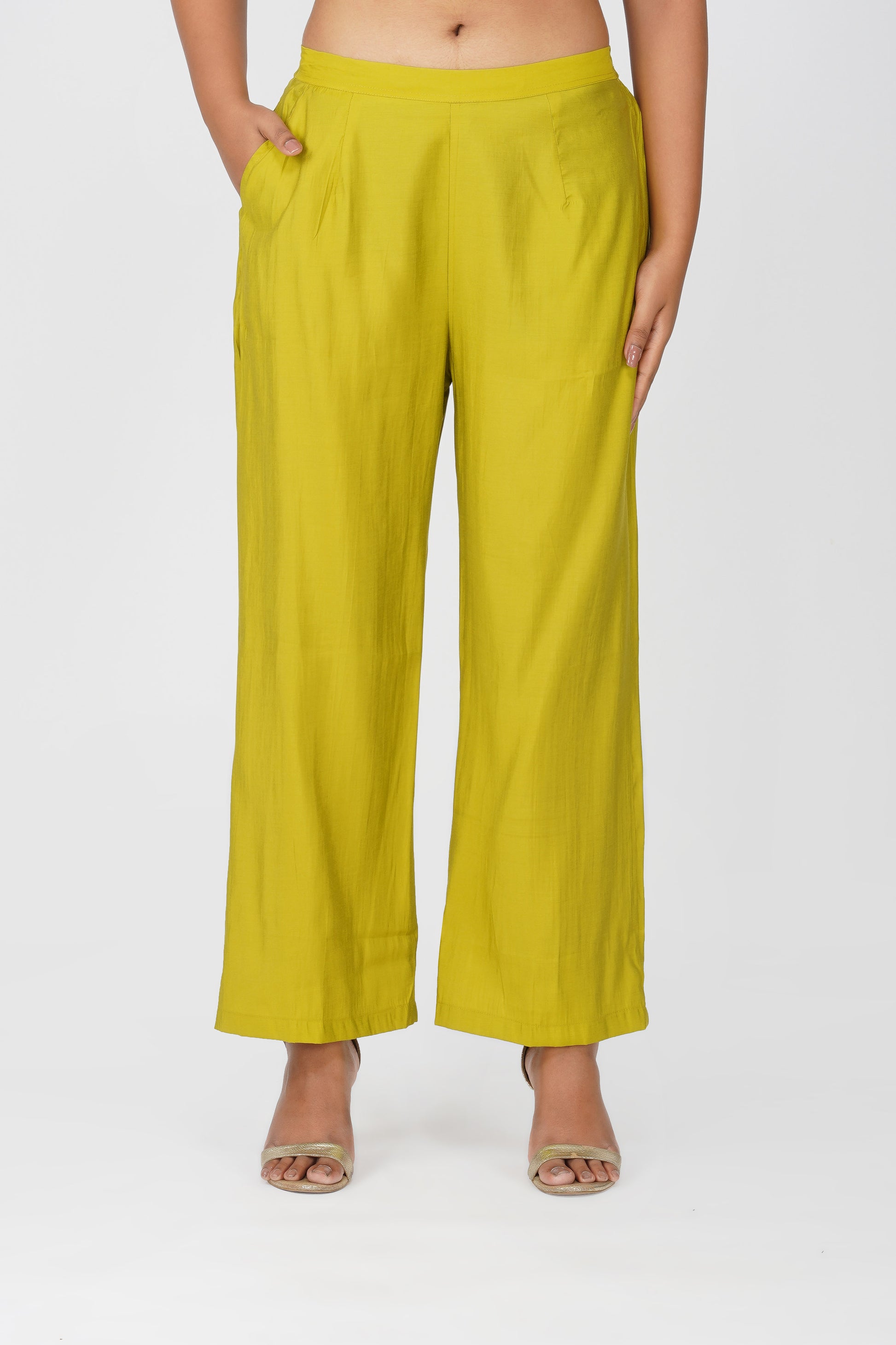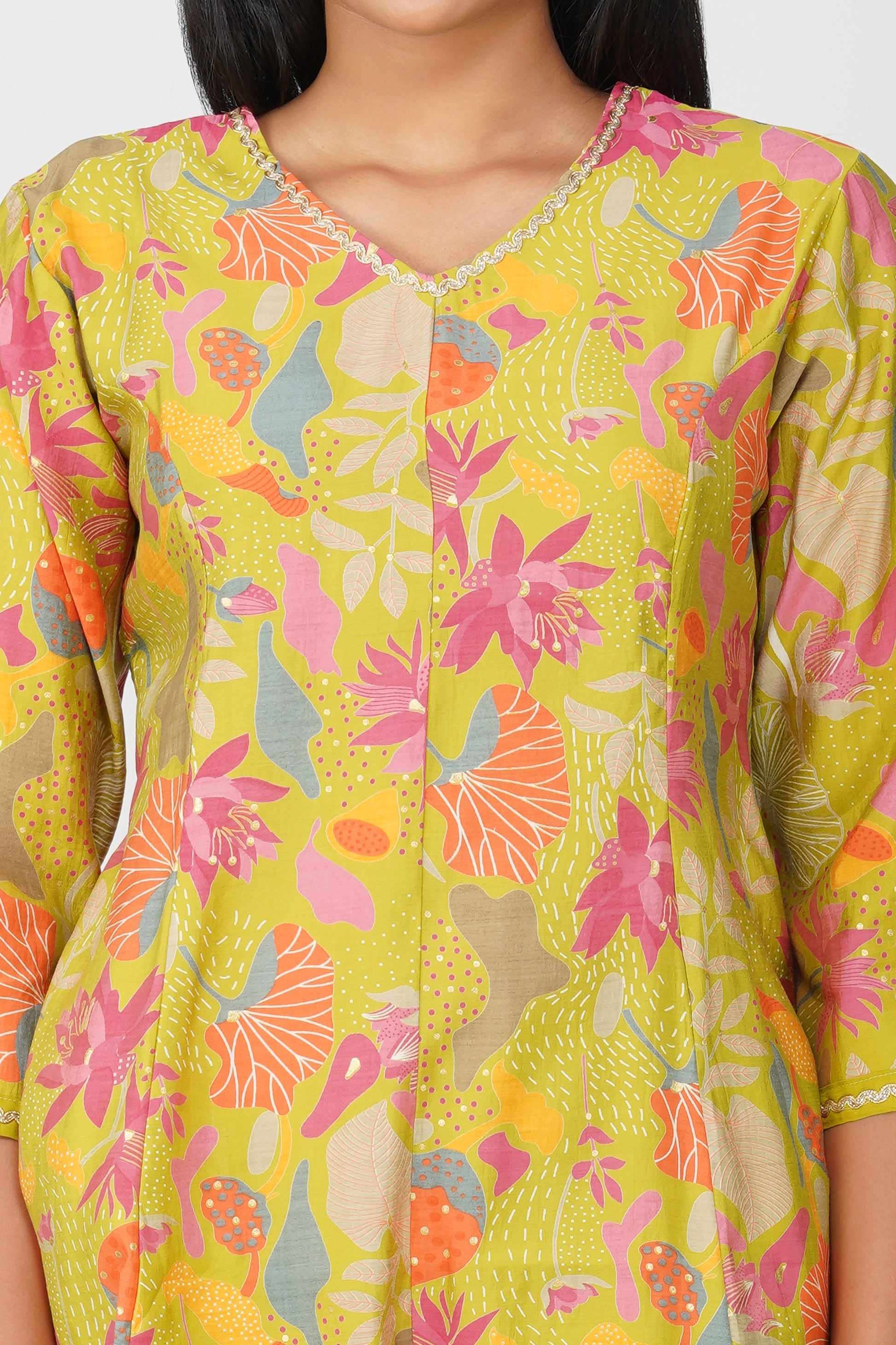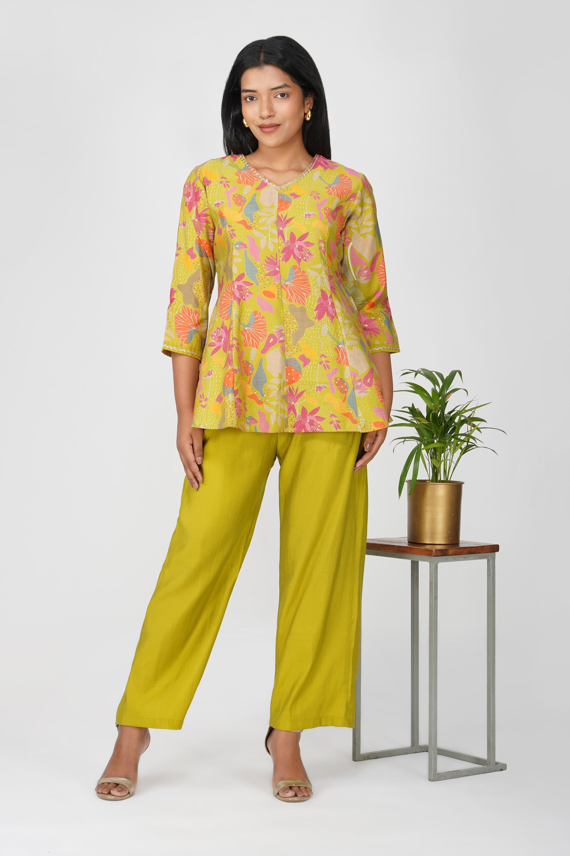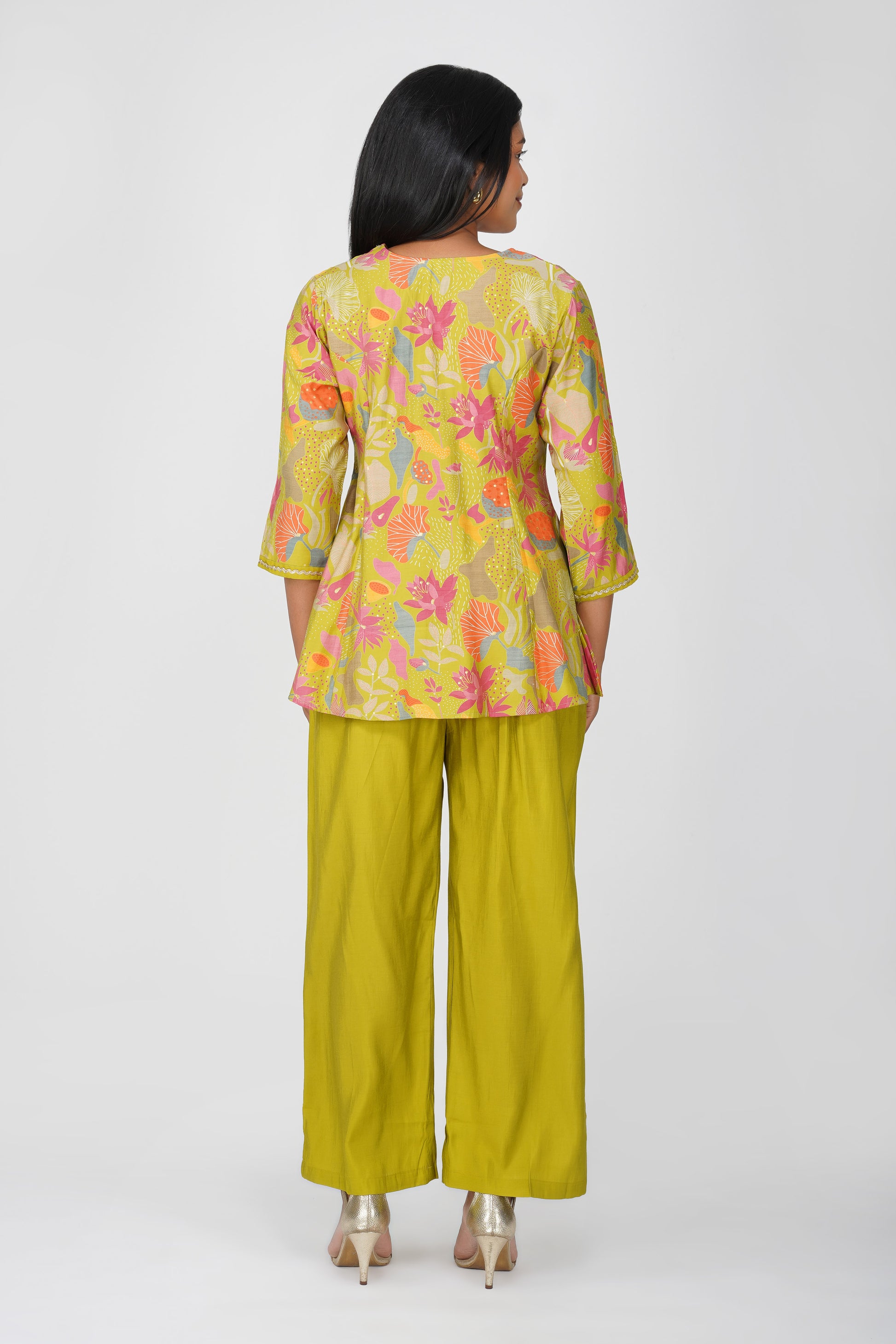 Kali Co-ord Set – Lime Green Print Tunic with Zari Lace & Flared Silk Pants