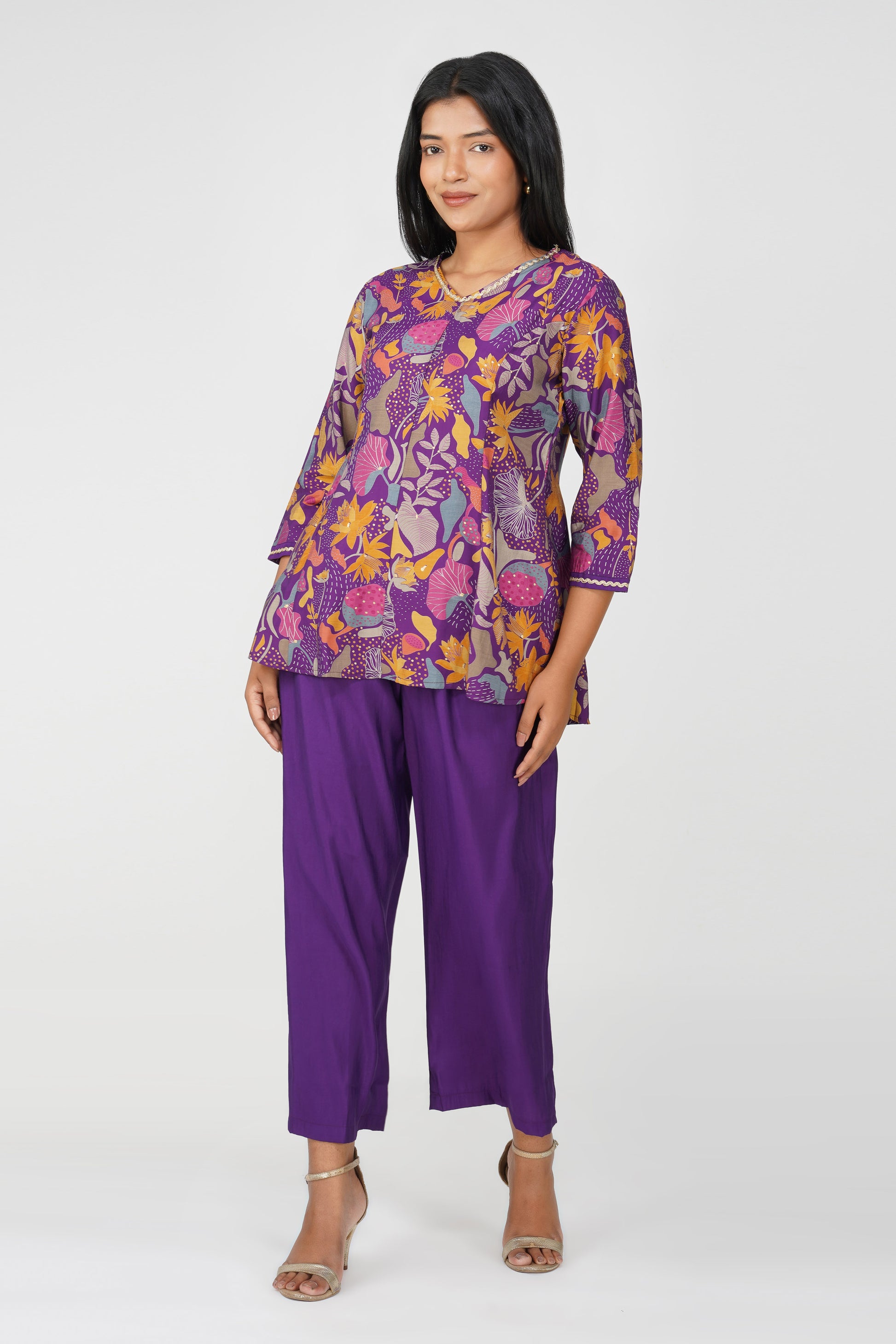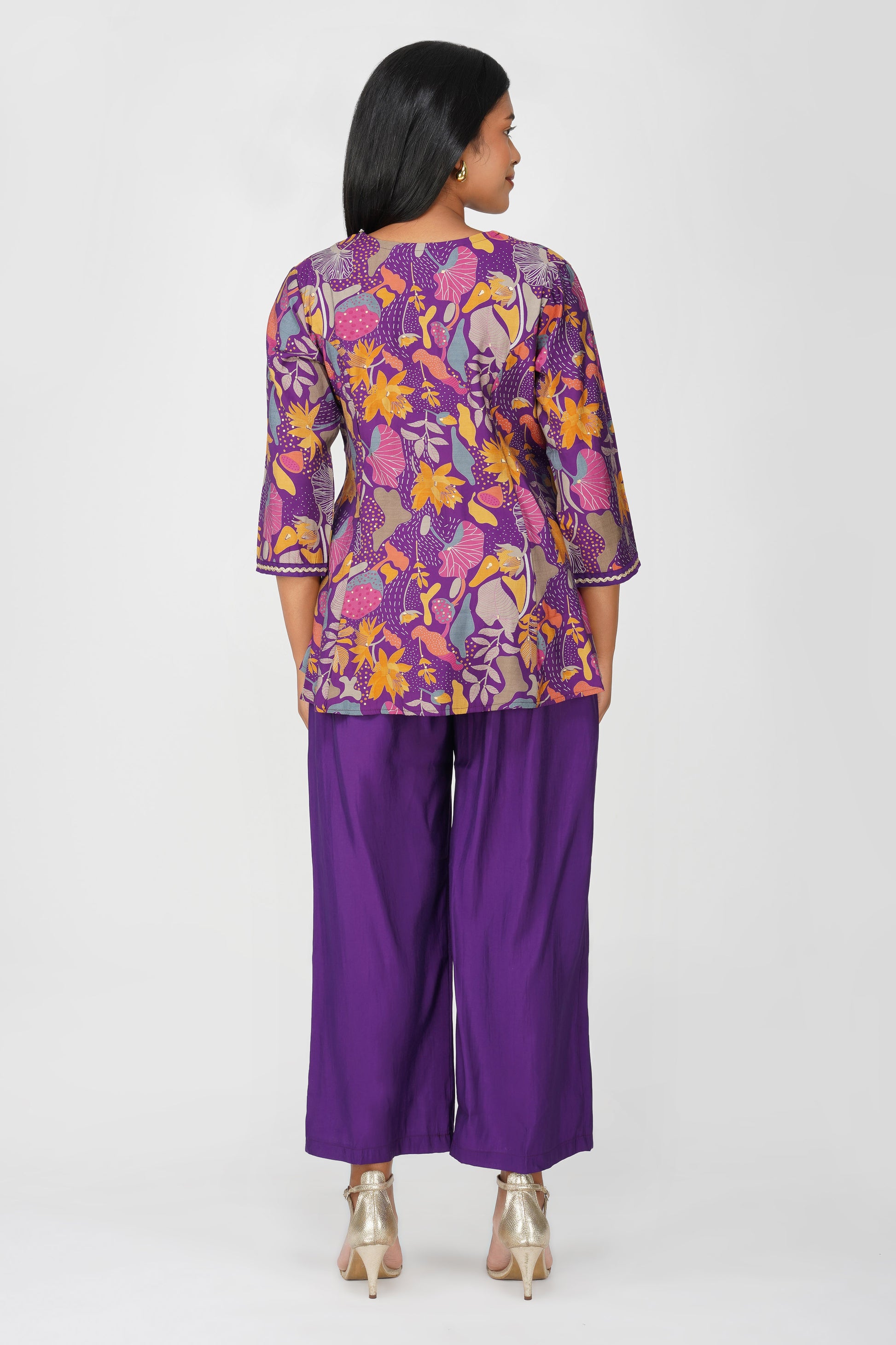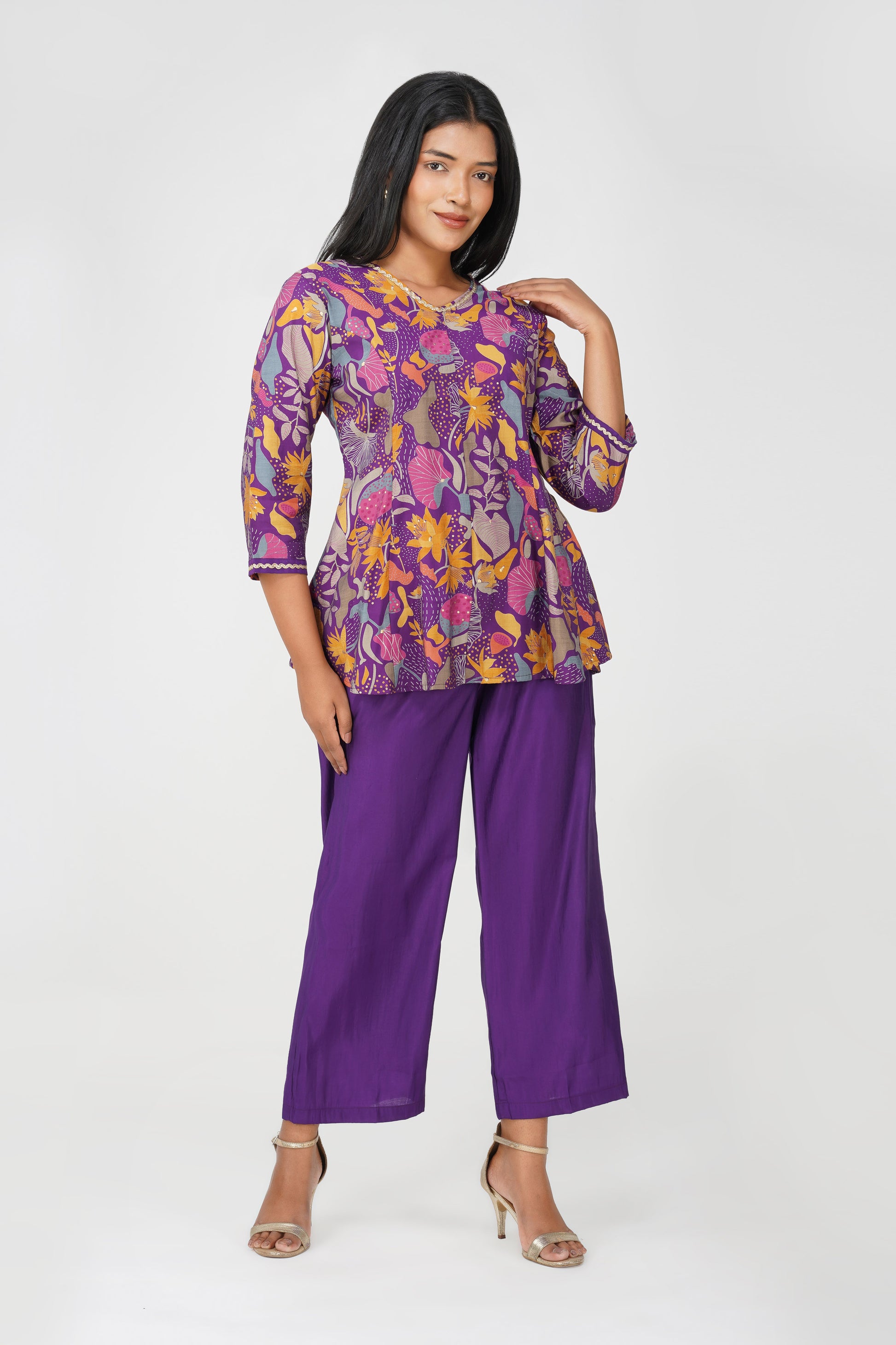 Kali Co-ord Set – Purple Print Tunic with Zari Lace & Flared Silk Pants