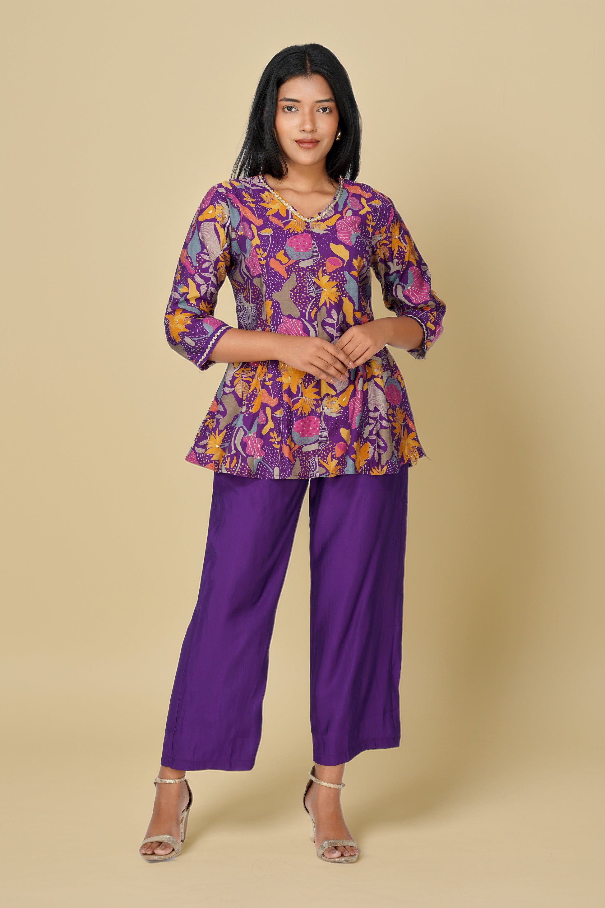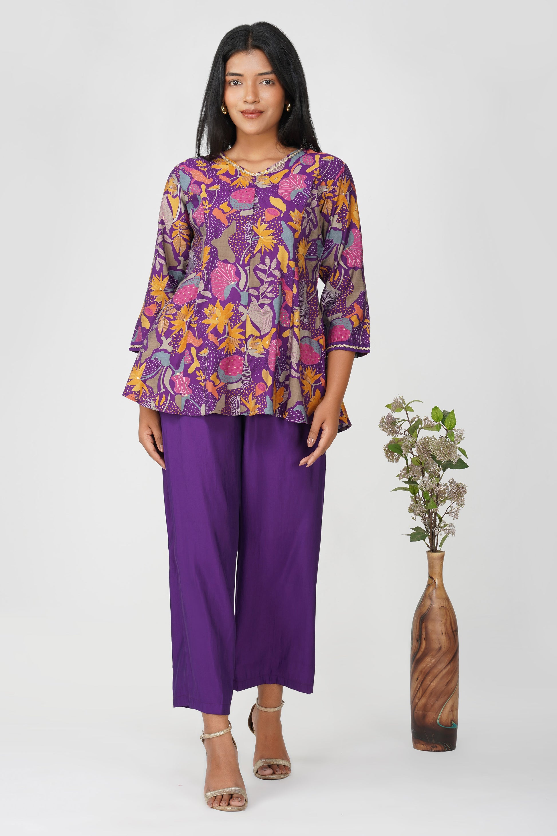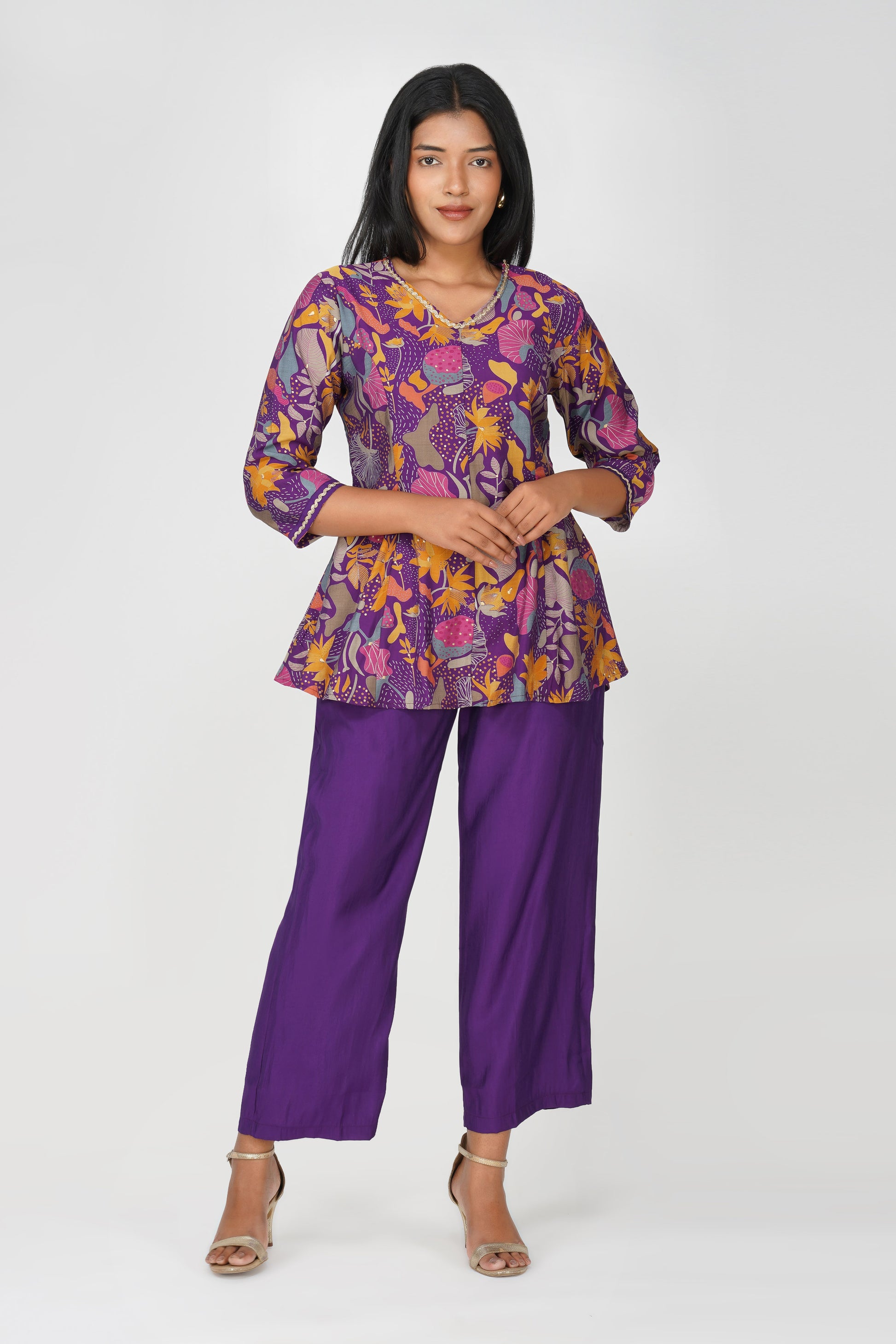 Kali Co-ord Set – Purple Print Tunic with Zari Lace & Flared Silk Pants