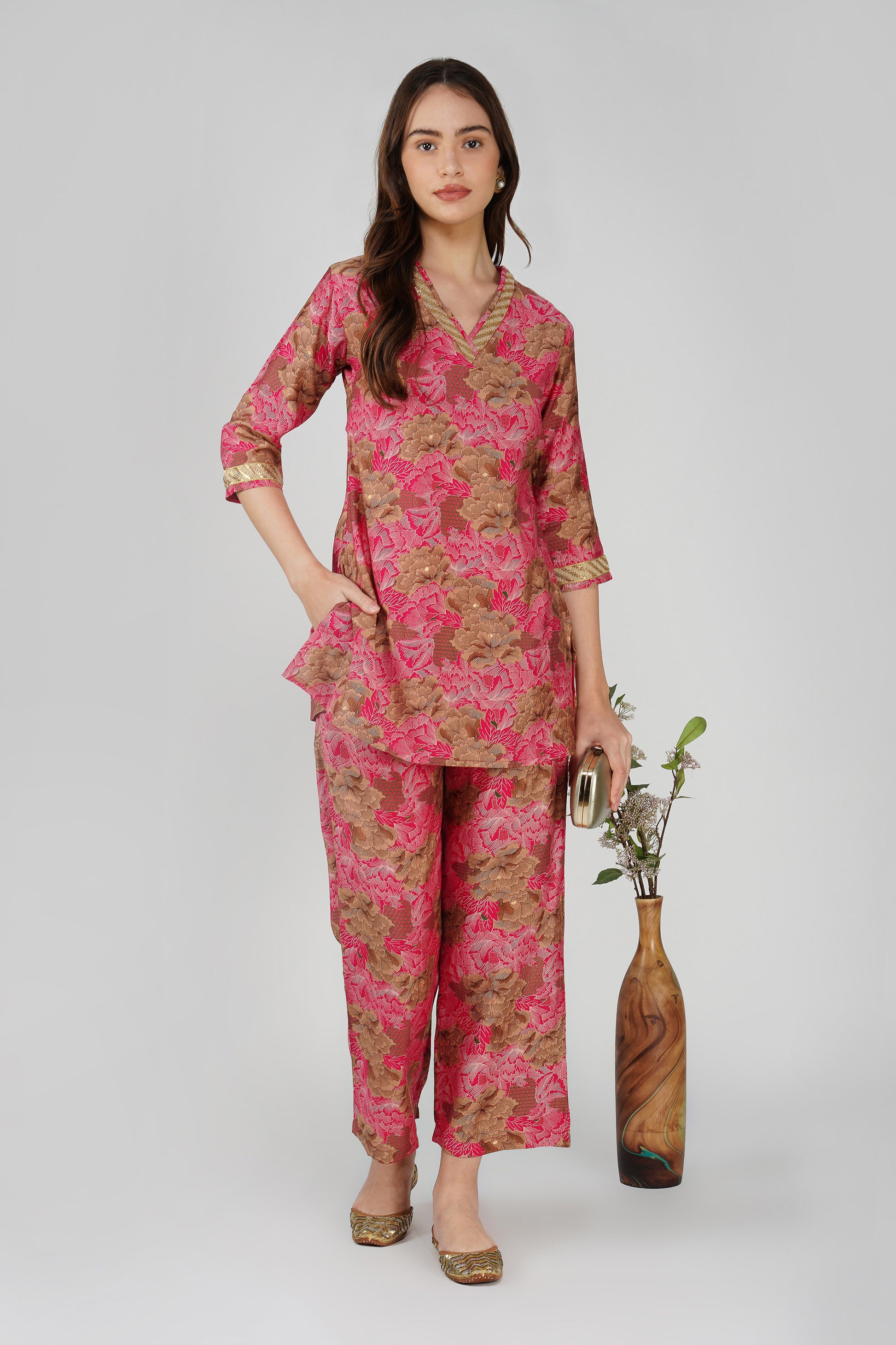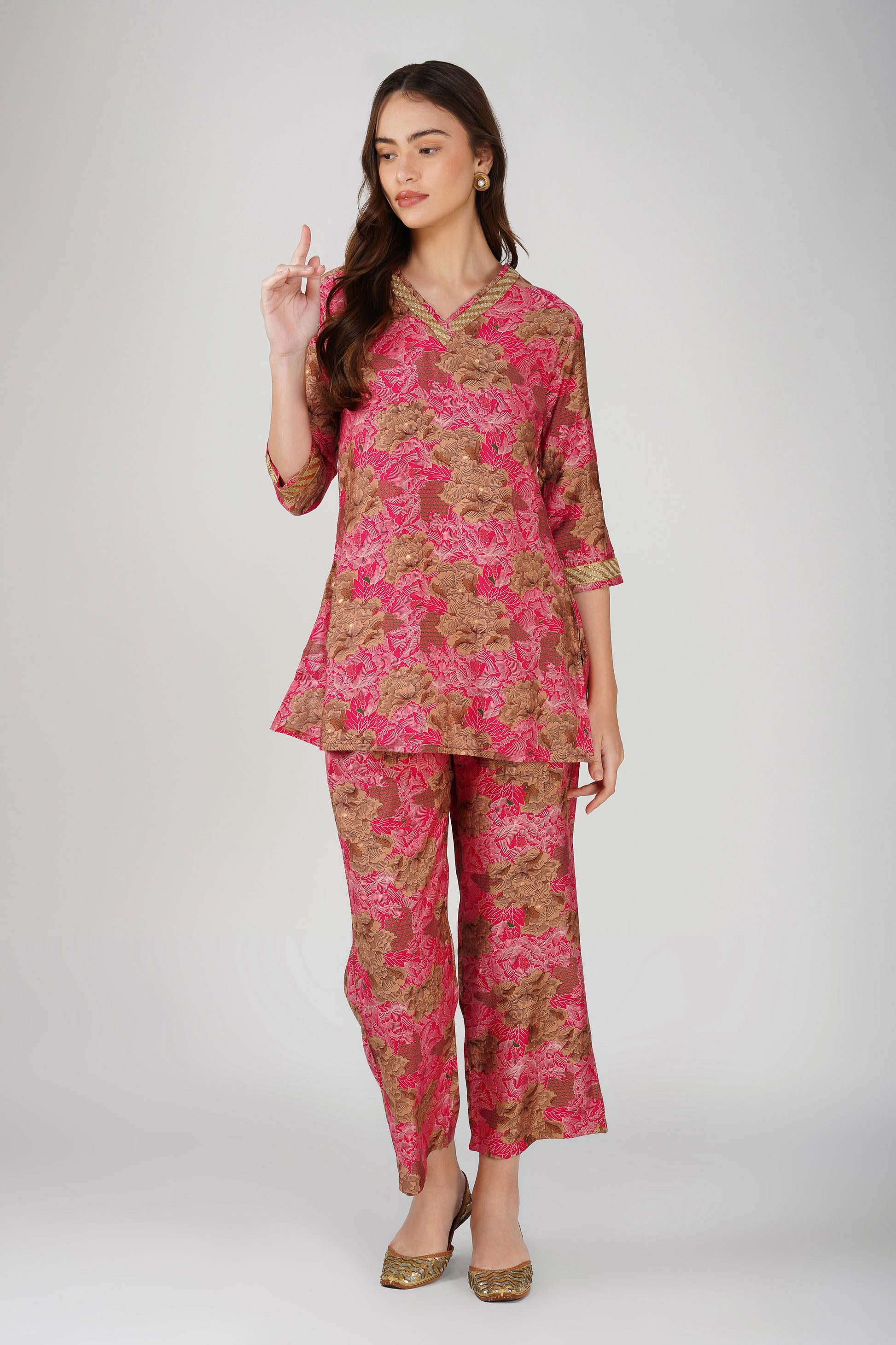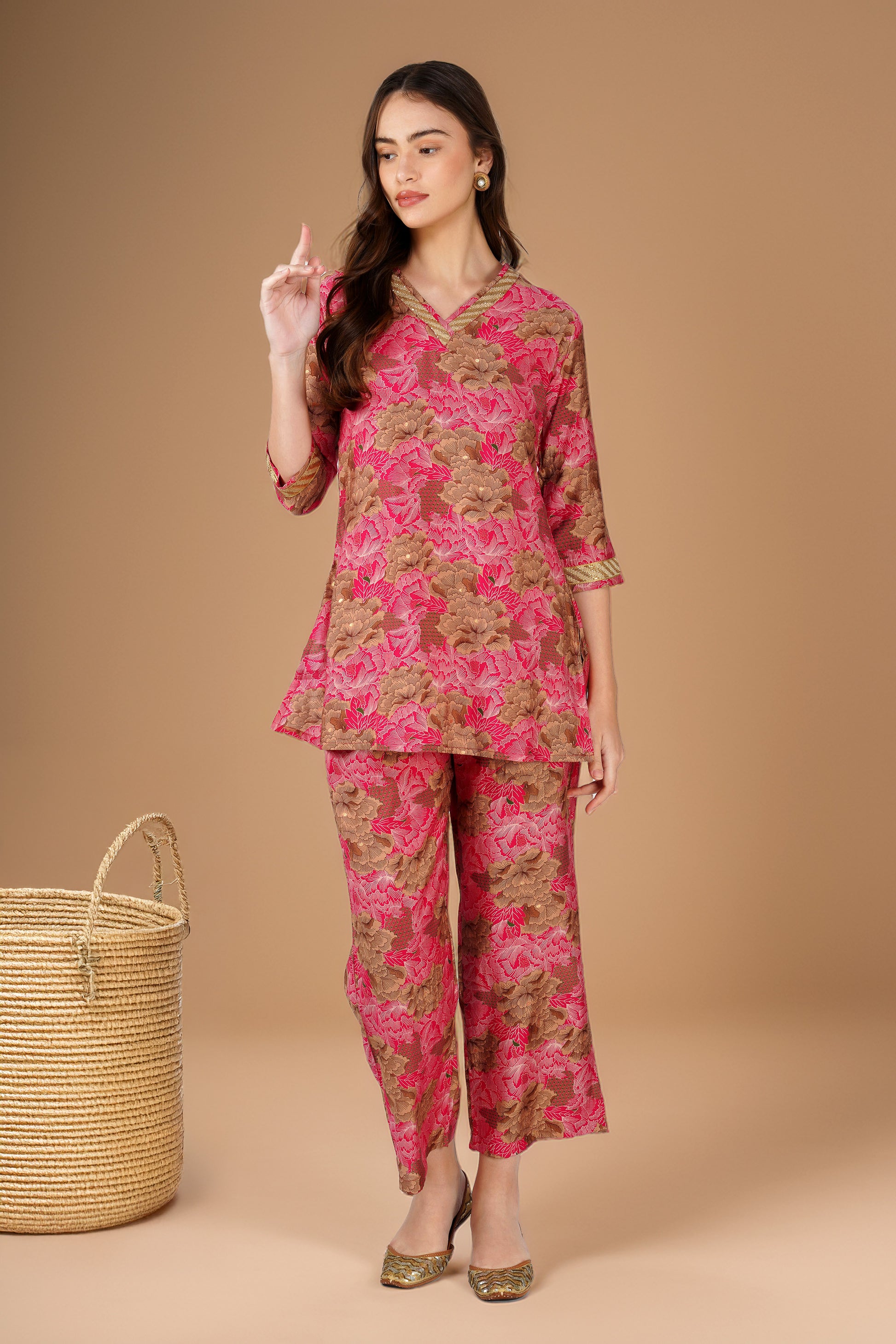 Kiara Co-ord Set β Rani Pink Floral Kurta with Sequin Jute Lace & Matching Palazzos (2-Piece Set)