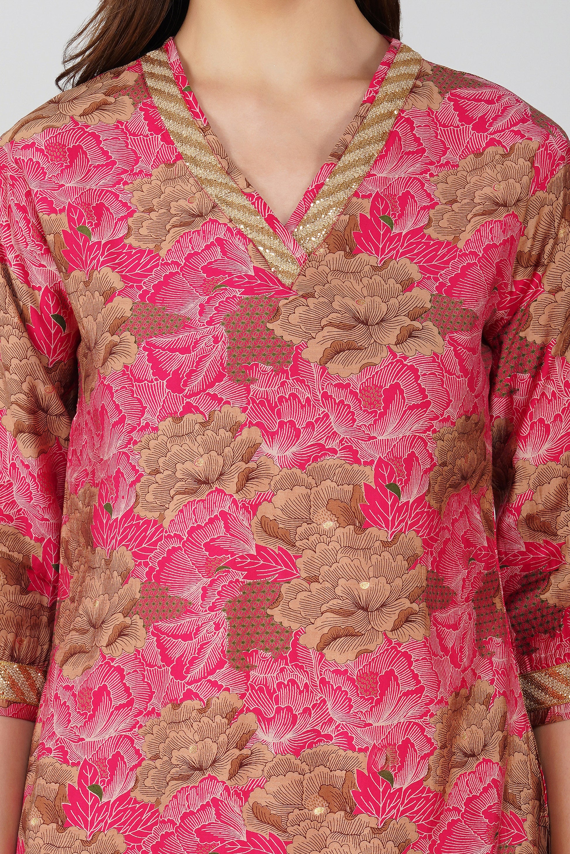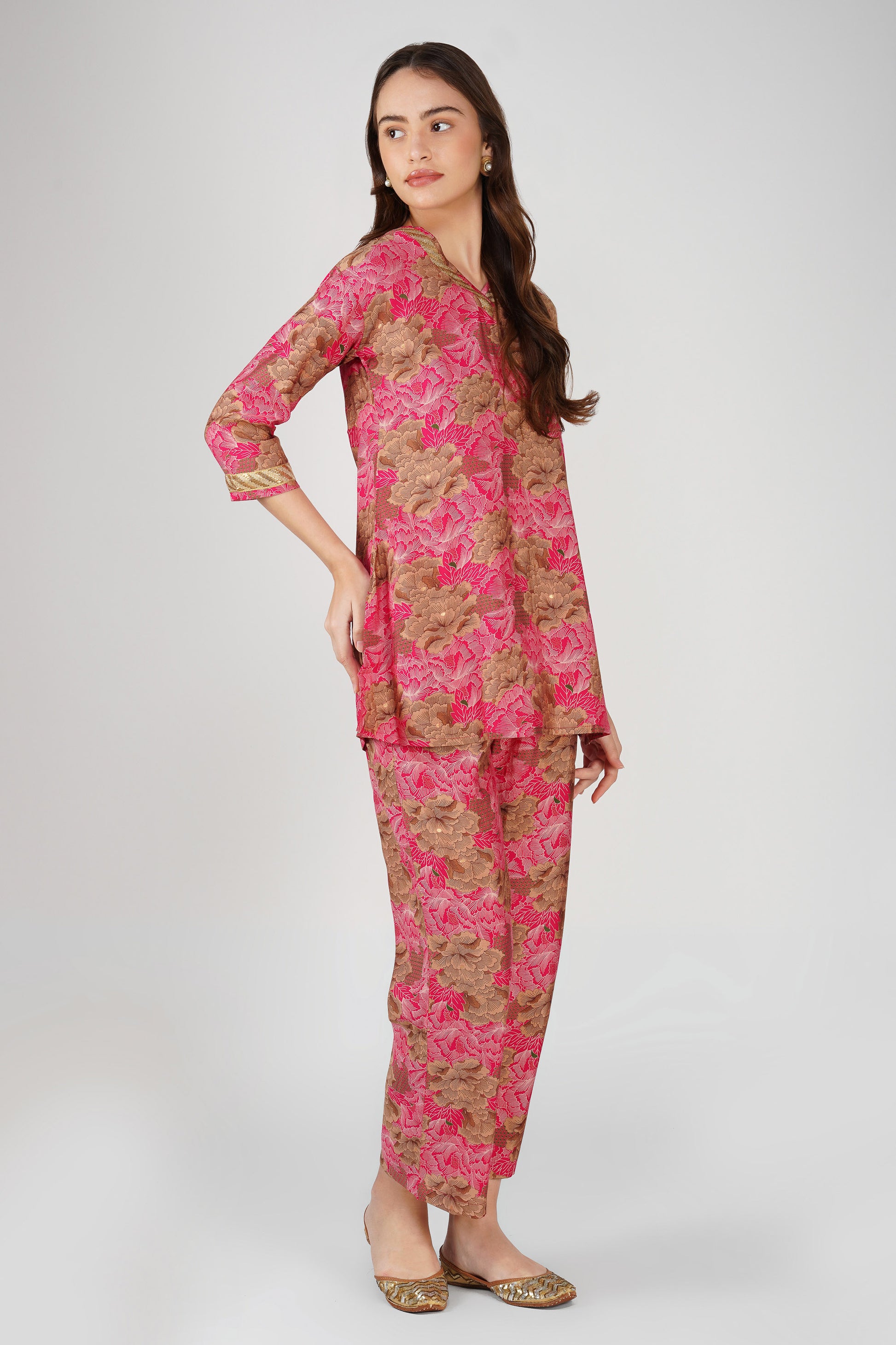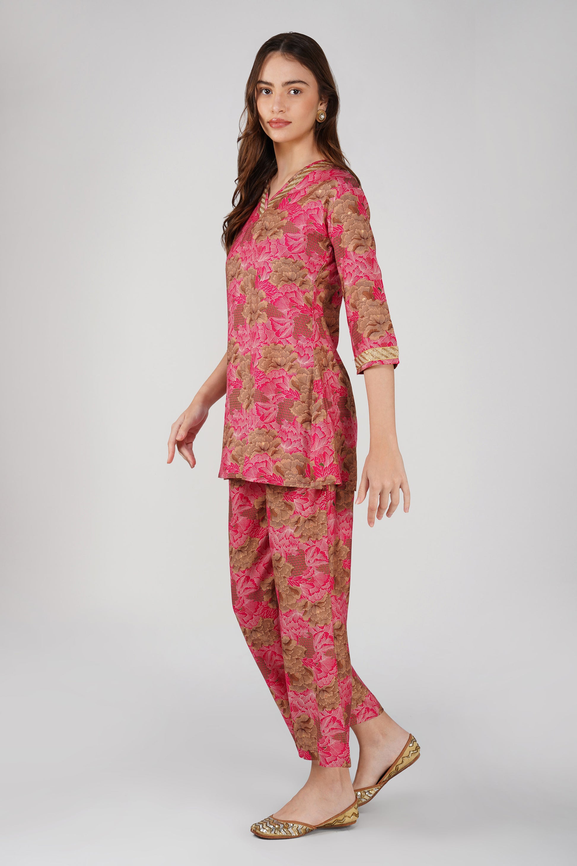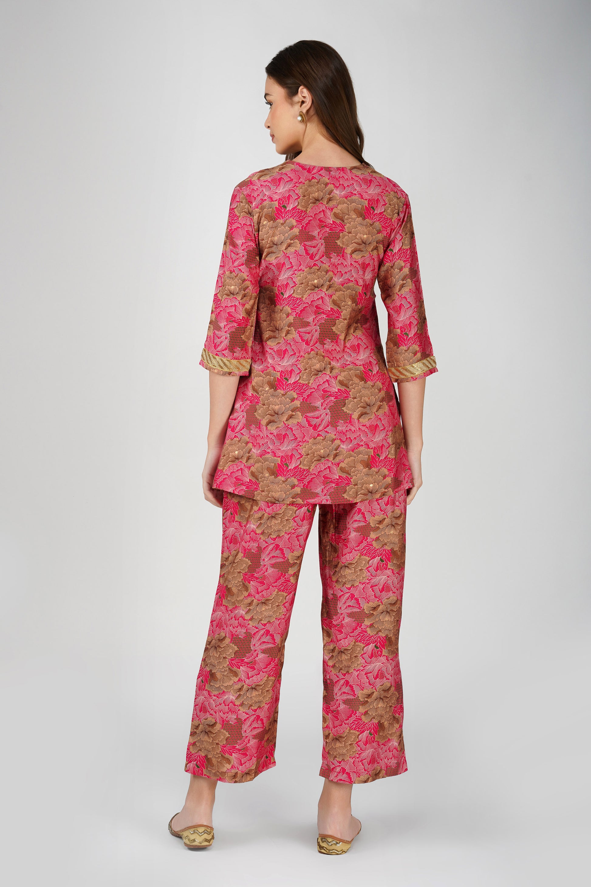 Kiara Co-ord Set β Rani Pink Floral Kurta with Sequin Jute Lace & Matching Palazzos (2-Piece Set)