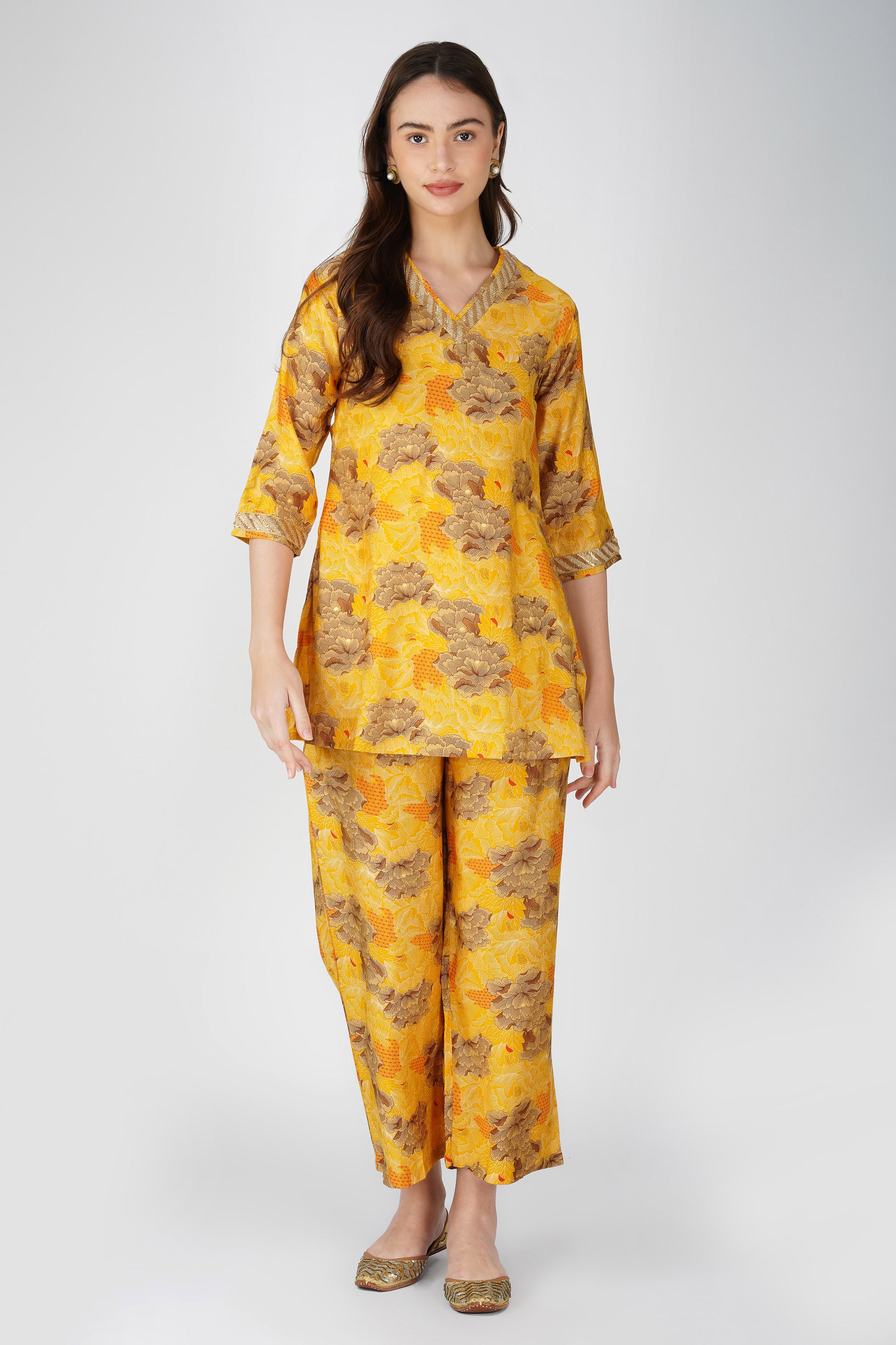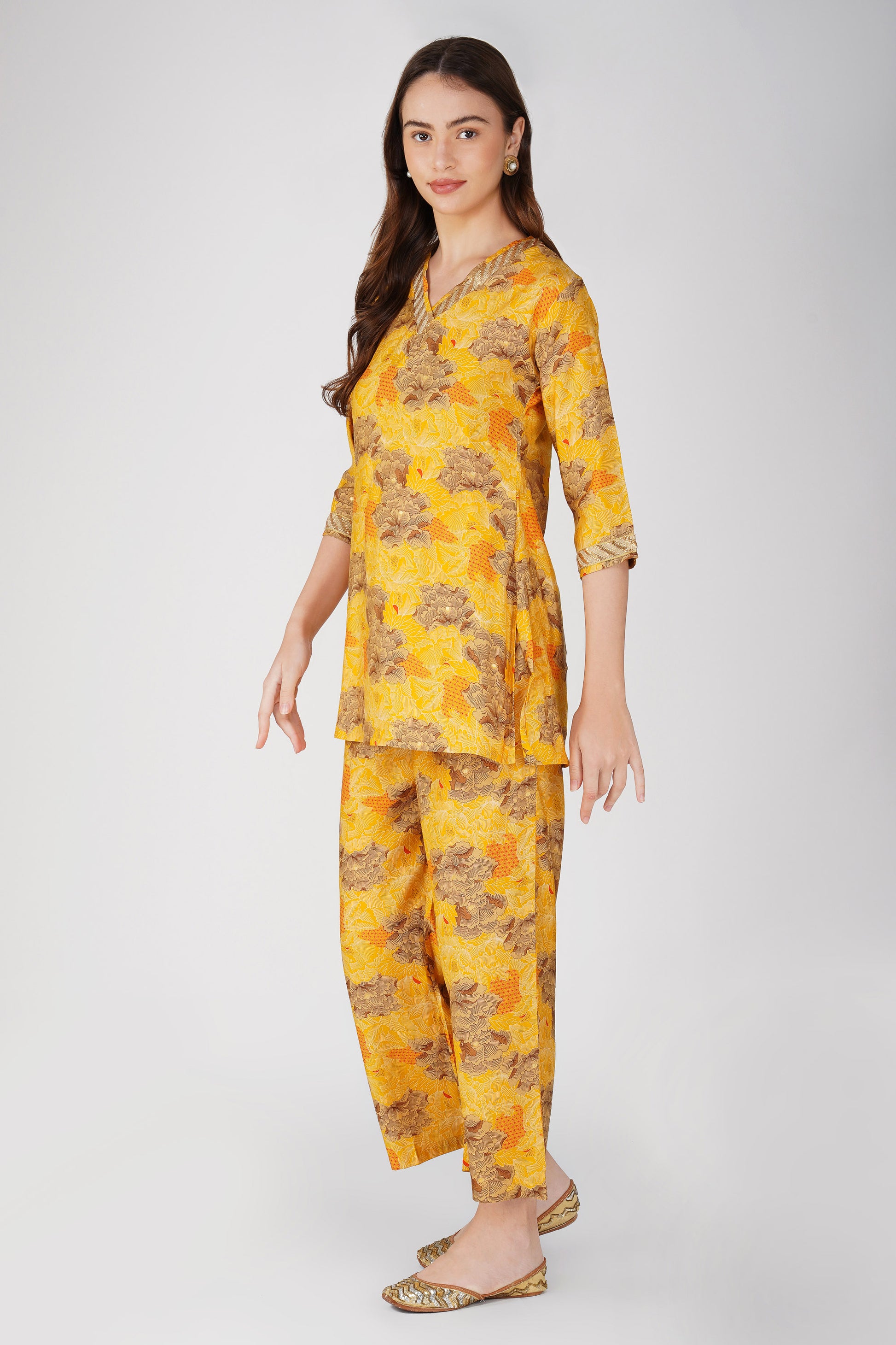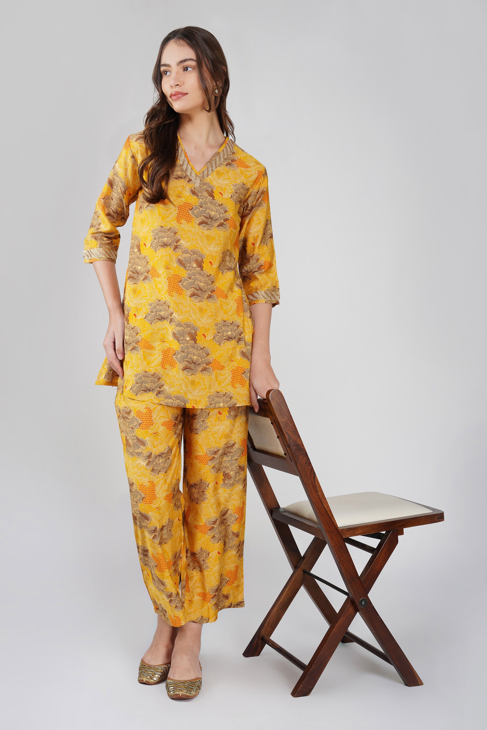 Kiara Co-ord Set – Yellow Floral Kurta with Sequin Jute Lace & Matching Palazzos (2-Piece Set)