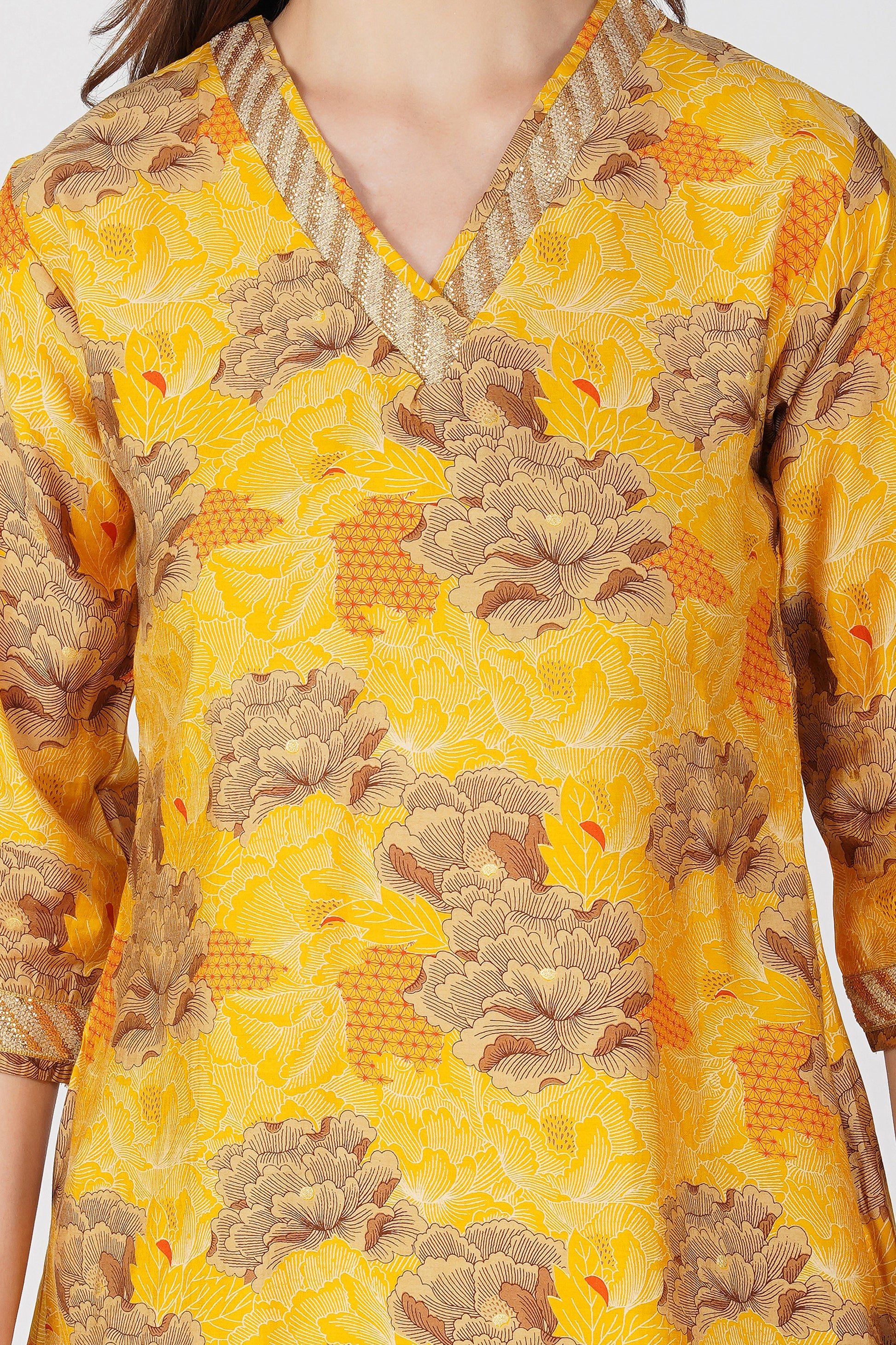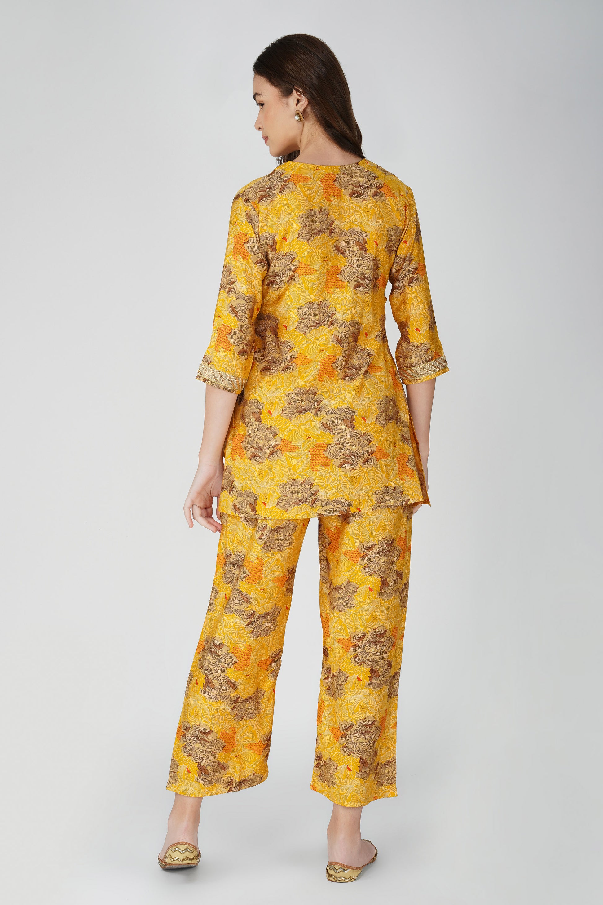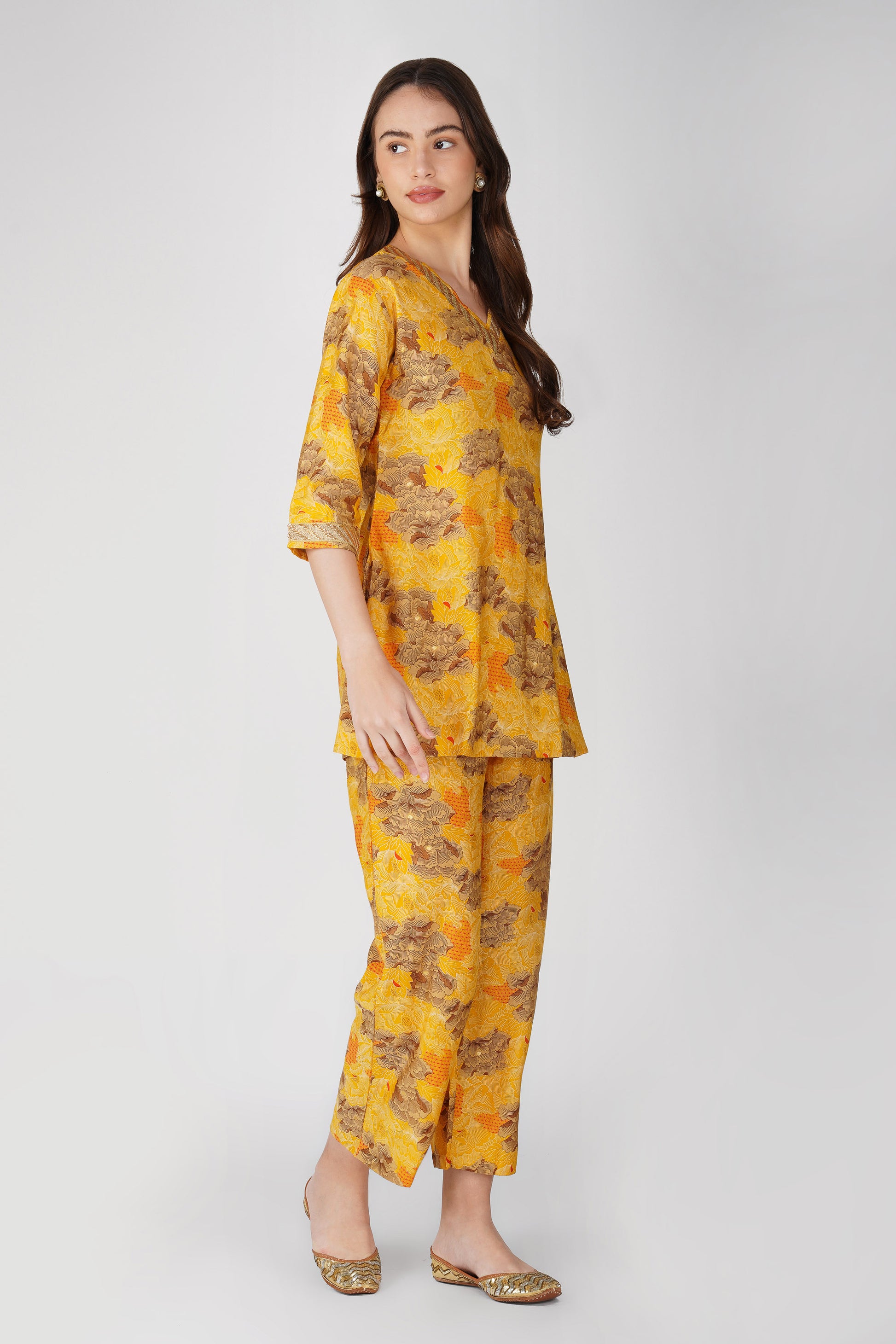 Kiara Co-ord Set – Yellow Floral Kurta with Sequin Jute Lace & Matching Palazzos (2-Piece Set)