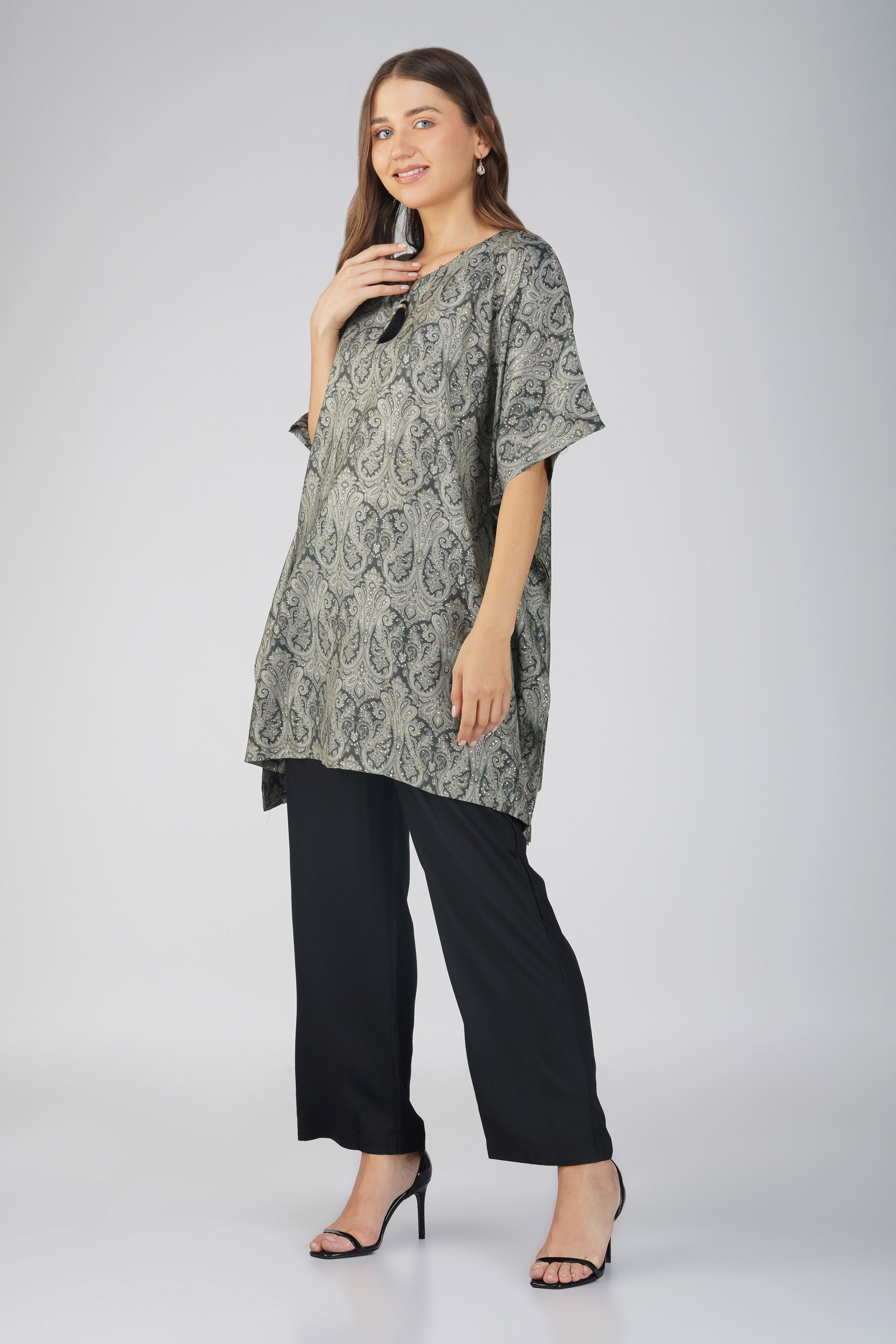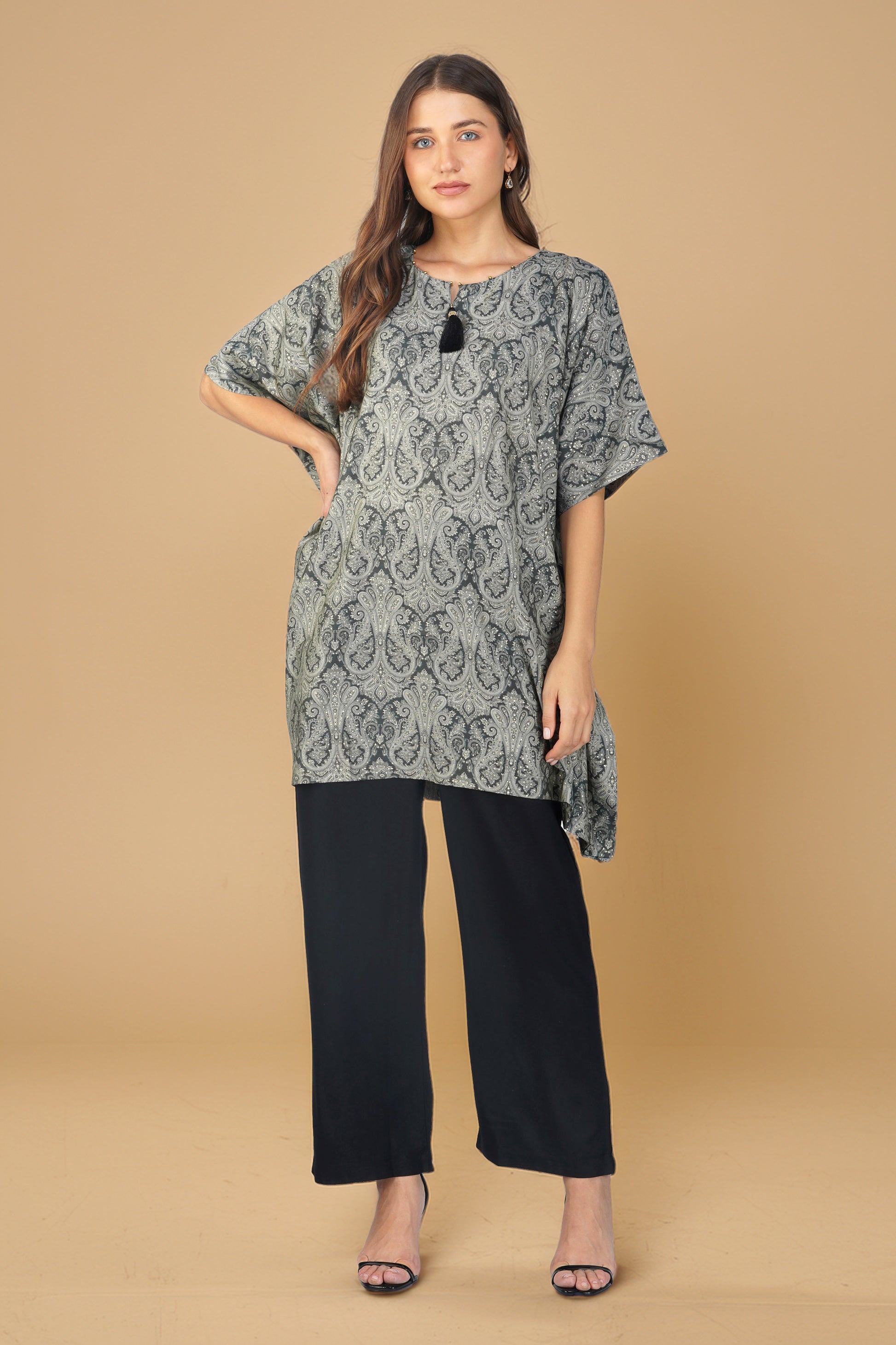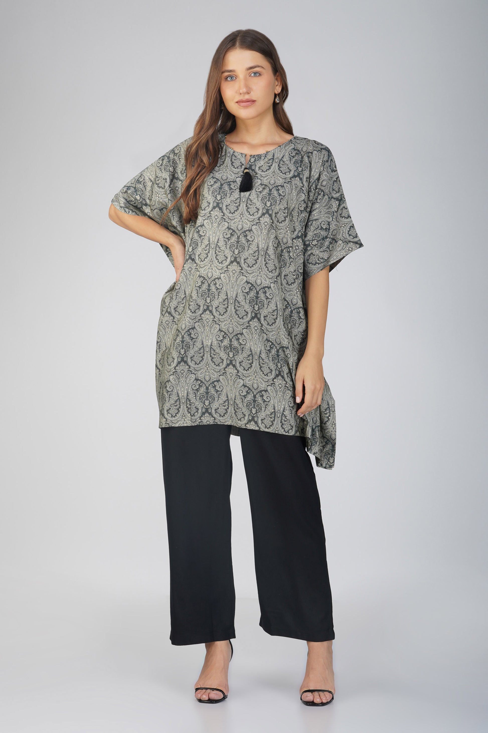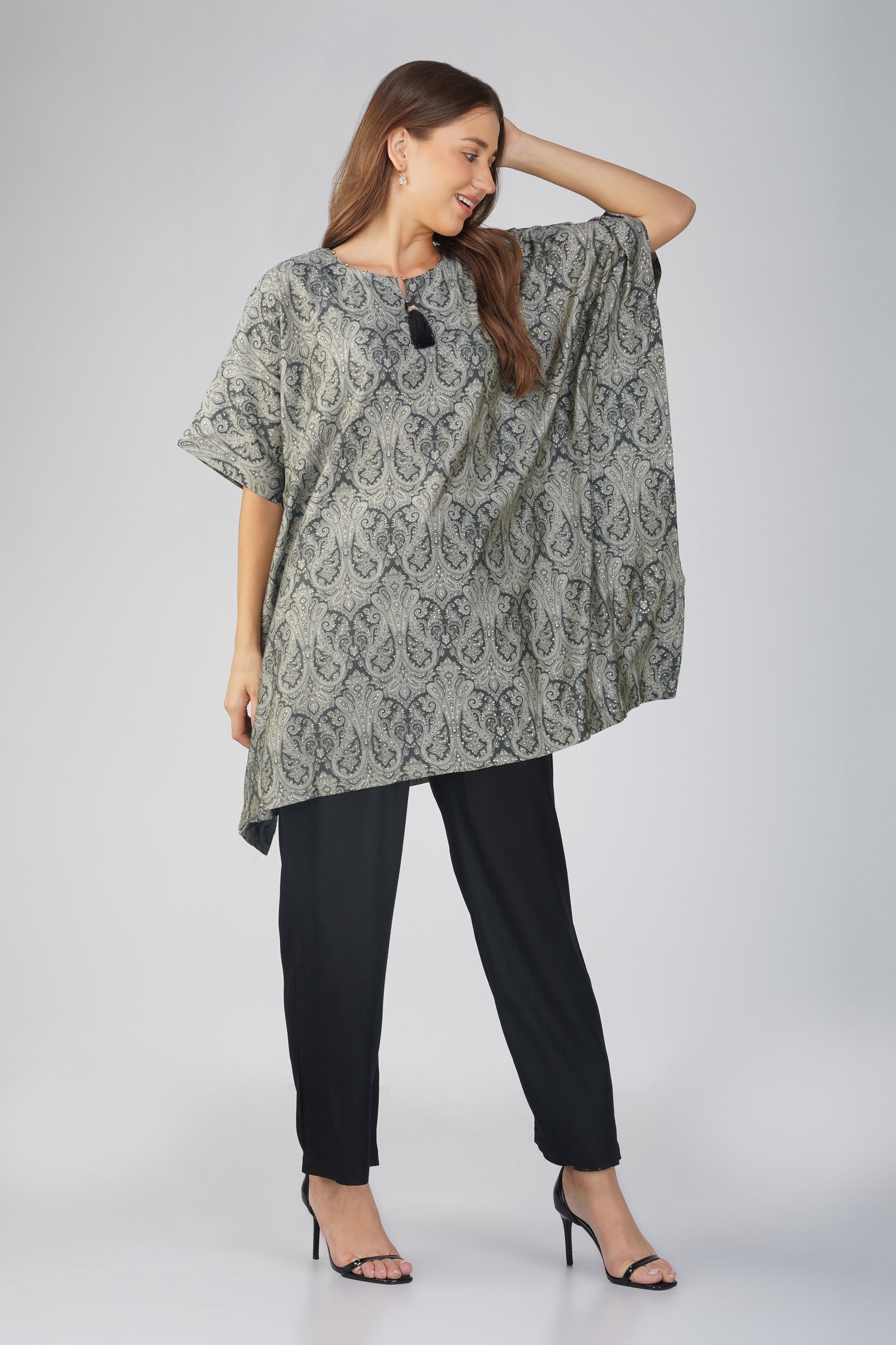 Top Pattern – Printed Kaftan with Pearl Detail & Tassel Tie