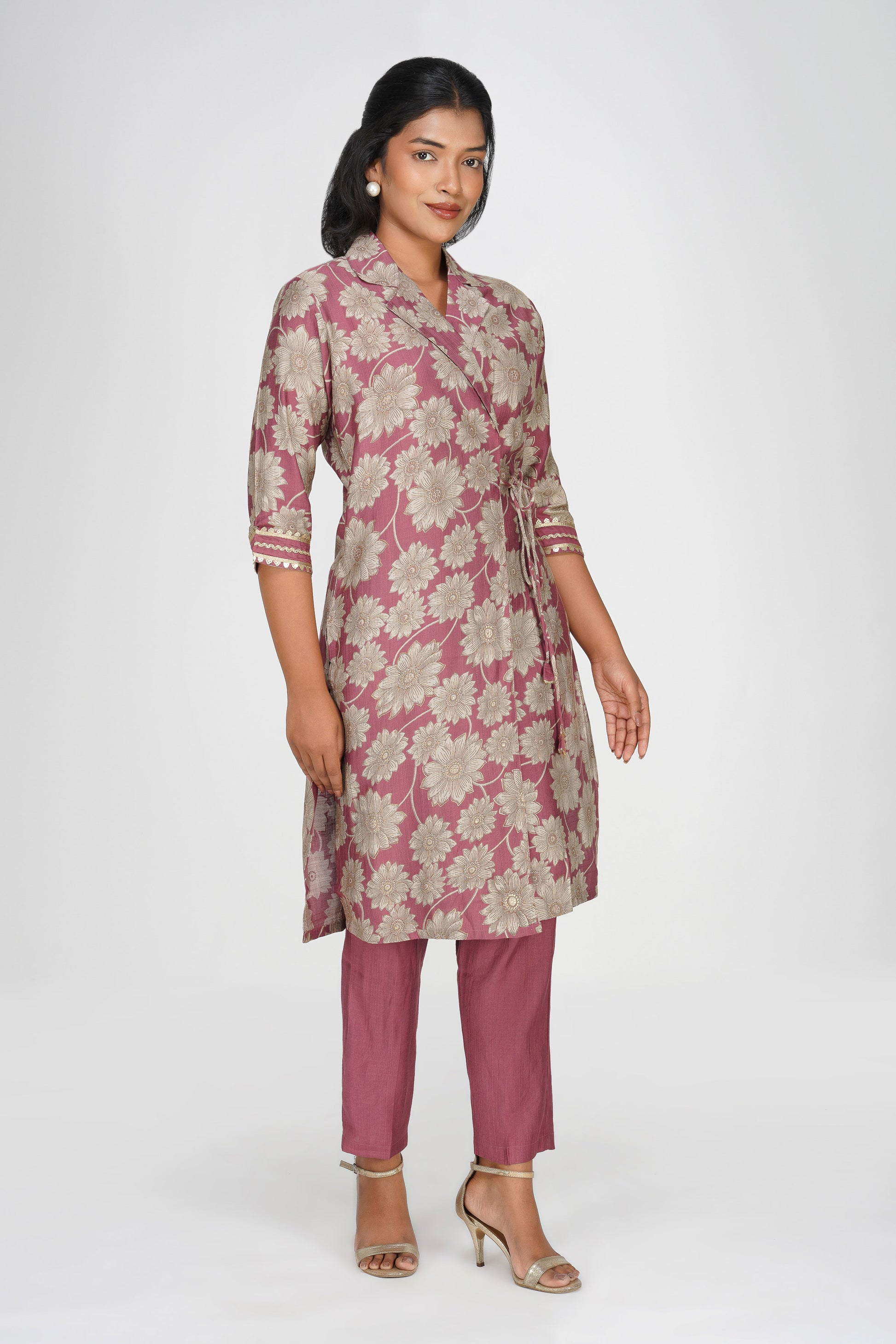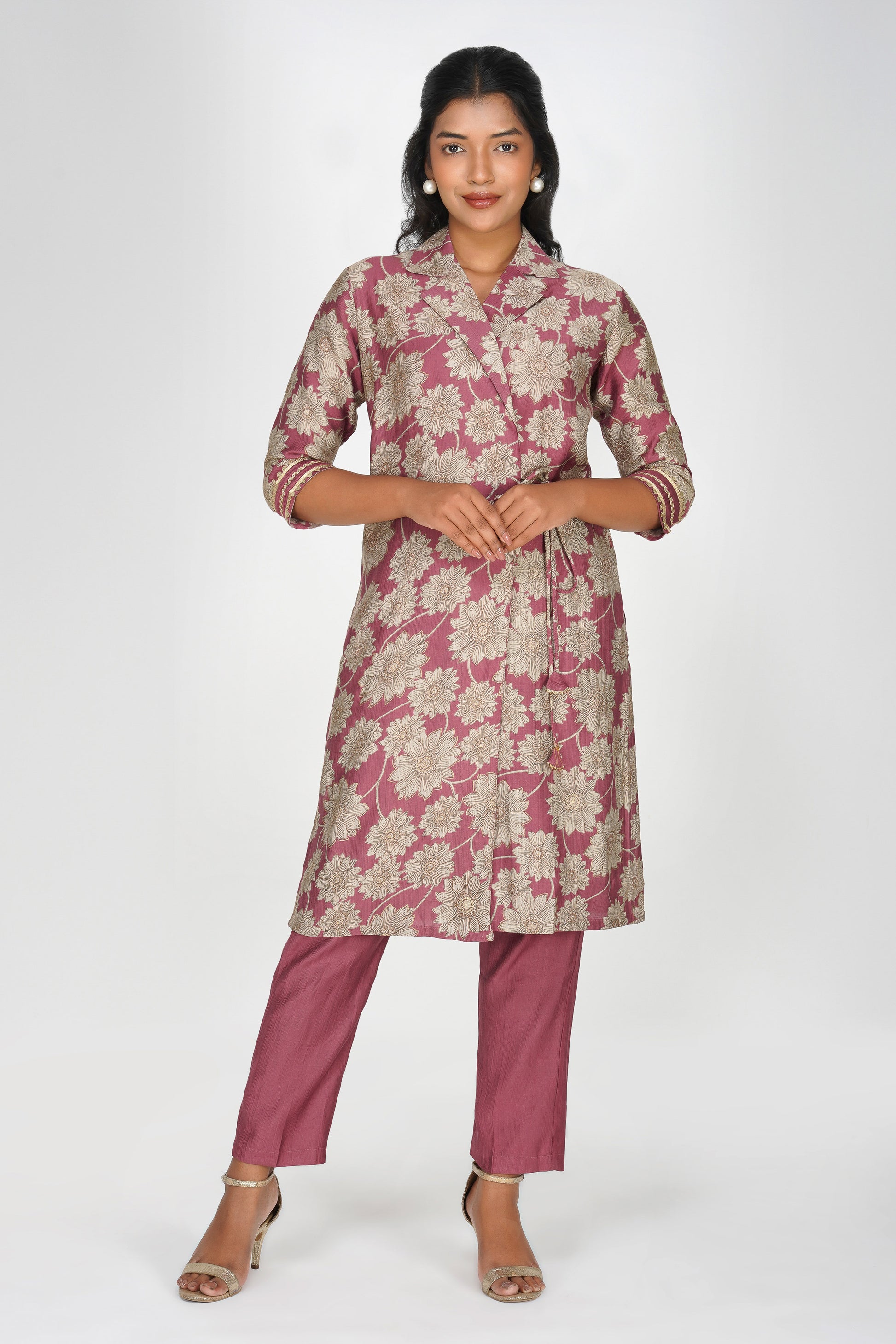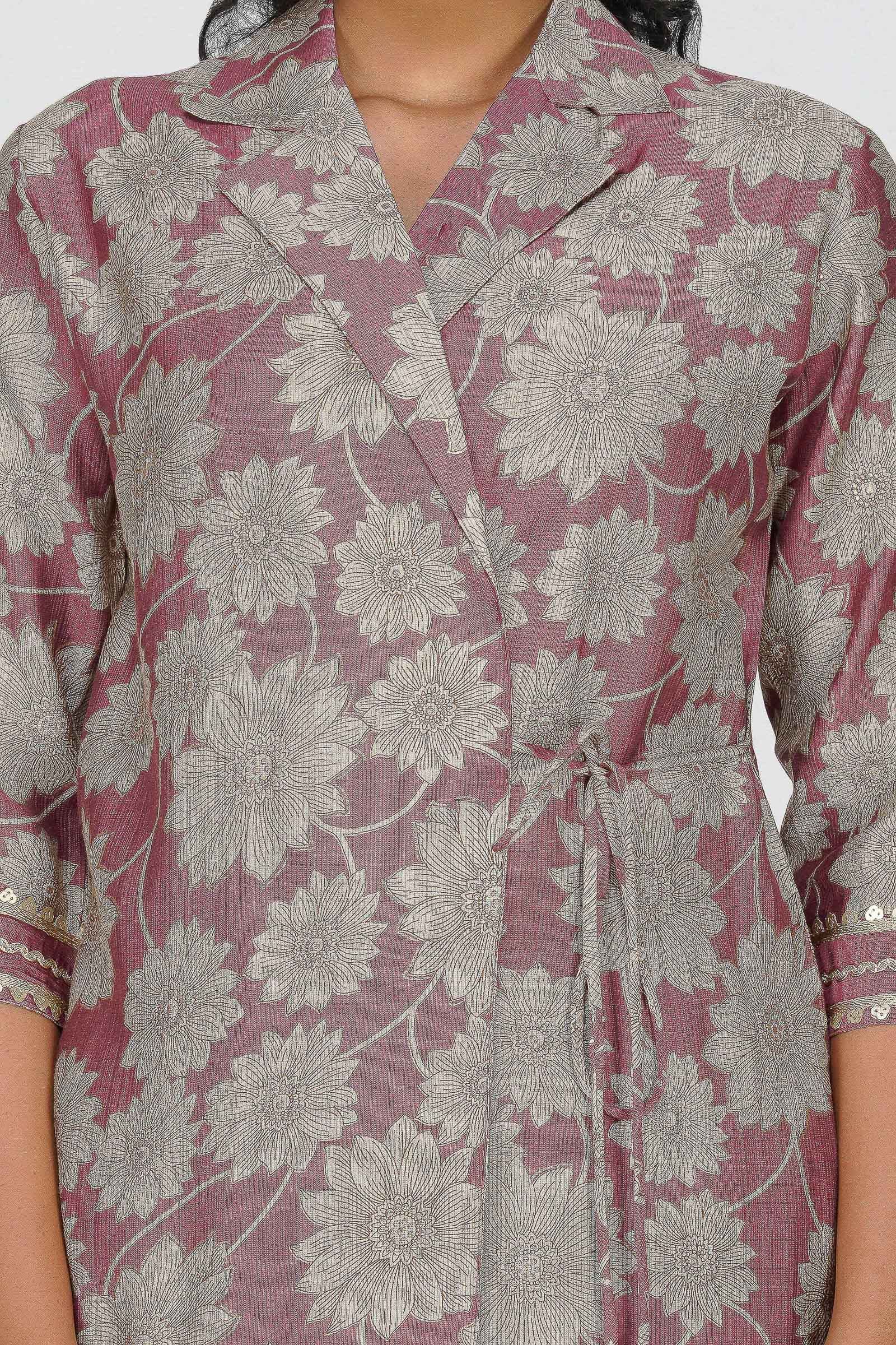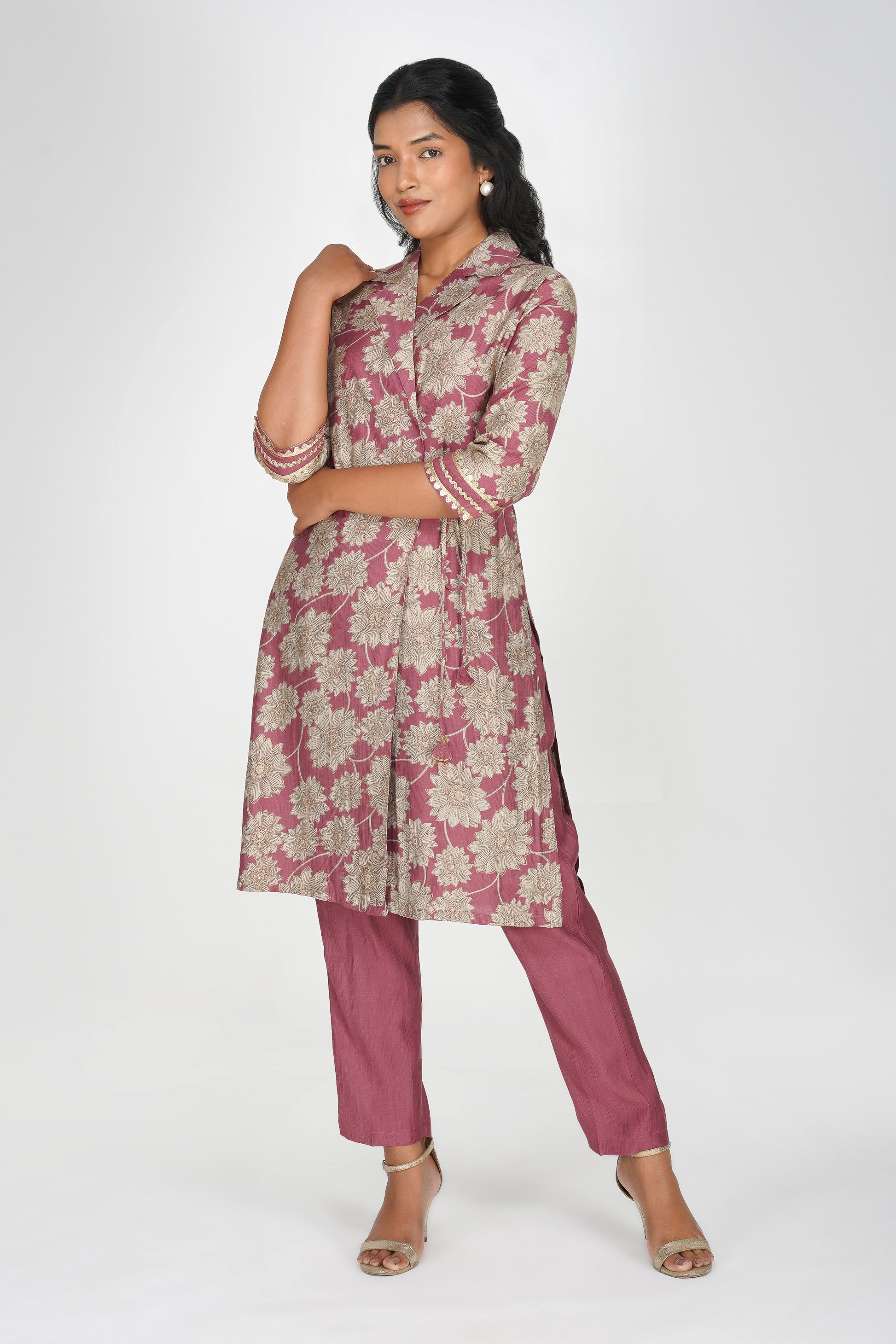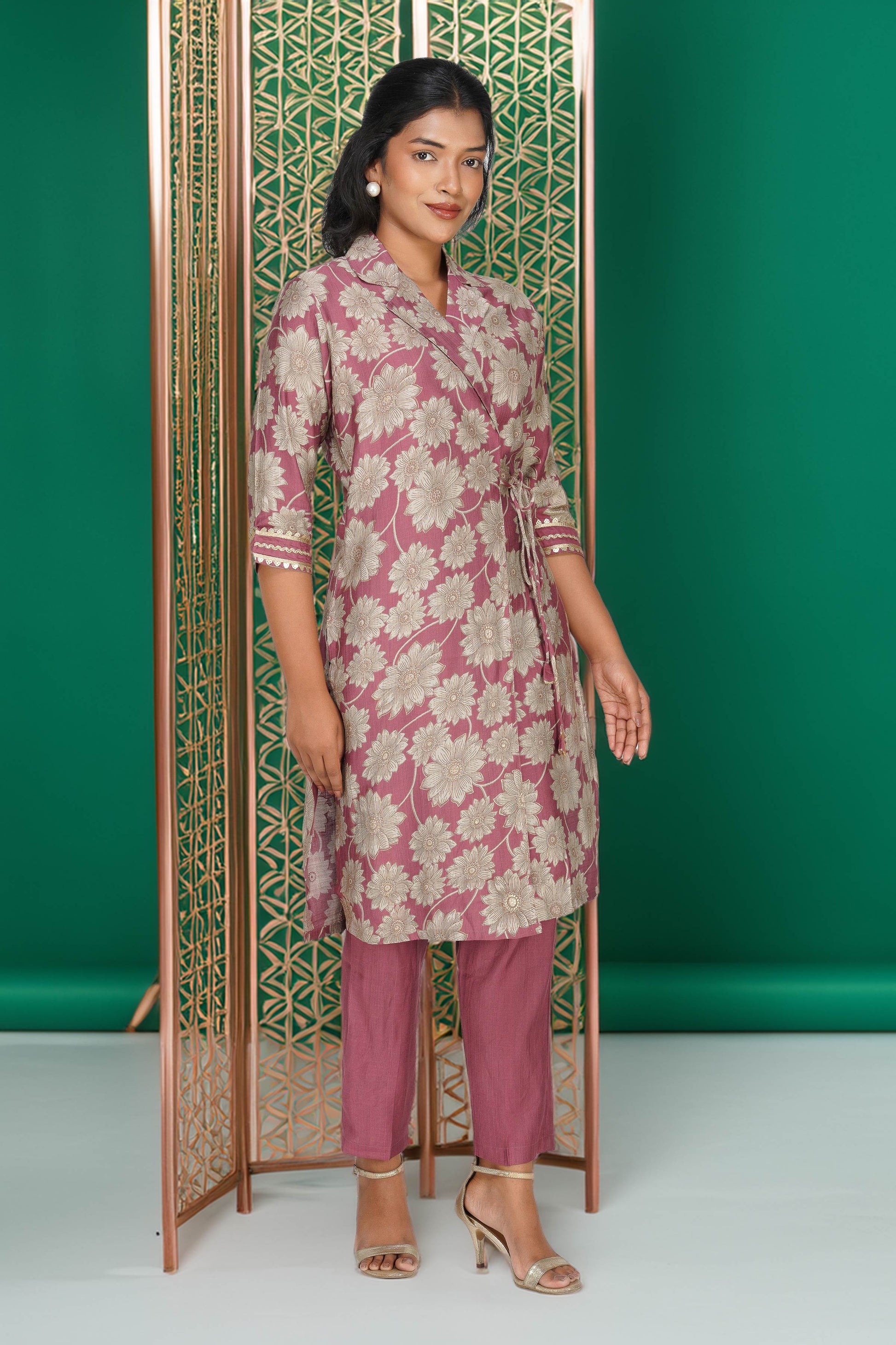 Laila Co-ord Set – Rose Gold Floral Jacket Style Top with Solid Pants (2-Piece Set)