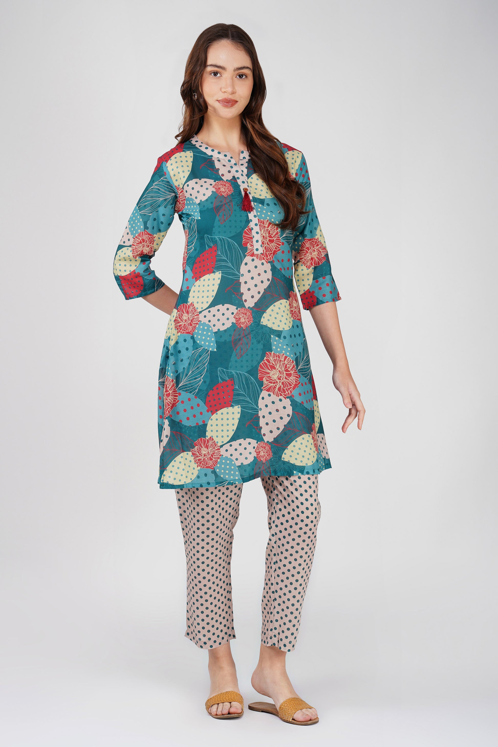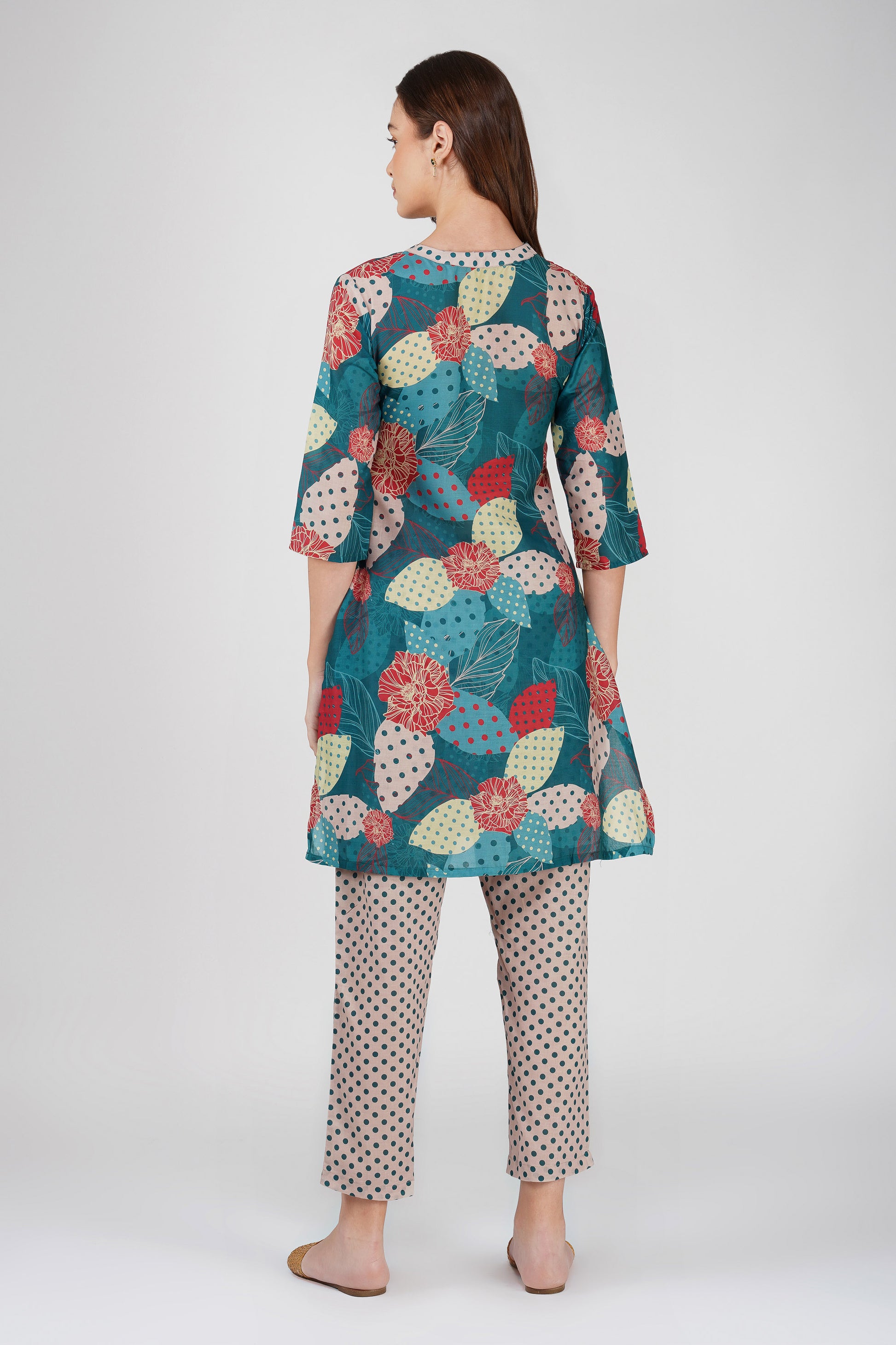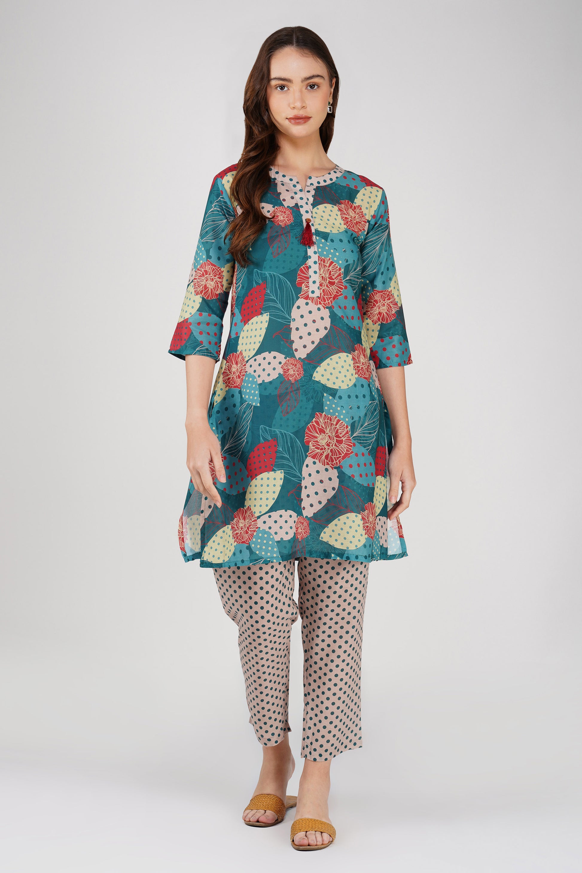 Green Illustration Kurta Co-ord Set – Tassel Kurta with Polka Dot Pants