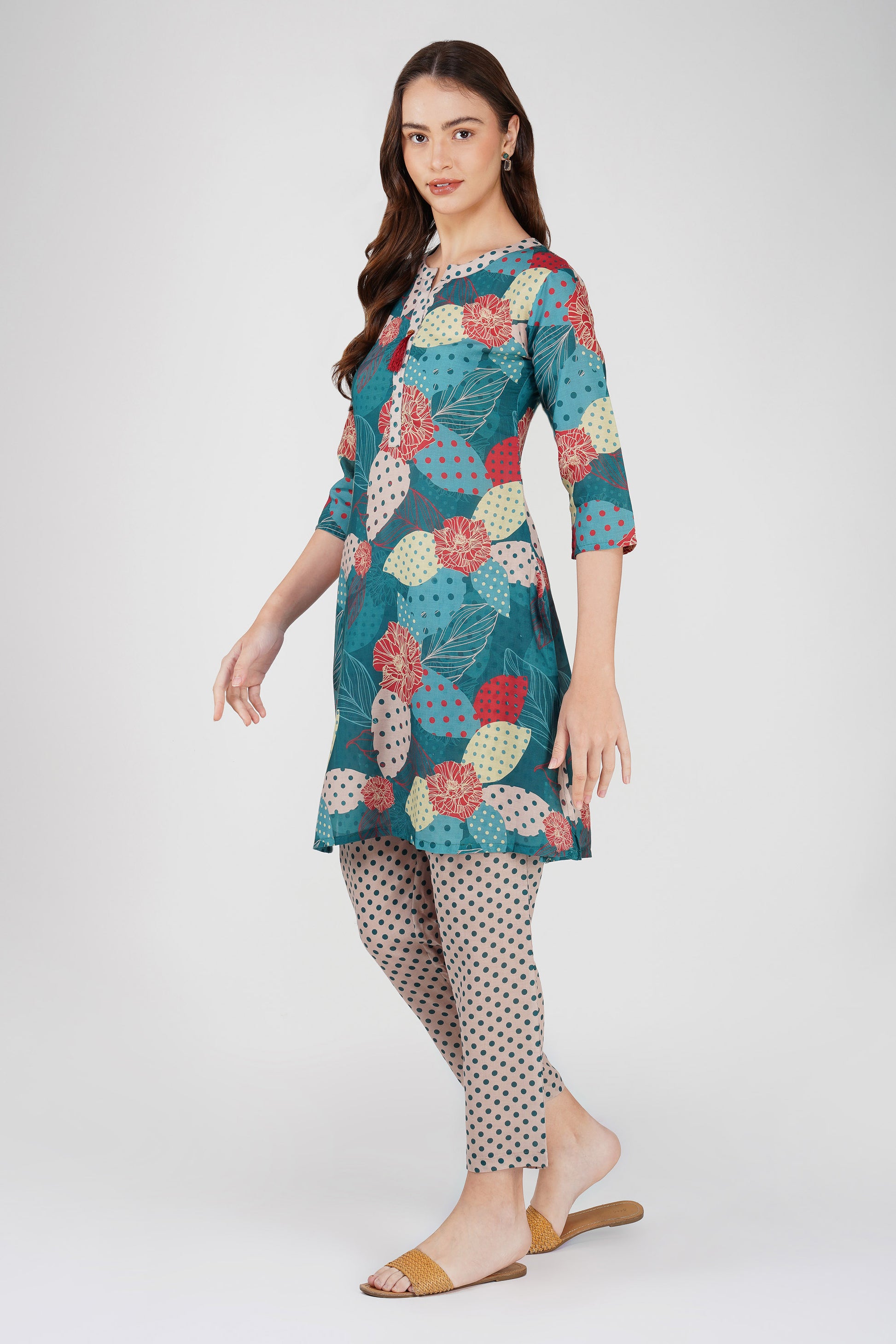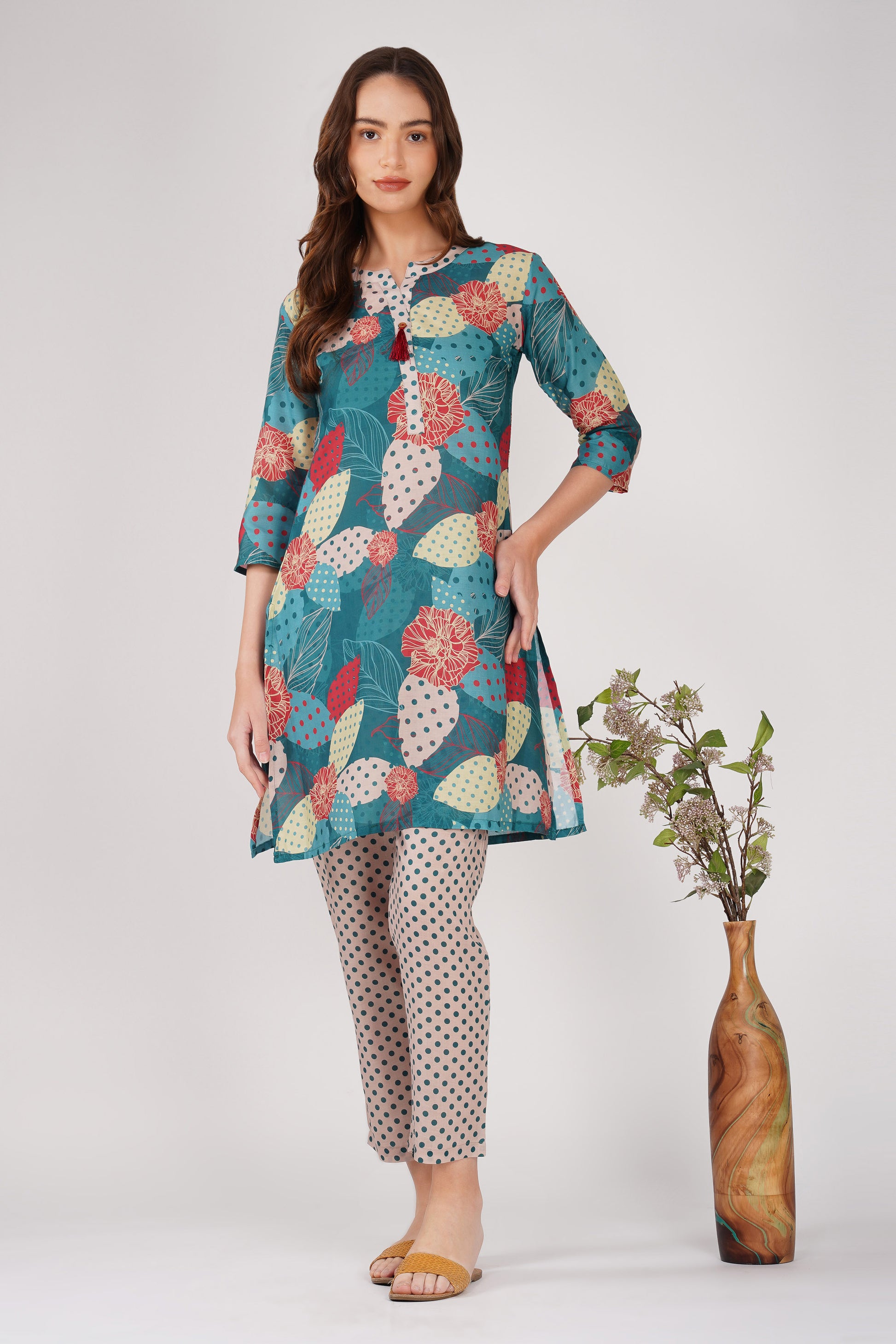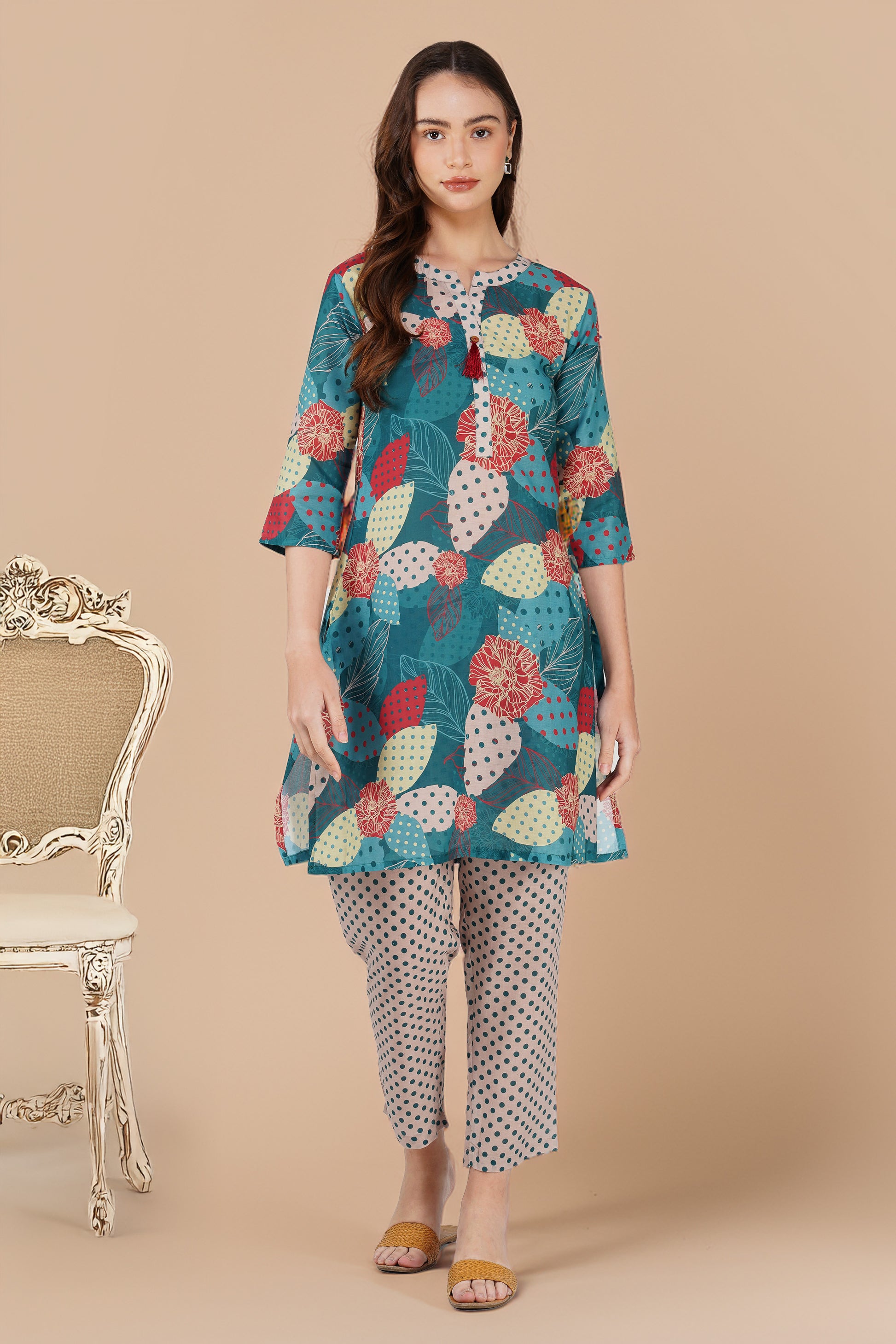 Green Illustration Kurta Co-ord Set – Tassel Kurta with Polka Dot Pants