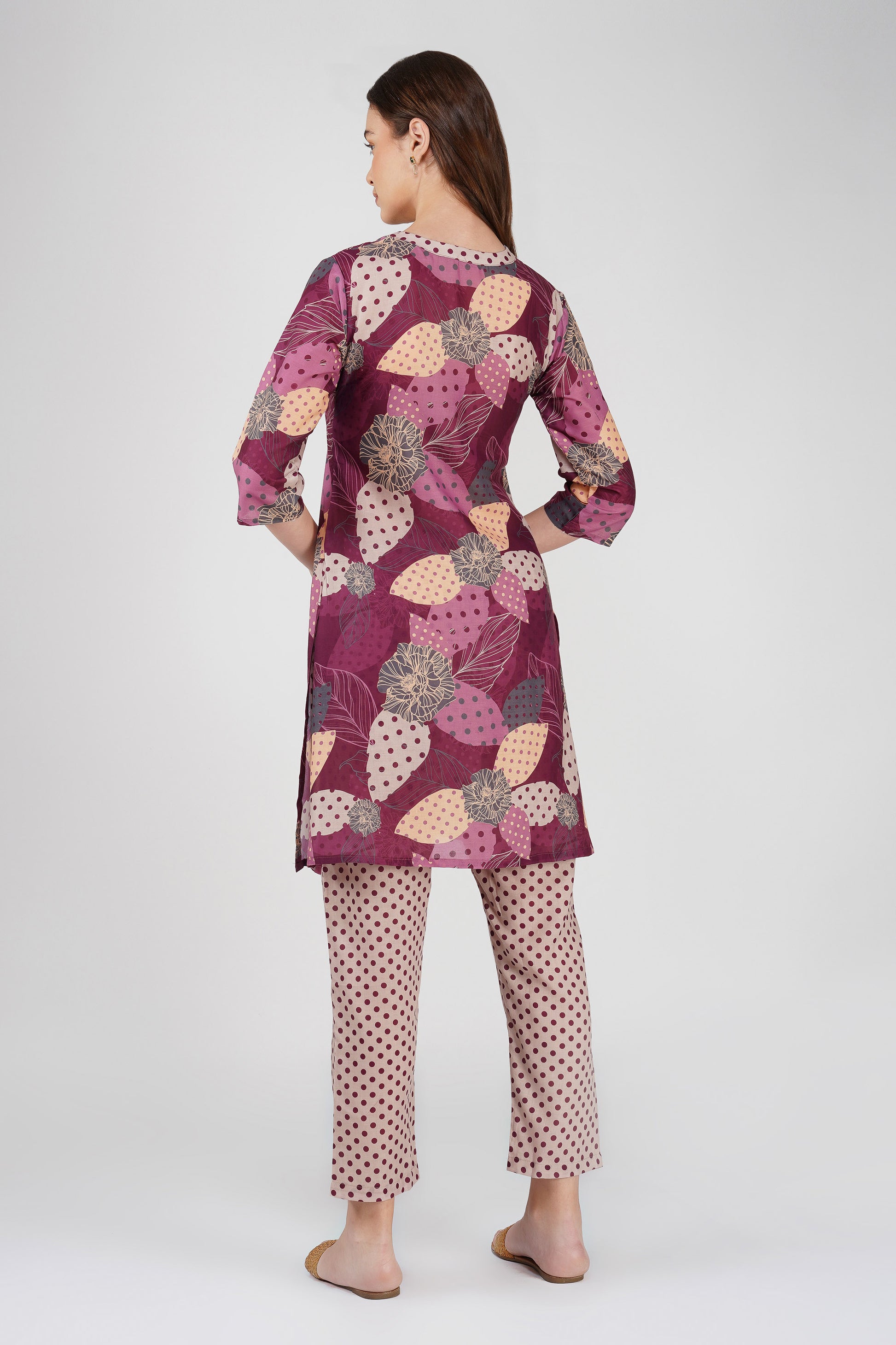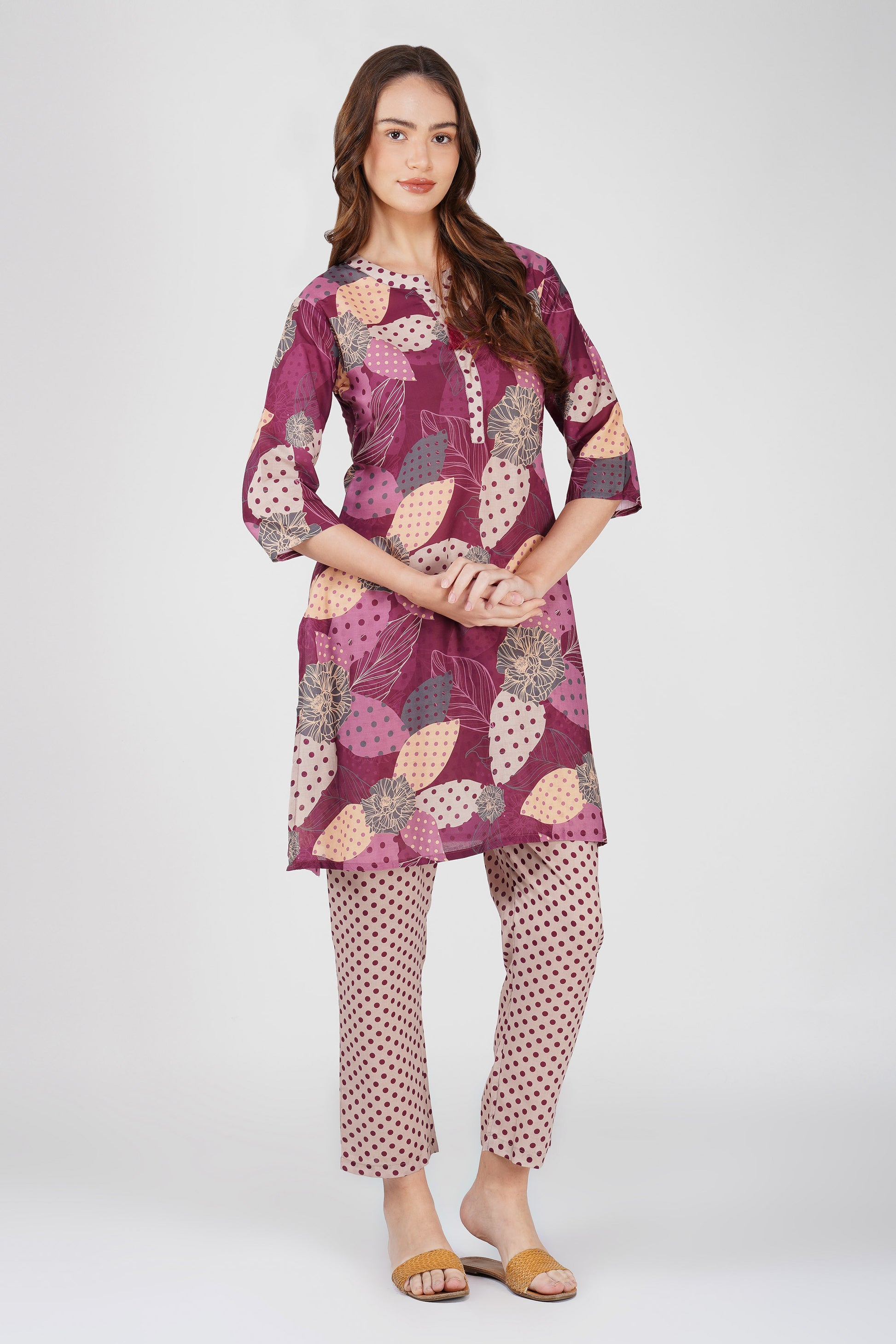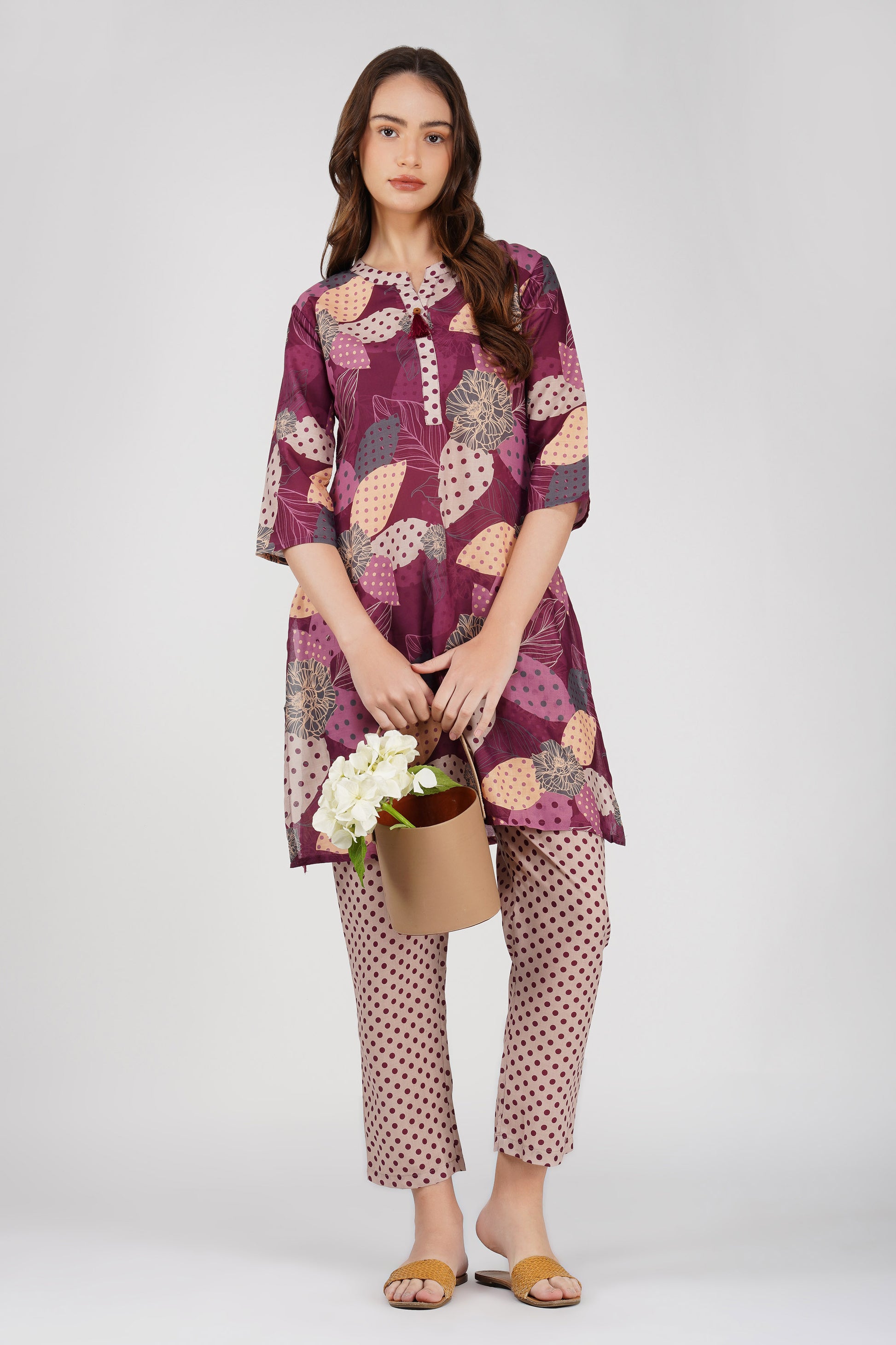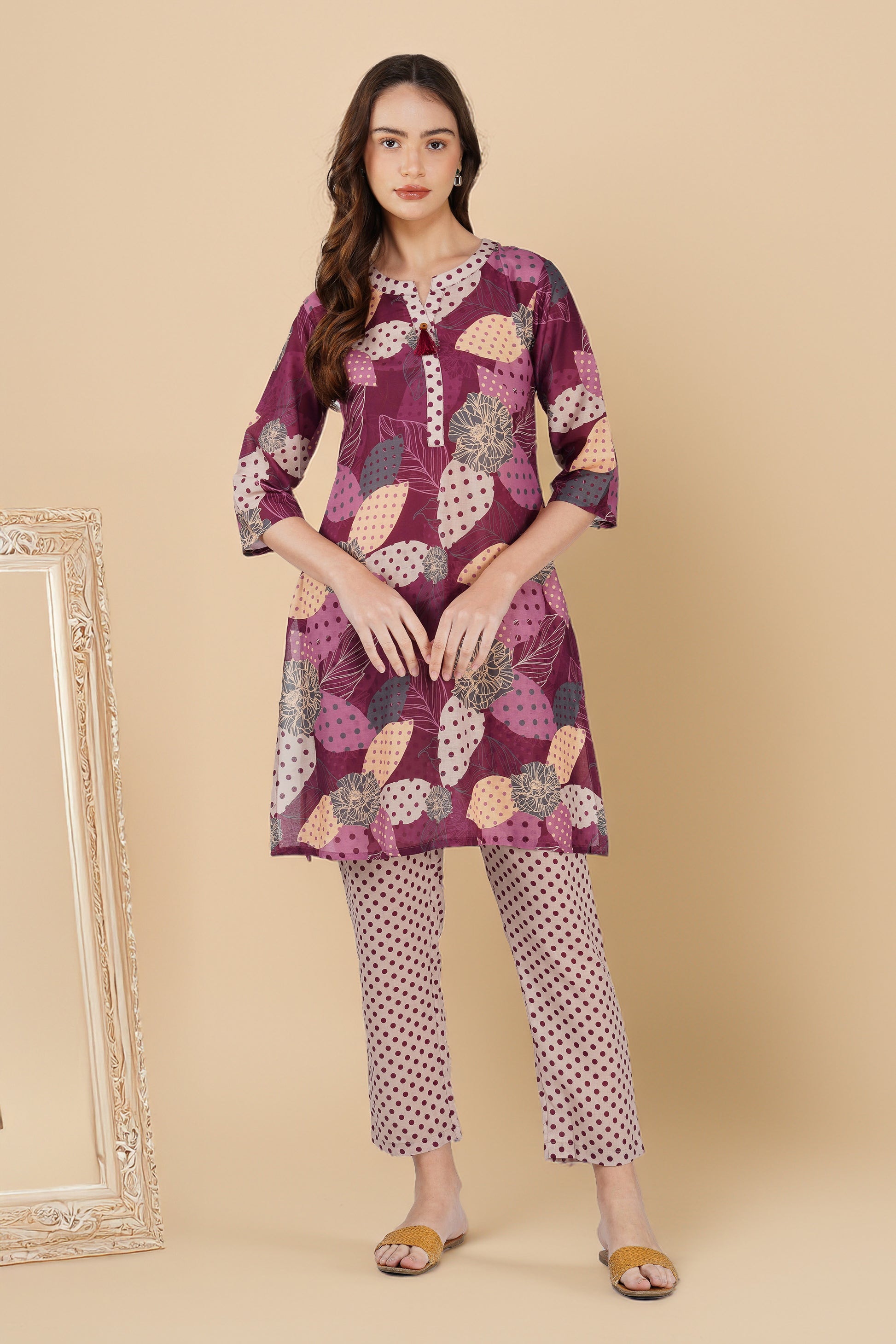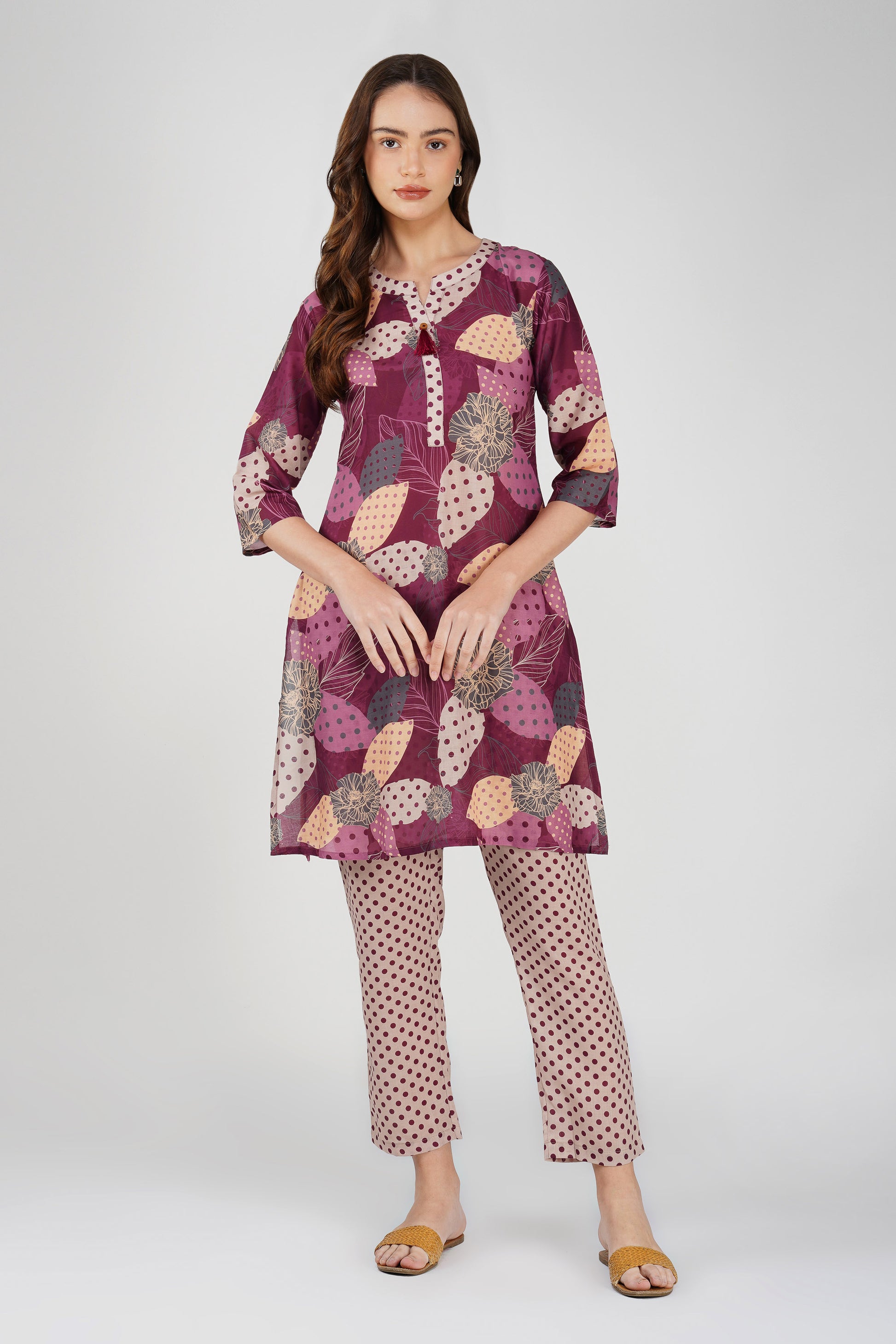 Wine Illustration Kurta Co-ord Set – Tassel Kurta with Polka Dot Pants