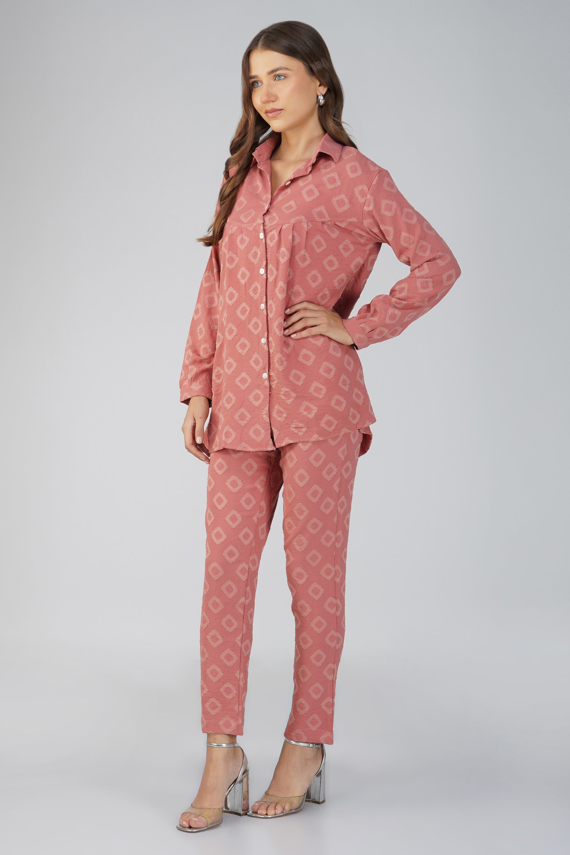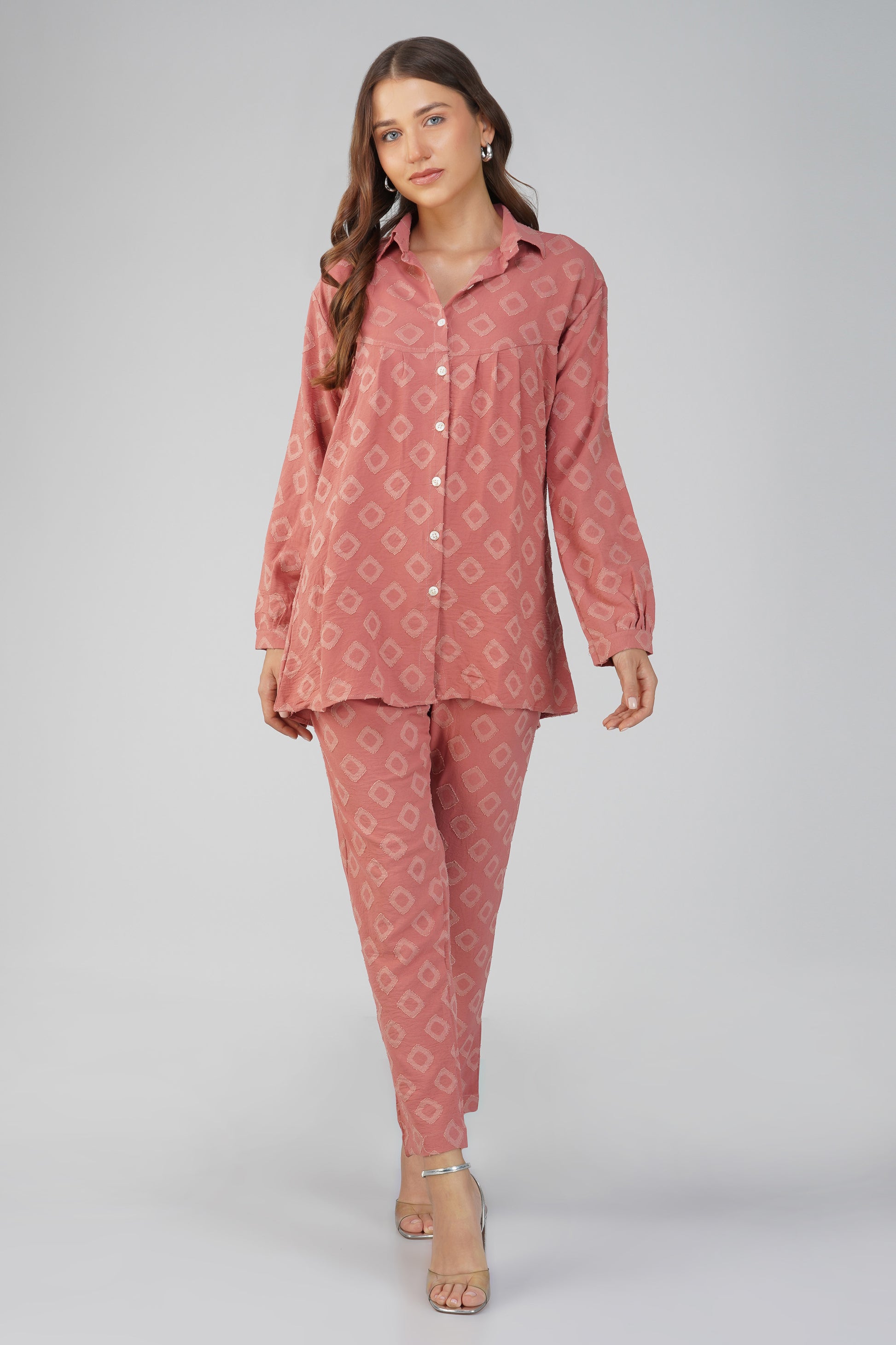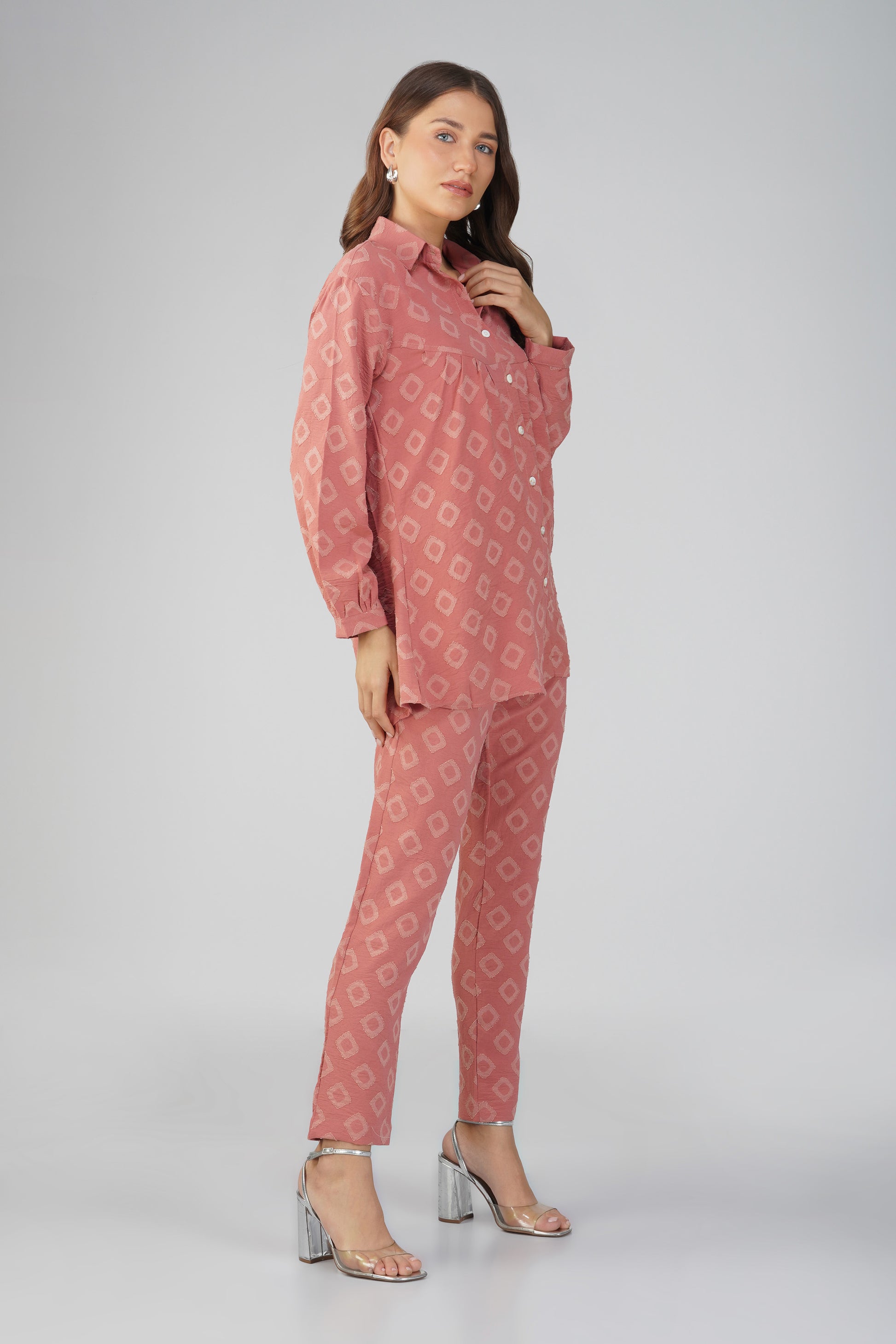 Peach Jacquard Shirt Lets Go Co-ord Set – Gathered Yoke Shirt with Relaxed Pants