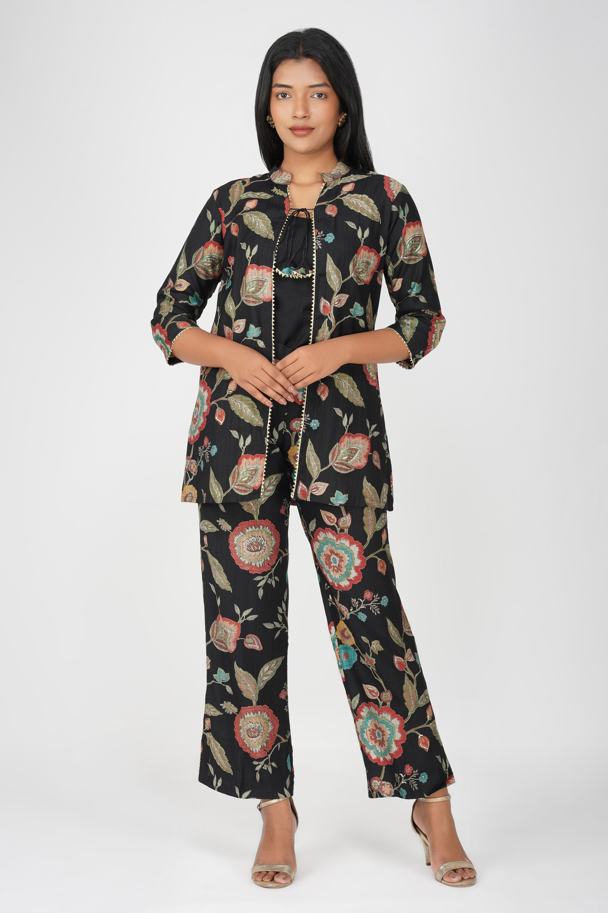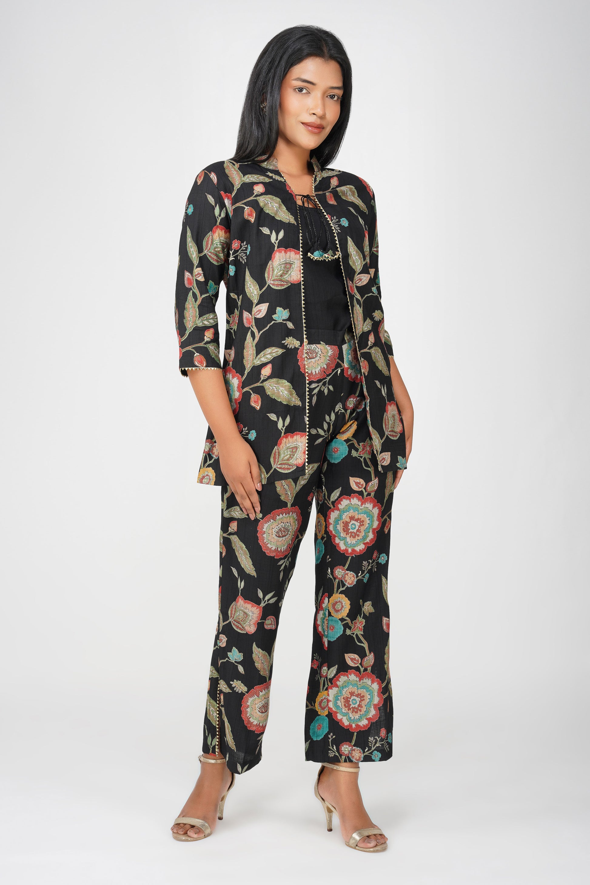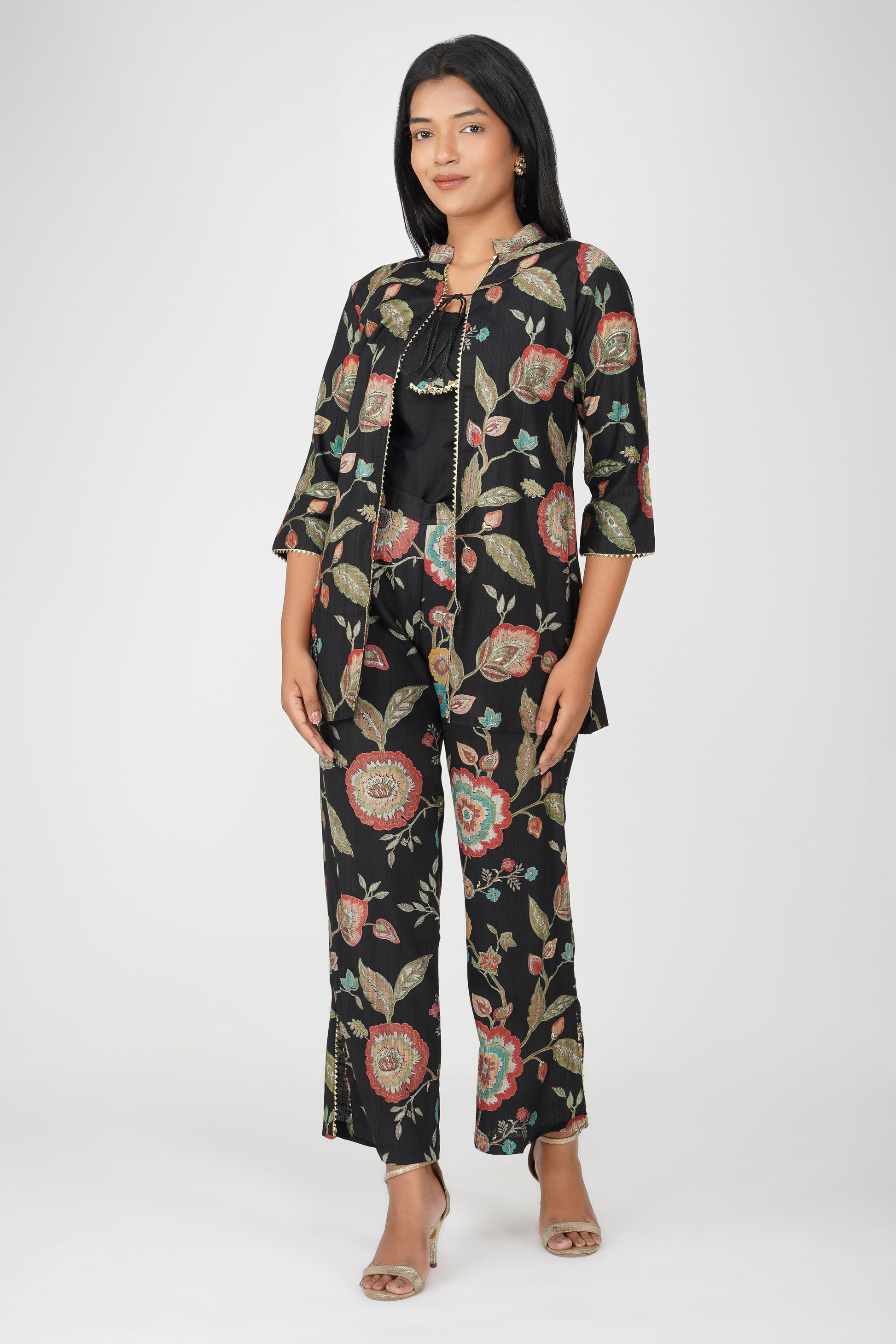 Maahi Co-ord Set – Black Floral Jacket, Solid Inner & Printed Palazzos (3-Piece Set)