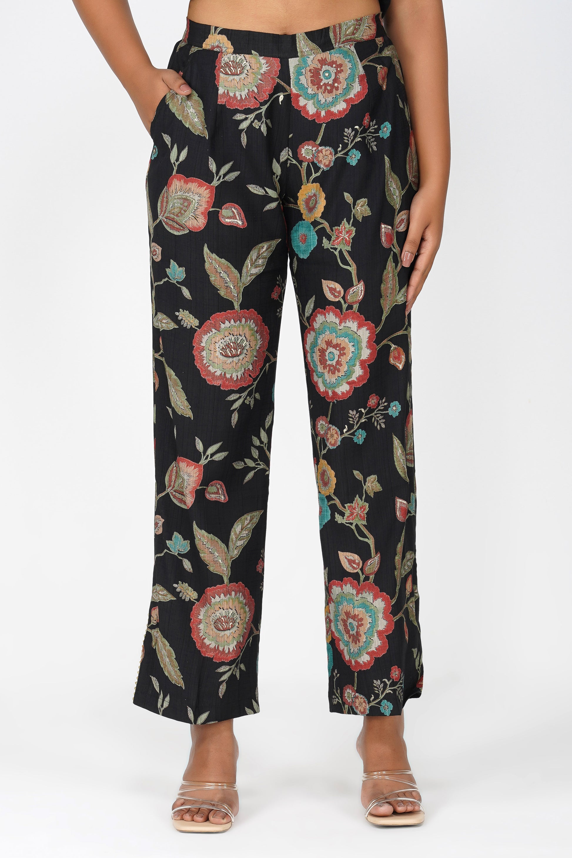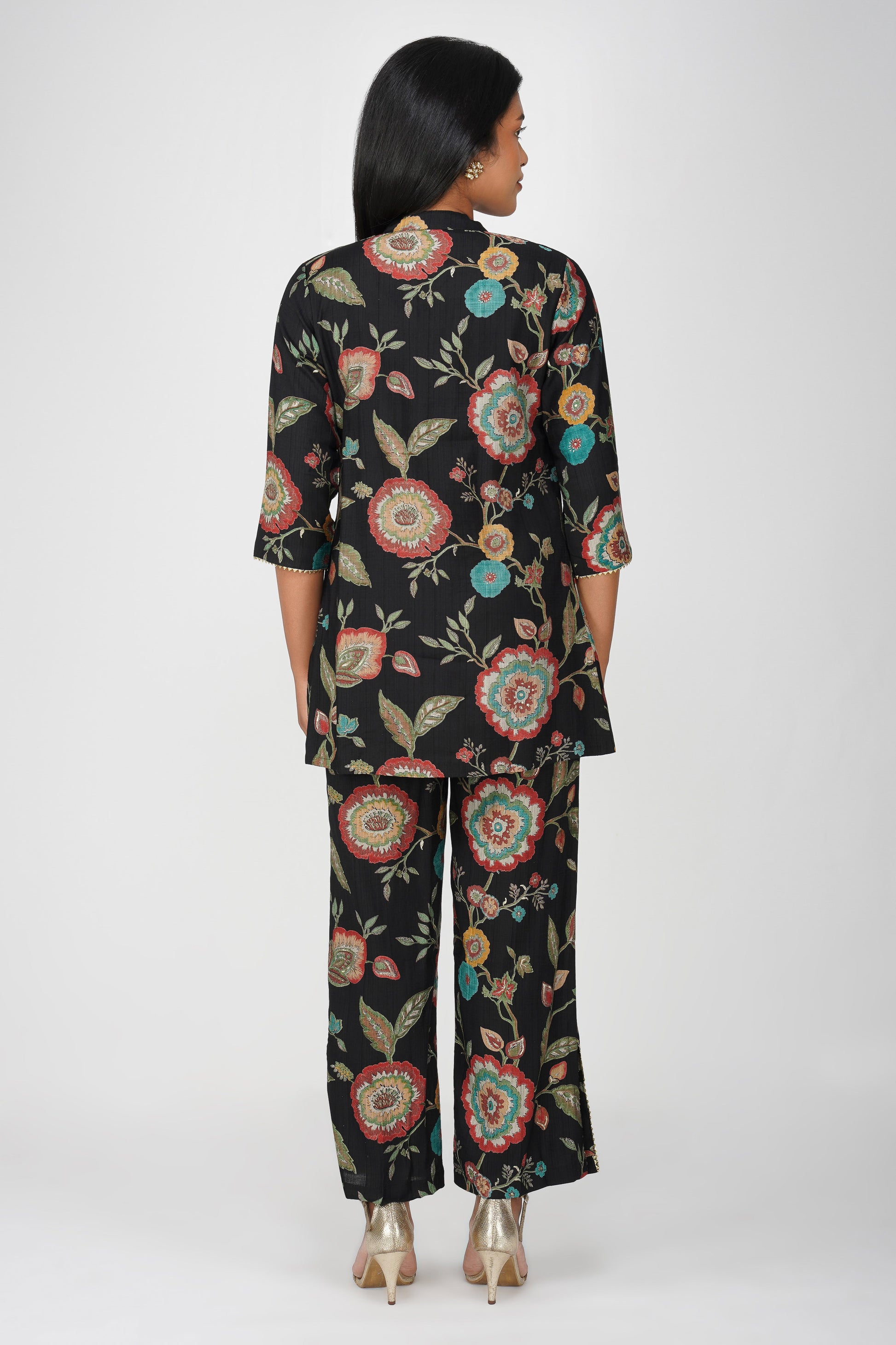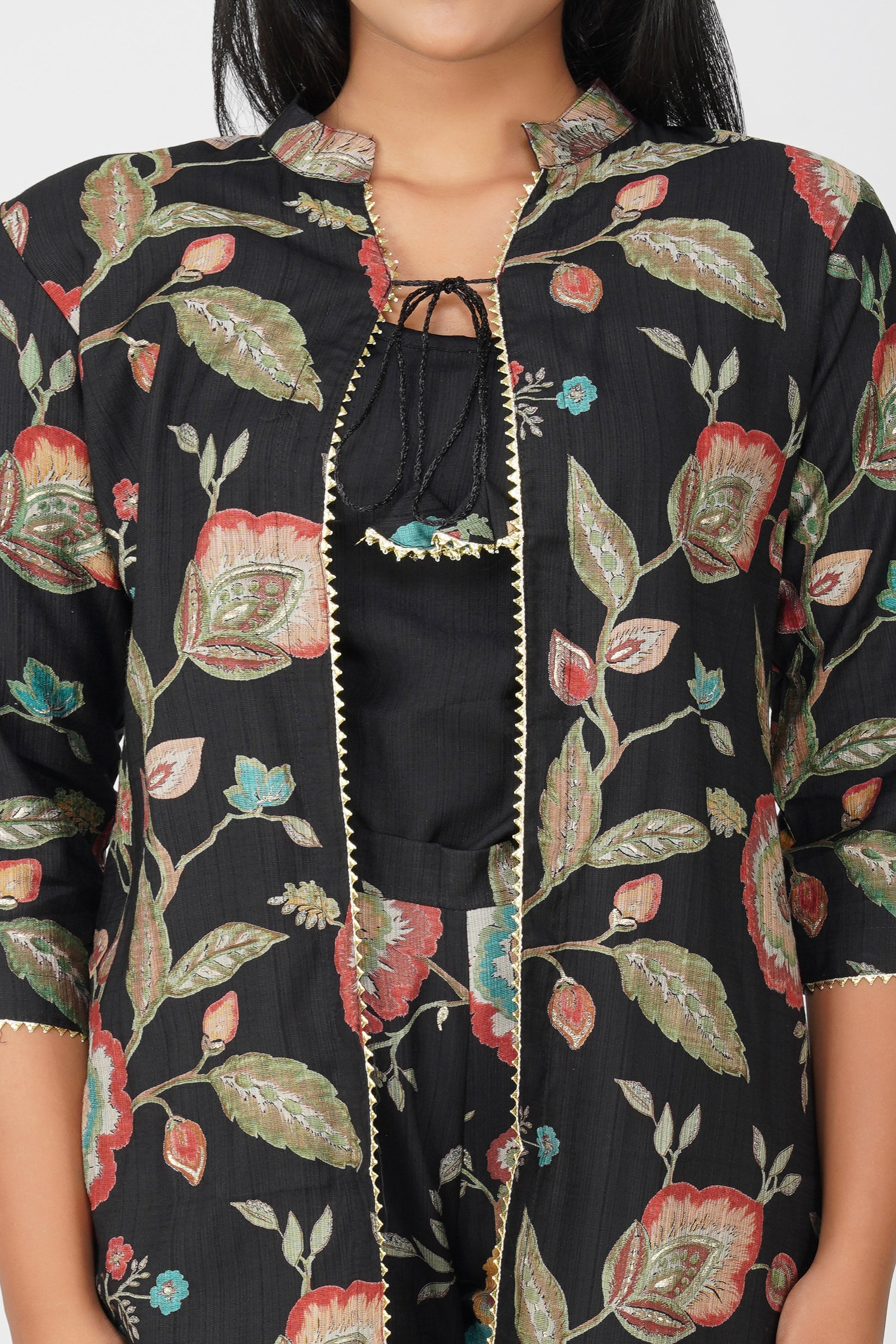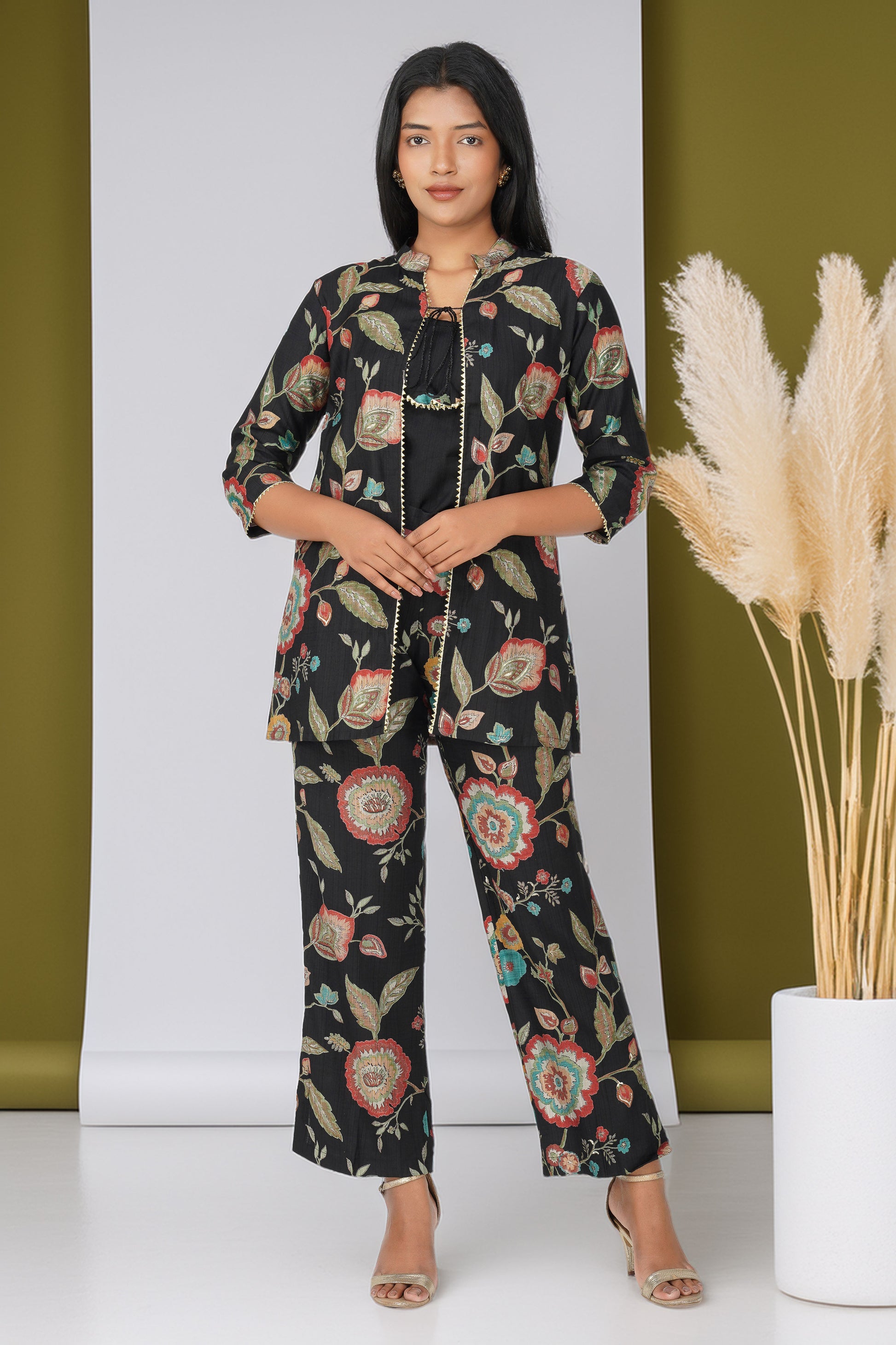 Maahi Co-ord Set – Black Floral Jacket, Solid Inner & Printed Palazzos (3-Piece Set)