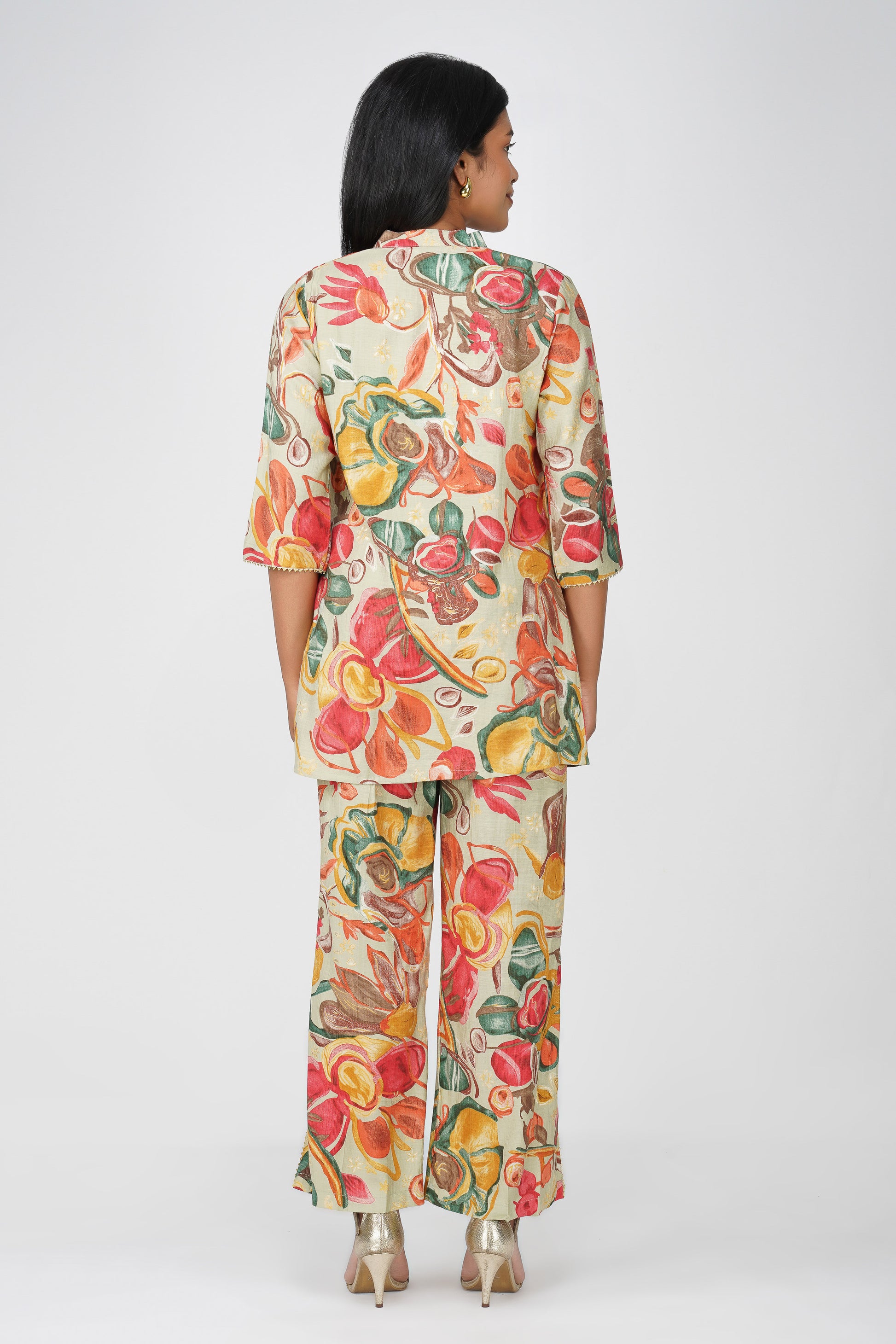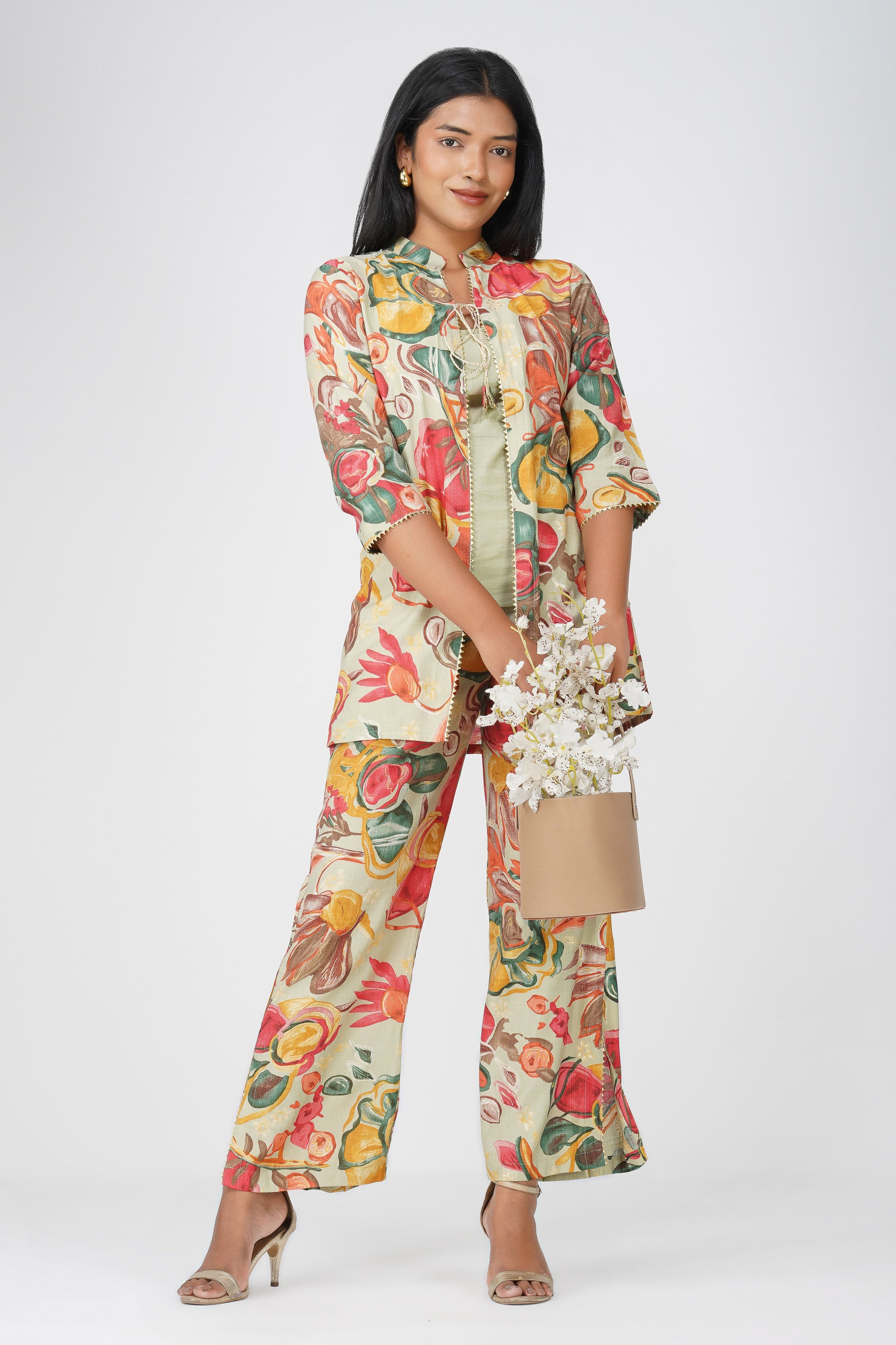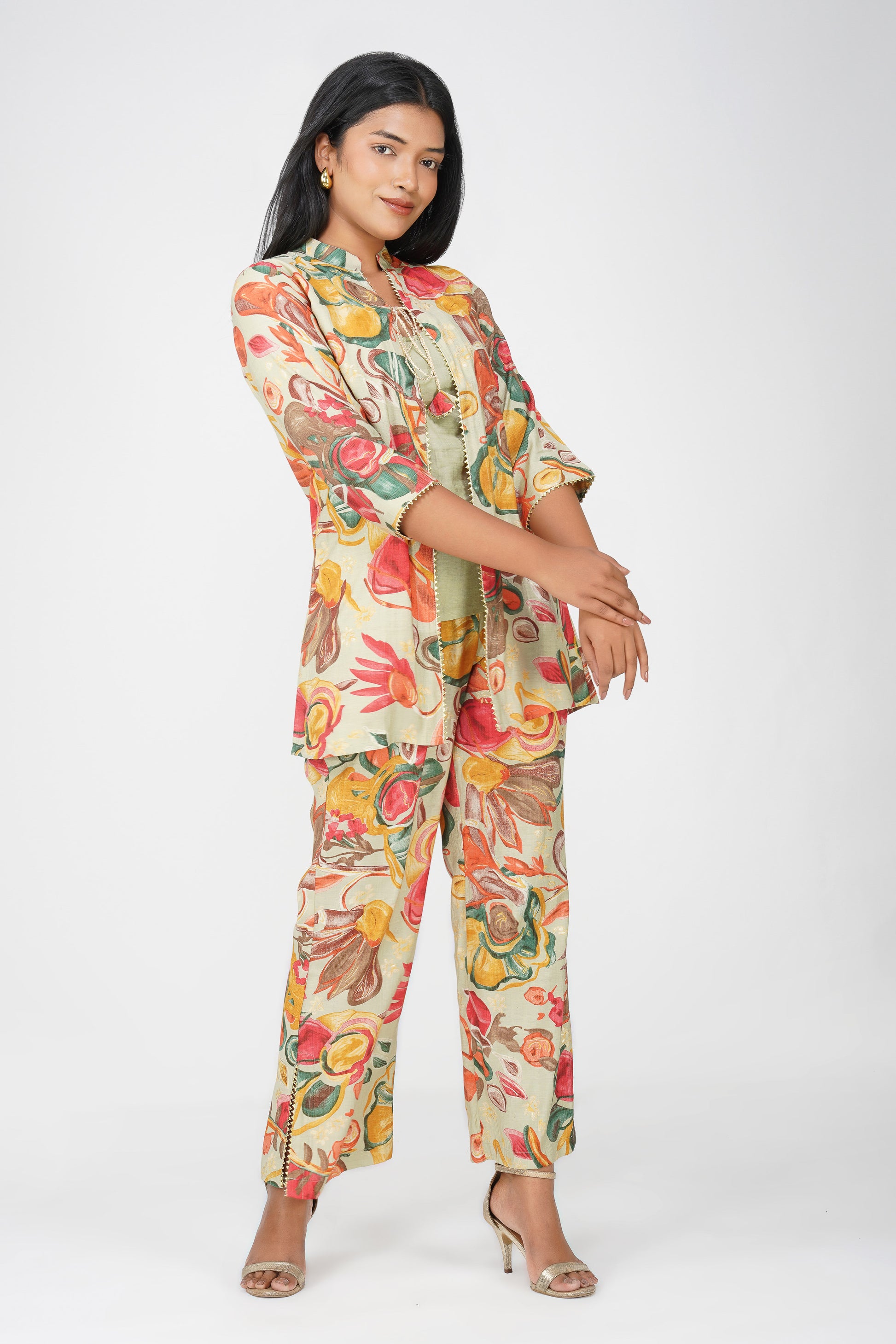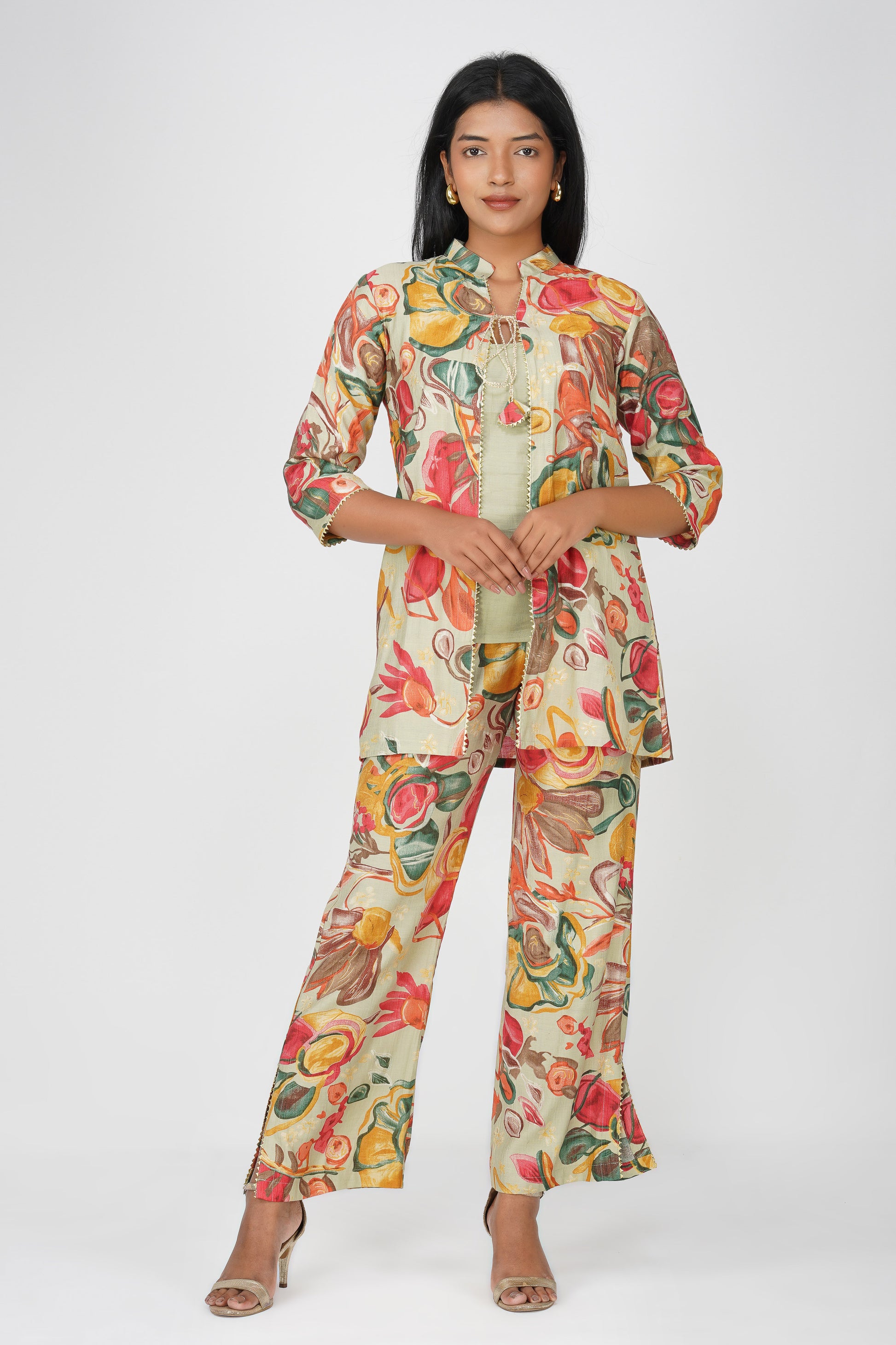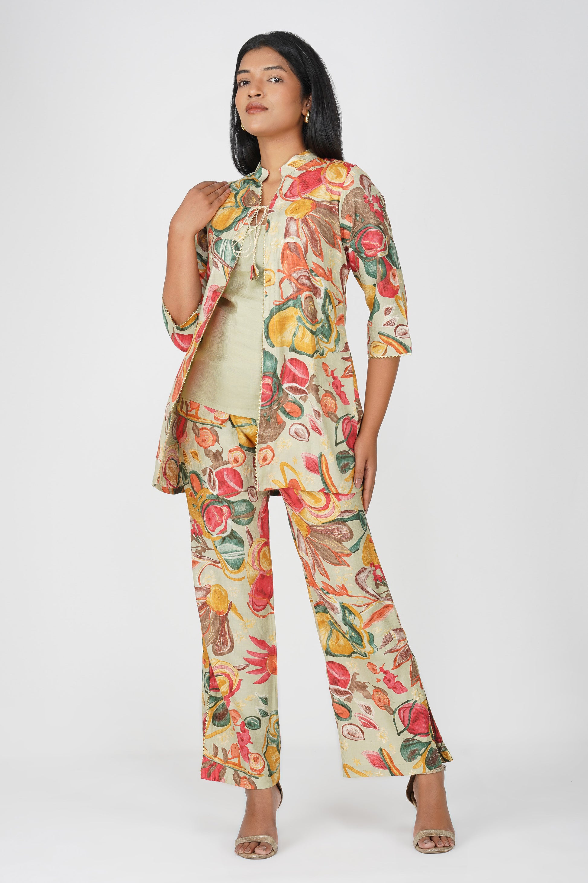 A refreshing take on festive fusion wear, Maahi in Pistachio Cream features a lively floral printed co-ord in a three-piece set — complete with a silk blend inner, flowing jacket, and matching palazzos. The delicate potli dori and lace detailing on the jacket make it effortlessly festive yet breathable for long hours of celebration. The palette blends muted green with pops of red, ochre, and teal — perfect for a modern Indian woman who loves tradition with a twist.