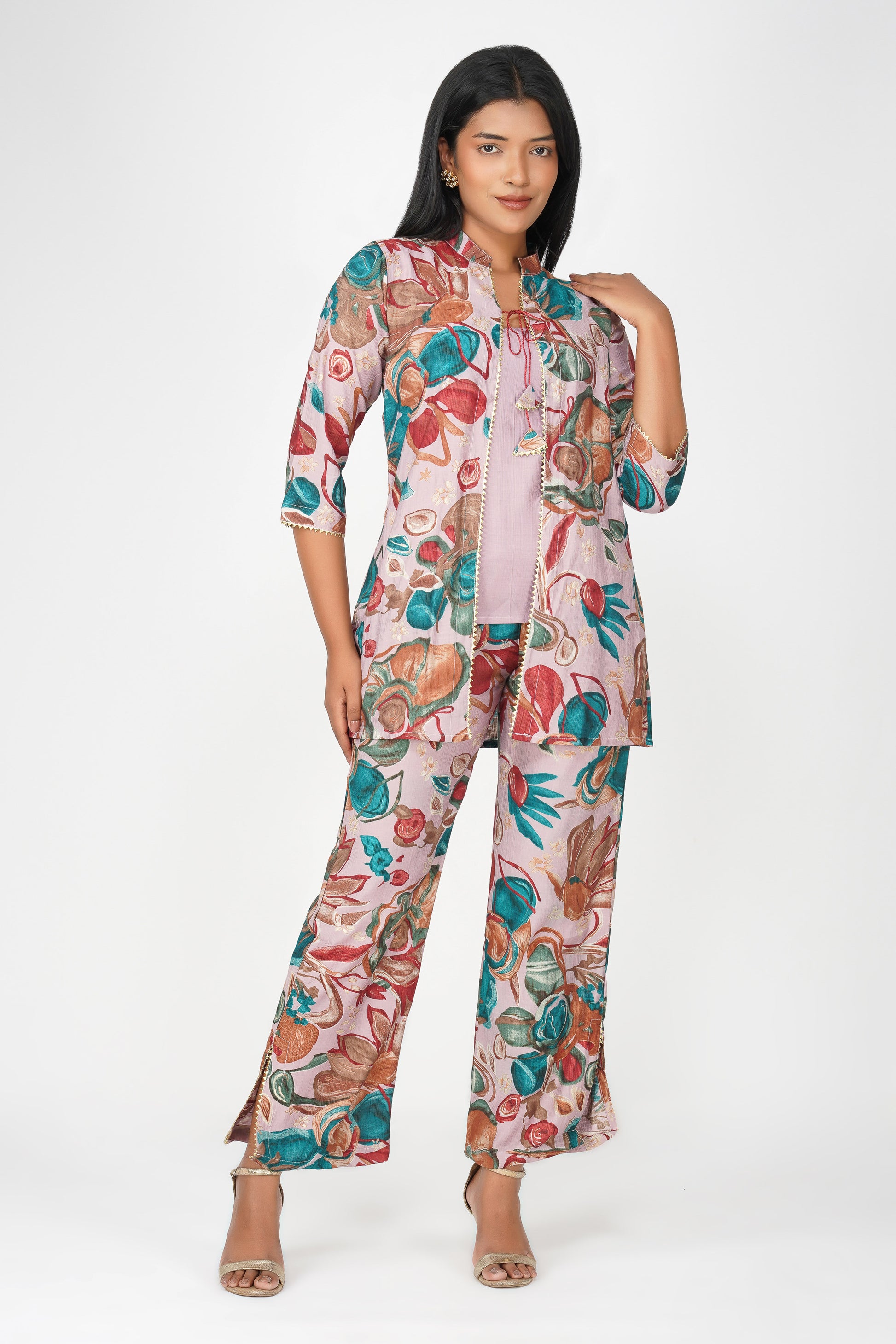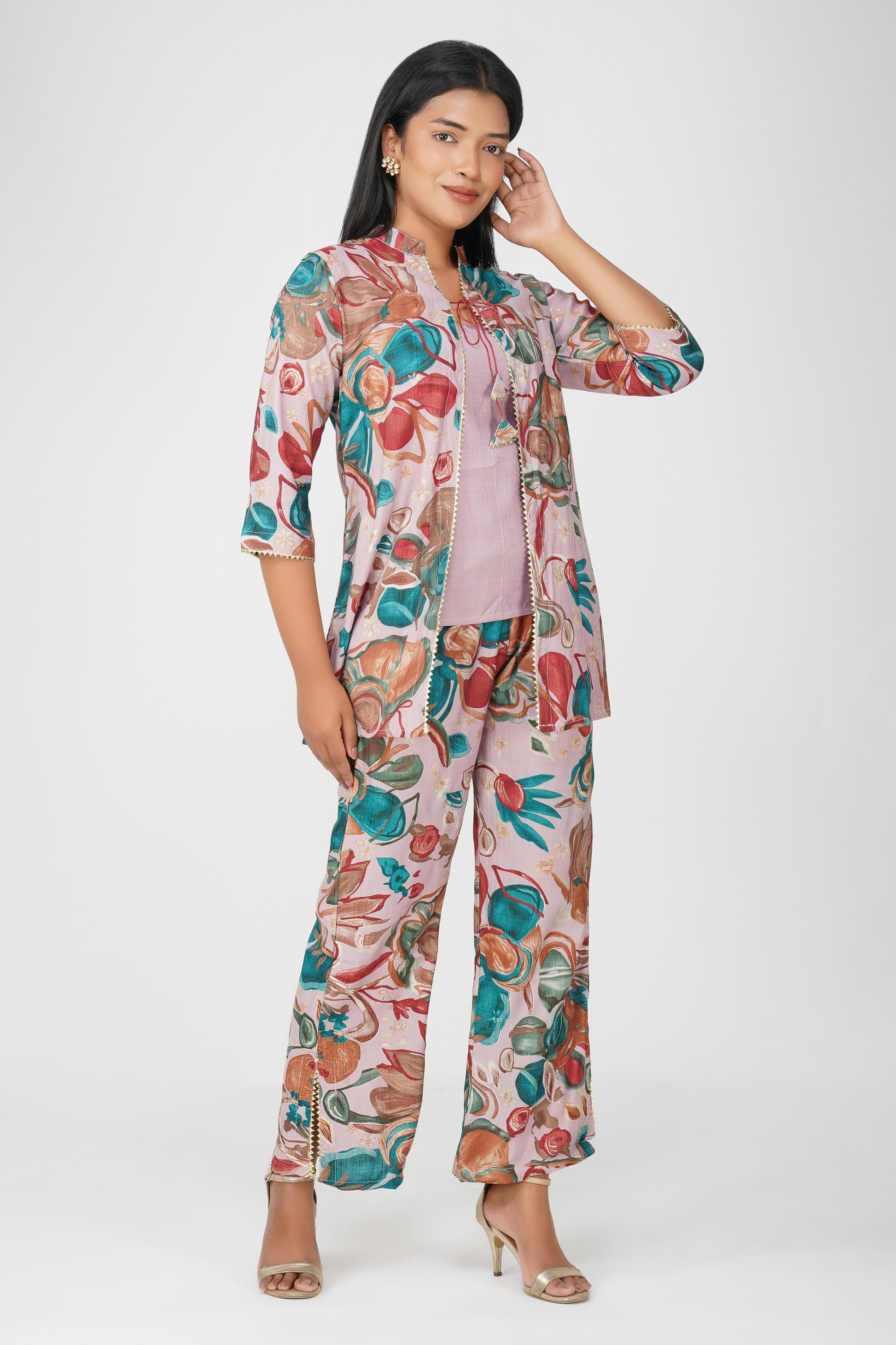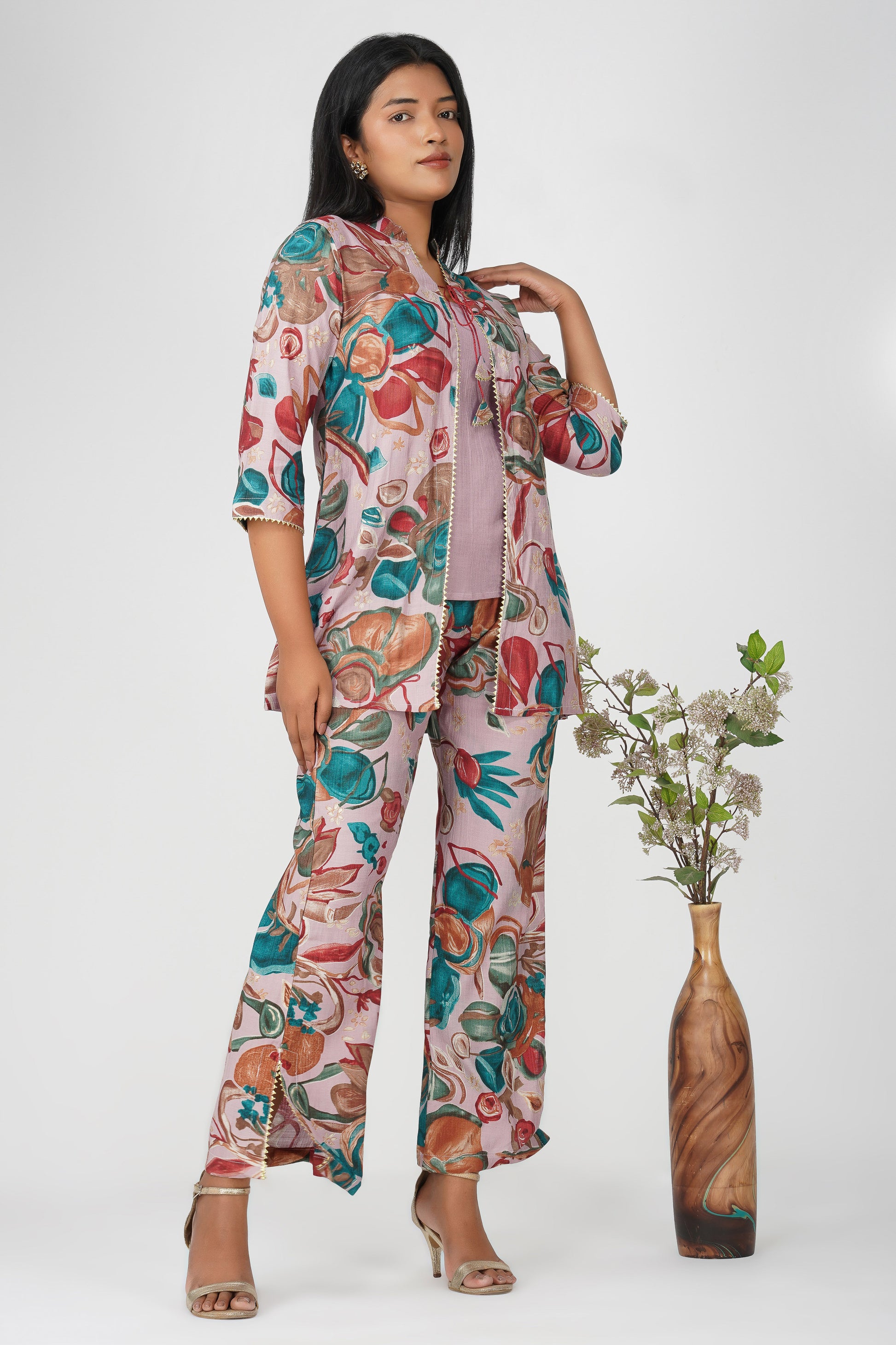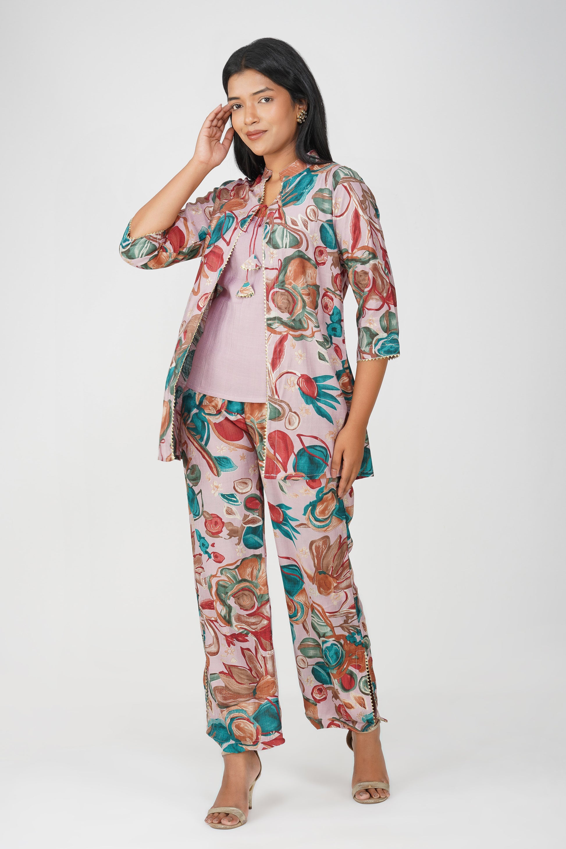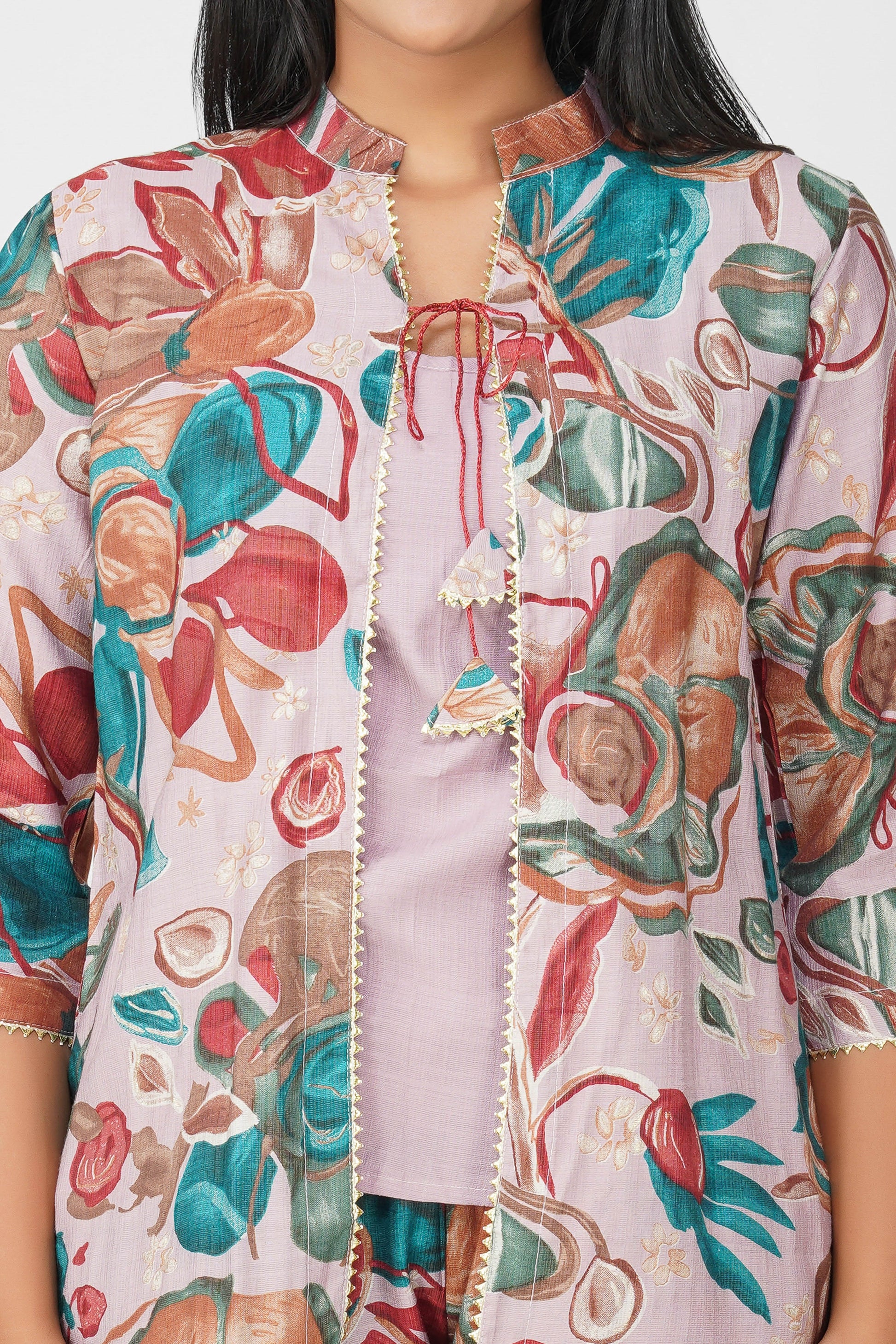 Maahi Co-ord Set – Lilac Floral Jacket, Solid Inner & Printed Palazzos (3-Piece Set)