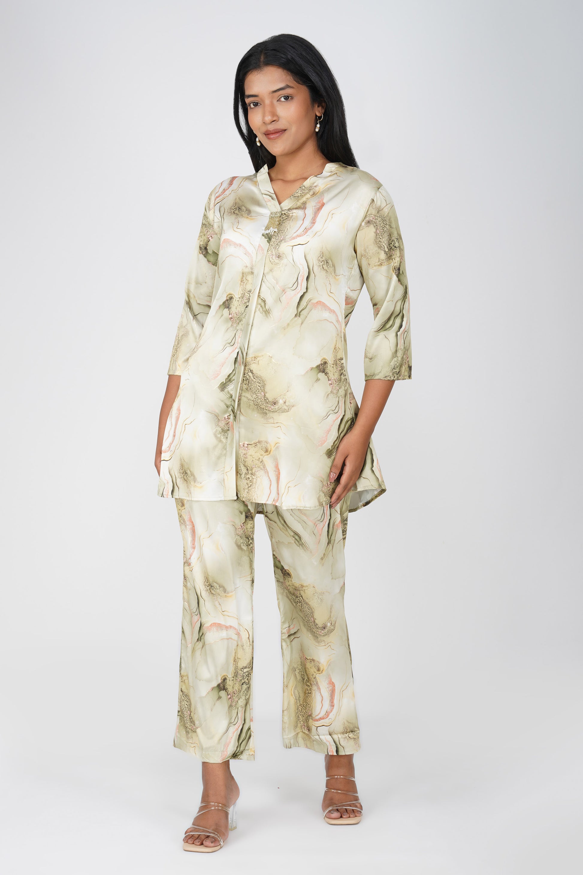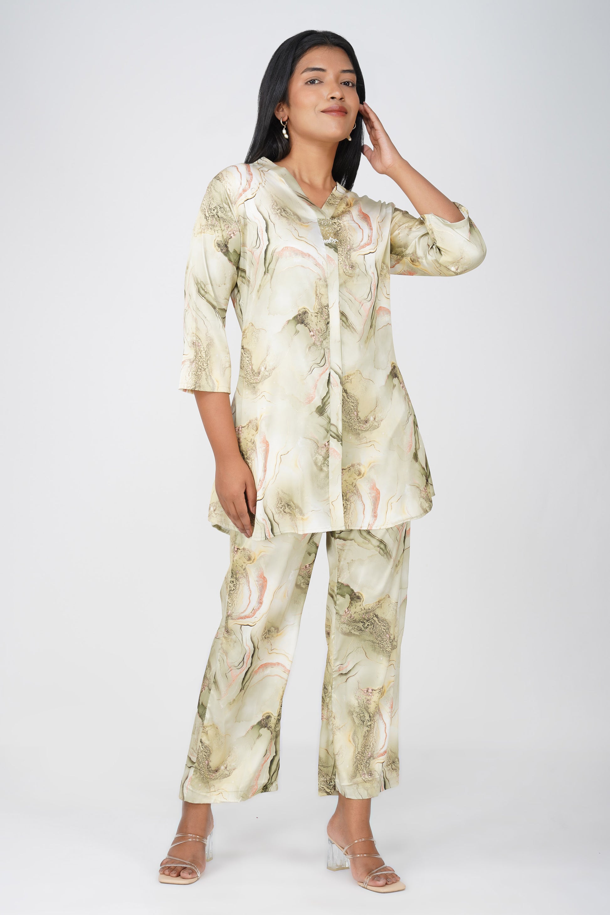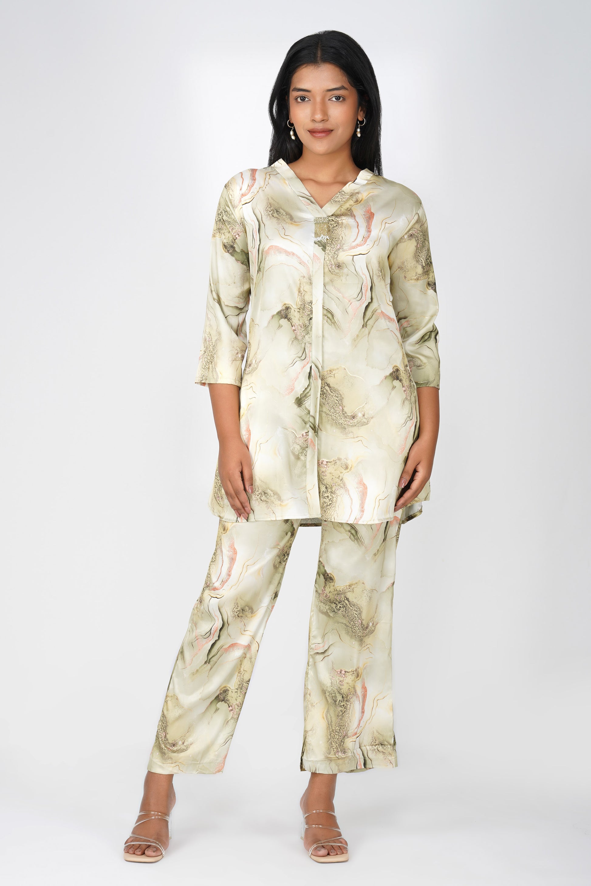 Make way for easy elegance ๐ โ Marbling in natural Green is the kind of festive outfit that does it all. With its flowing marbling print accented with fine gold outlines, this silk blend co-ord is designed for modern Indian women who want comfort without compromising on style. The handcrafted latkan on the front placket adds just the right festive flair. Whether itโs a pre-wedding dinner or a housewarming puja, this oneโs made to impress effortlessly.