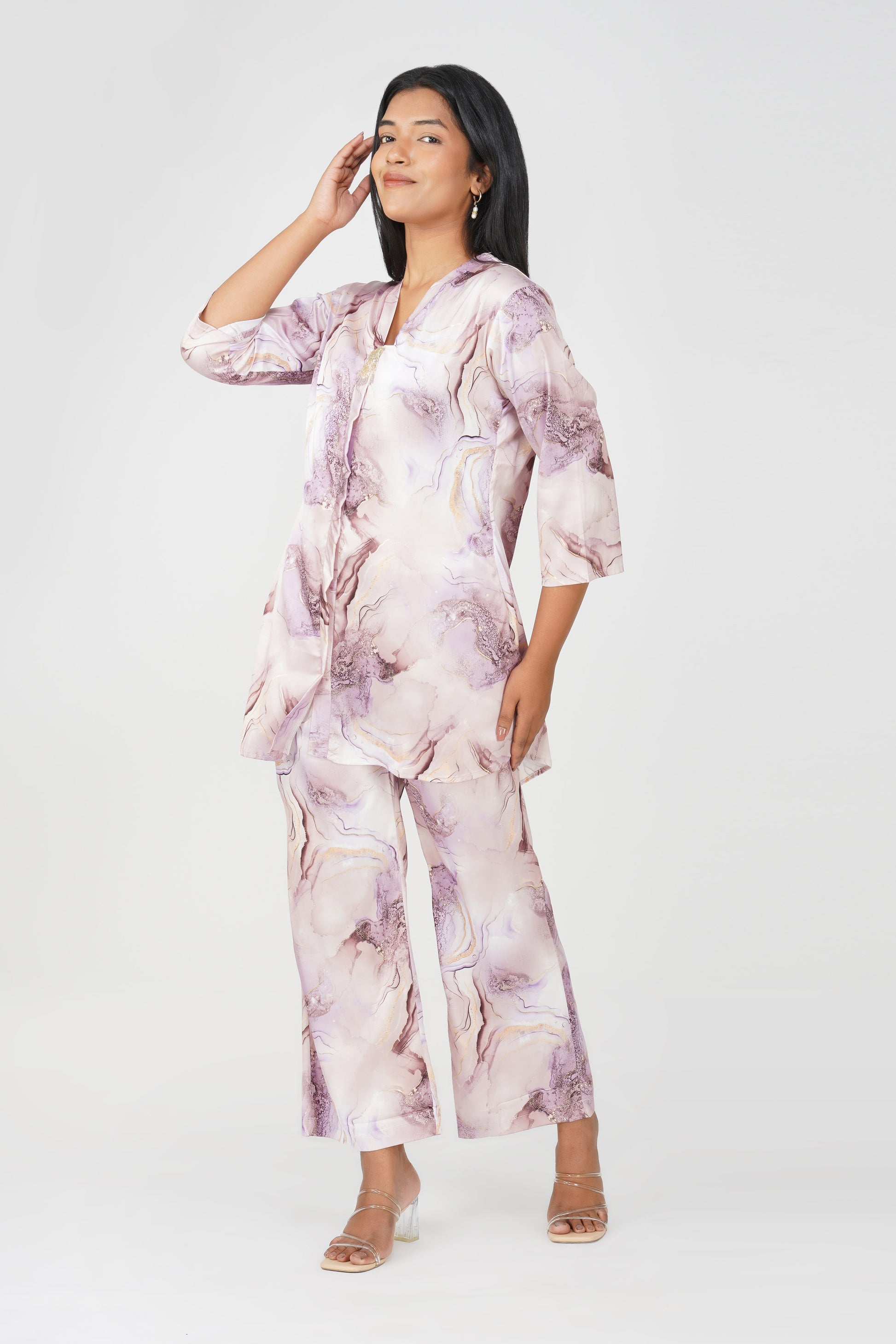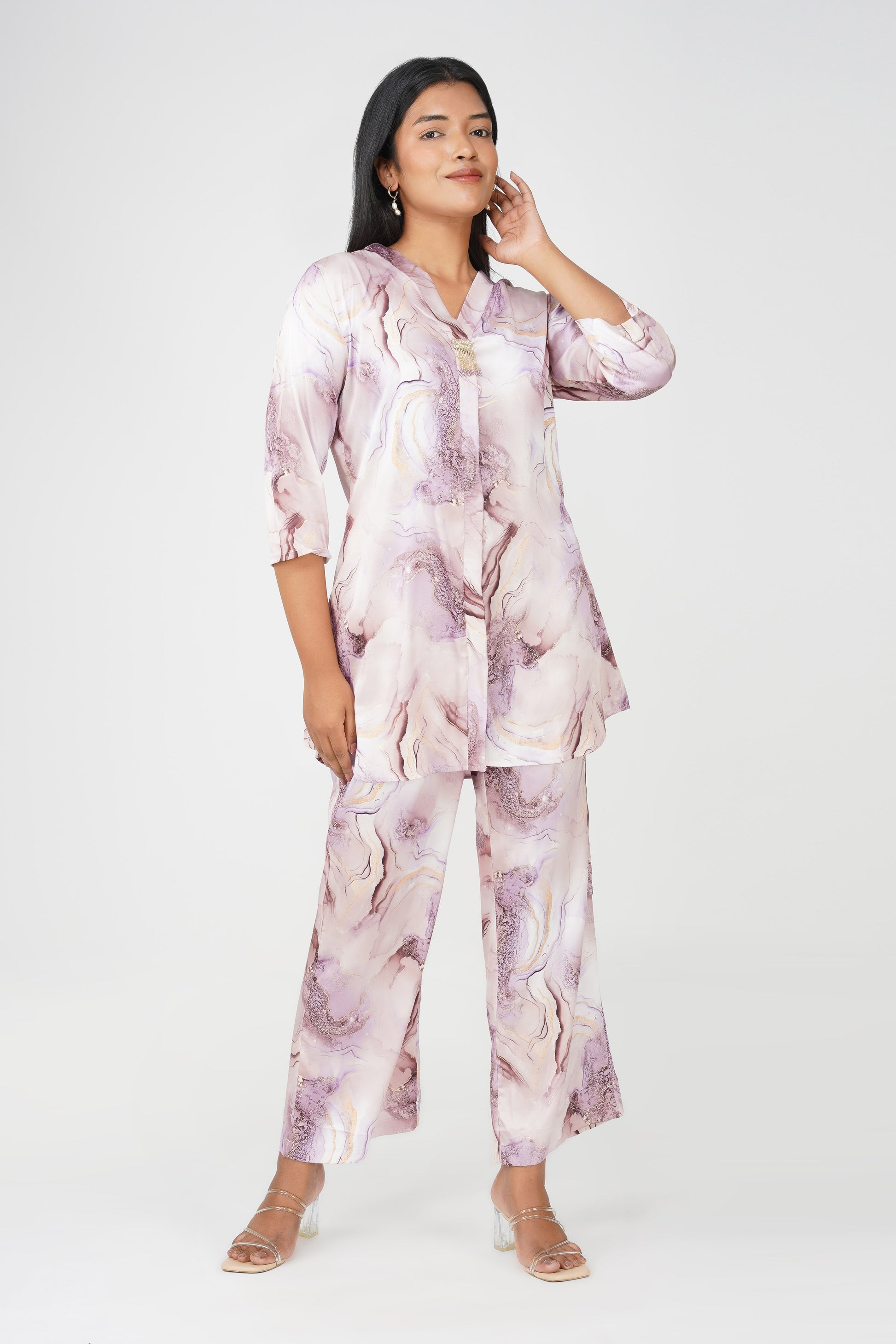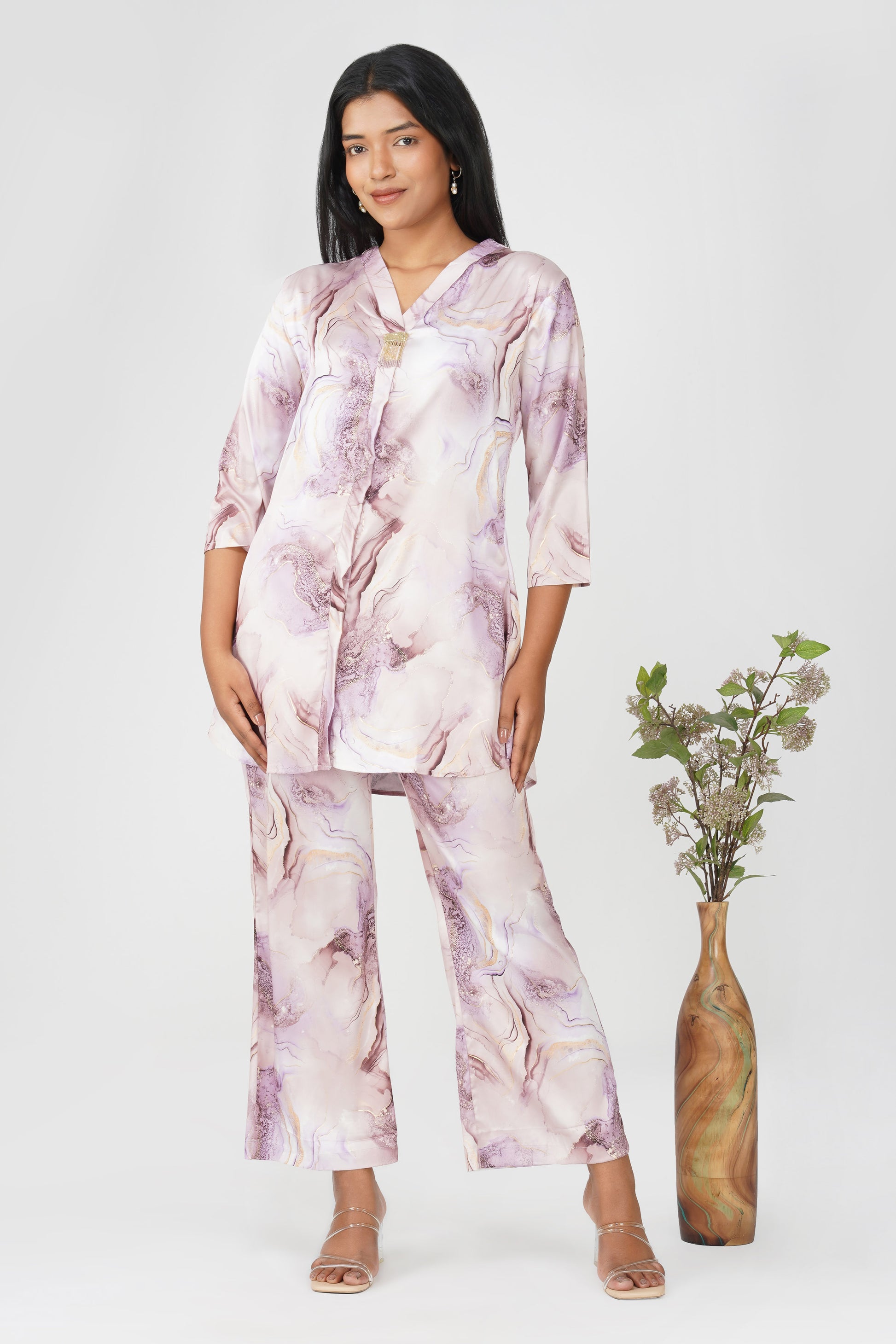 Marbling Co-ord Set – Lavender Marbling Print with Handwork Latkan
