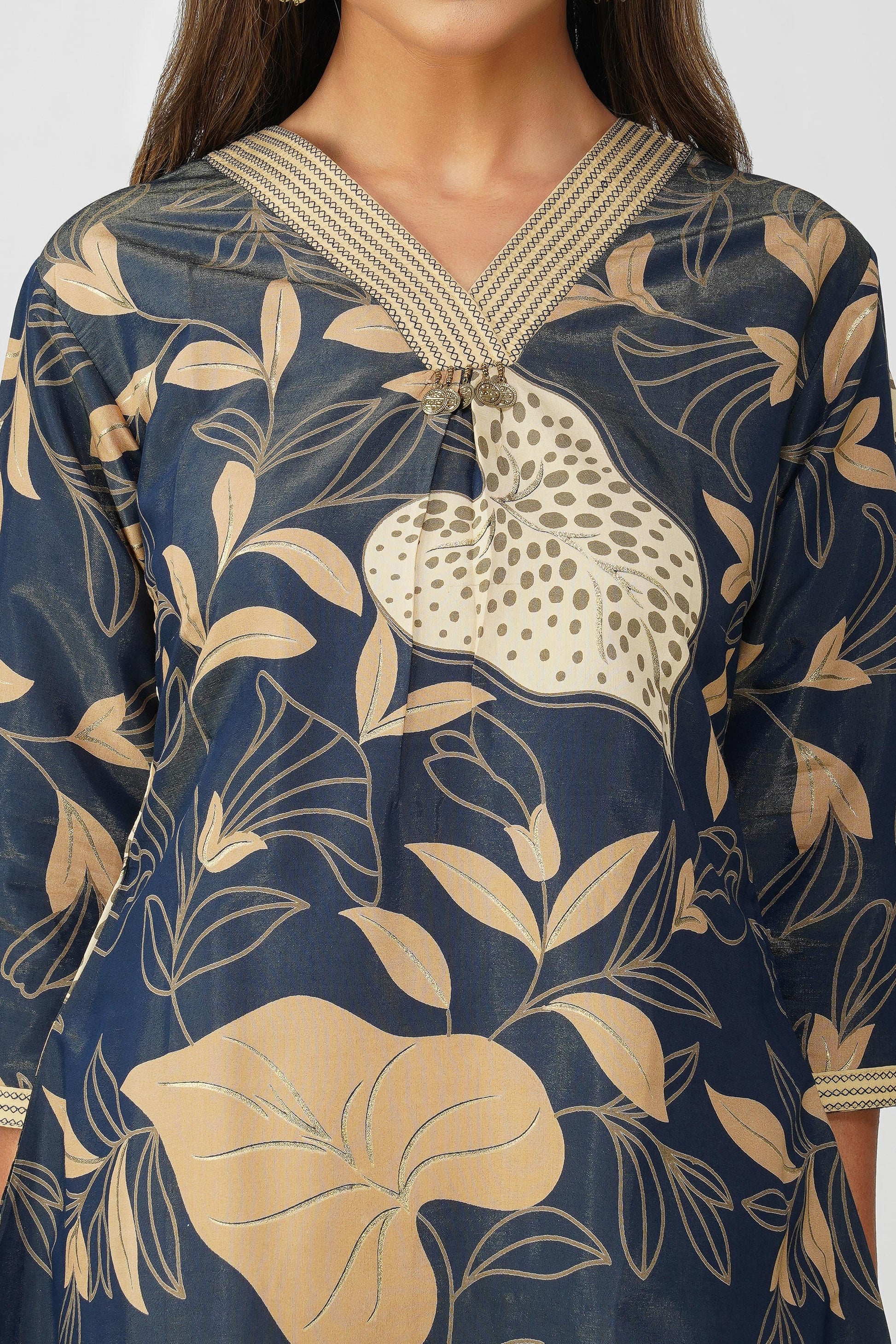 Color: Navy Blue with Gold-Beige Floral Print & Beige Pants 🌾