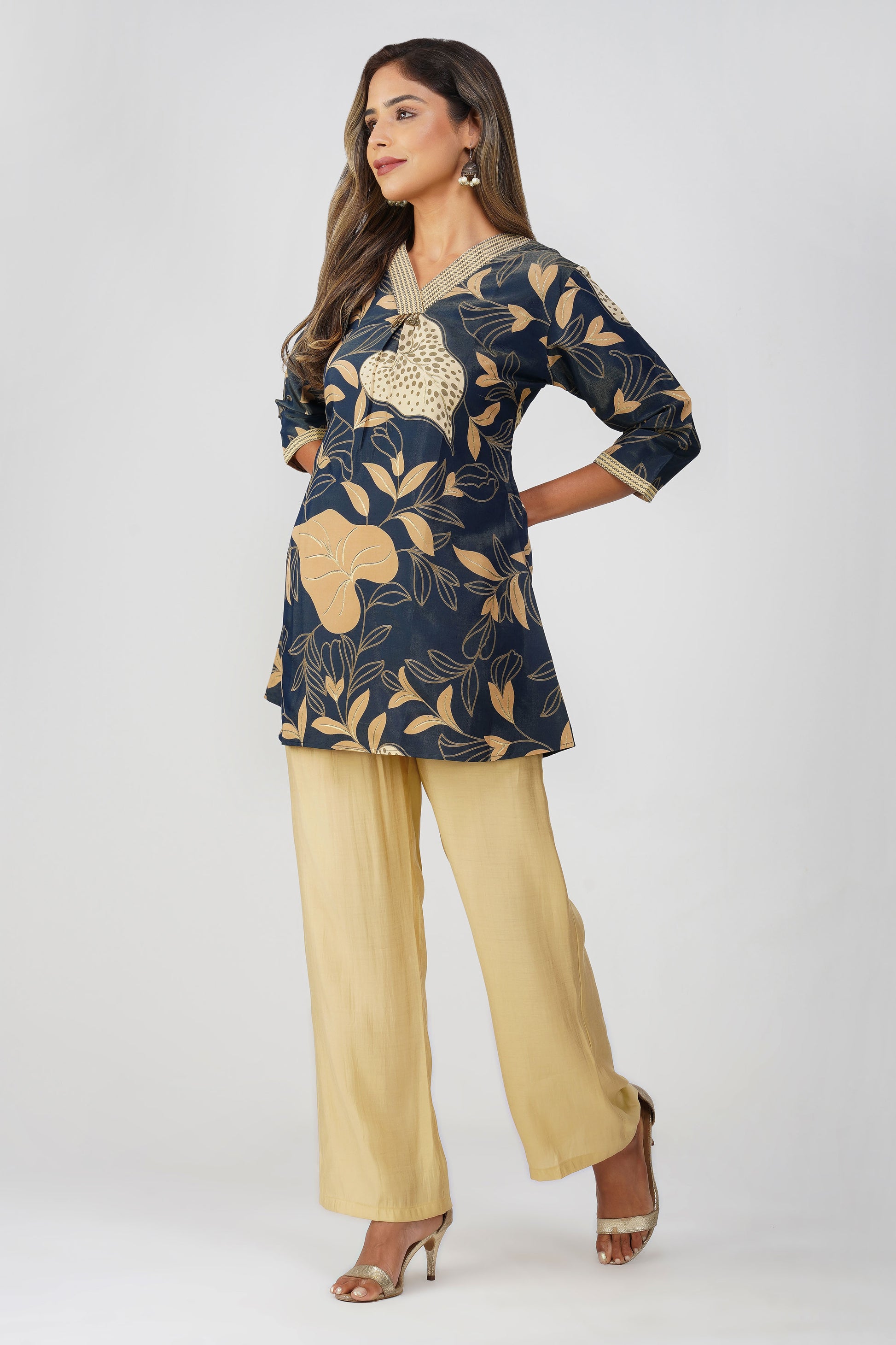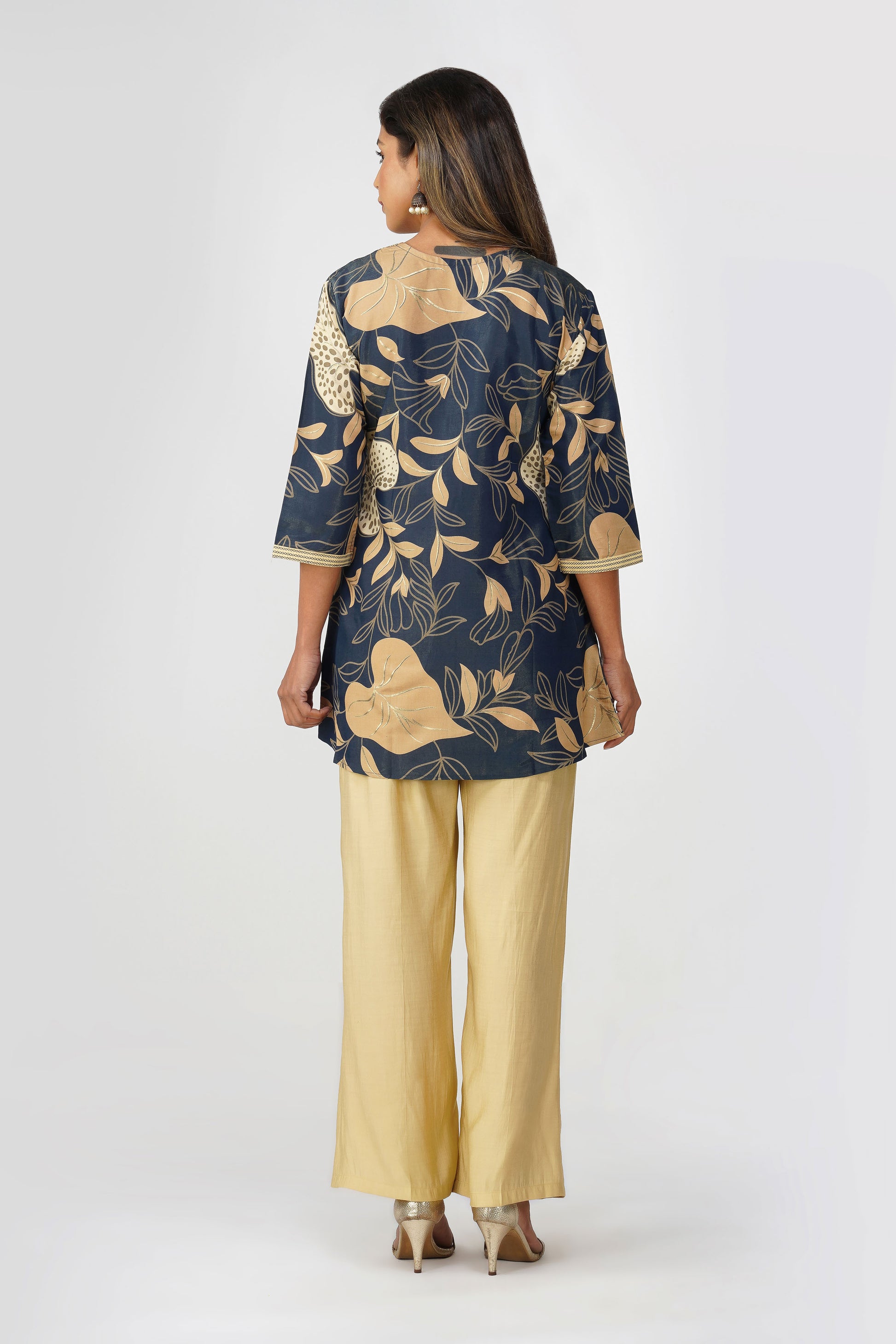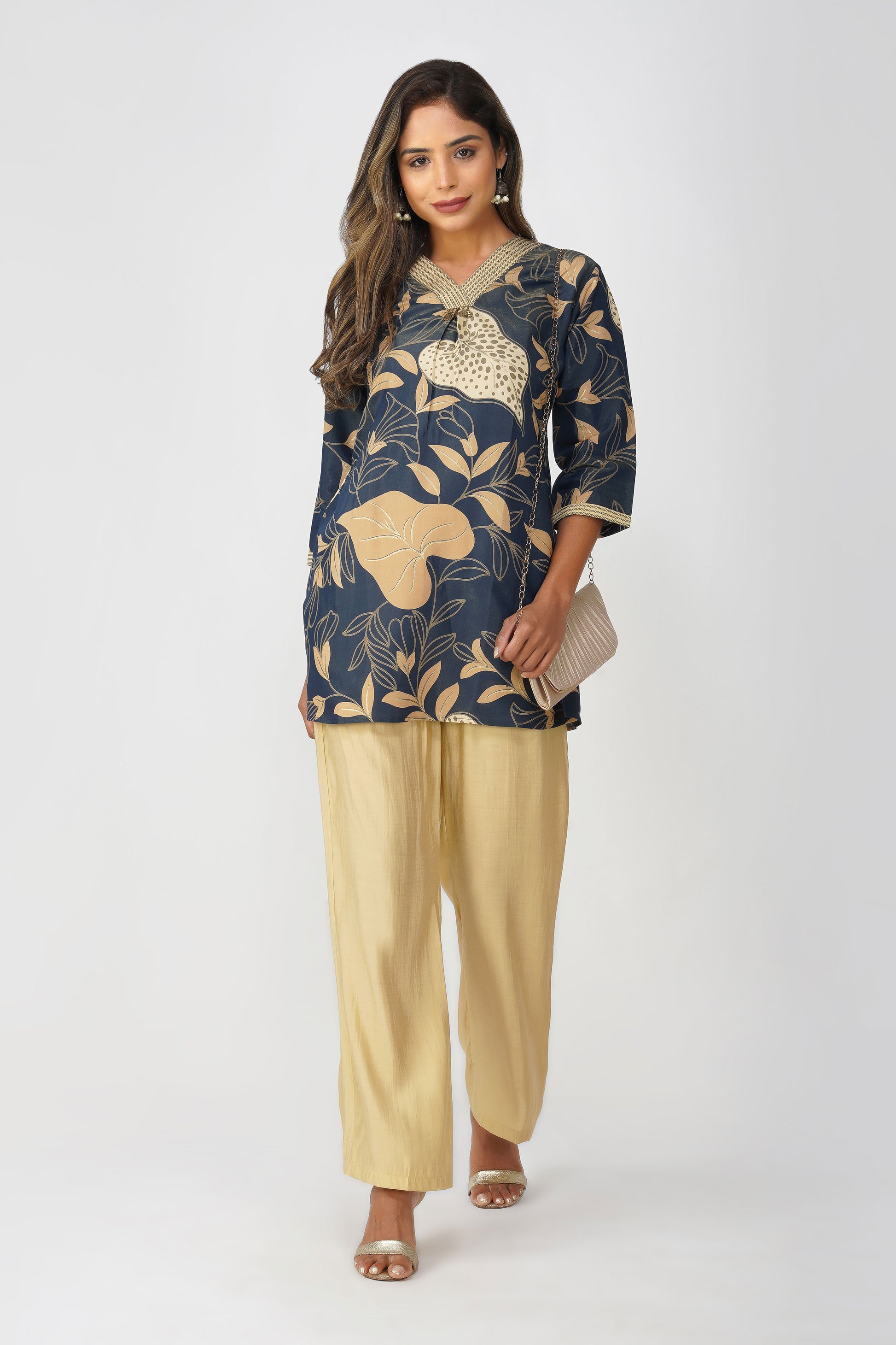 For days when you want that quiet luxury vibe with an Indian soul 🌿 This shimmer coord set brings together comfort, elegance, and a hint of tradition. The navy tunic features a soft sheen with delicate gold-beige botanical motifs and a flattering V-neckline adorned with antique coin detailing over an embroidered patch ✨ Paired with beige silk-blend palazzos, this look can go from festive brunches to evening soirees effortlessly.