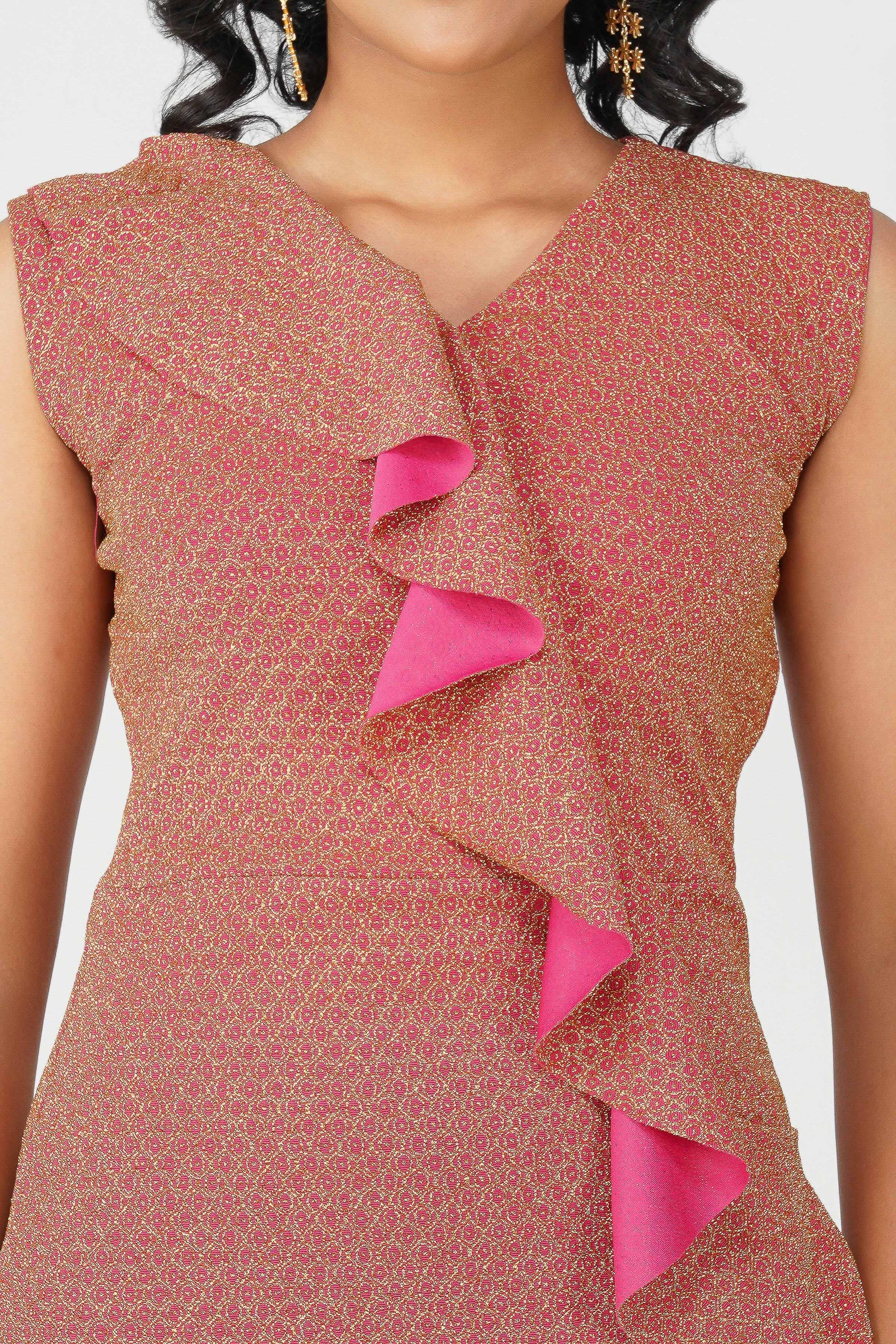 ✨ Drape yourself in rich glamour with this body-hugging knit dress in magenta, woven with gold zari threads. The sculpting fit is accentuated by a dramatic ruffle from shoulder to waist, creating an hourglass illusion while keeping it breathable and easy. A slit at the back hem adds movement and flair — your go-to for festive parties or glamorous soirées.