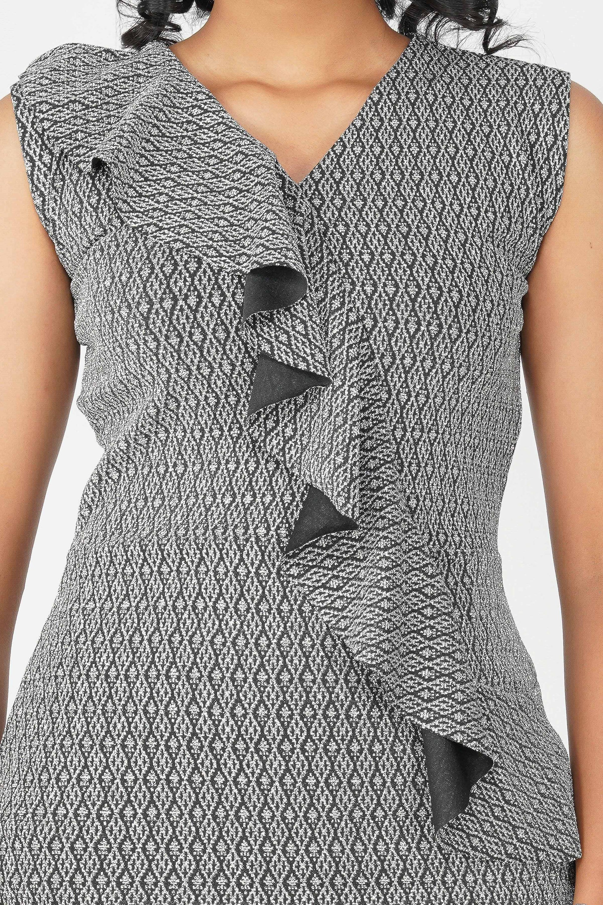 🌙 Midnight magic meets shimmer chic in this black bodycon dress woven with silver zari threads. The soft stretch knit hugs your body comfortably, while the sculpting ruffle from shoulder to waist adds just the right drama and shape illusion. Finished with a sleek back slit for movement, it’s your go-to piece for cocktail parties, receptions, or glam festive nights.