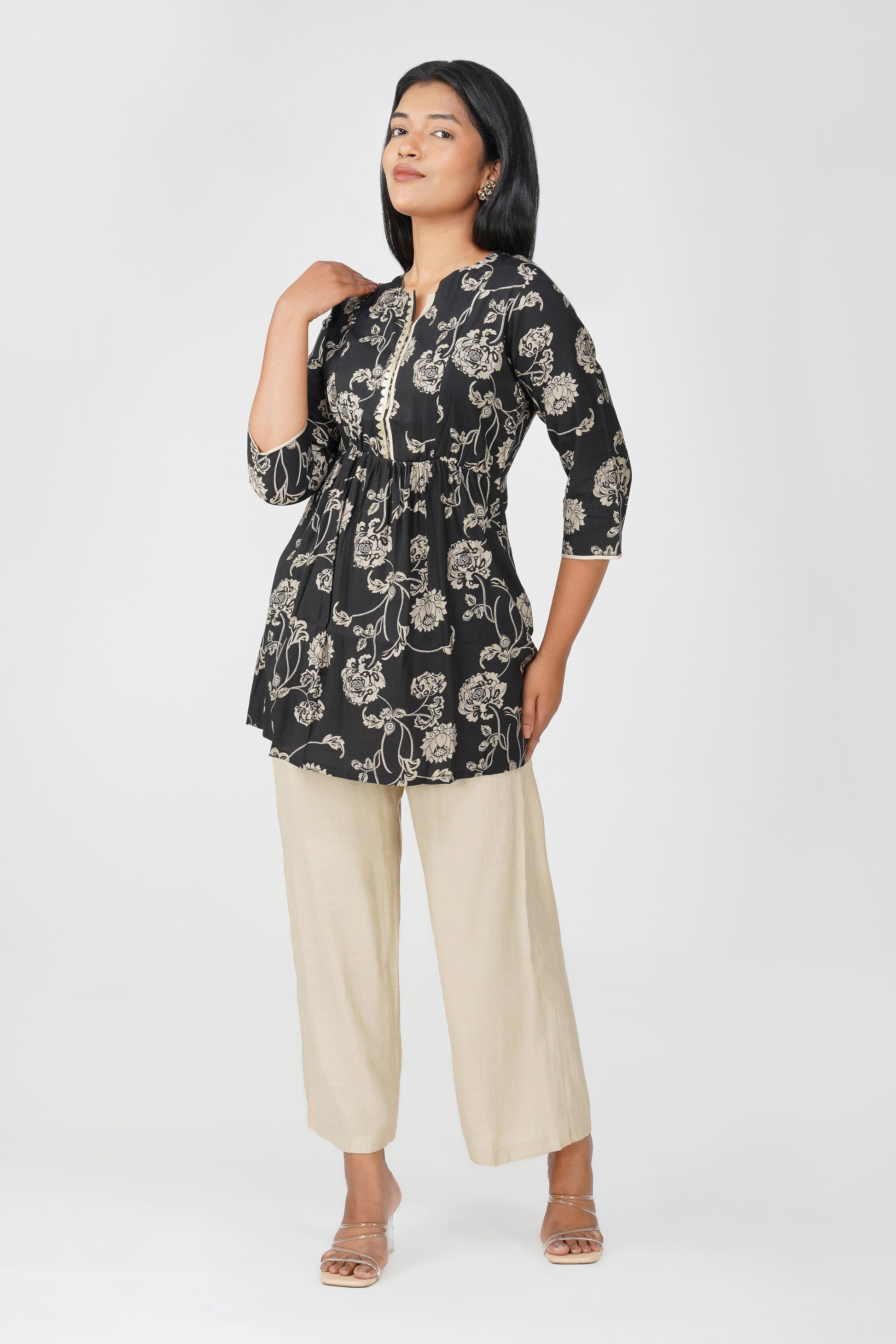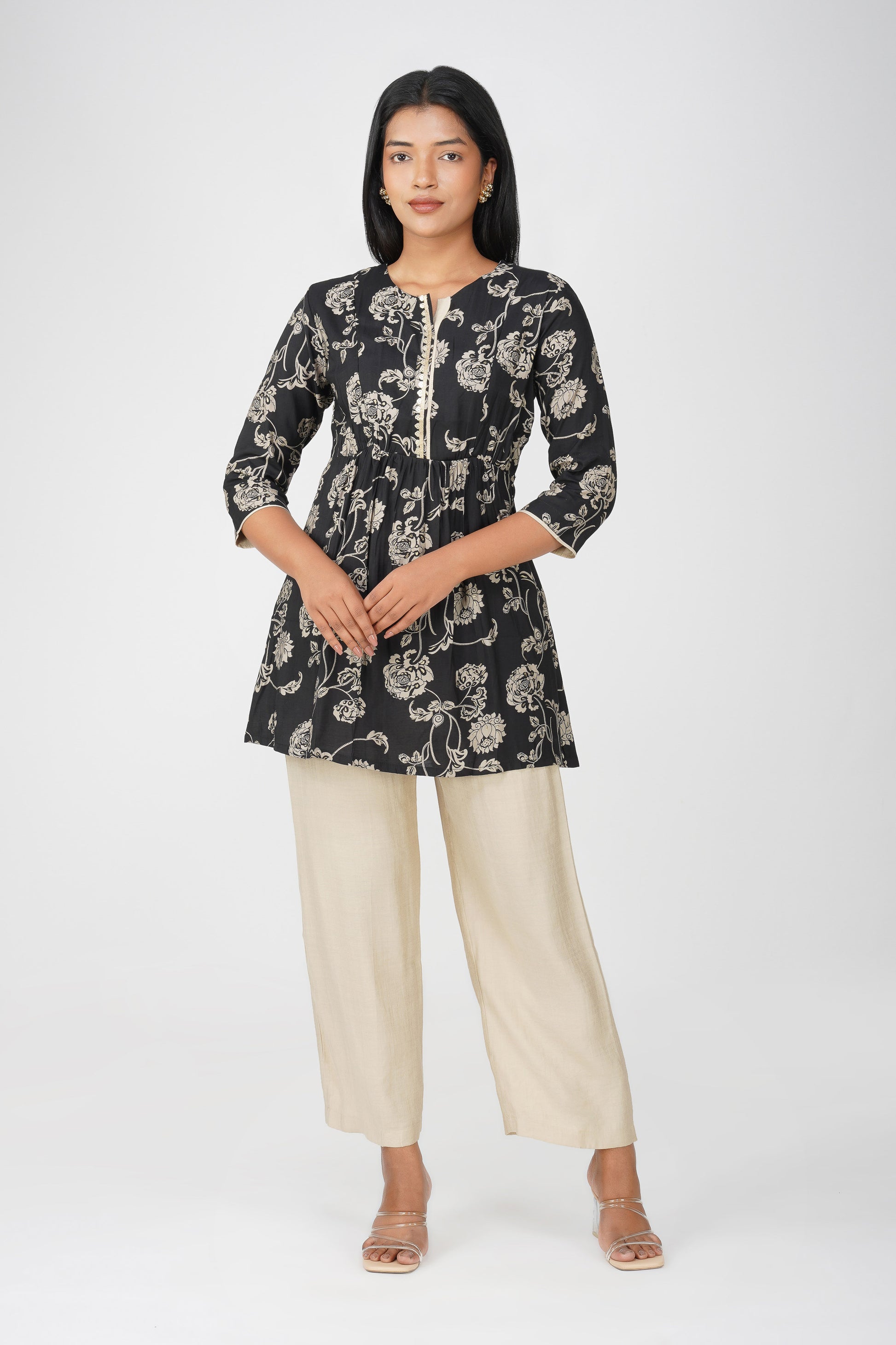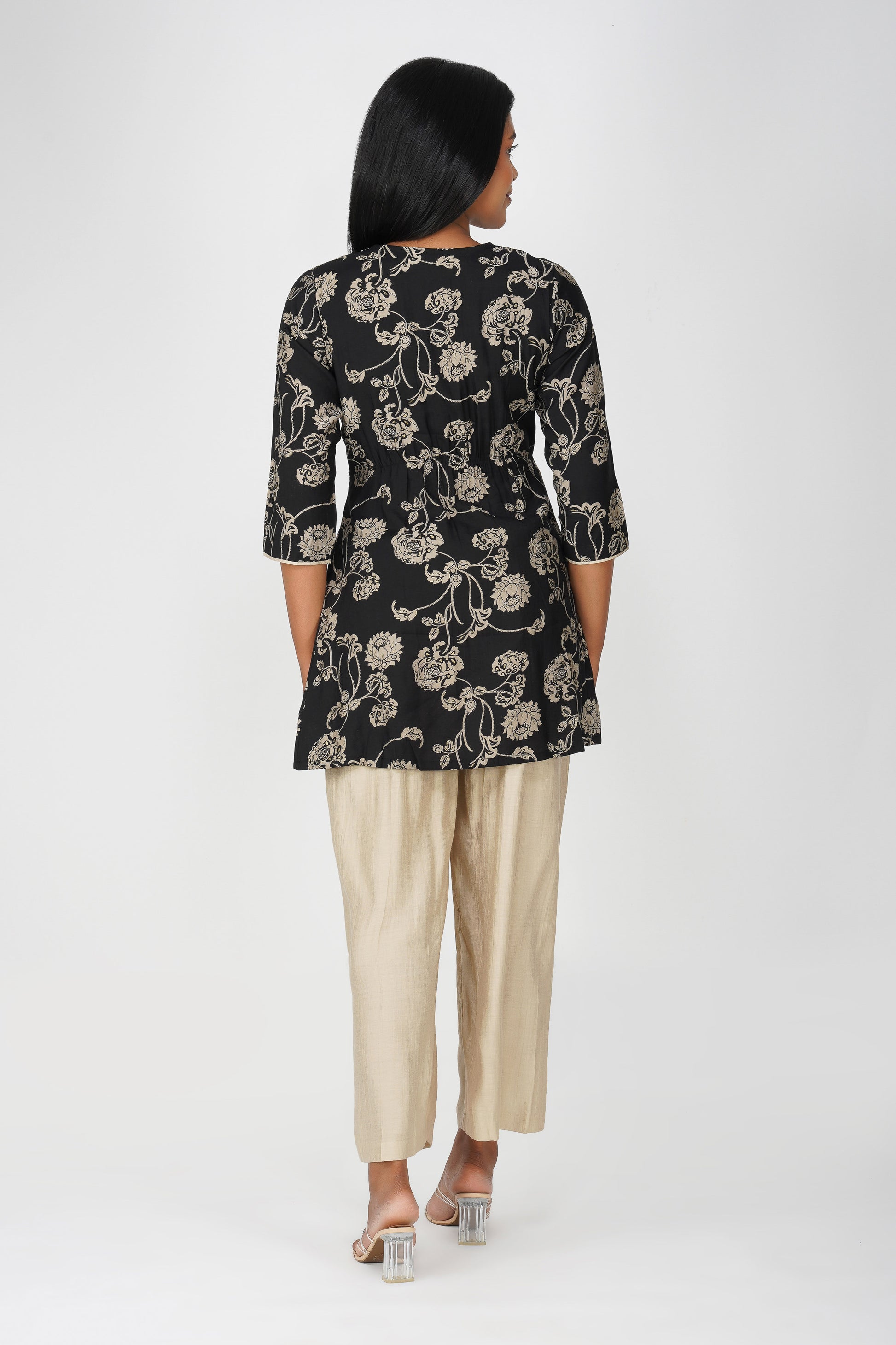 ✨ A floral-printed ethnic tunic in a flattering peplum style, enhanced with delicate gold sequin work on the placket. An easy pick for your everyday festive vibe!