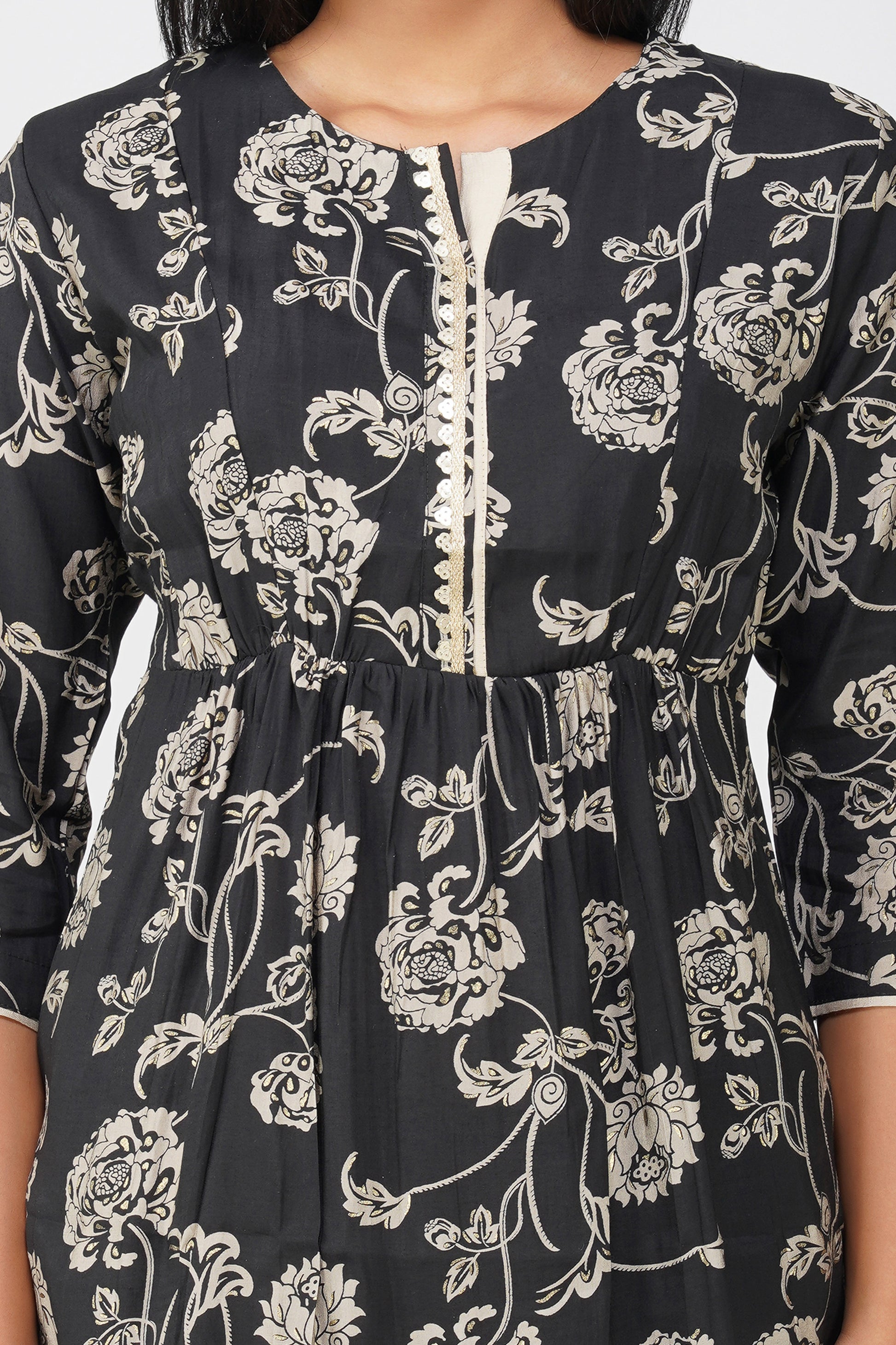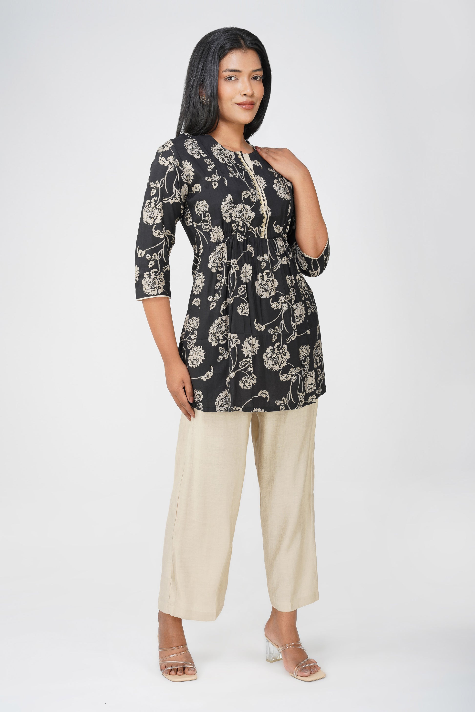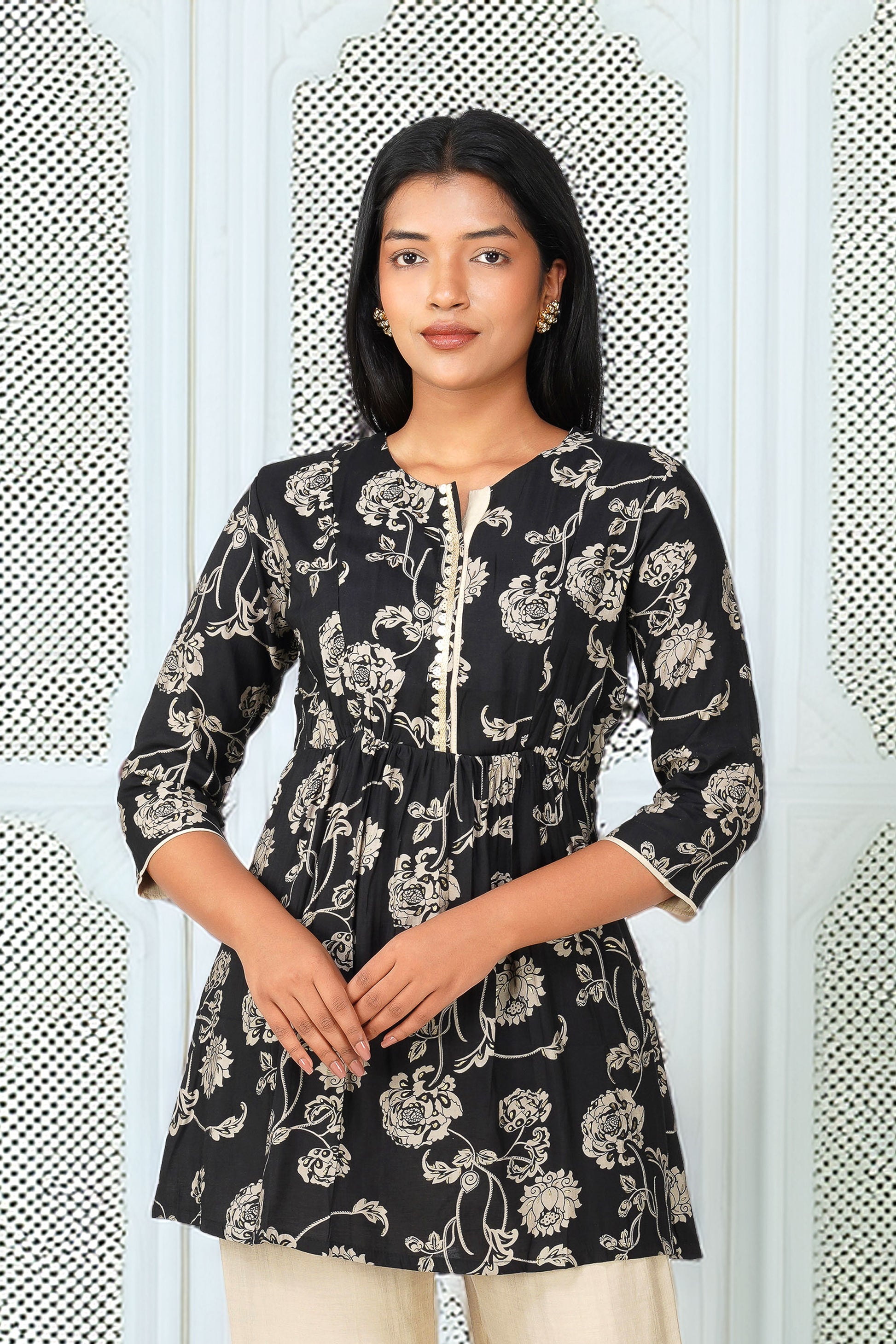 ✨ A floral-printed ethnic tunic in a flattering peplum style, enhanced with delicate gold sequin work on the placket. An easy pick for your everyday festive vibe!
