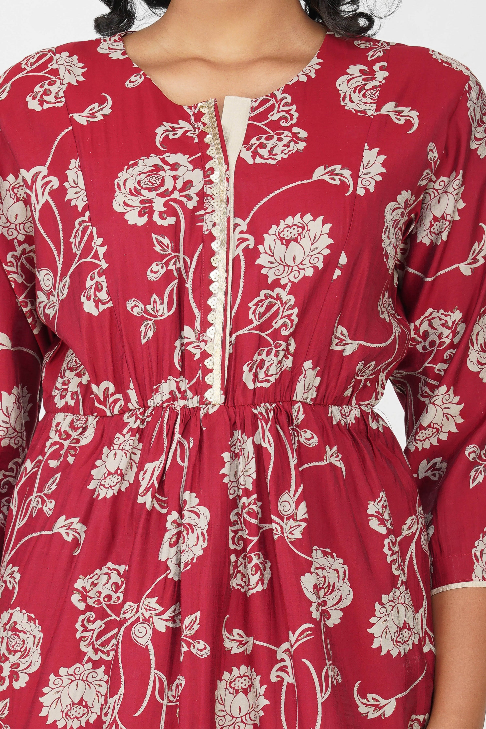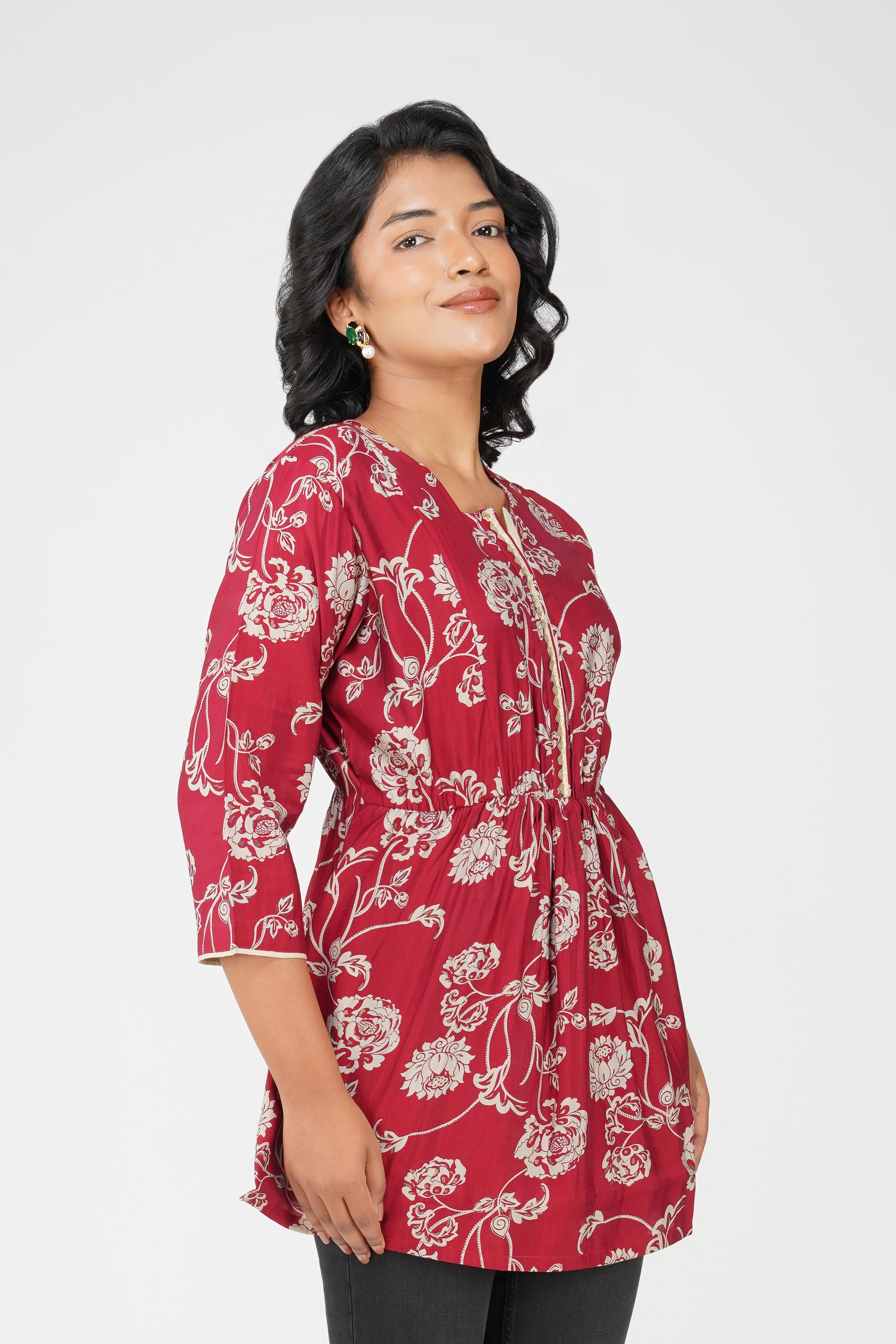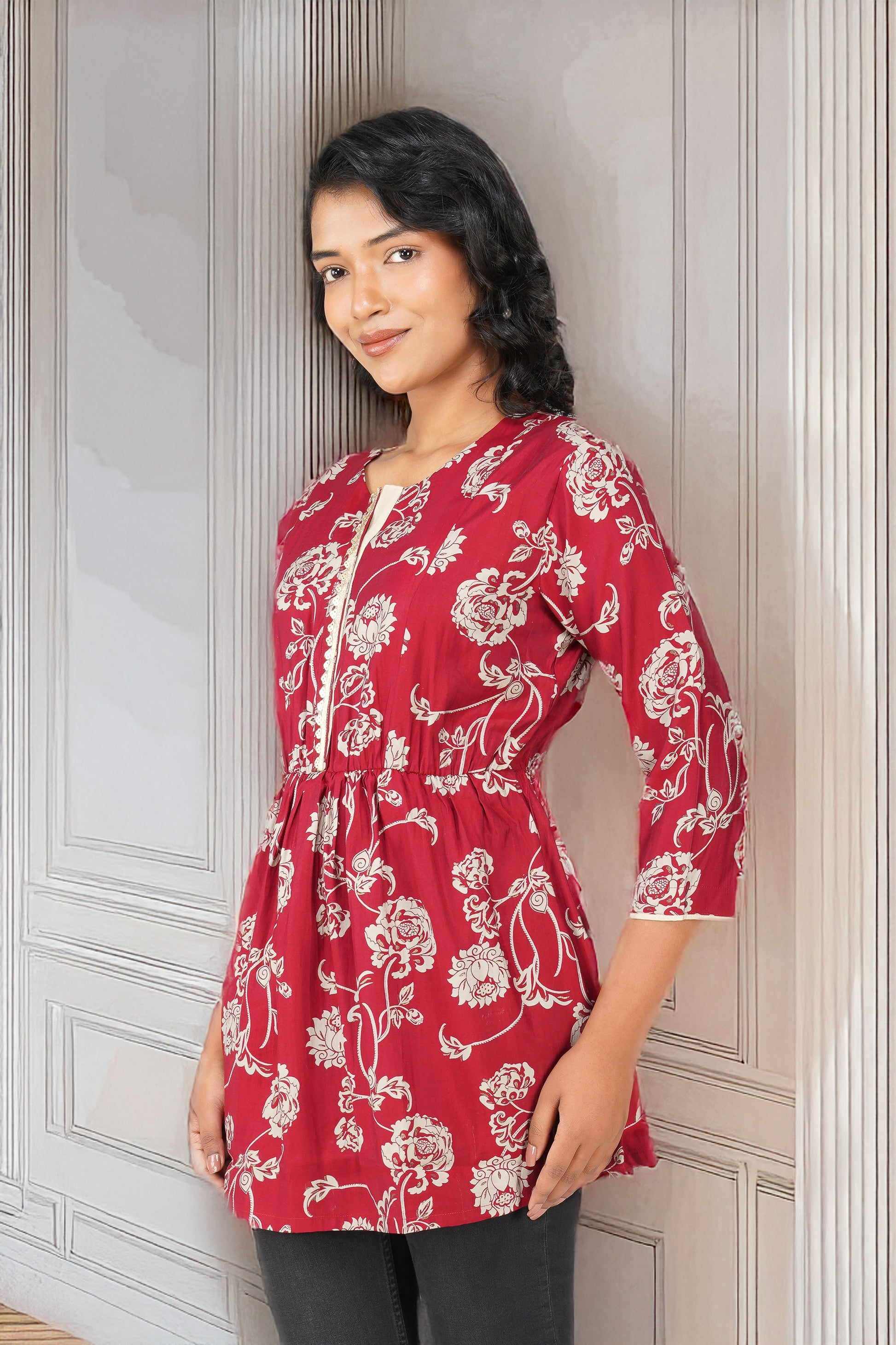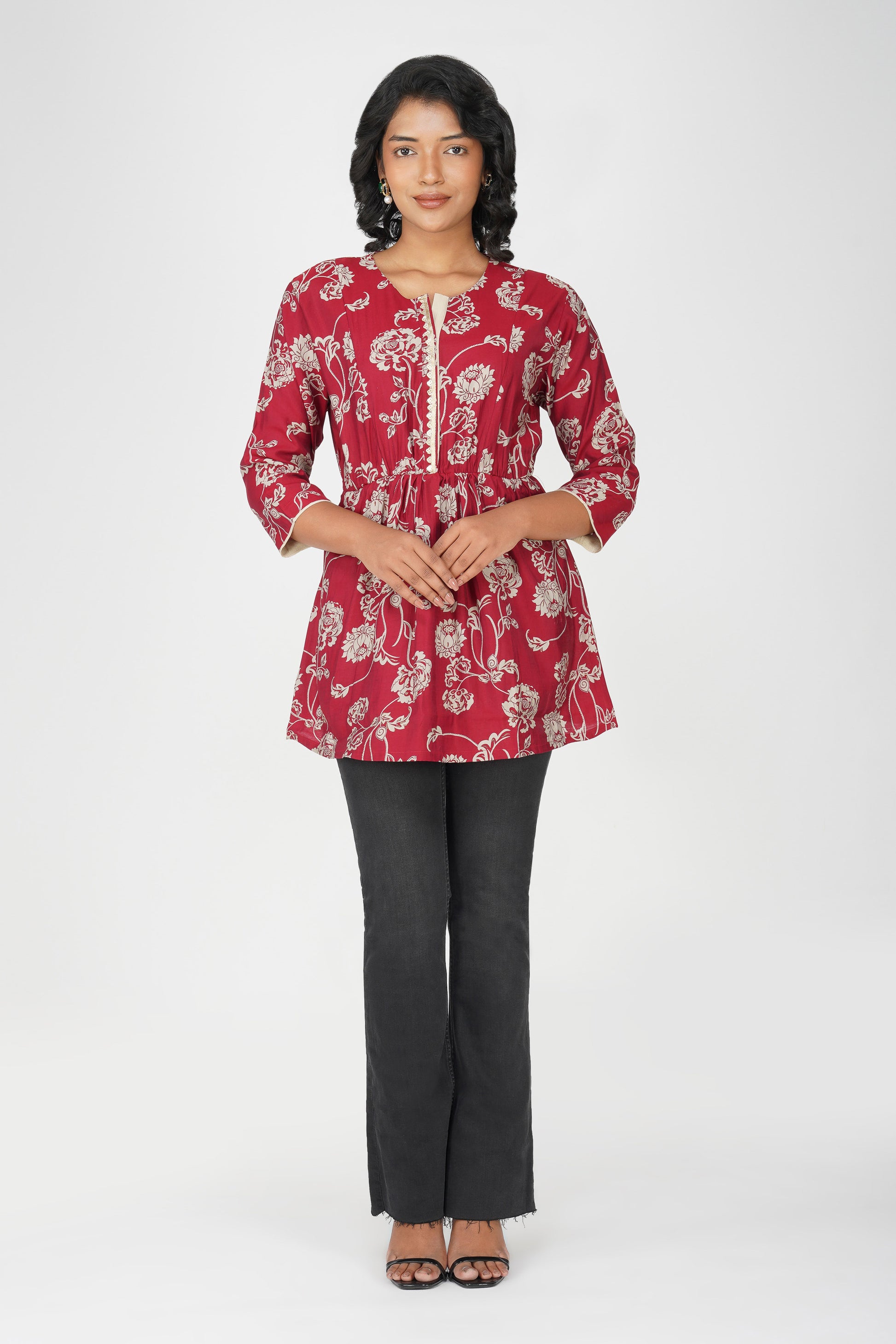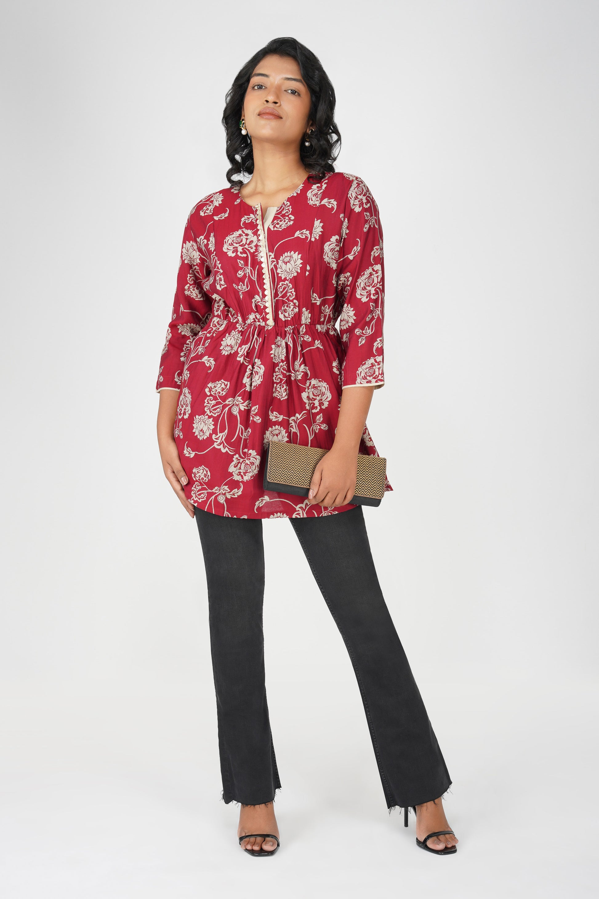 ✨ A floral-printed ethnic tunic / short kurta in a flattering peplum style, enhanced with delicate gold sequin work on the placket. An easy pick for your everyday festive vibe!