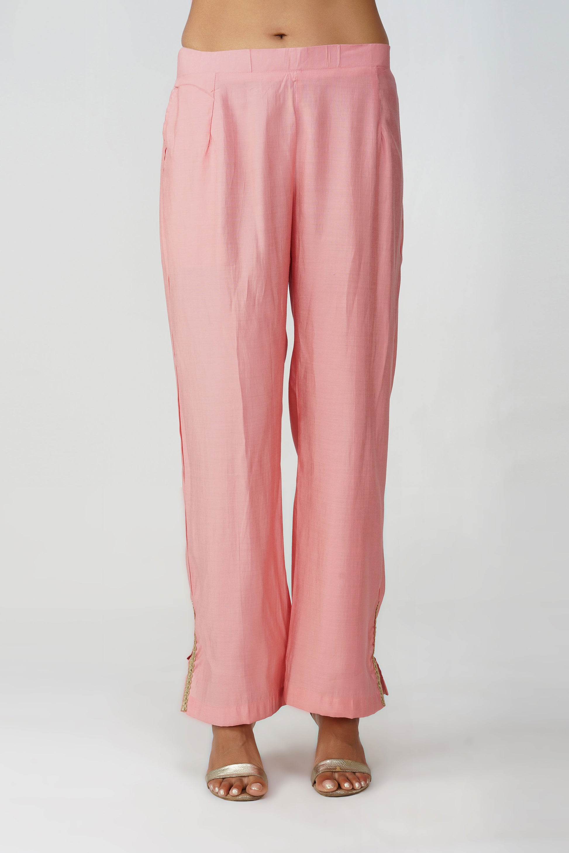 The coordinated solid palazzos come in a matching rose pink hue with gold-trimmed slits — comfy, graceful, and effortlessly glam 🍧