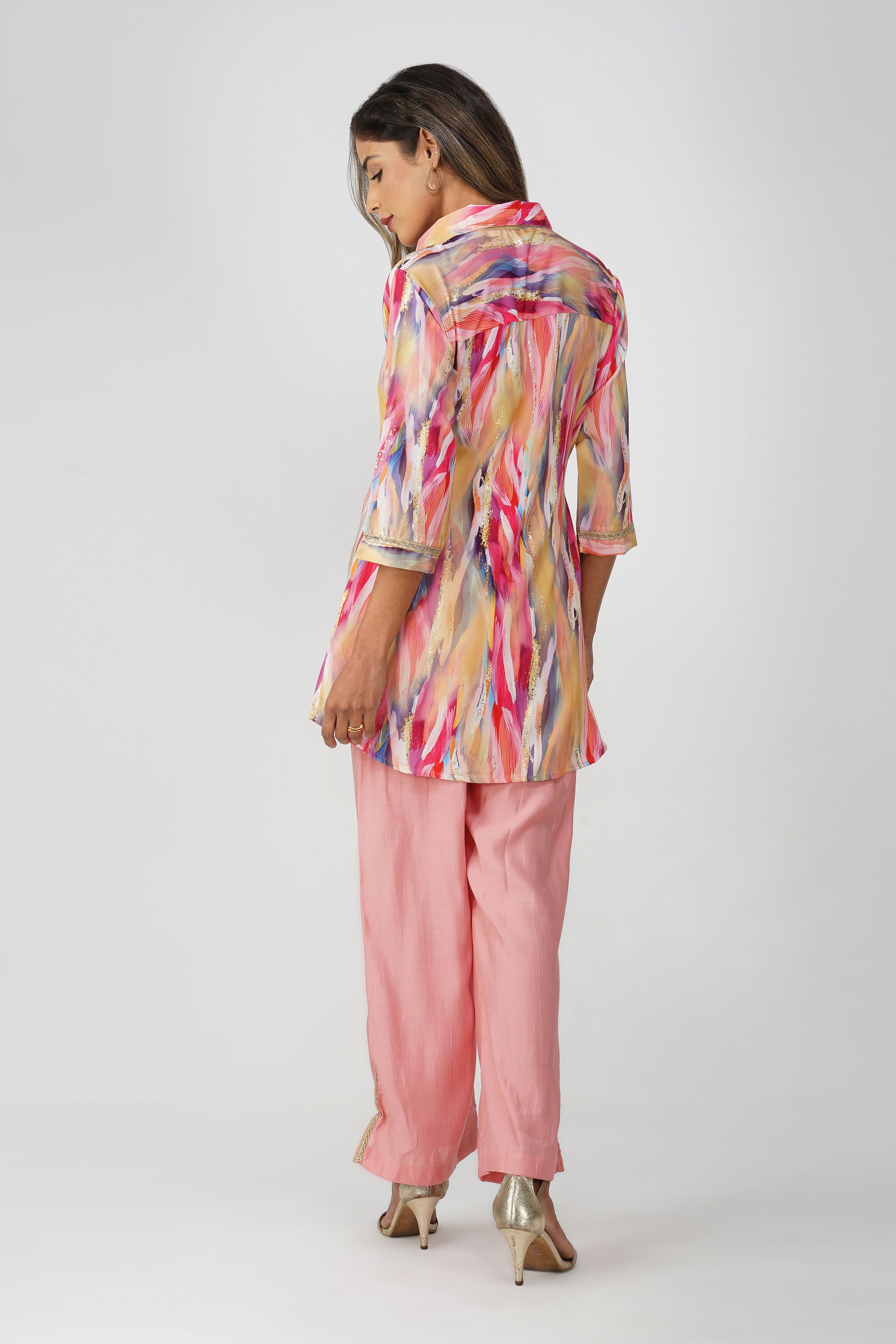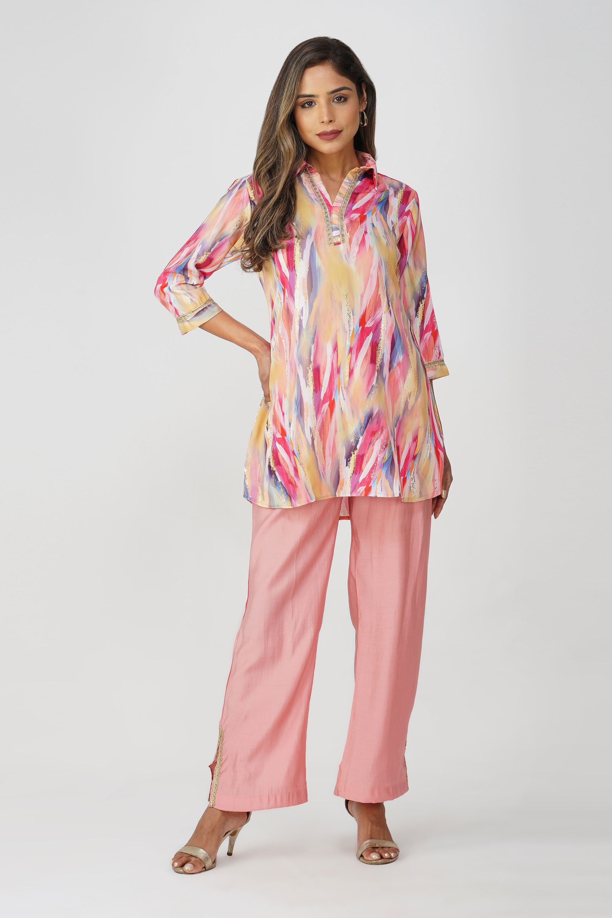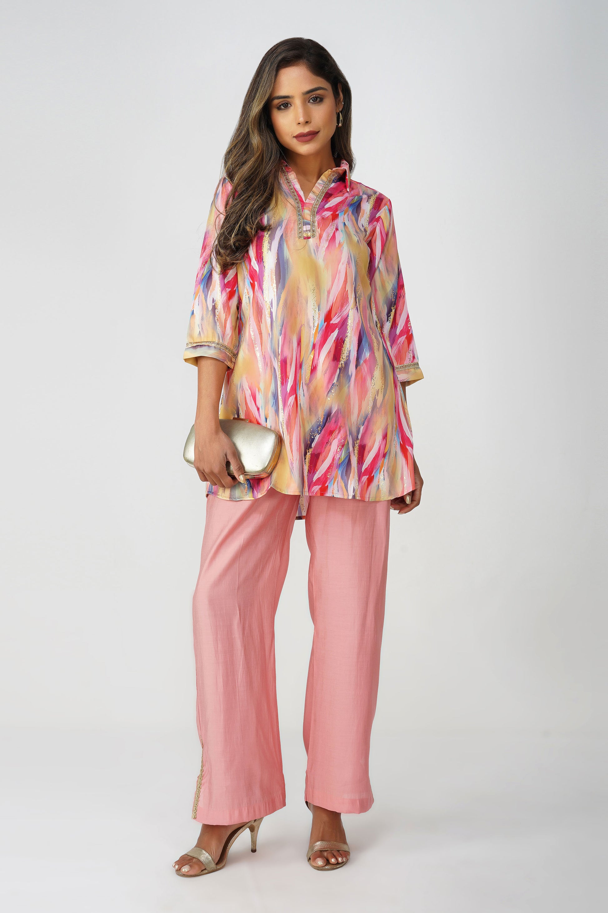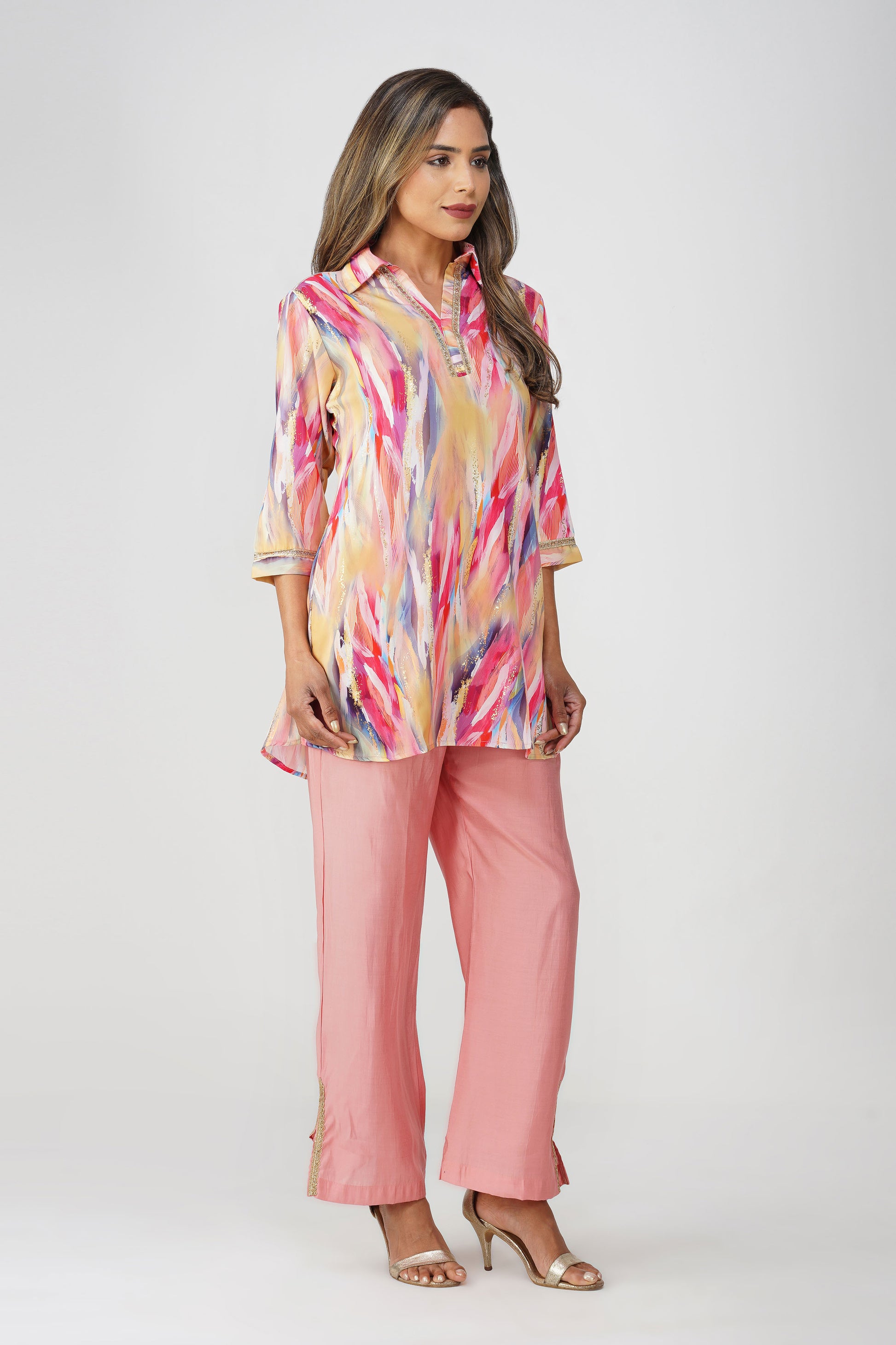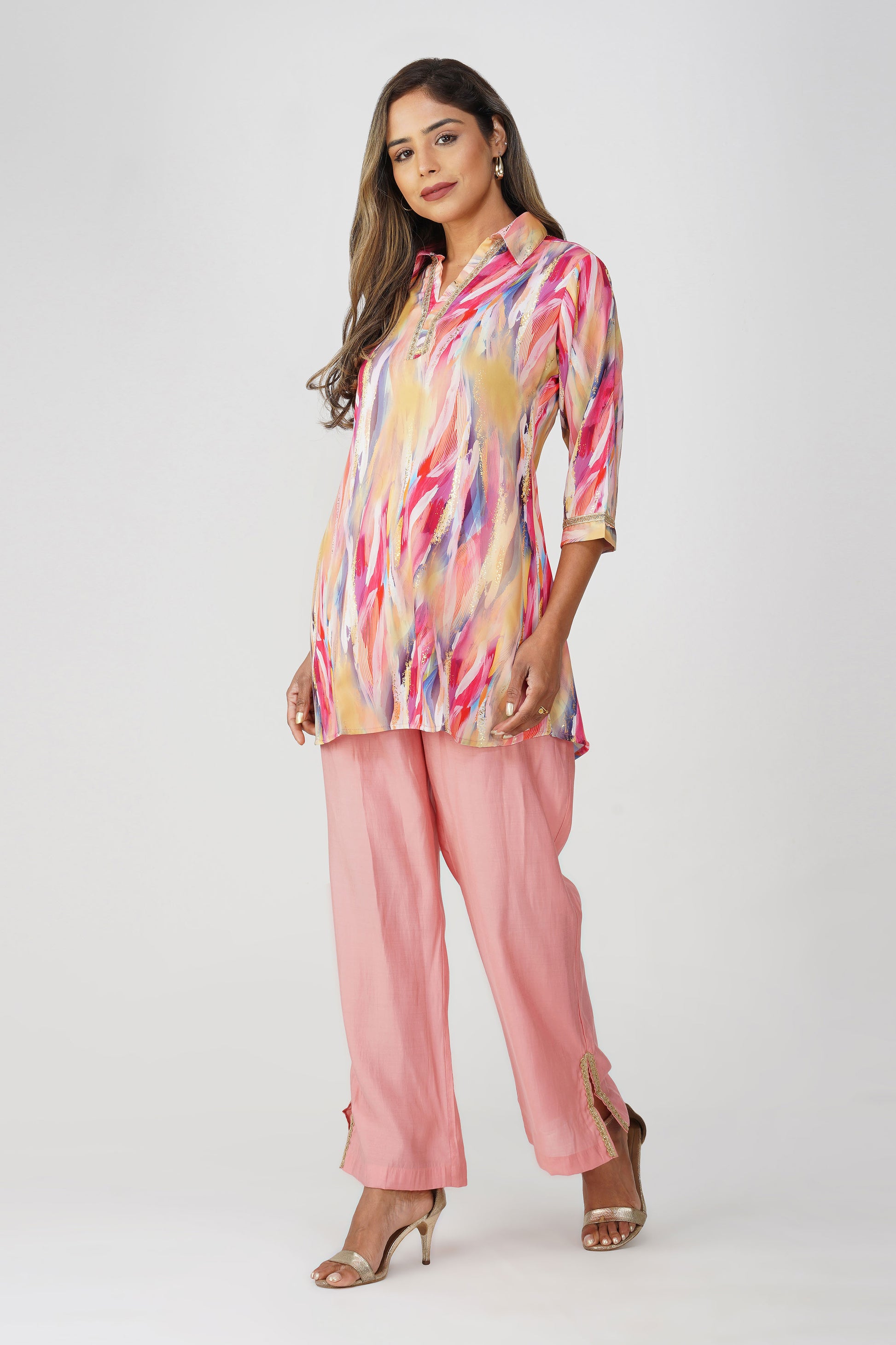 Color: Rose pink with multicolour abstract print & matching pants 🌺