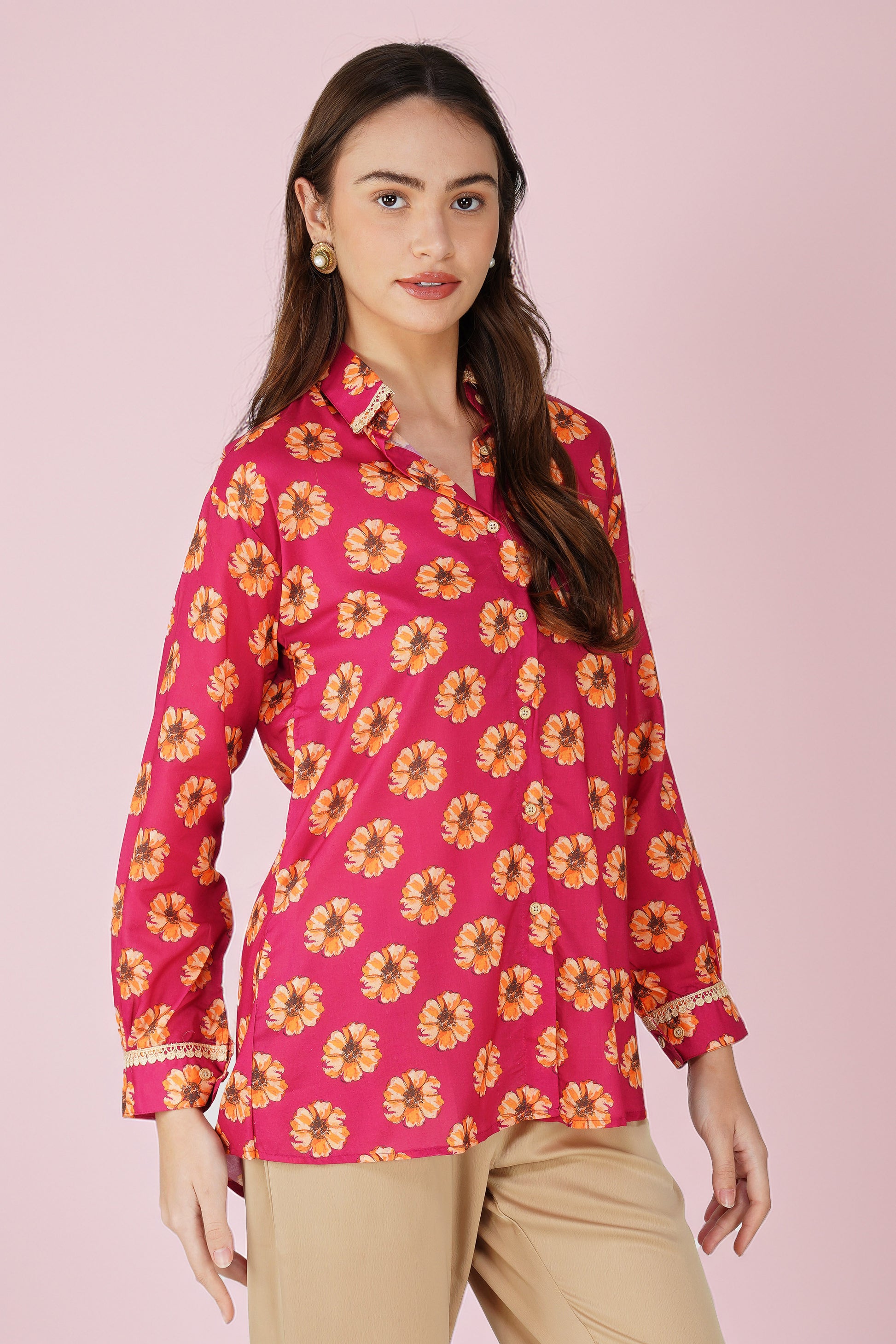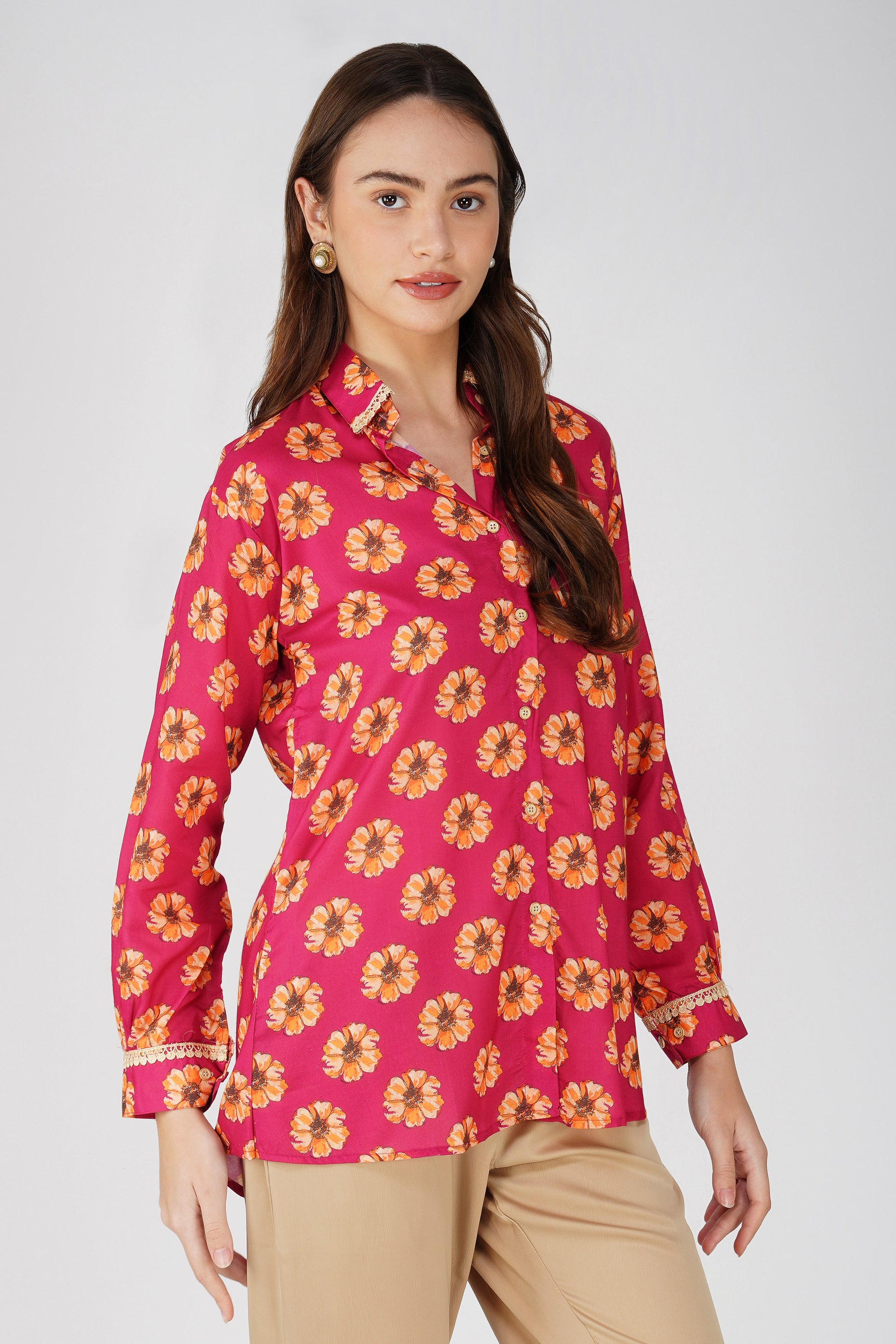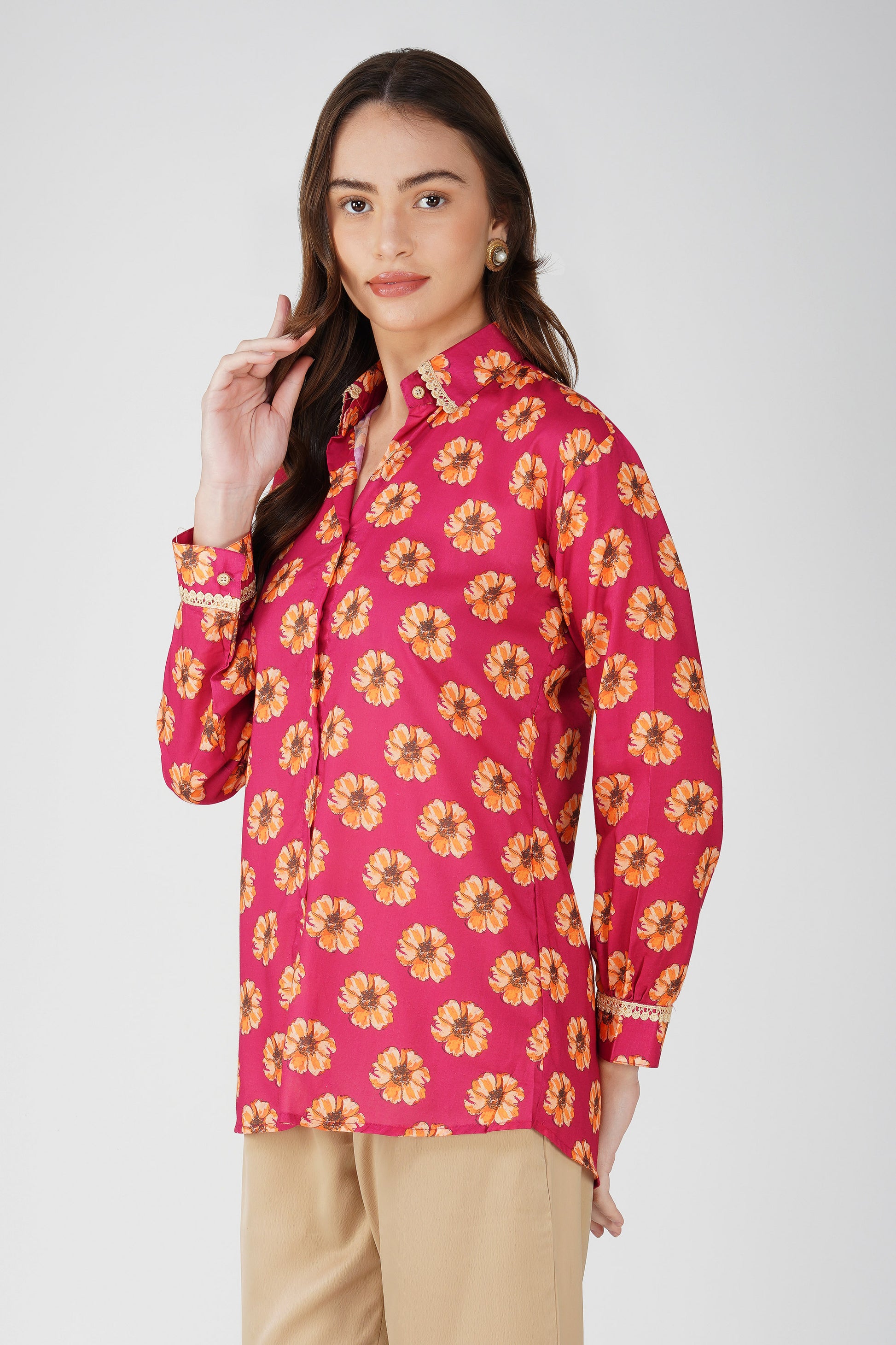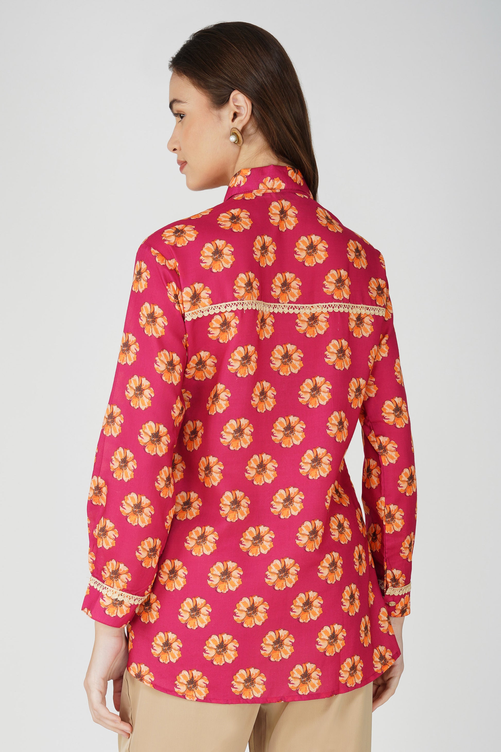 Phool Bright Flowers Shirt with Lace Detail - Pink