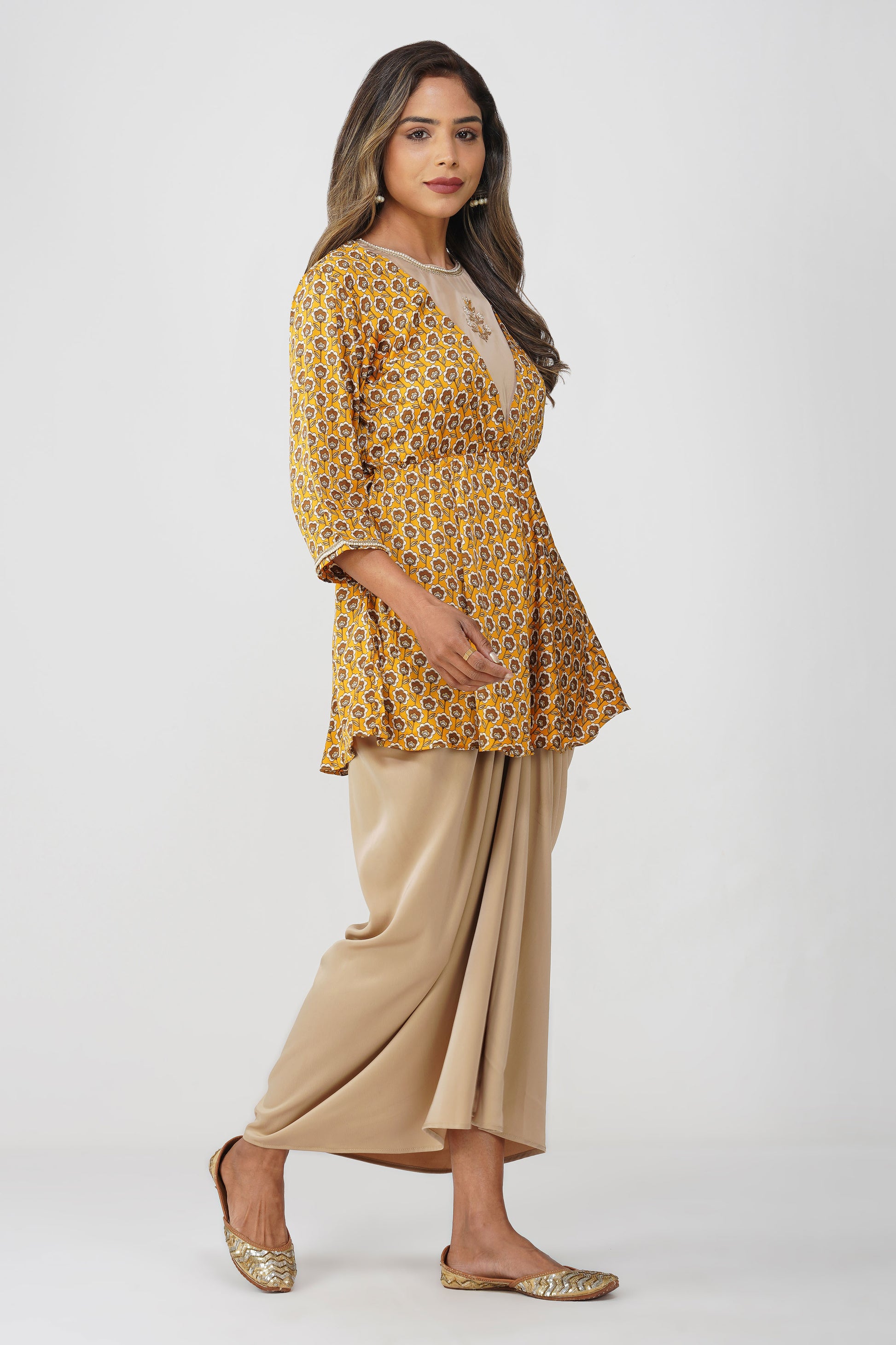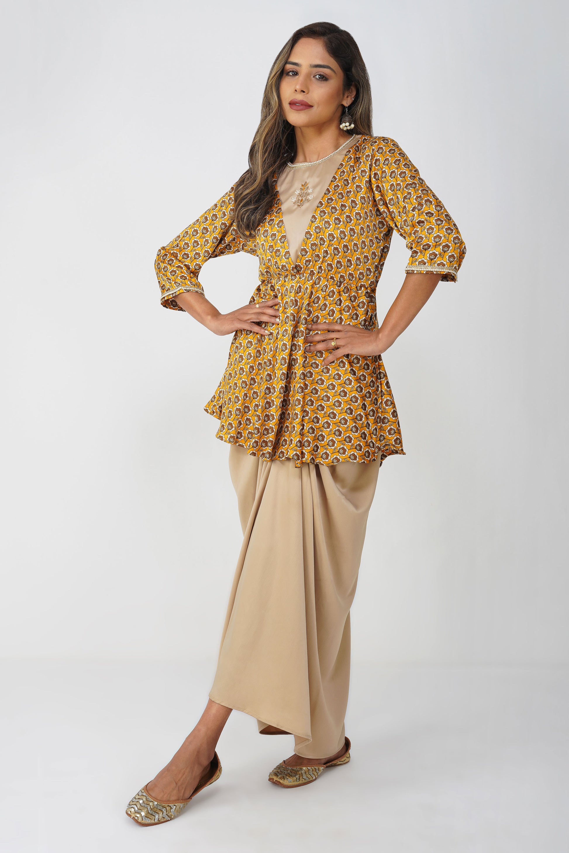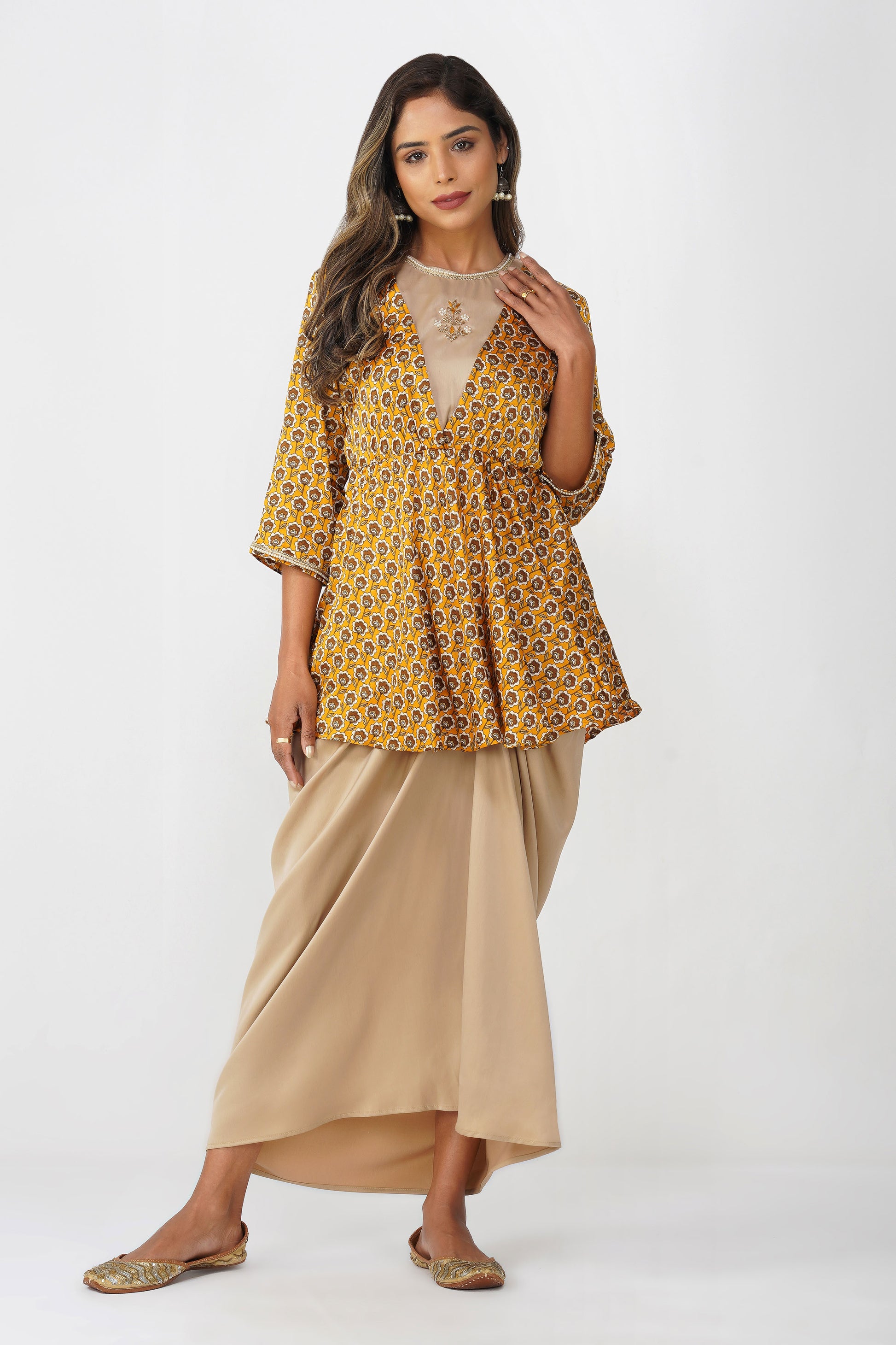 Color: Mustard top with beige velvet yoke and beige satin drape skirt 🌼