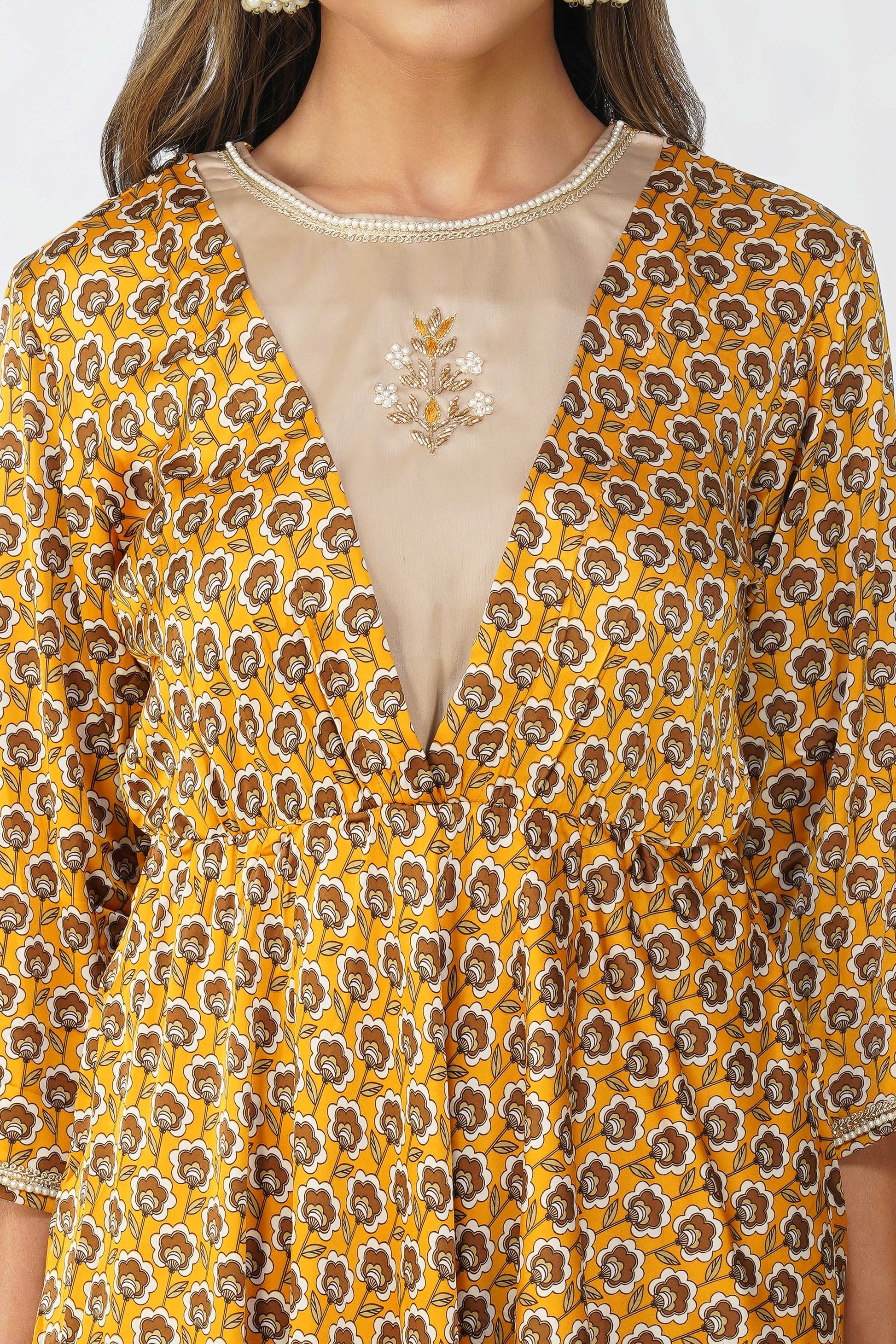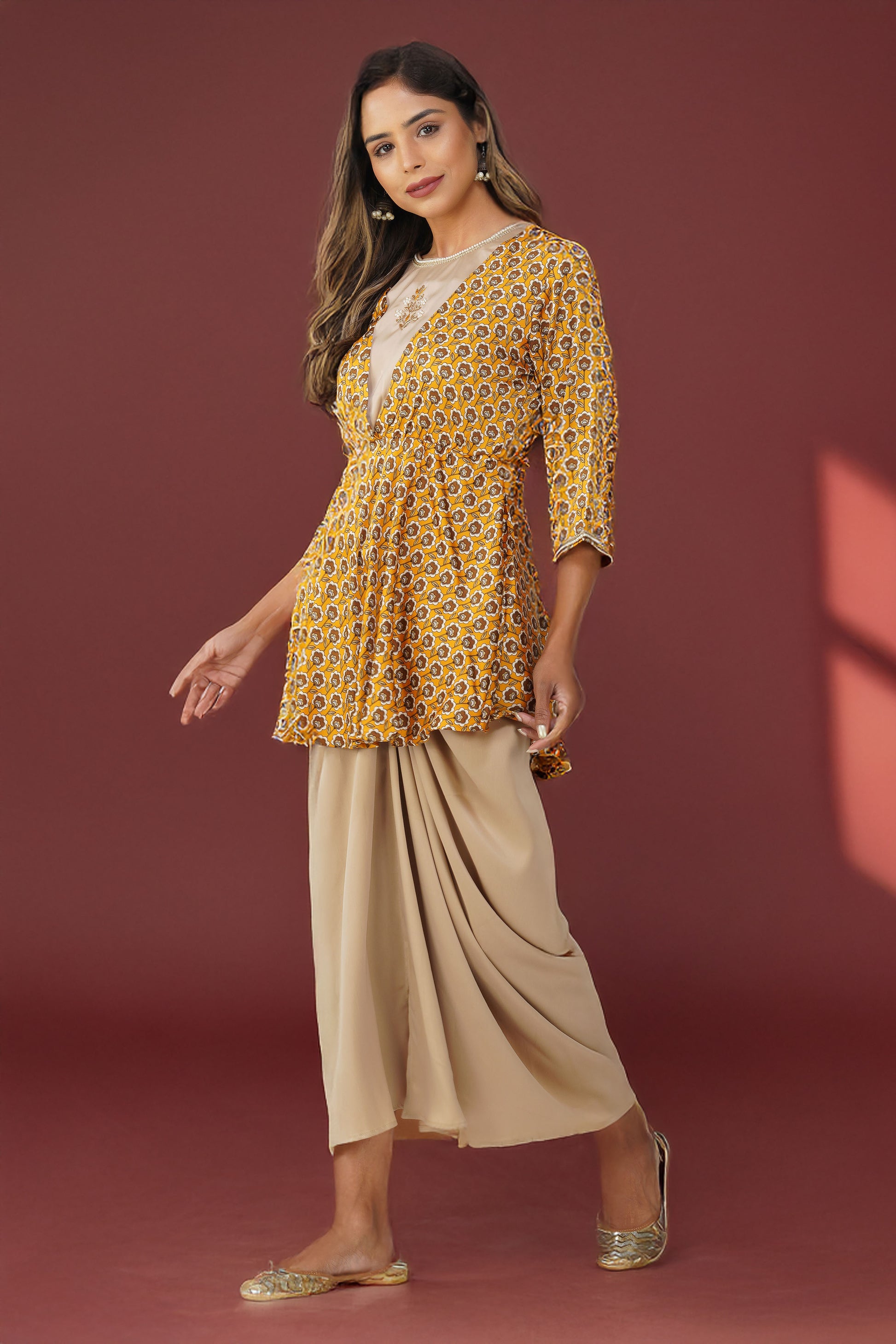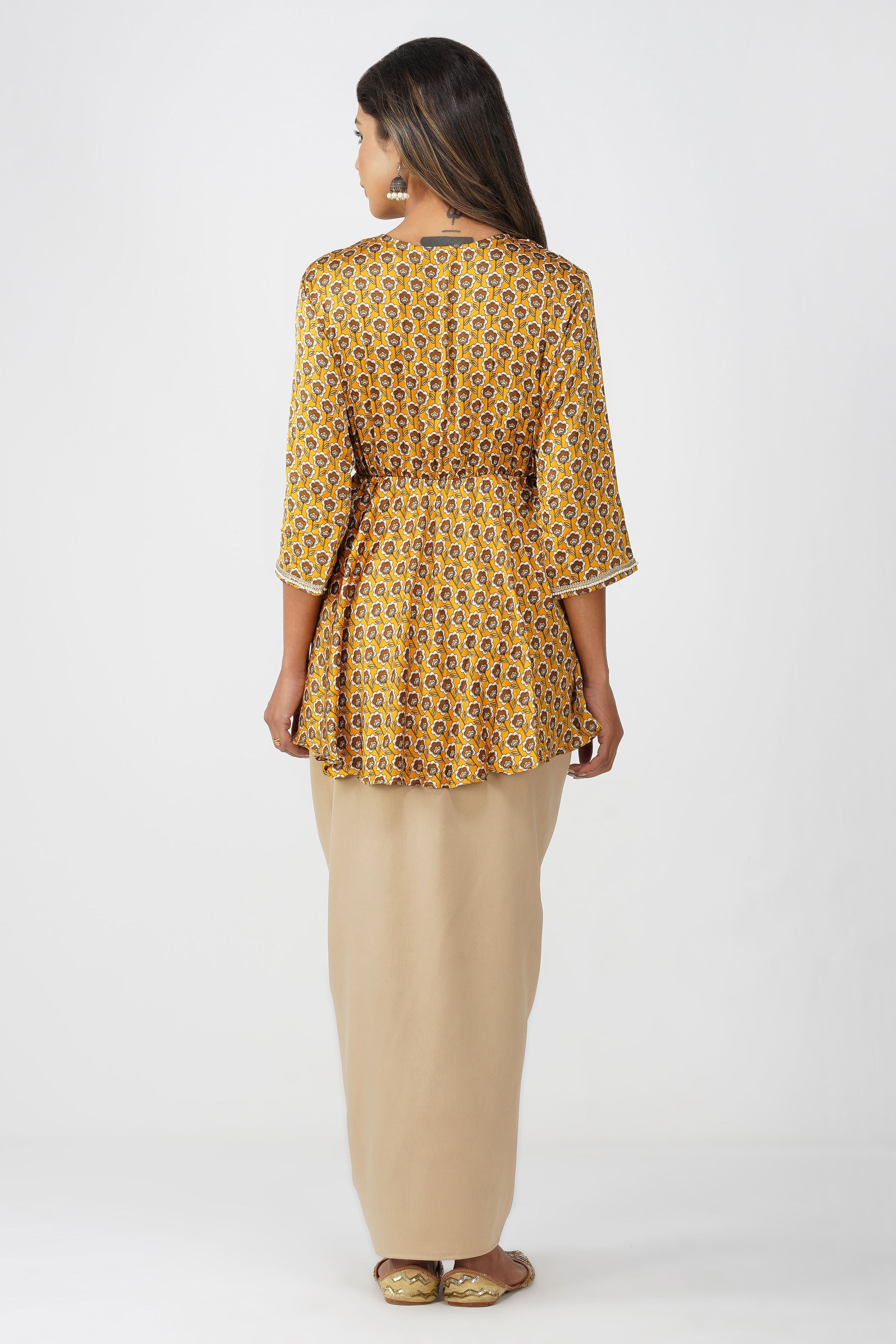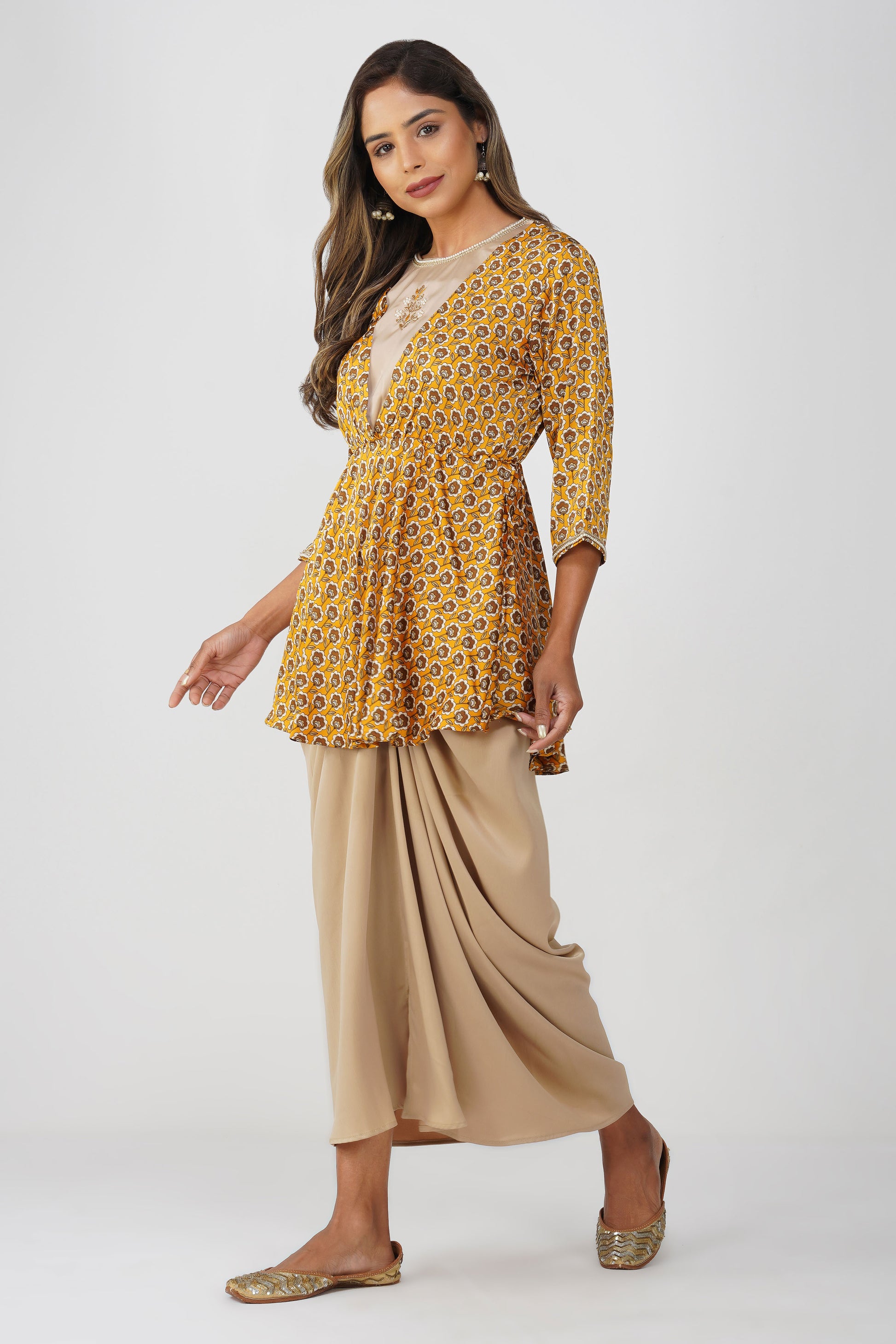 Color: Mustard top with beige velvet yoke and beige satin drape skirt 🌼