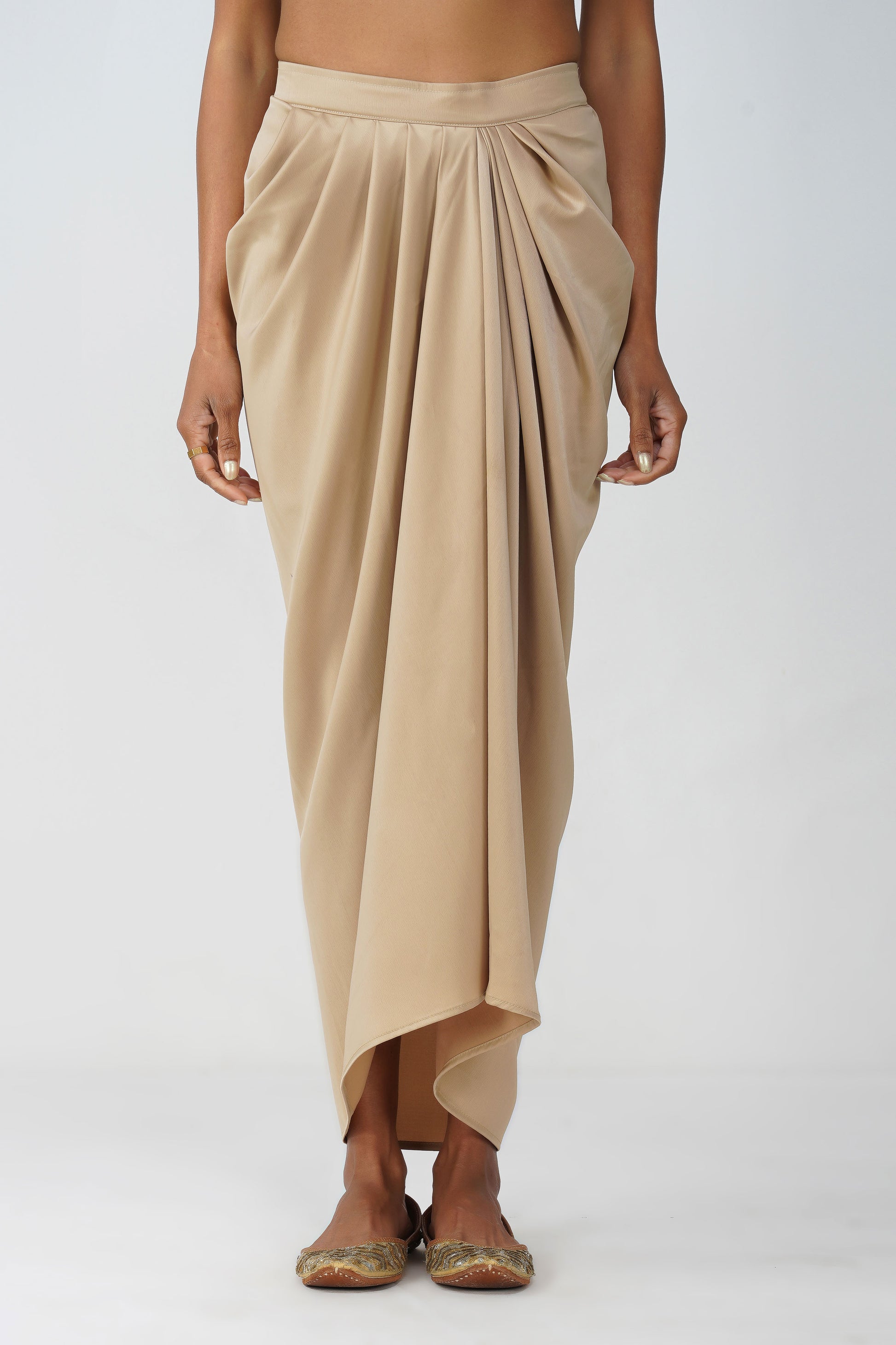 Paired with a beige satin drape skirt, this ensemble flows beautifully while keeping you ultra-comfortable for long festive hours. Whether it’s a haldi brunch, a Diwali dinner, or a family get-together, this look speaks festive charm with a modern twist 🌼