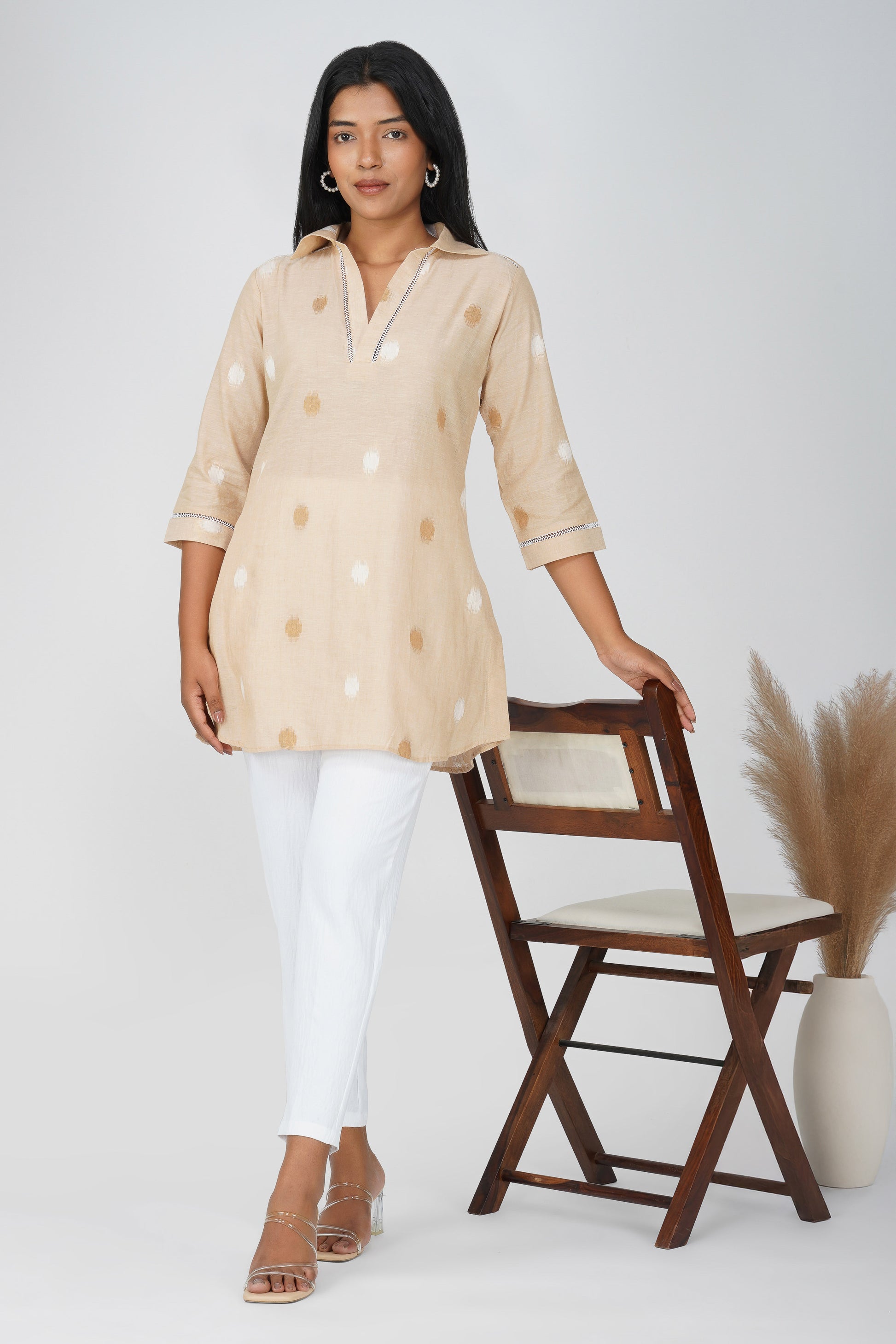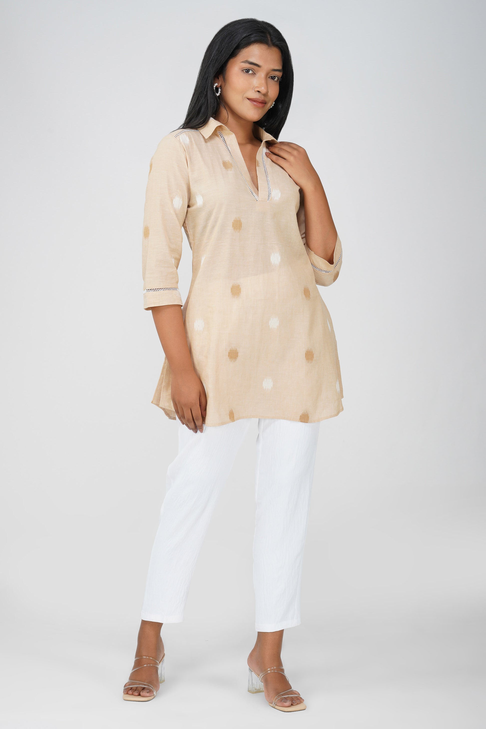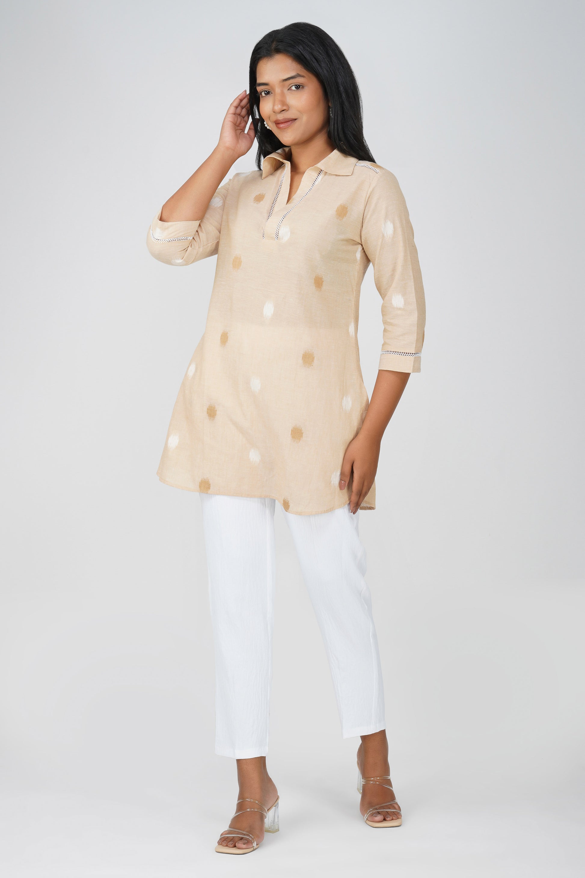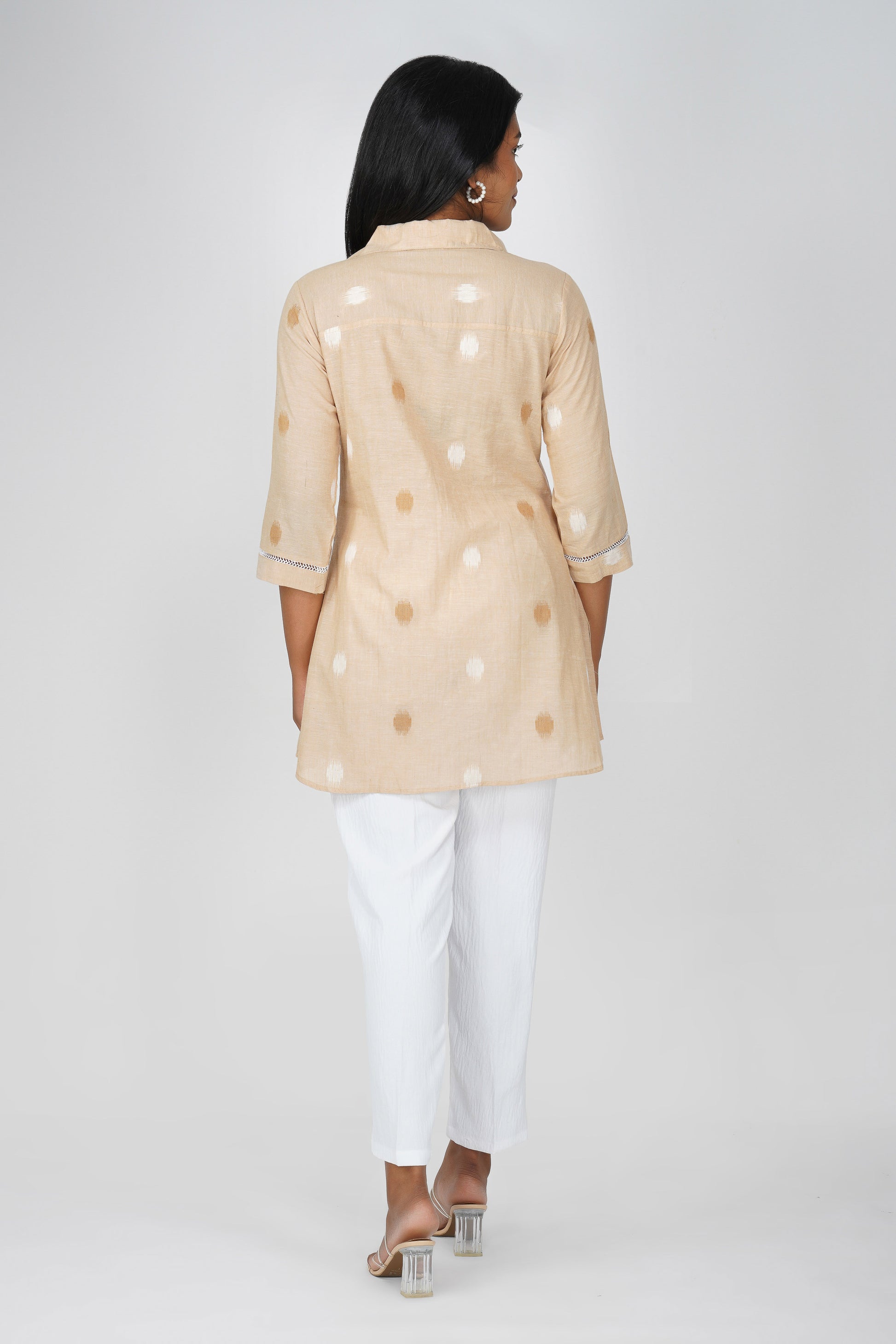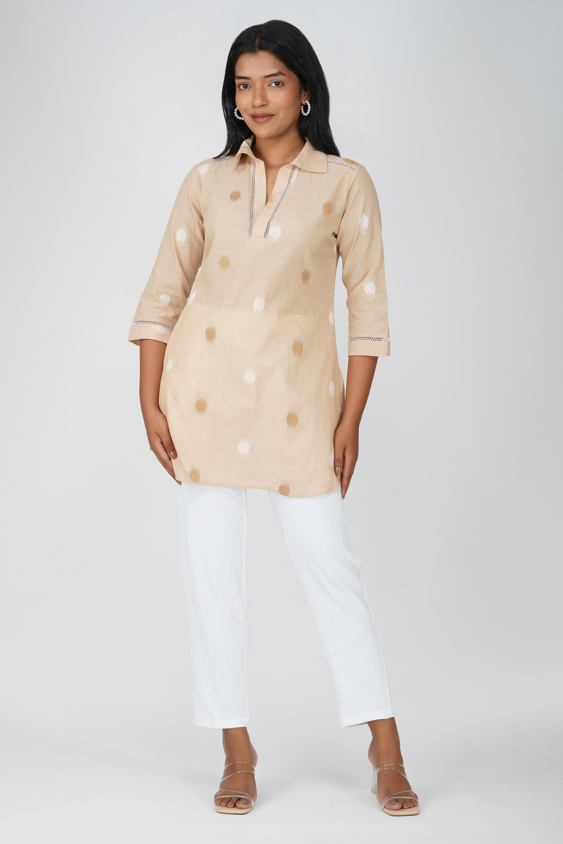 Khaki Buti Handloom Co-ord Set β Shirt Collar Tunic with White Pants