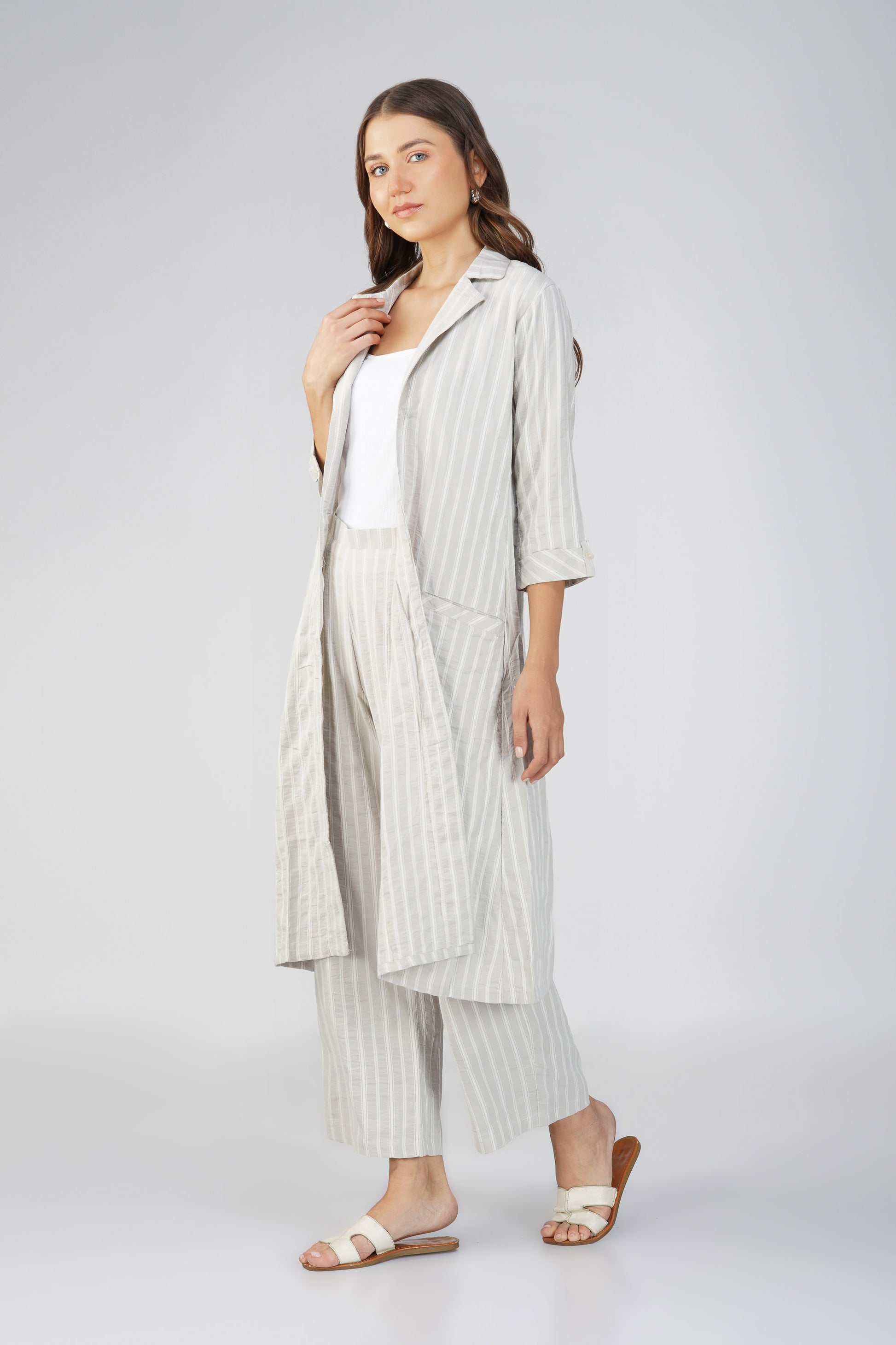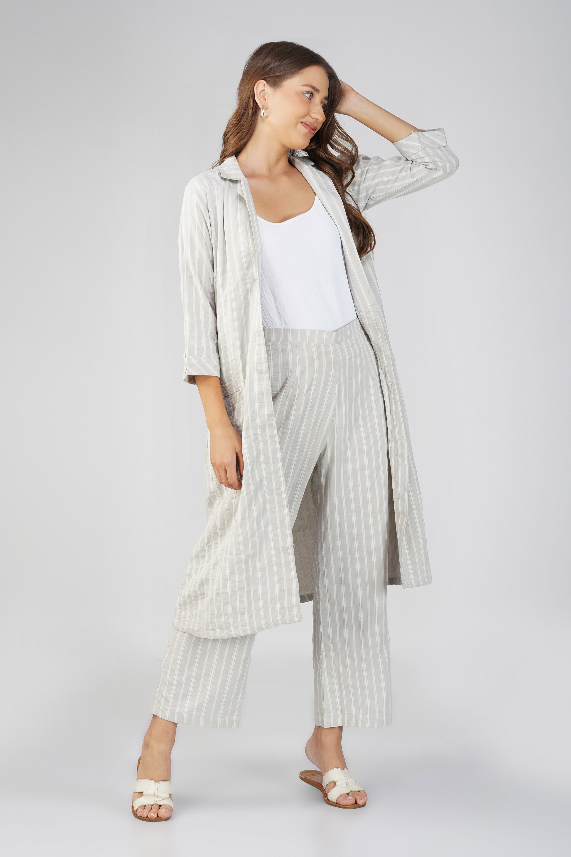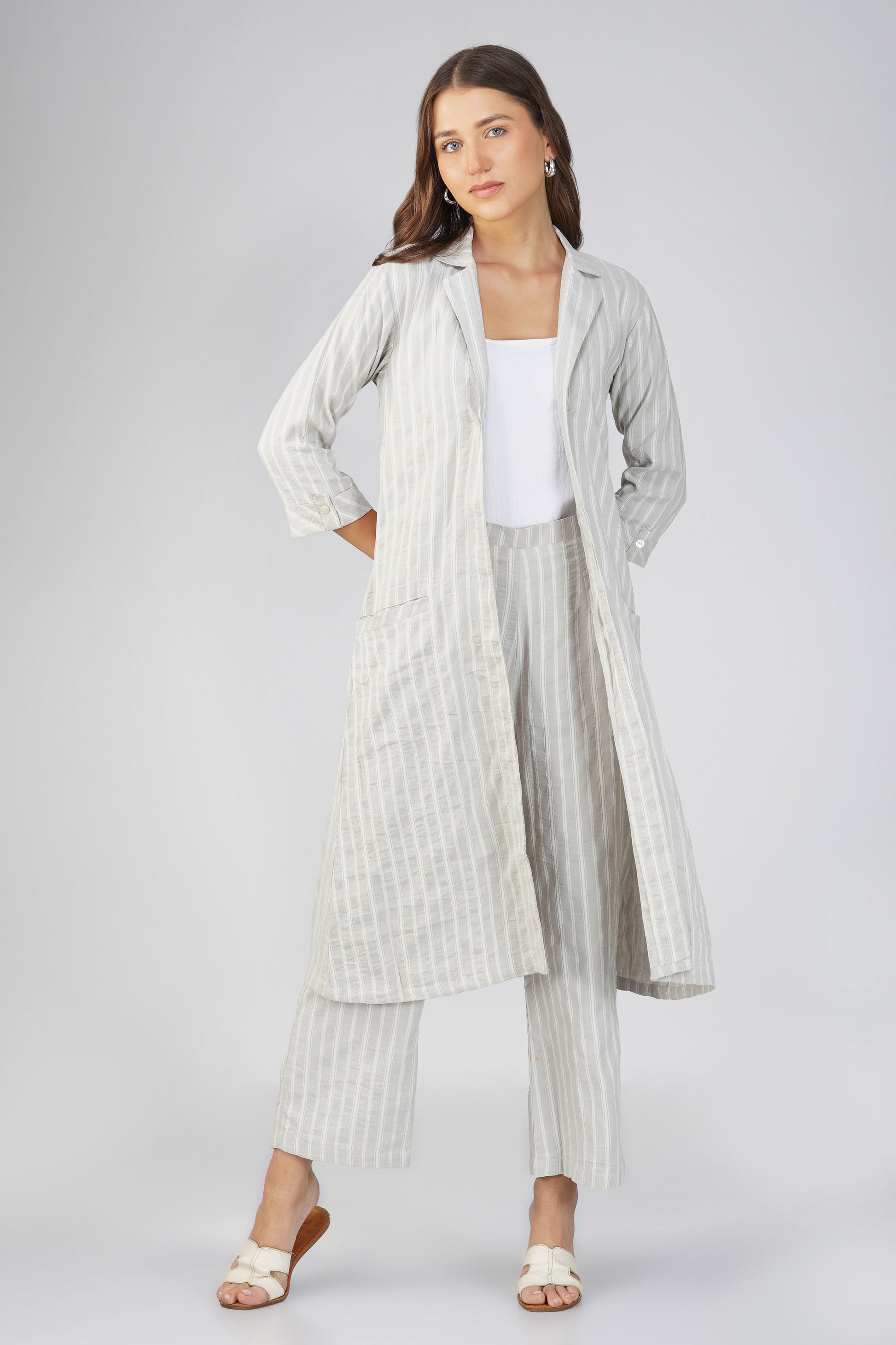 Raahi Light Grey Jacket Co-ord Set – 3-Piece with Spaghetti Top & Striped Flared Pants