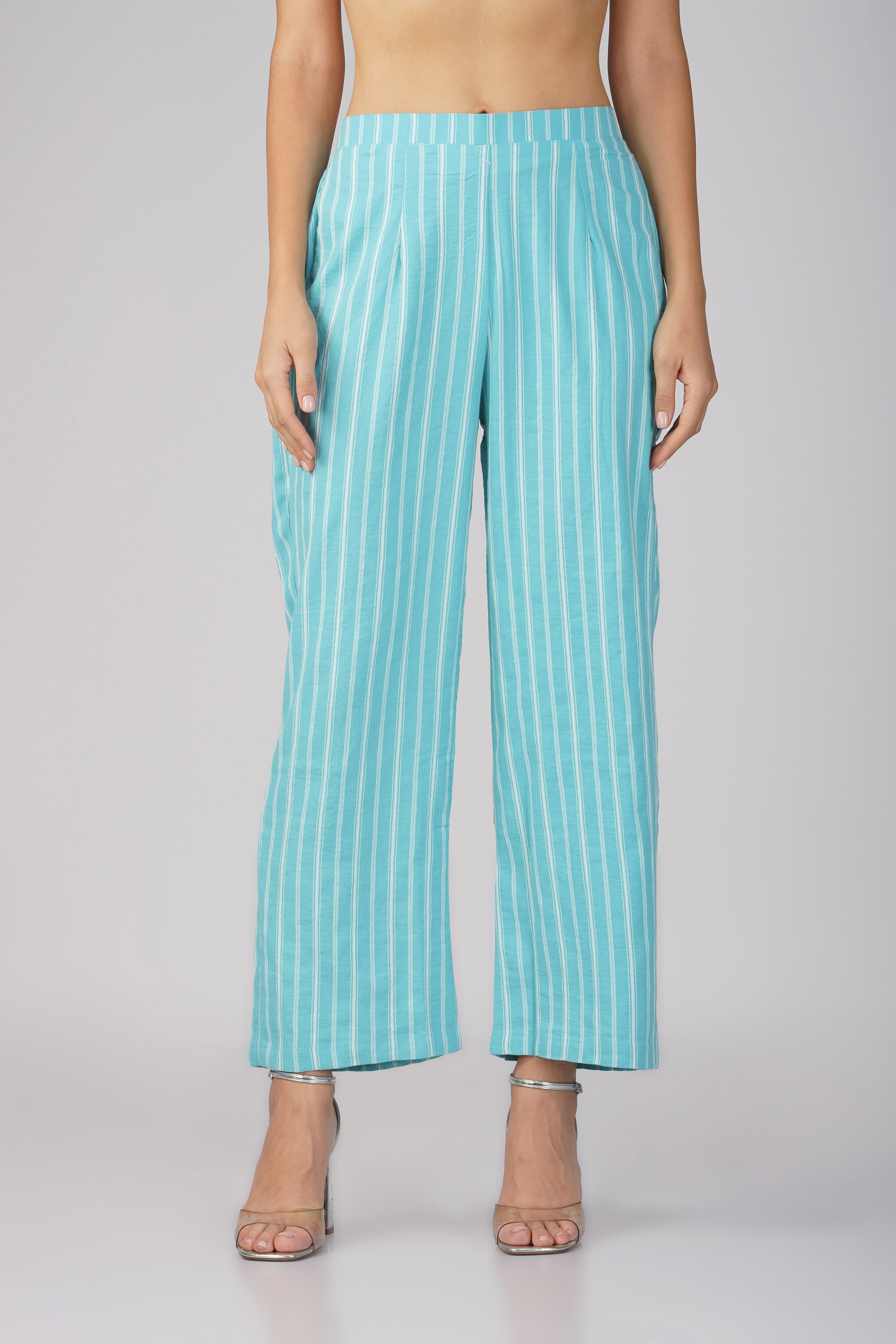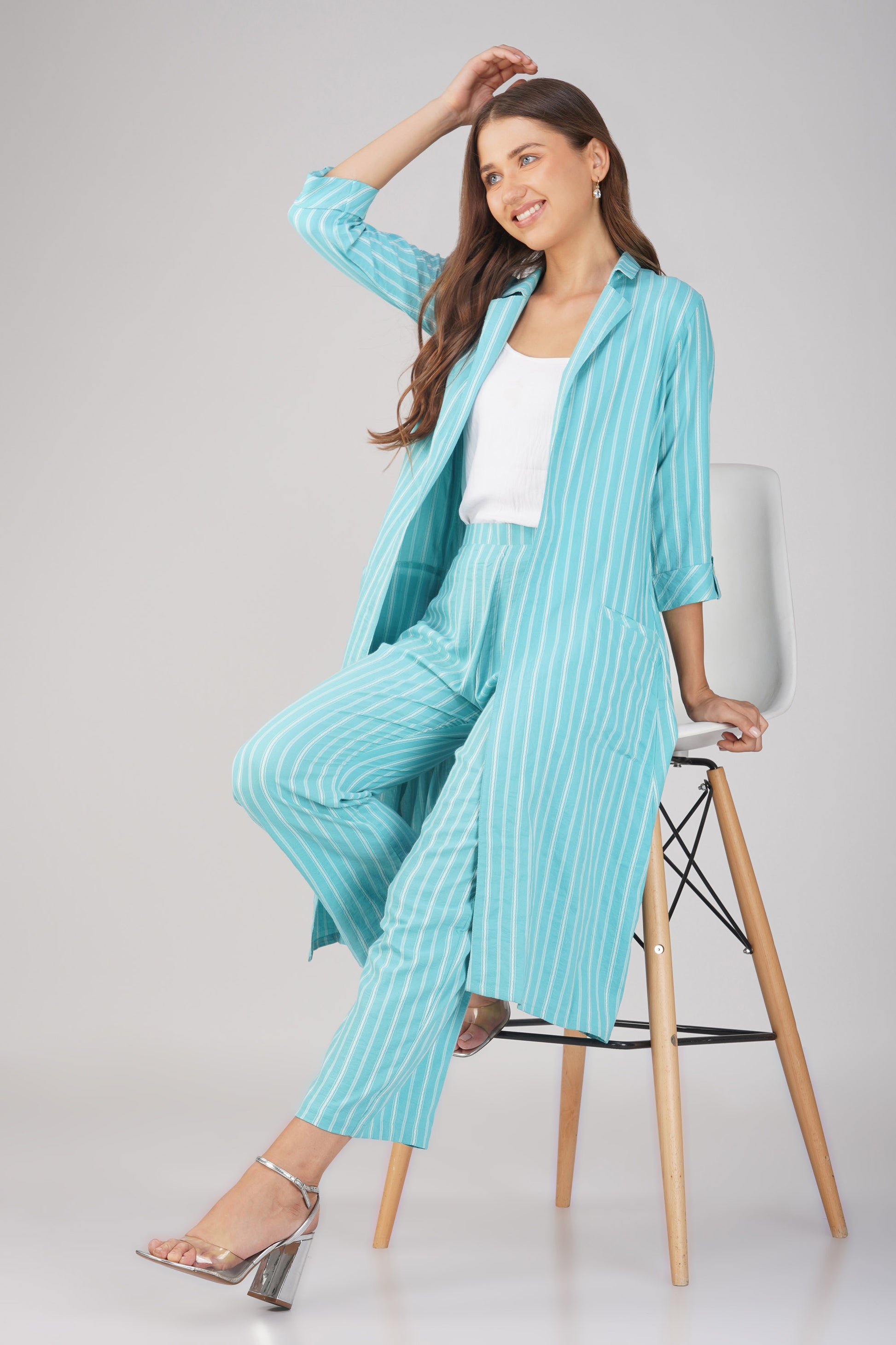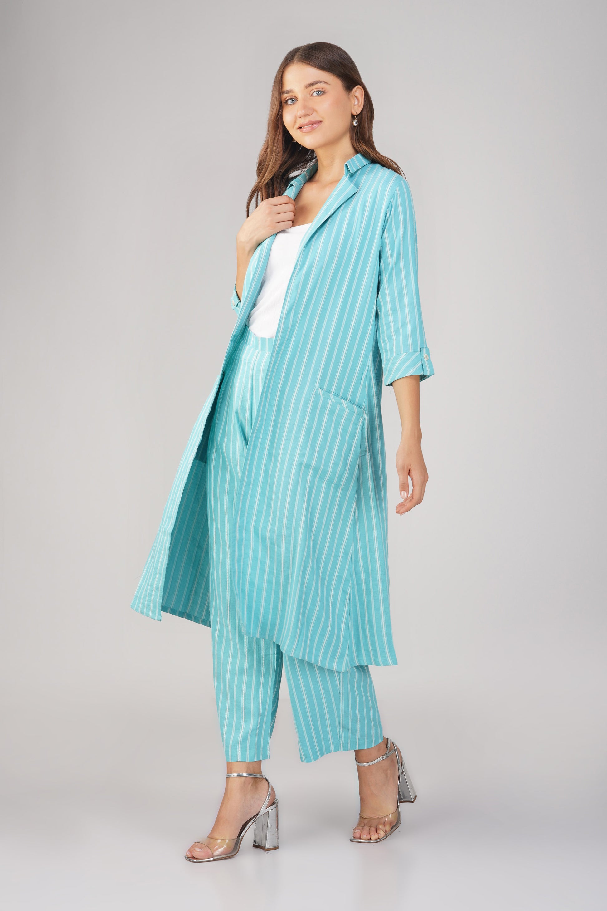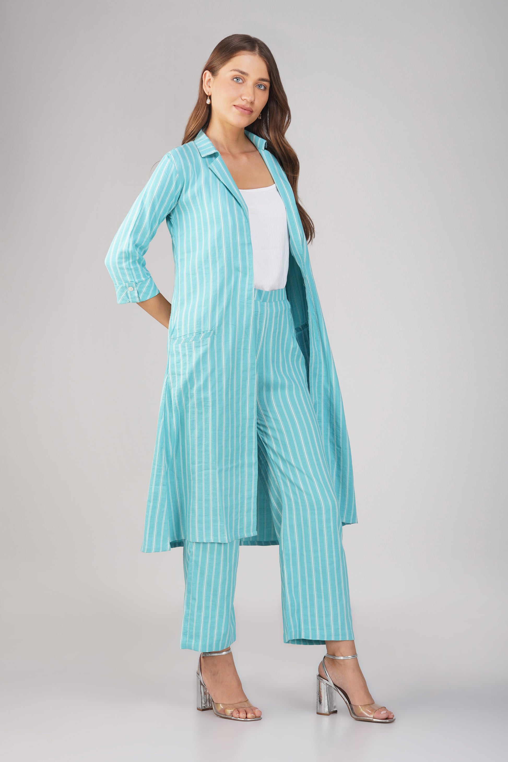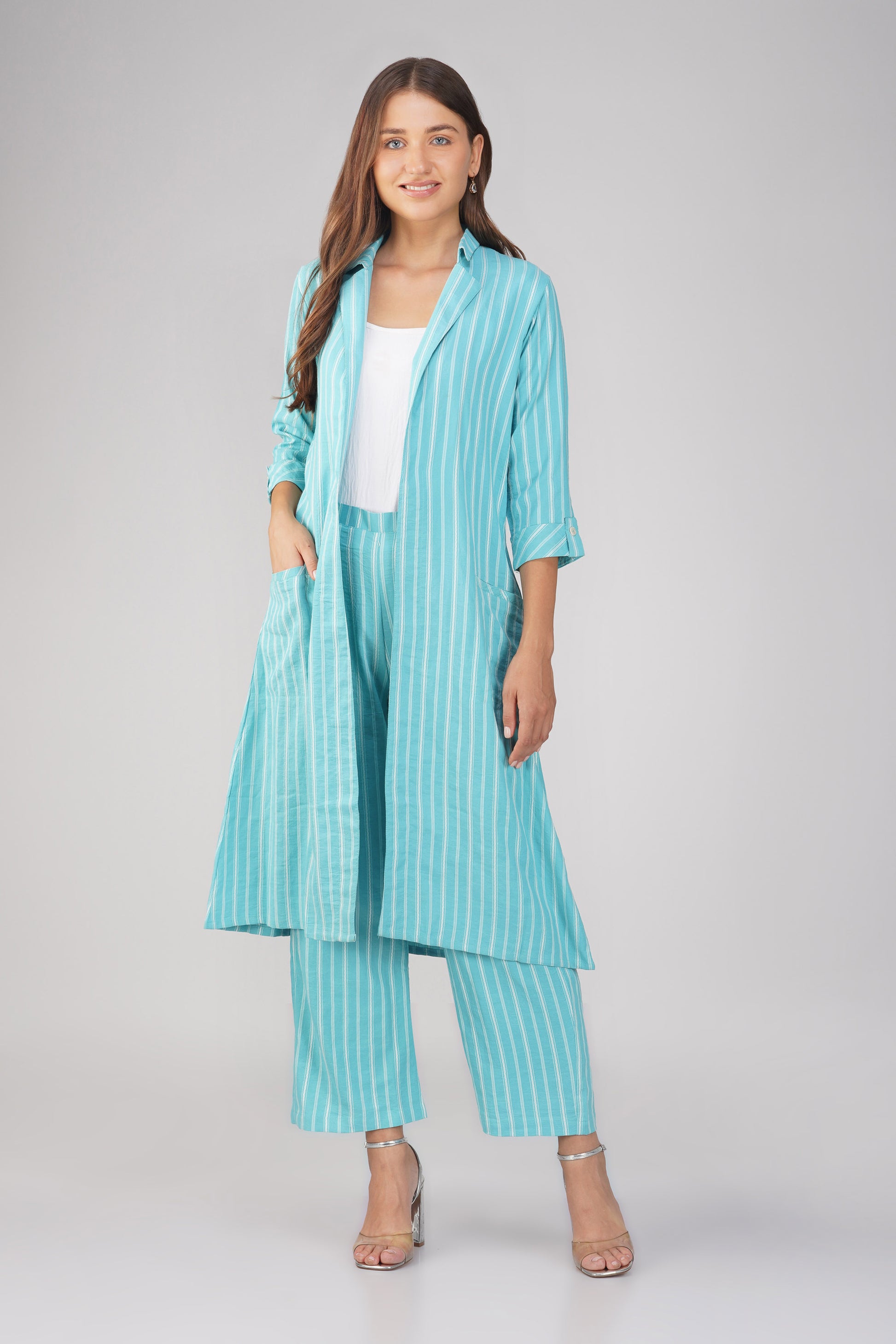Raahi Sea Blue Jacket Co-ord Set – 3-Piece with Spaghetti Top & Striped Flared Pants