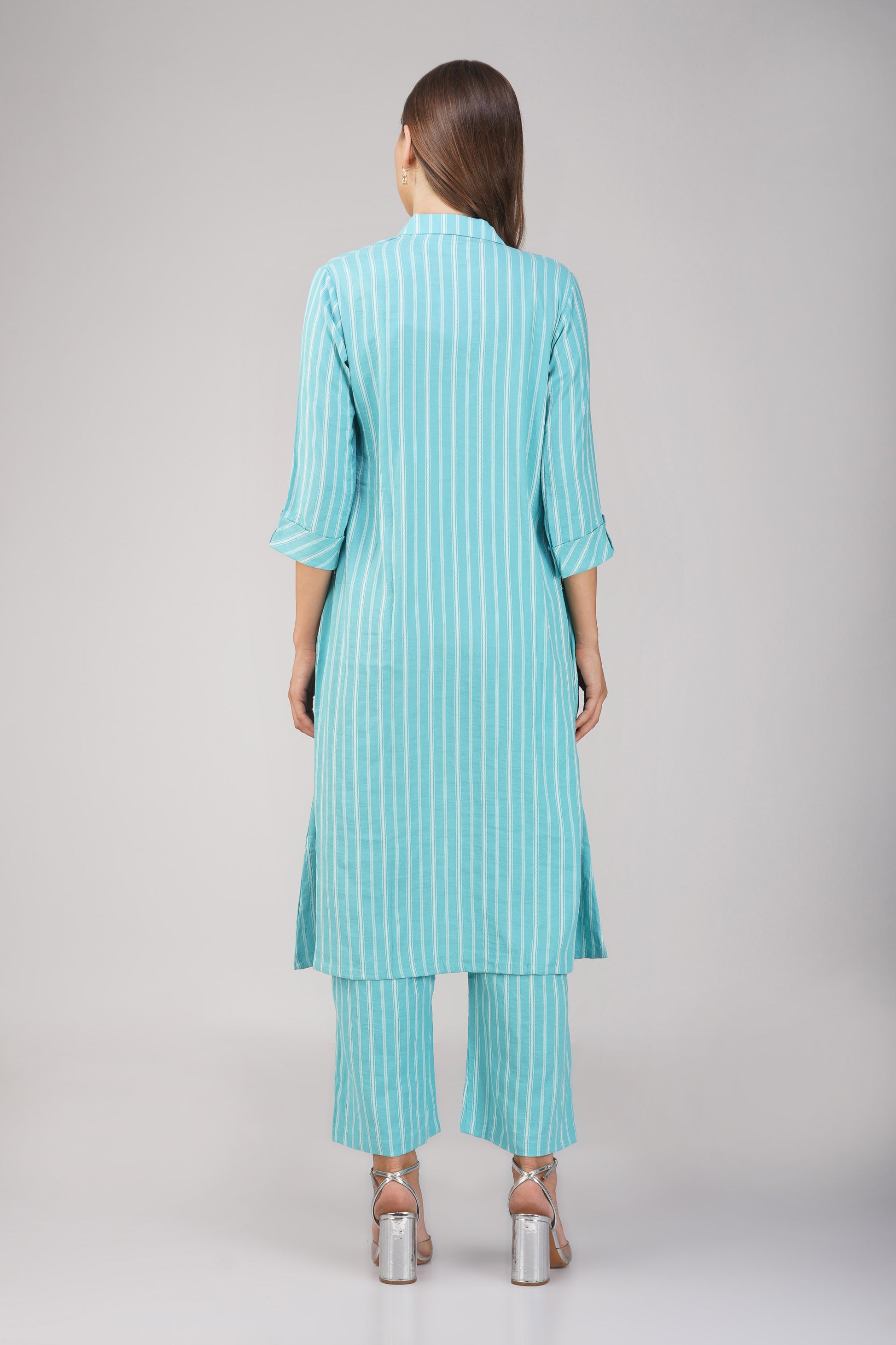 Let the breeze dress you 🌊 — Raahi in Sea Blue is light, relaxed, and quietly striking. This 3-piece co-ord features a self-striped longline jacket with subtle texture and handy pockets, layered over a white spaghetti top, and paired with striped flared pants. It’s the kind of outfit that feels like a vacation, even on a workday.