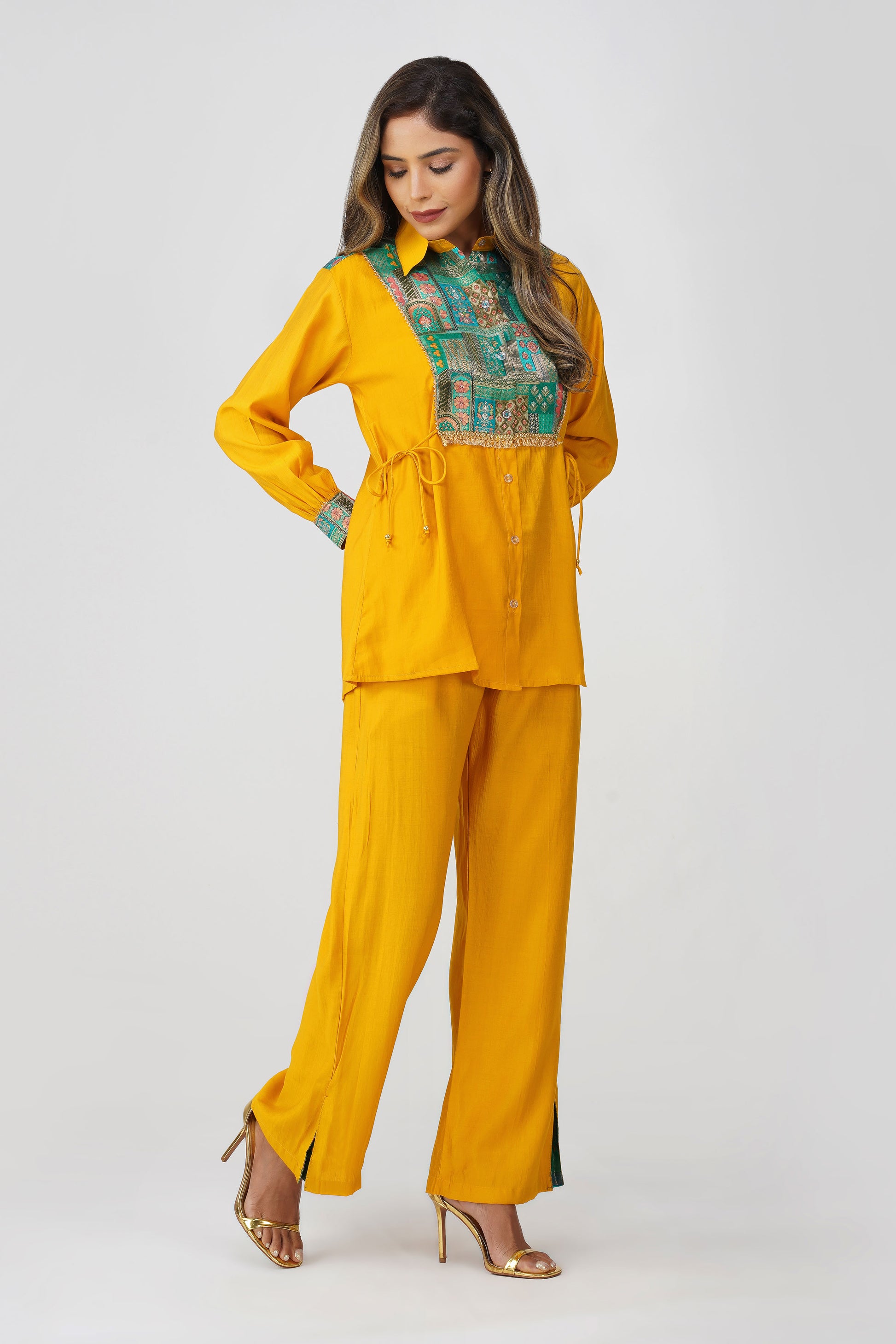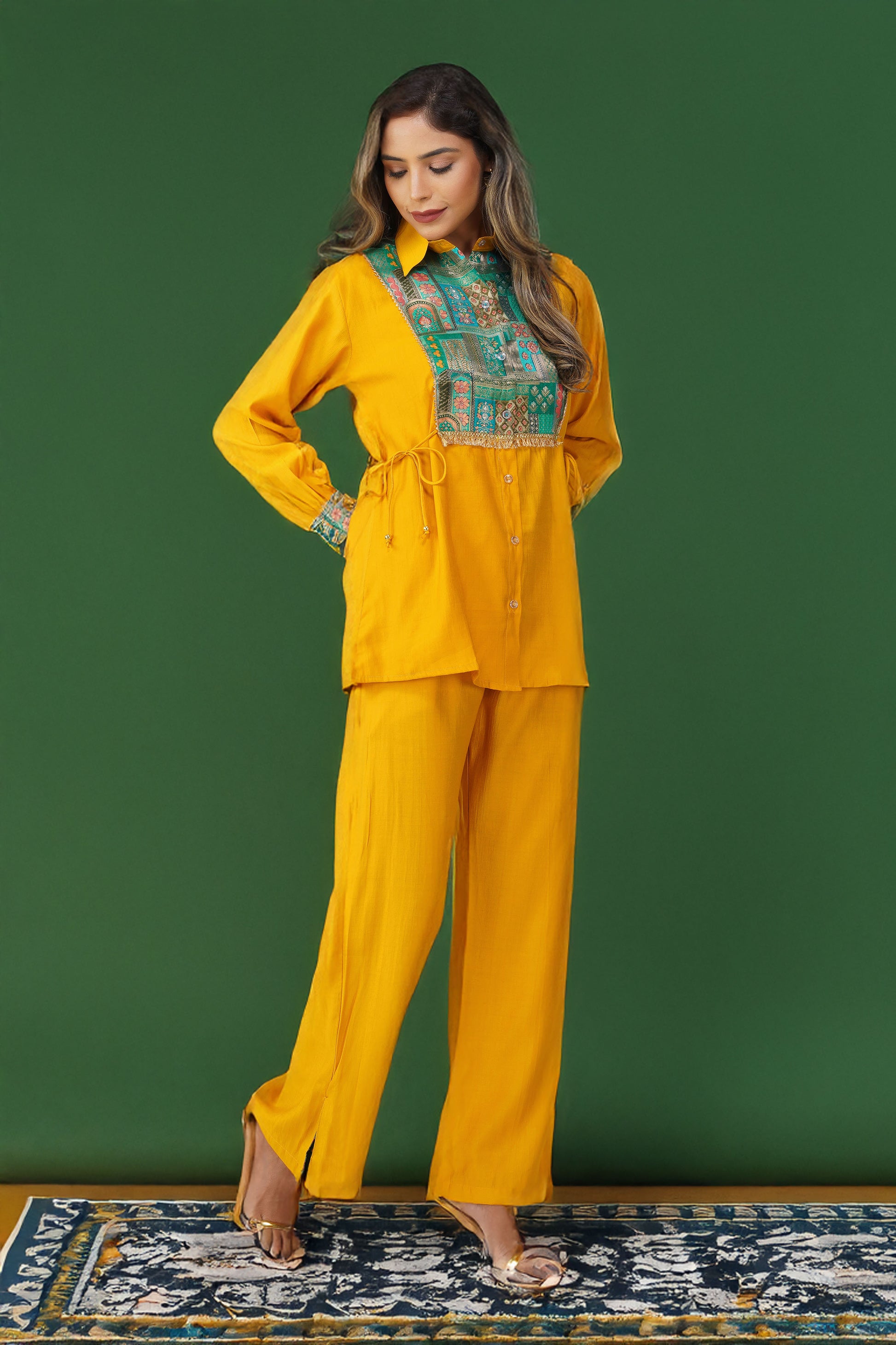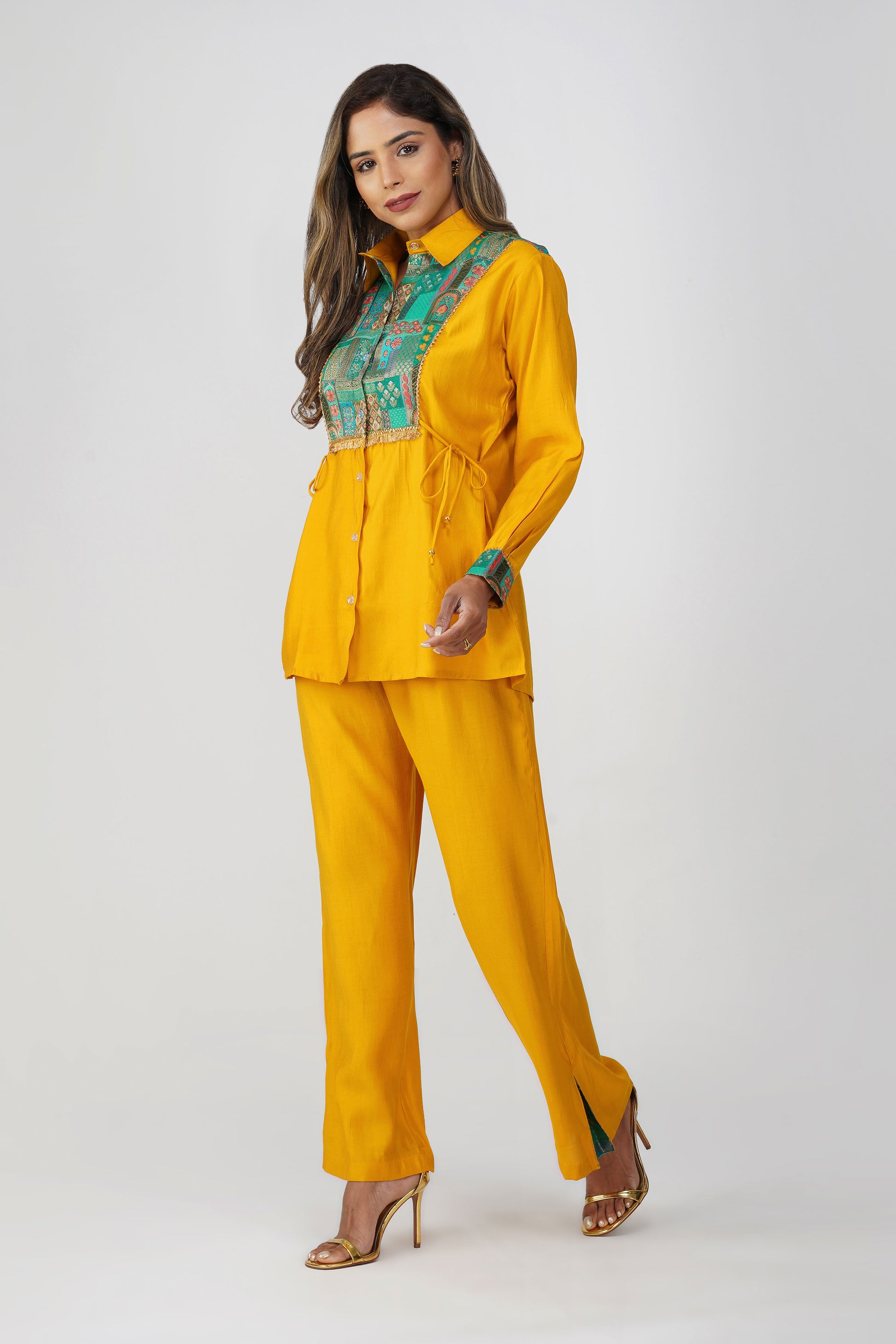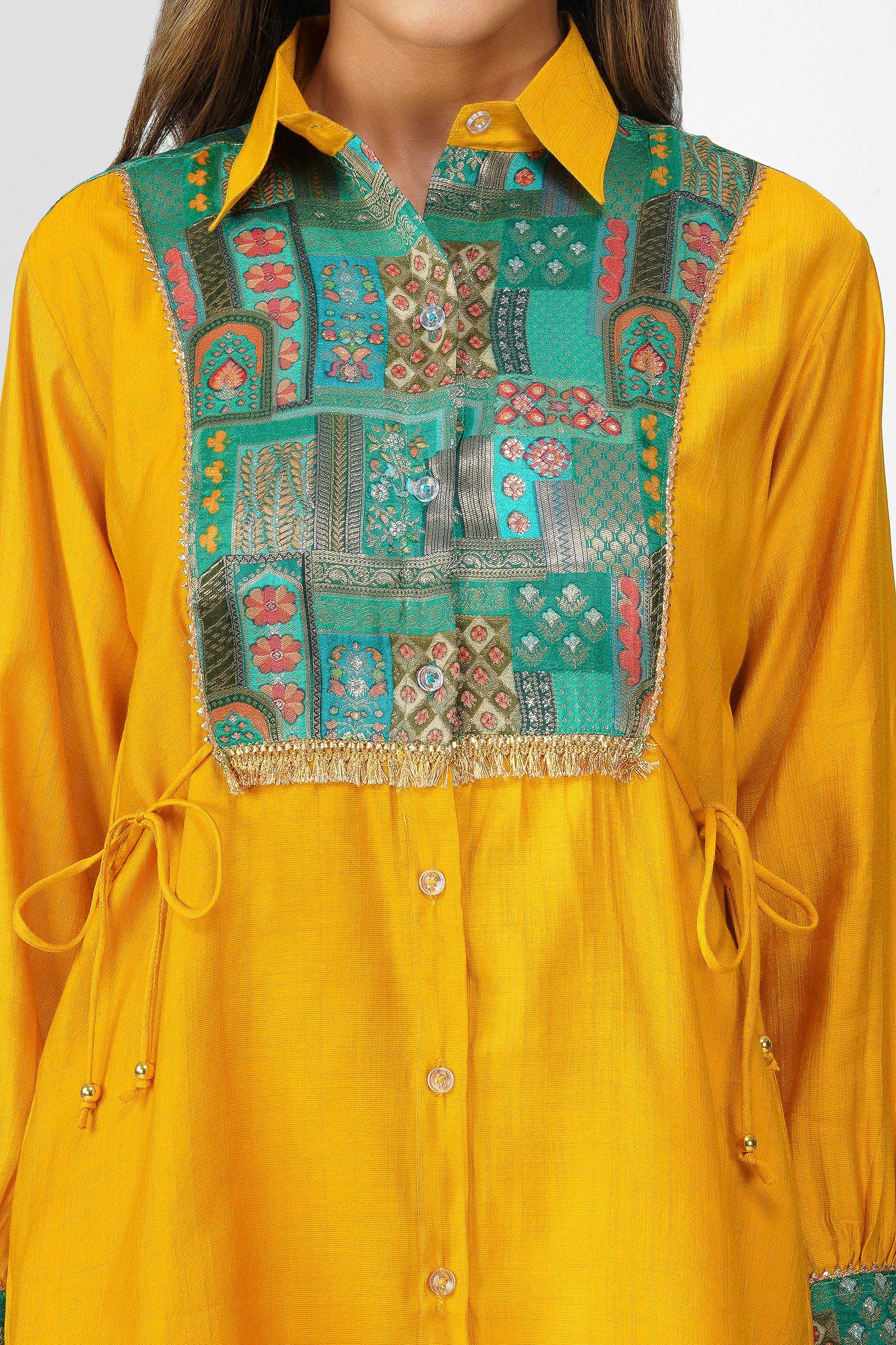 A vibrant blend of heritage and high-style, this festive co-ord set brings just the right touch of desi drama 💛 Crafted in a radiant mustard silk blend, this Set of 2 features a shirt with a rich emerald green Banarasi Dola Silk yoke that instantly uplifts the look. The golden fringe lace adds a festive sparkle, while the side tie-up dori offers a flattering cinch ✨