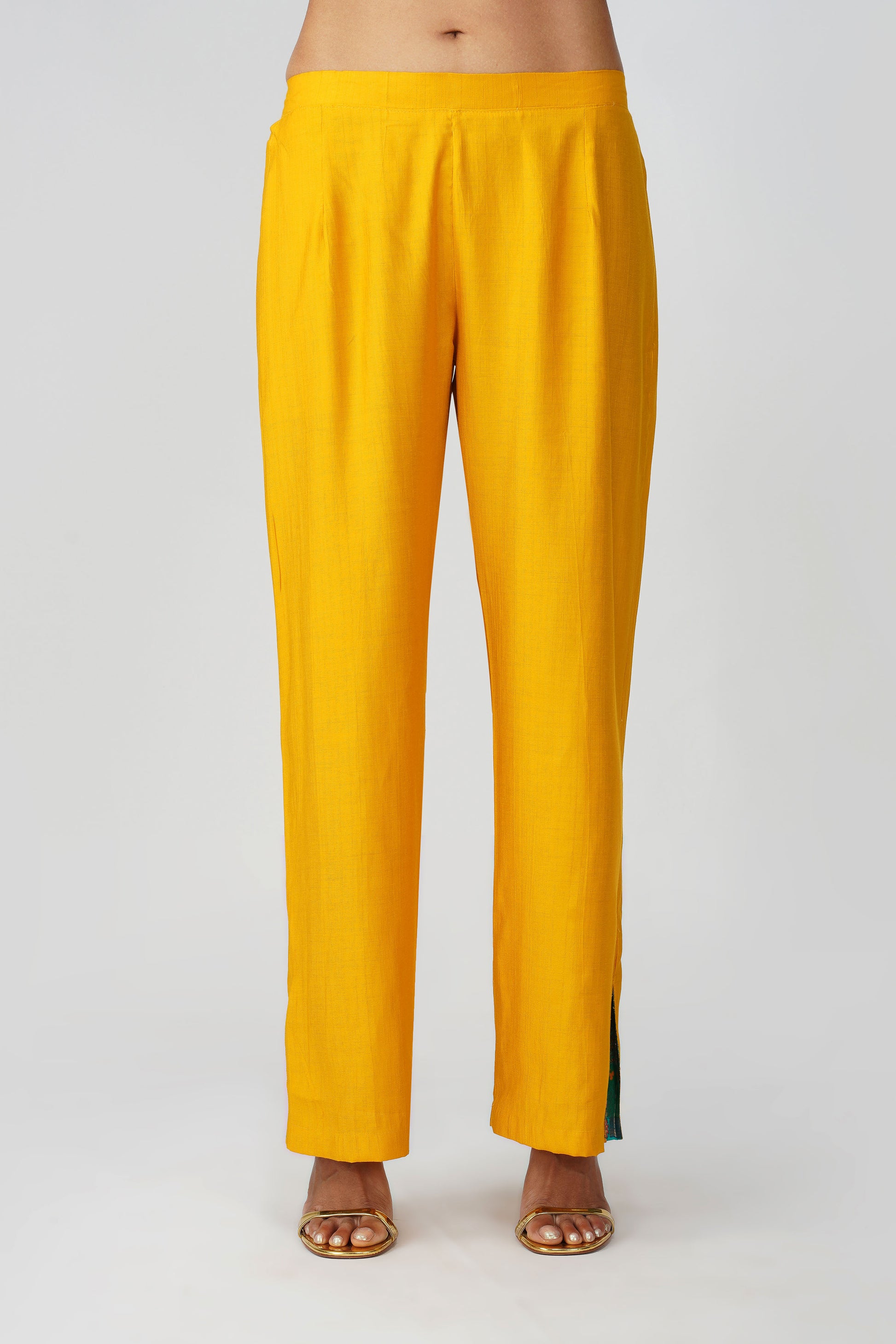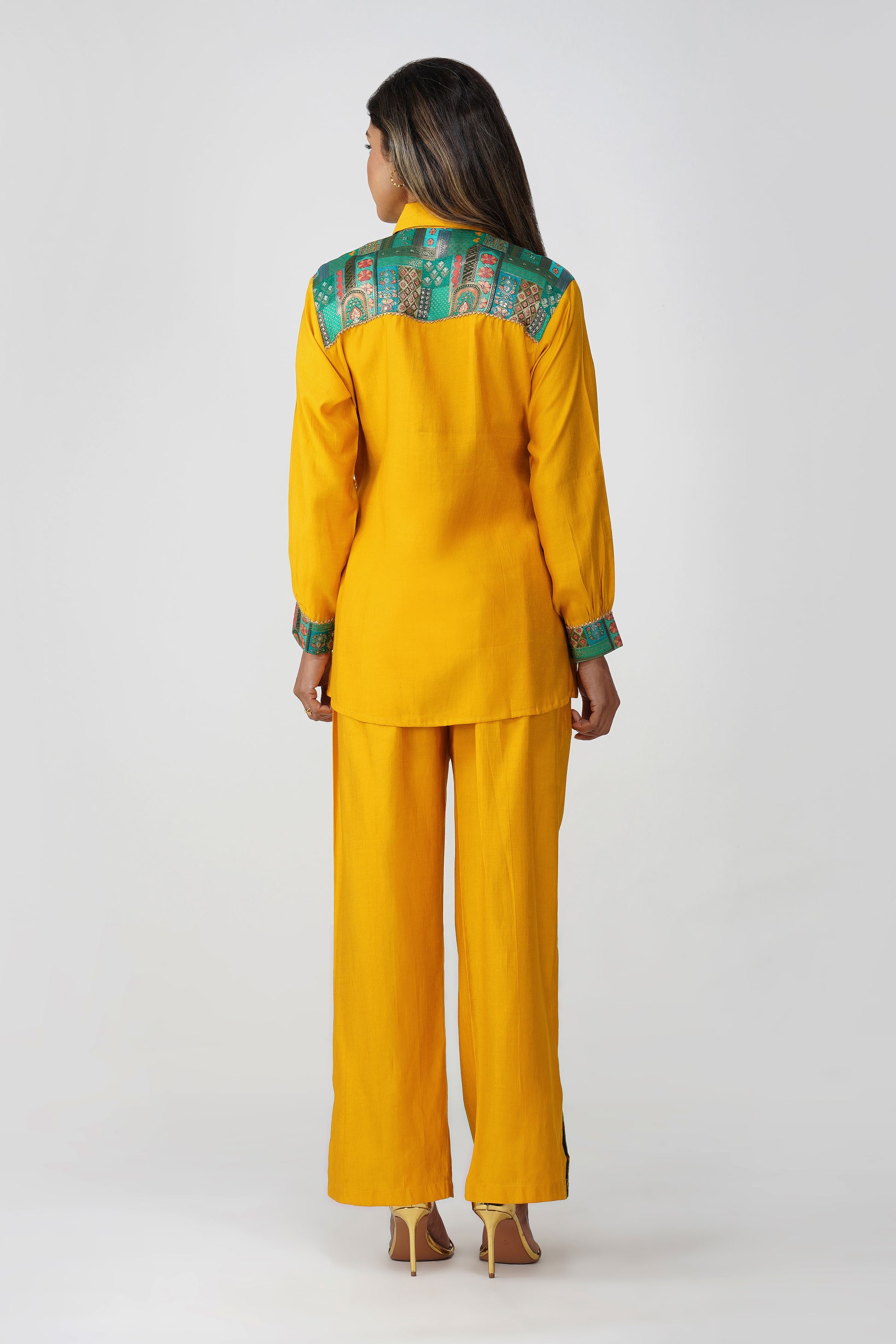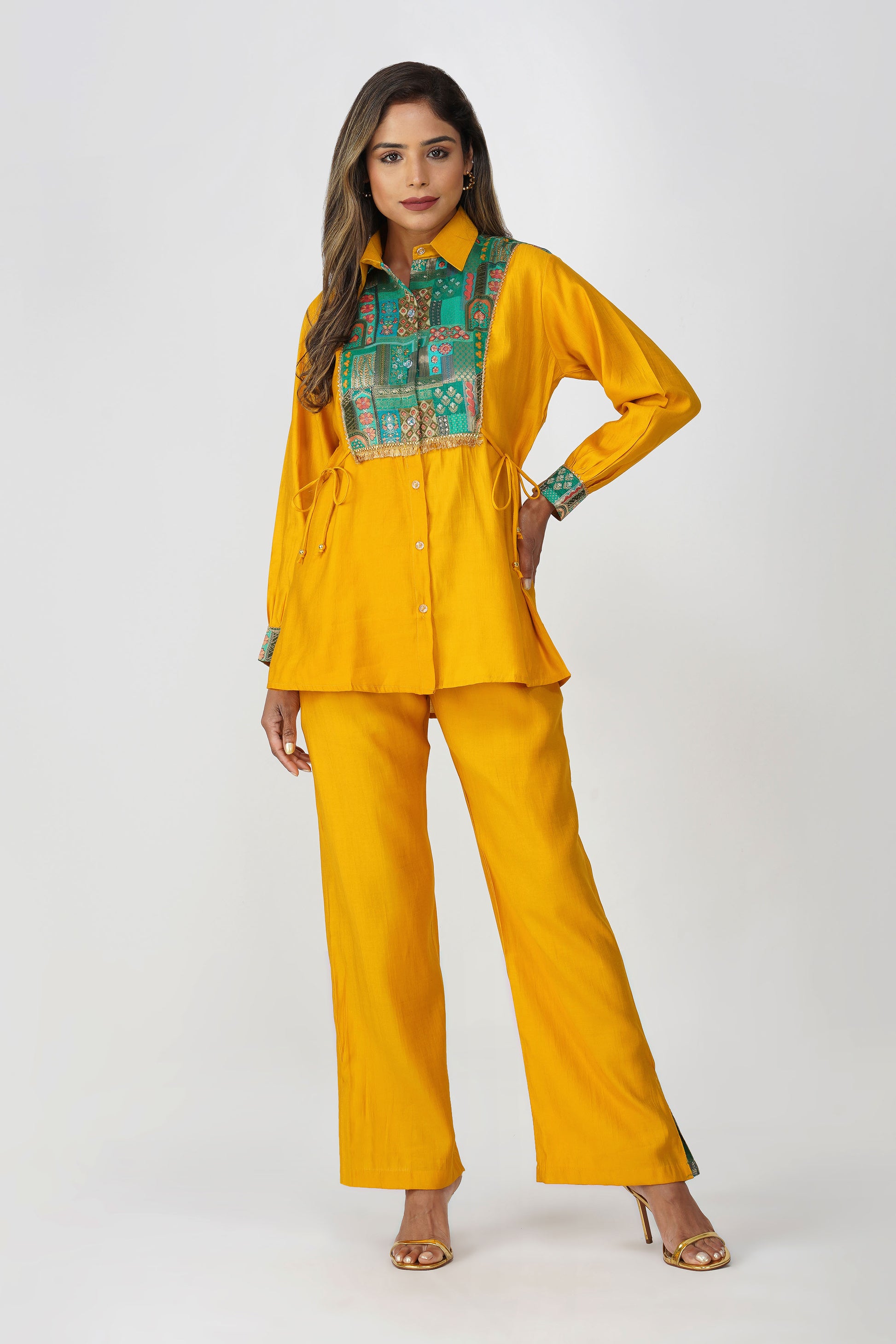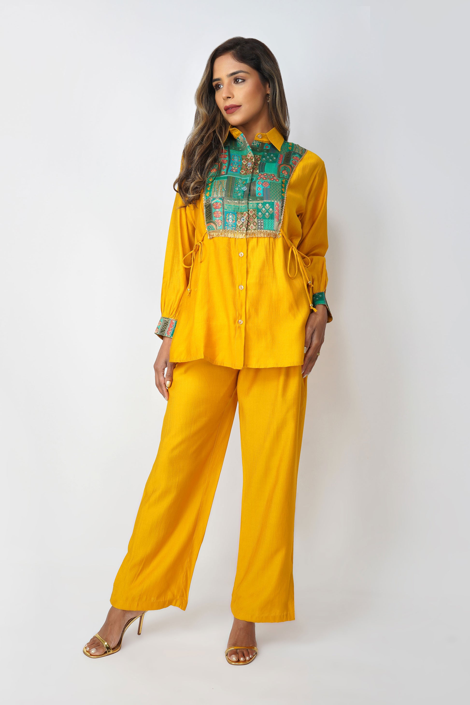 A vibrant blend of heritage and high-style, this festive co-ord set brings just the right touch of desi drama 💛 Crafted in a radiant mustard silk blend, this Set of 2 features a shirt with a rich emerald green Banarasi Dola Silk yoke that instantly uplifts the look. The golden fringe lace adds a festive sparkle, while the side tie-up dori offers a flattering cinch ✨