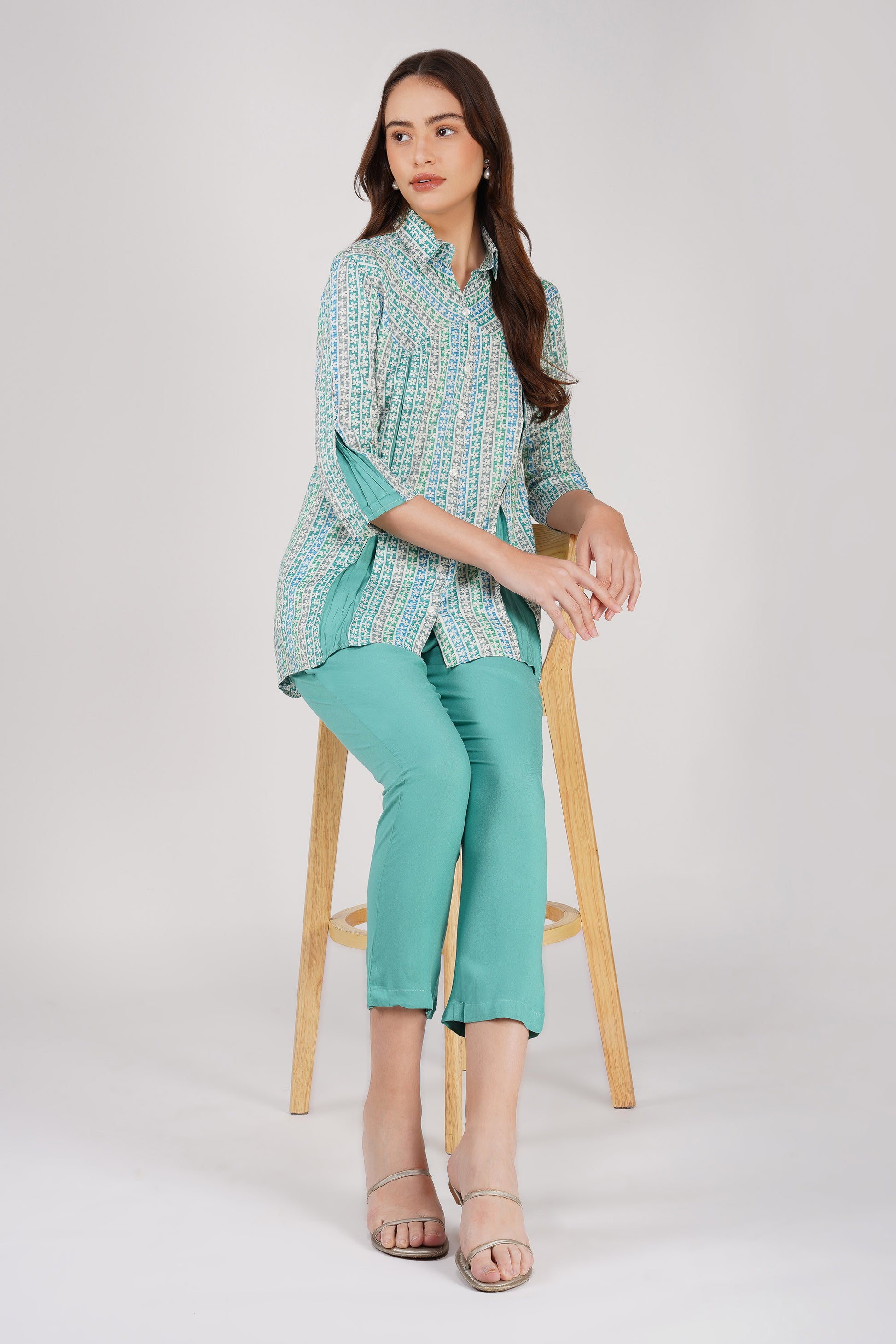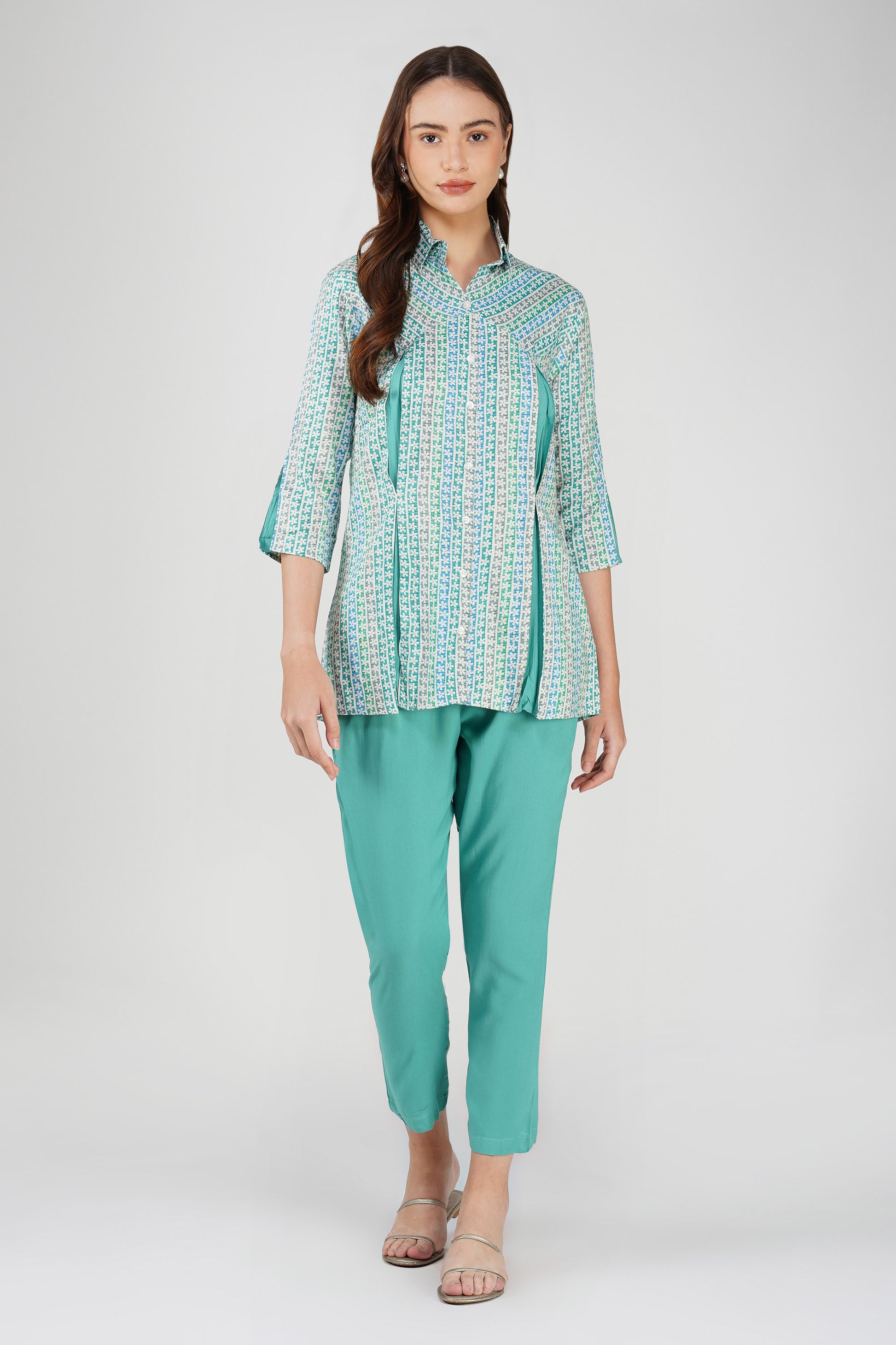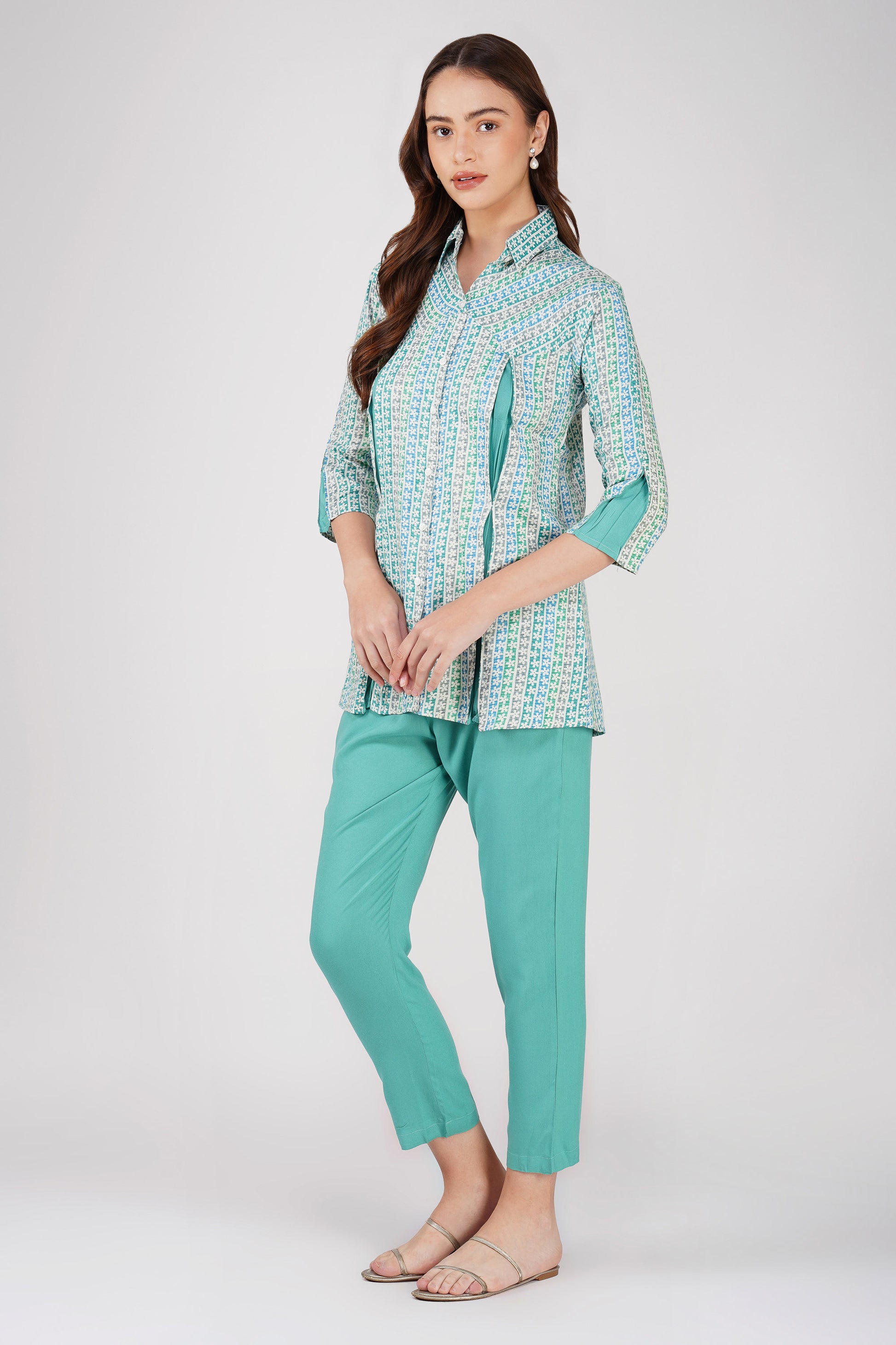 Sea Green Floral Shirt Co-ord Set – Contrast Panel Top with Solid Pants