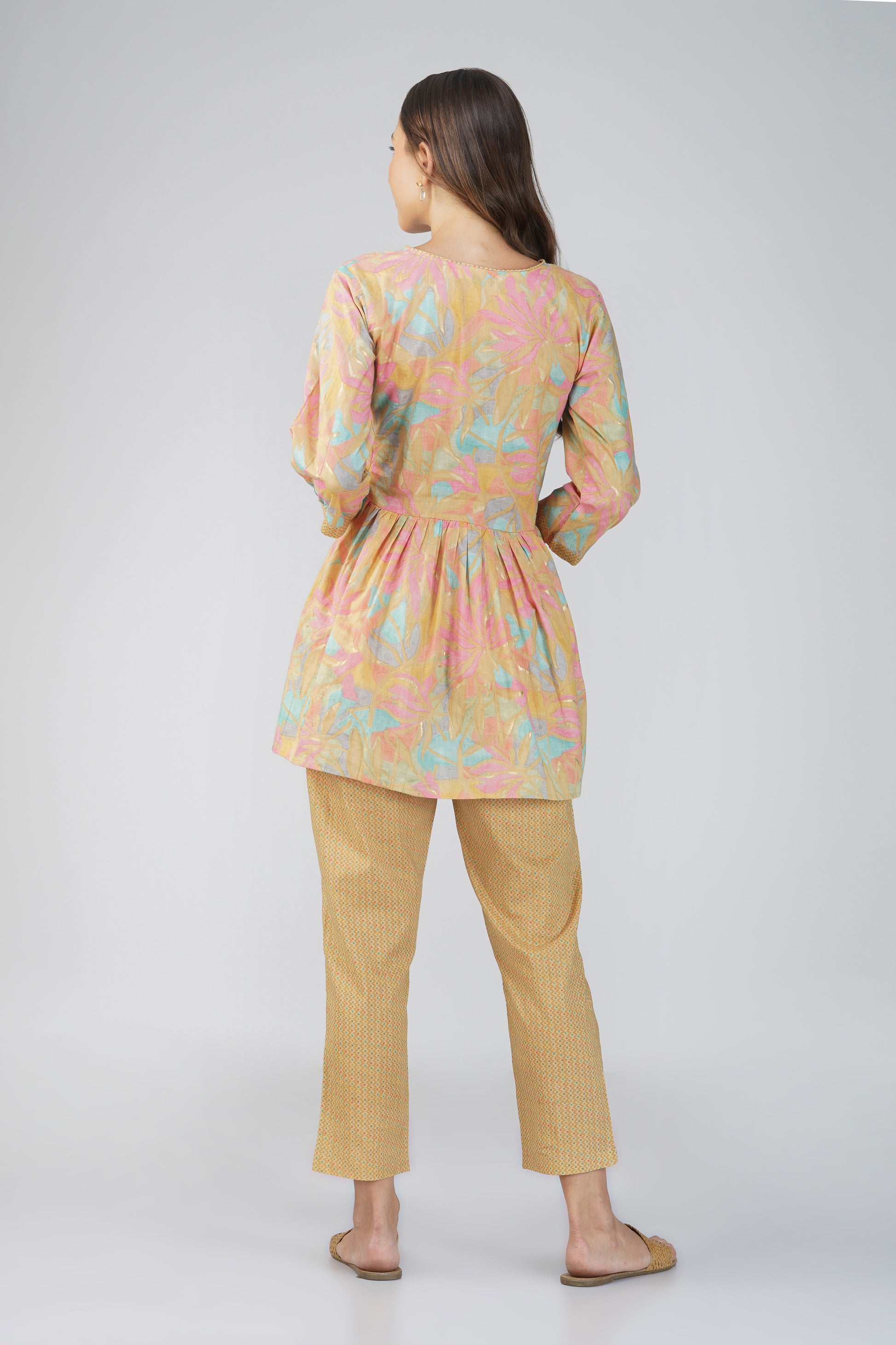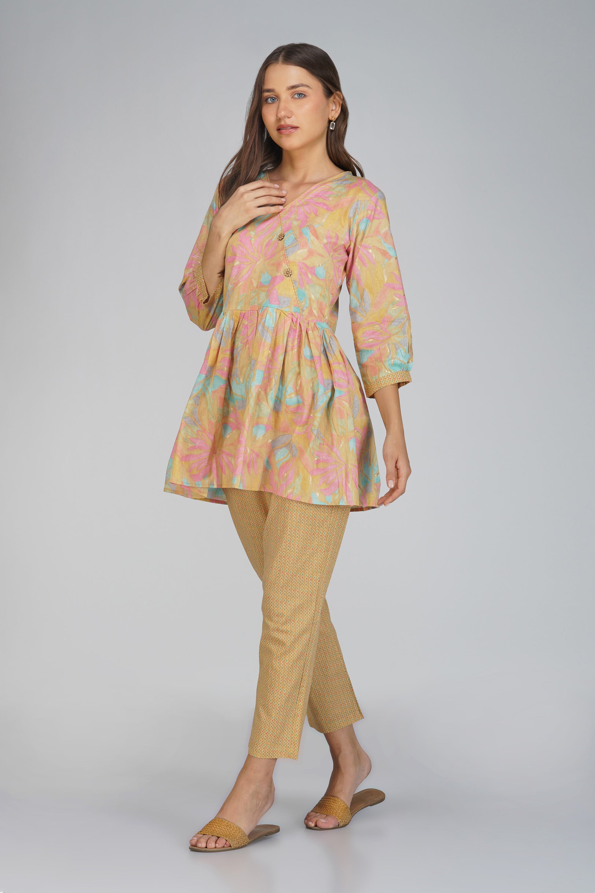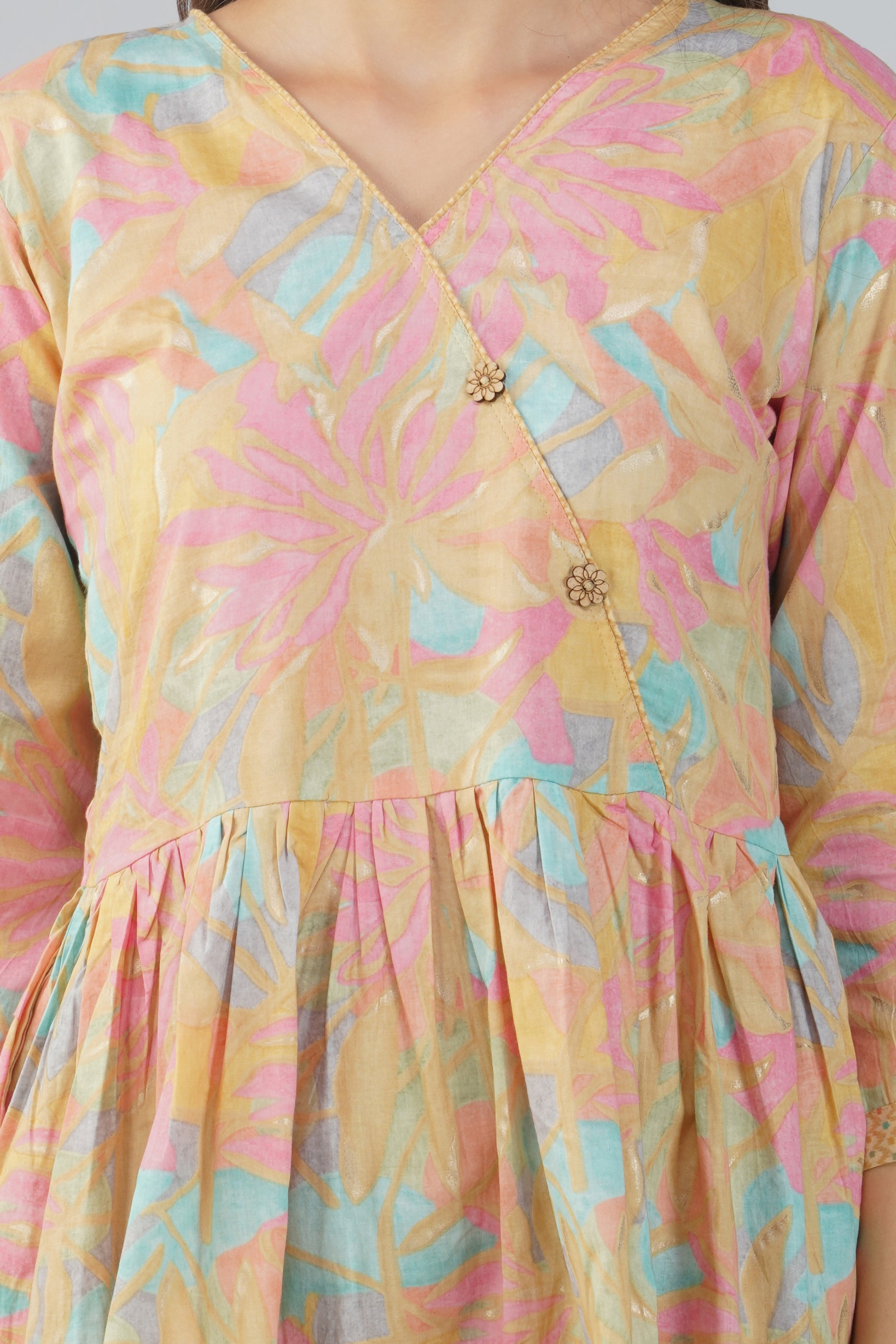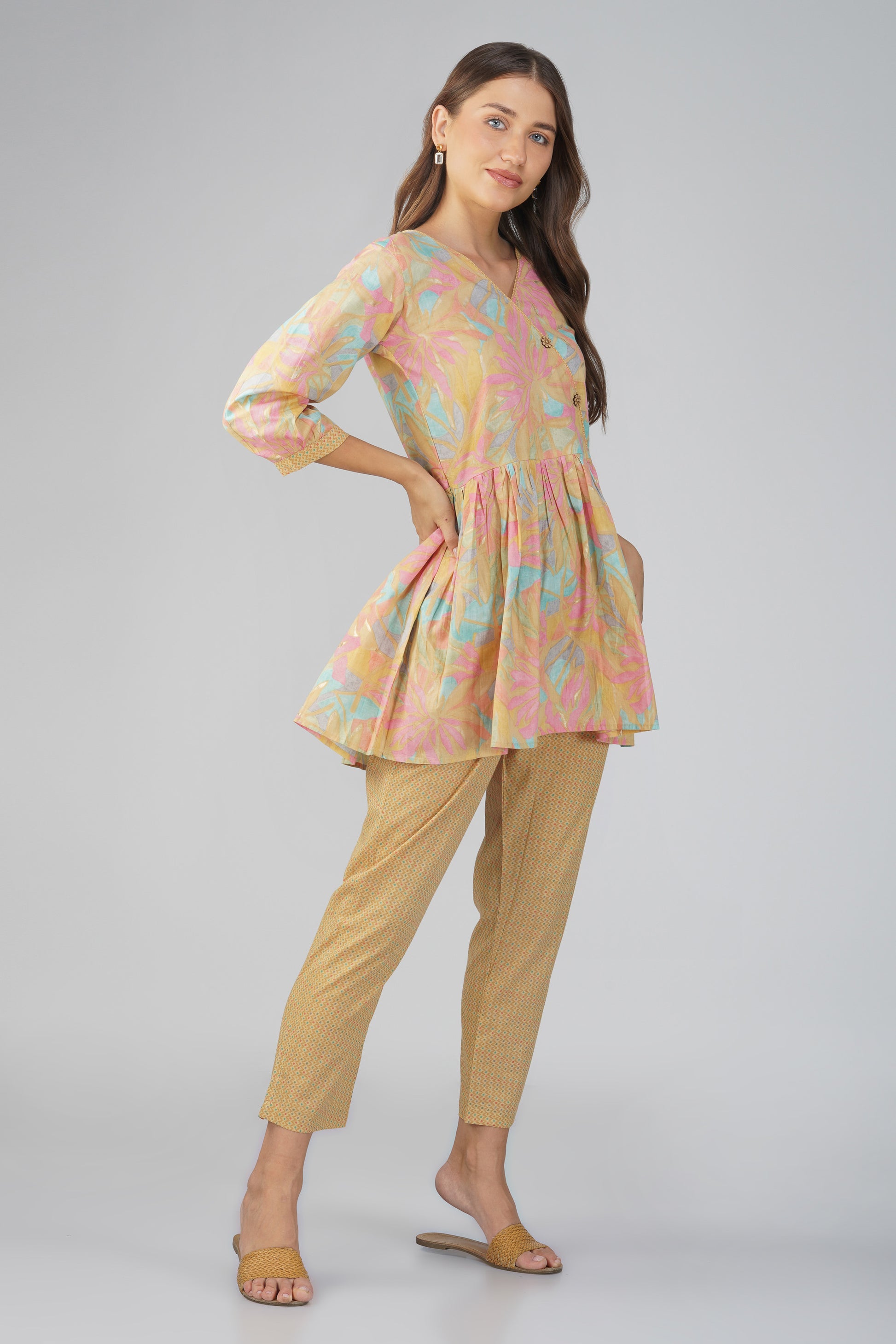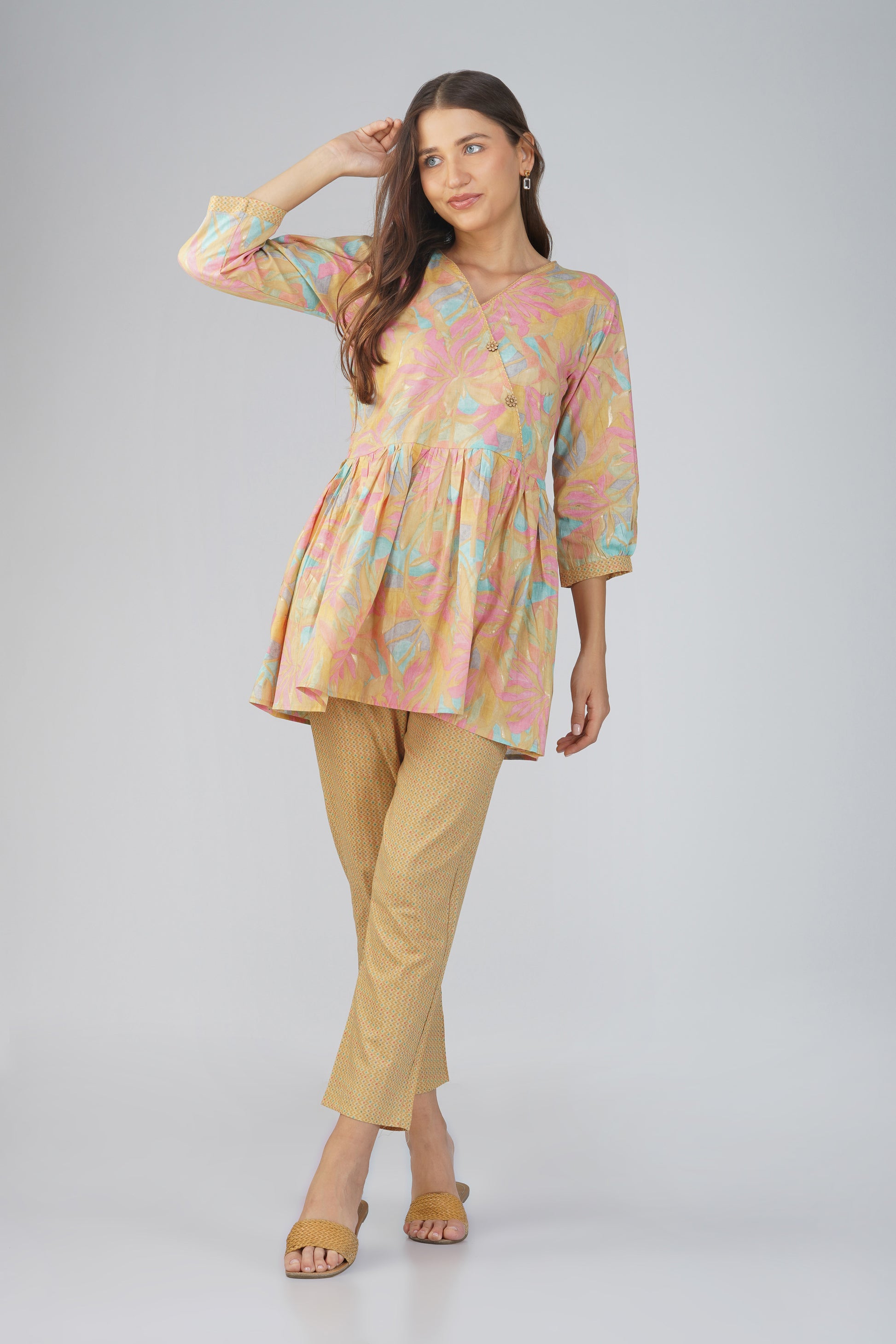 Grace in every detail 🎶 — Sargam is a pastel dream featuring a charming peplum top with delicate dori piping and floral laser-cut wooden buttons. Paired with textured print straight-fit pants and a pocket for convenience, this 100% cotton set is your answer to breathable comfort and feminine flair — perfect for music-filled mornings or artful afternoons.