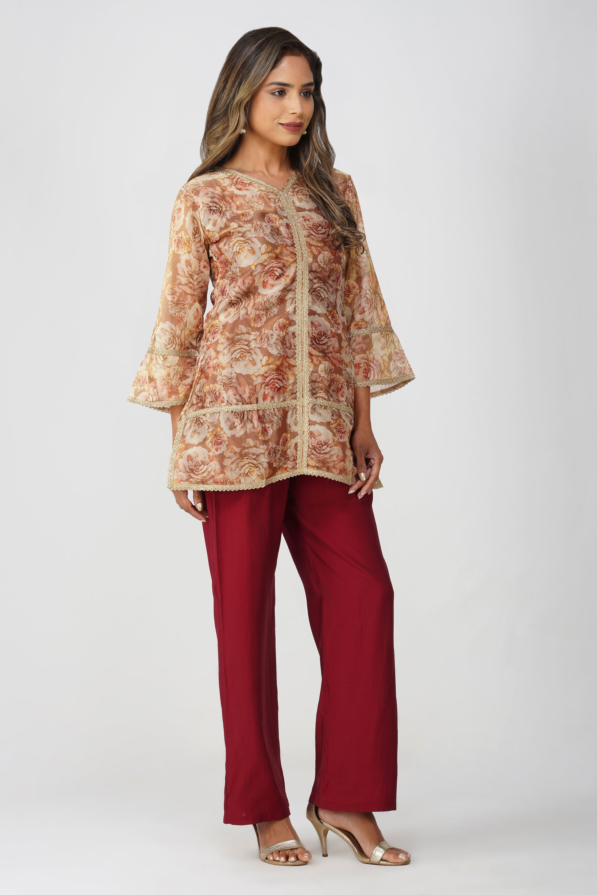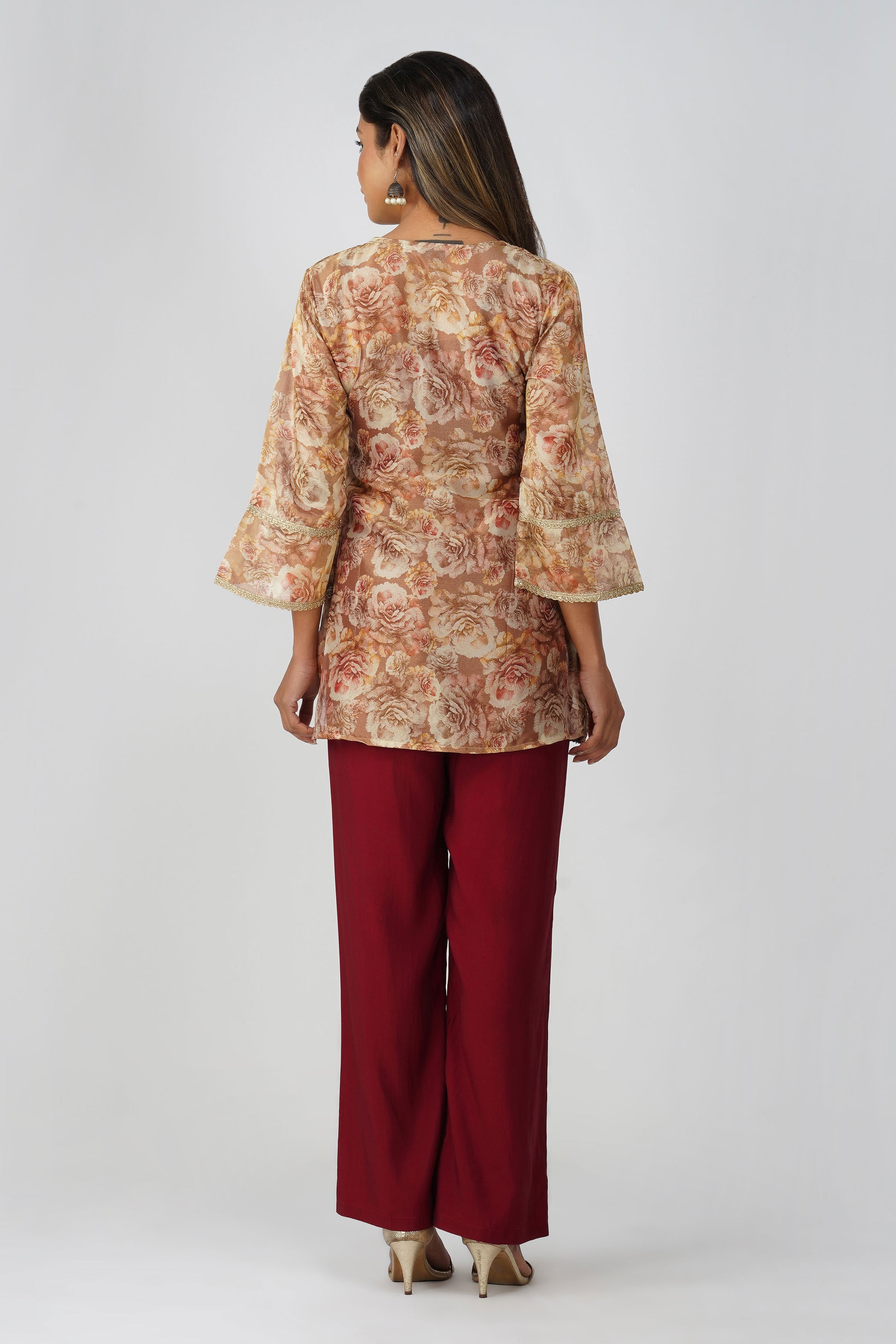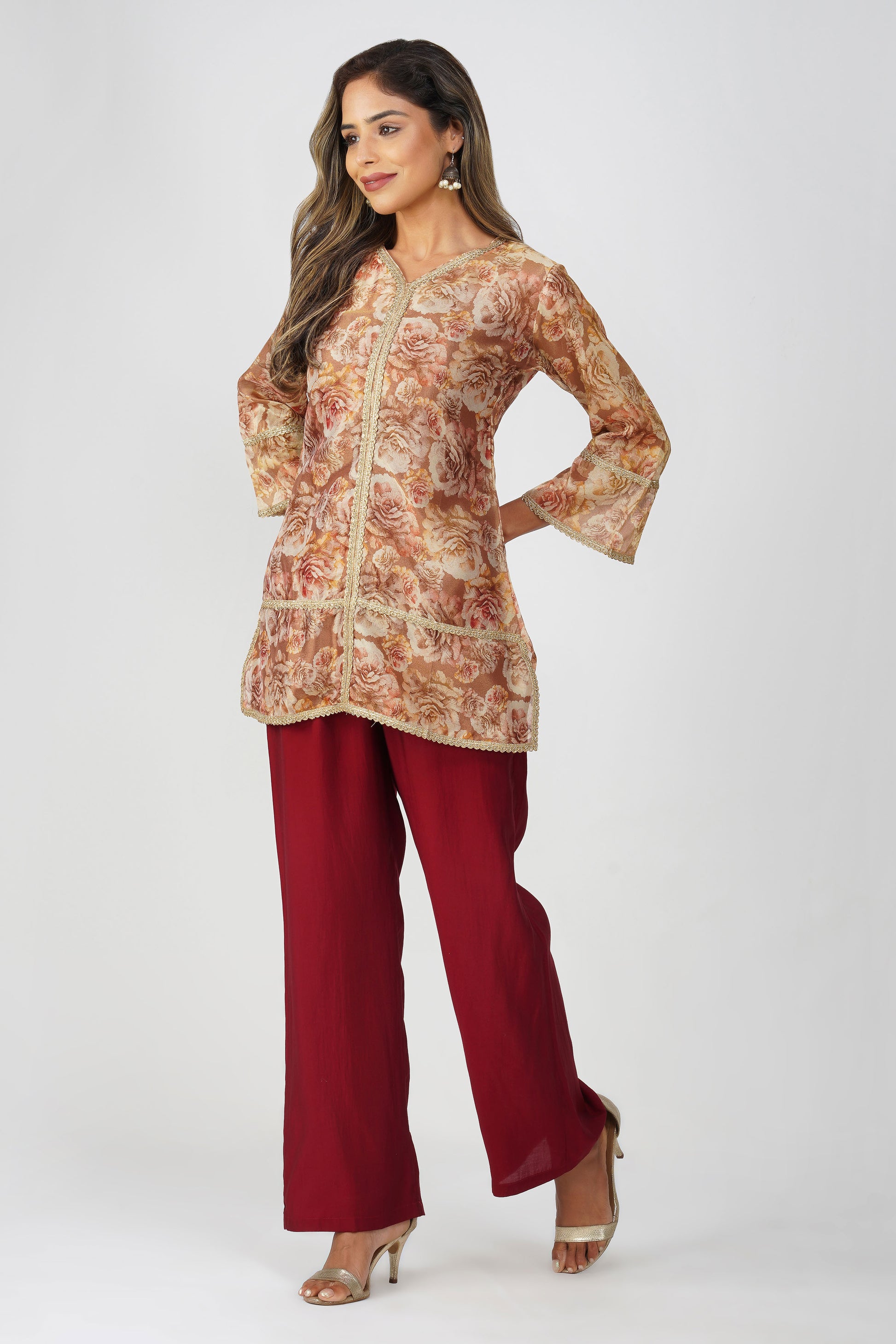Color: Vintage floral print on beige shimmer with wine palazzos
